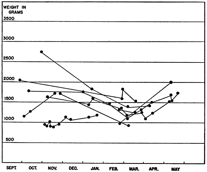 [Pg 327] Of opossums that were trapped alive, the weight ranged from the maximum of 5000 grams to a minimum of 126 grams. The maximum in males was higher than in females. In fall, three rather poorly defined age-size groups were discernible in each sex: adults more than a year old and including all the largest individuals; large young born late the preceding winter and approaching small adult size; smaller young born in early summer and still less than half-grown. After November, young cease to gain, or gain slowly and irregularly through the winter and spring and adults tend to decline in weight, as food becomes scarce and frequent fasting is enforced by cold or stormy weather. The smaller young probably are subject to drastic reduction in numbers as a result, directly or indirectly, of severe winter weather. Many of these smaller young, weighing considerably less than 1000 grams, did not survive overnight when caught in live-traps in cool autumn weather, whereas adults and well-grown young generally survived exposure even for several successive nights in various extremes of weather conditions.
