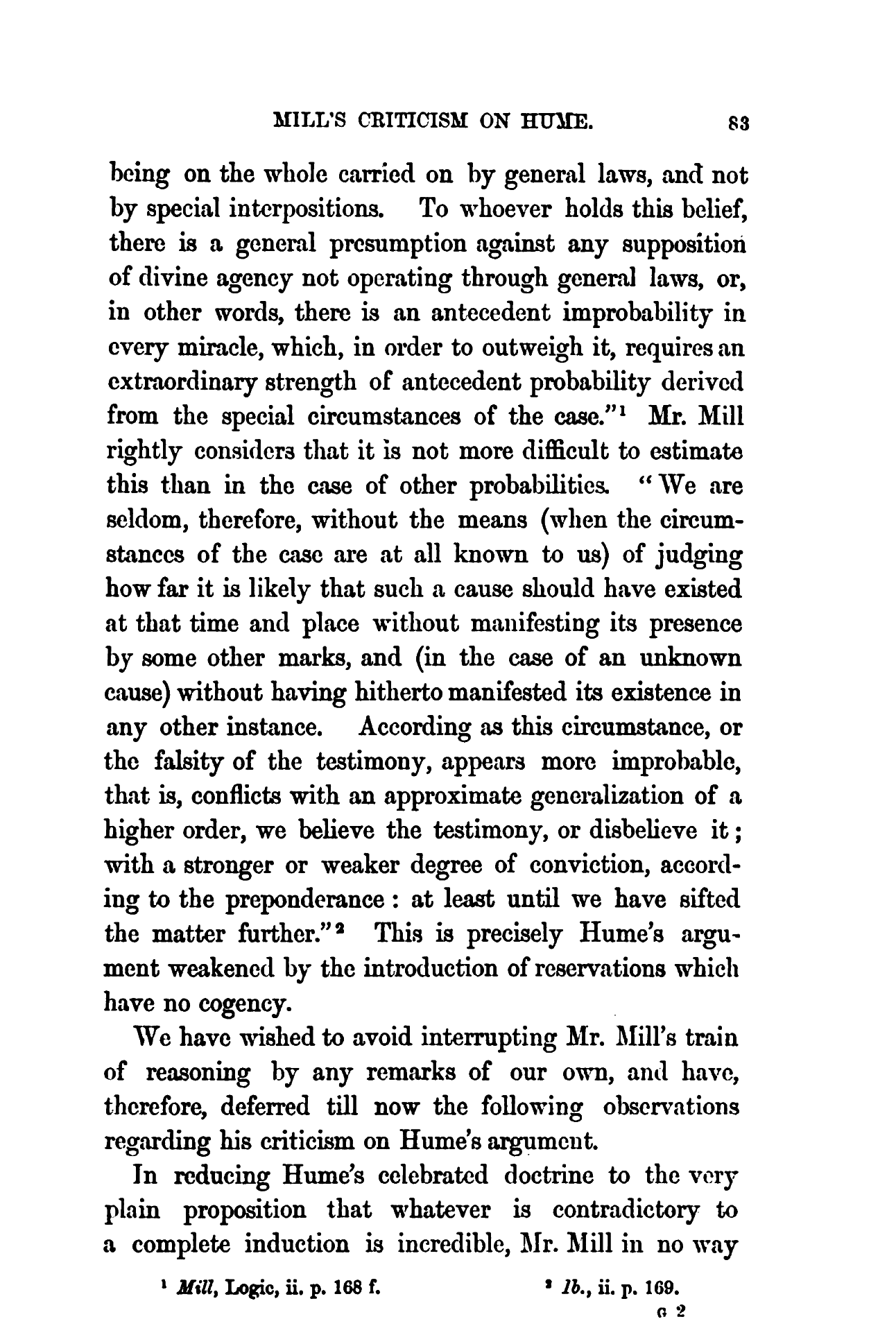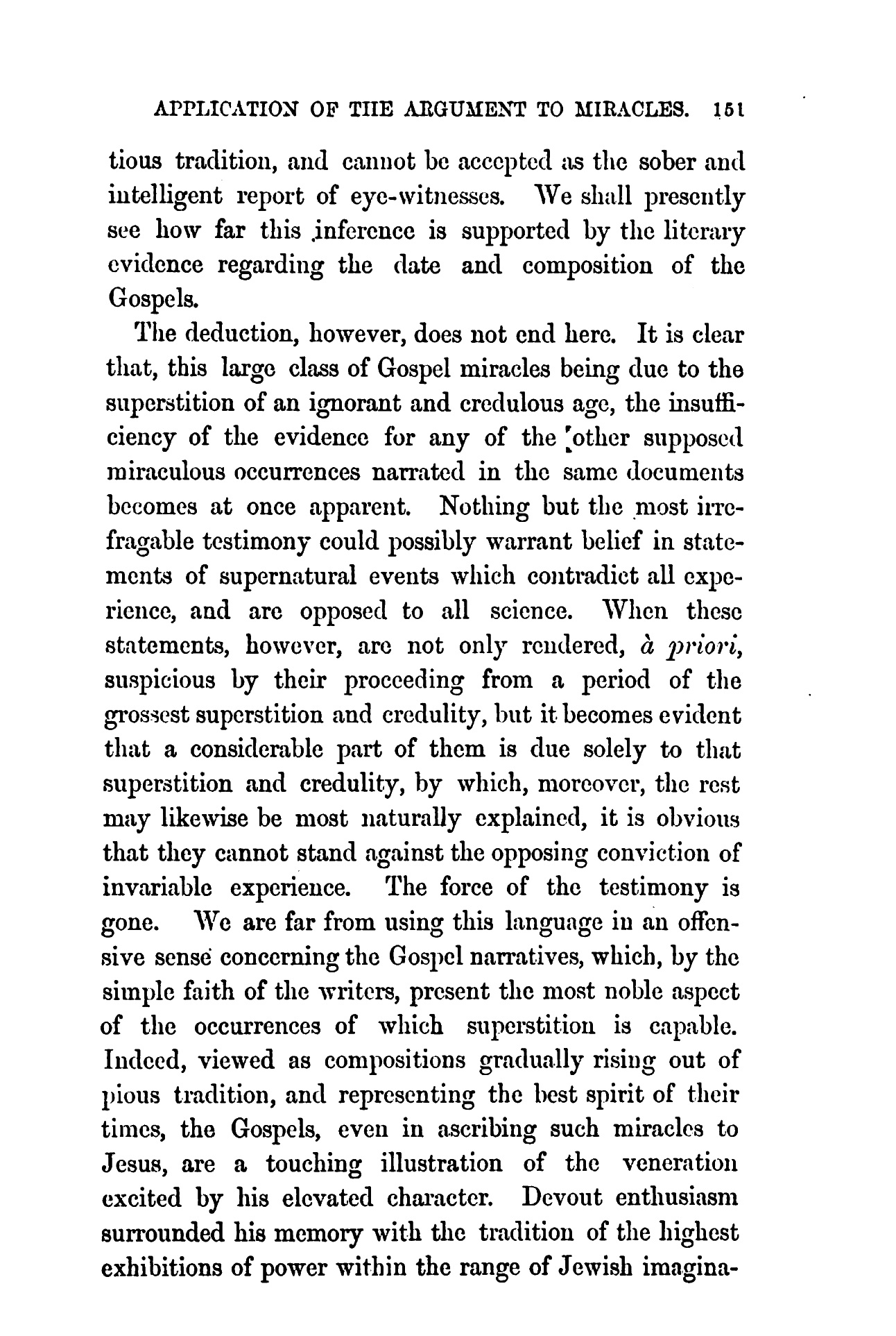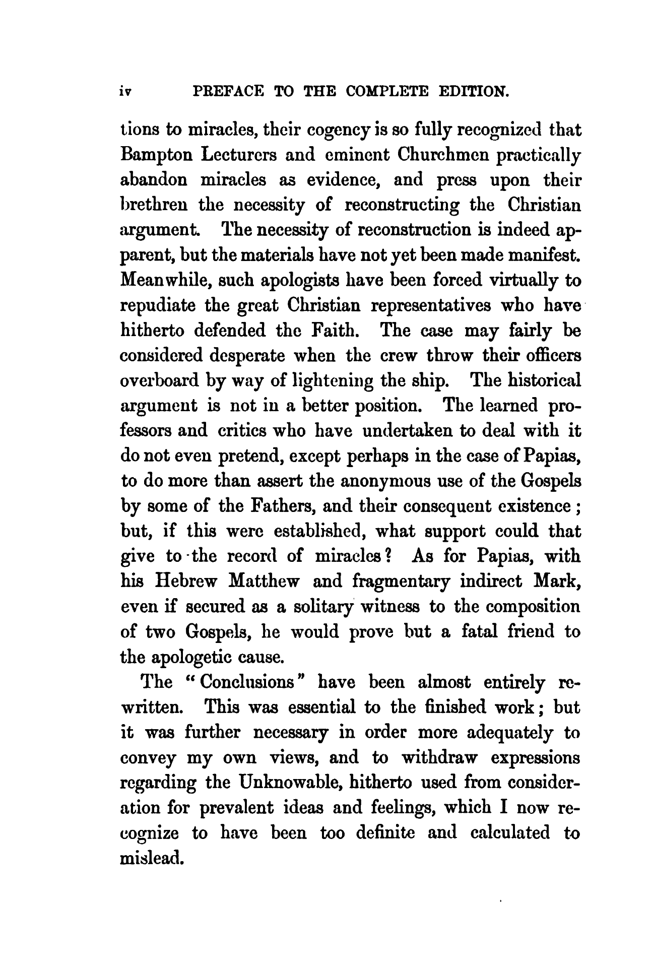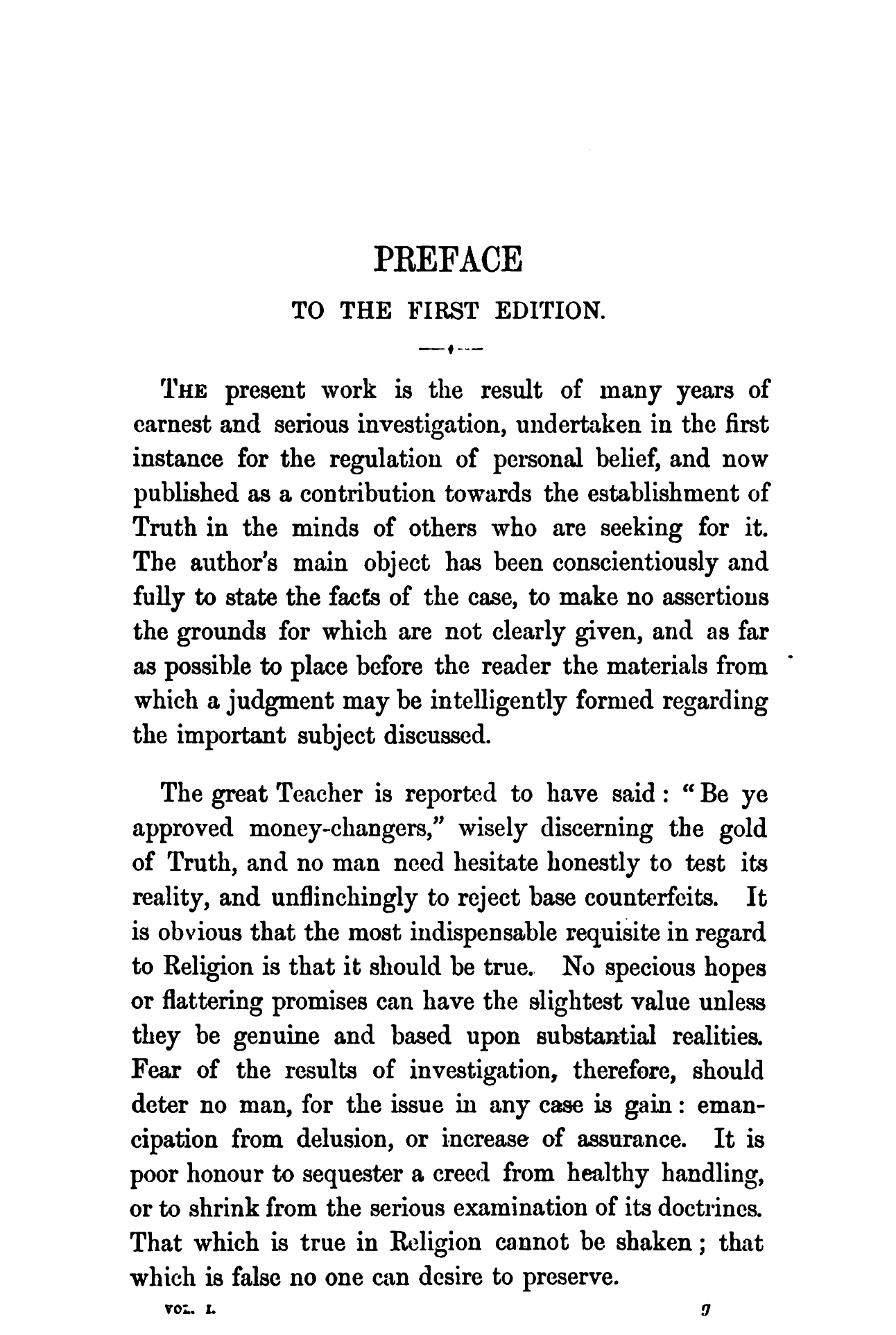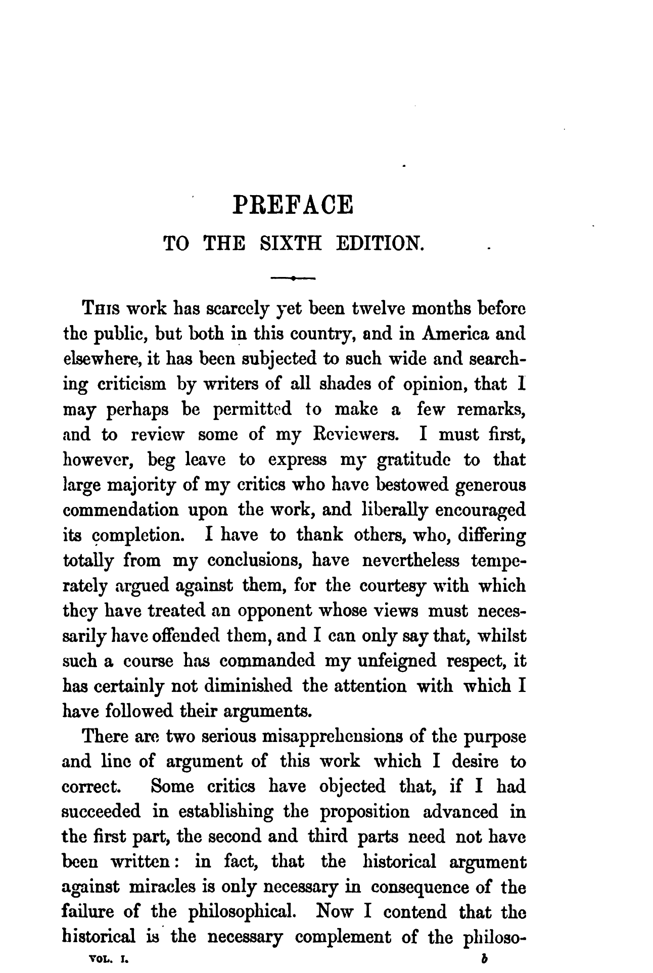 There are two serious misapprehensions of the purpose and line of argument of this work which I desire to correct. Some critics have objected that, if I had succeeded in establishing the proposition advanced in the first part, the second and third parts need not have been written: in fact, that the historical argument against miracles is only necessary in consequence of the failure of the philosophical. Now I contend that the historical is the necessary complement of the