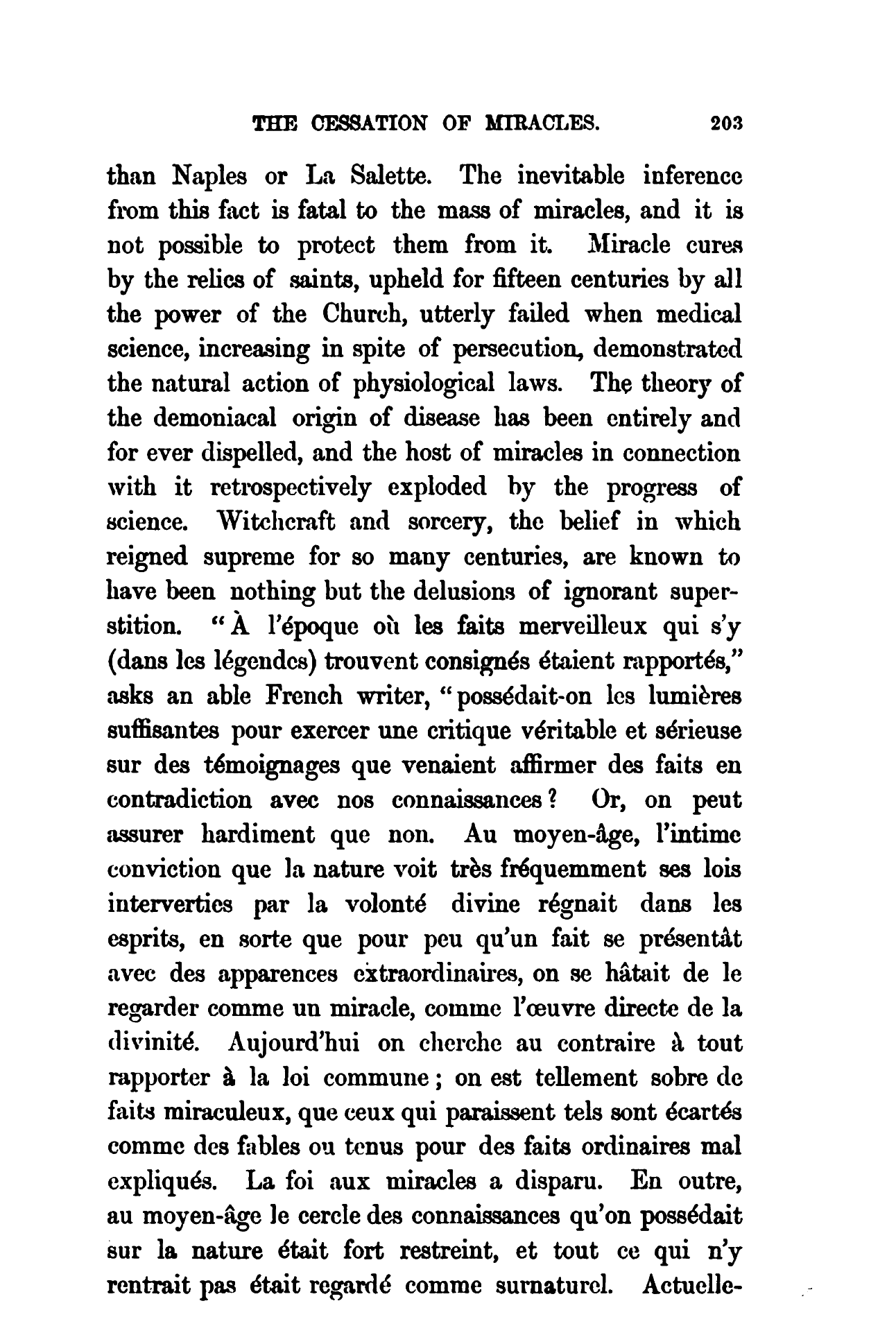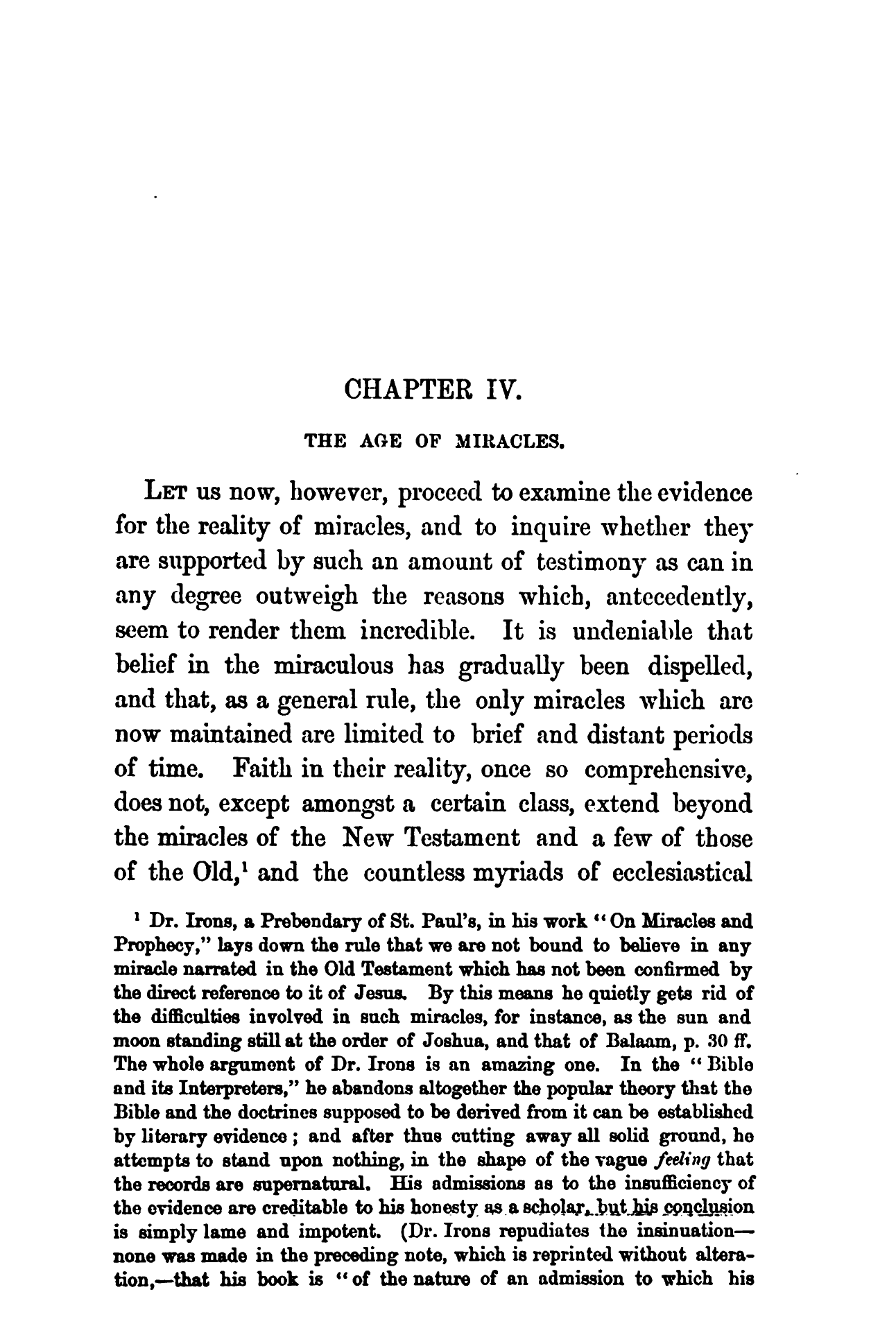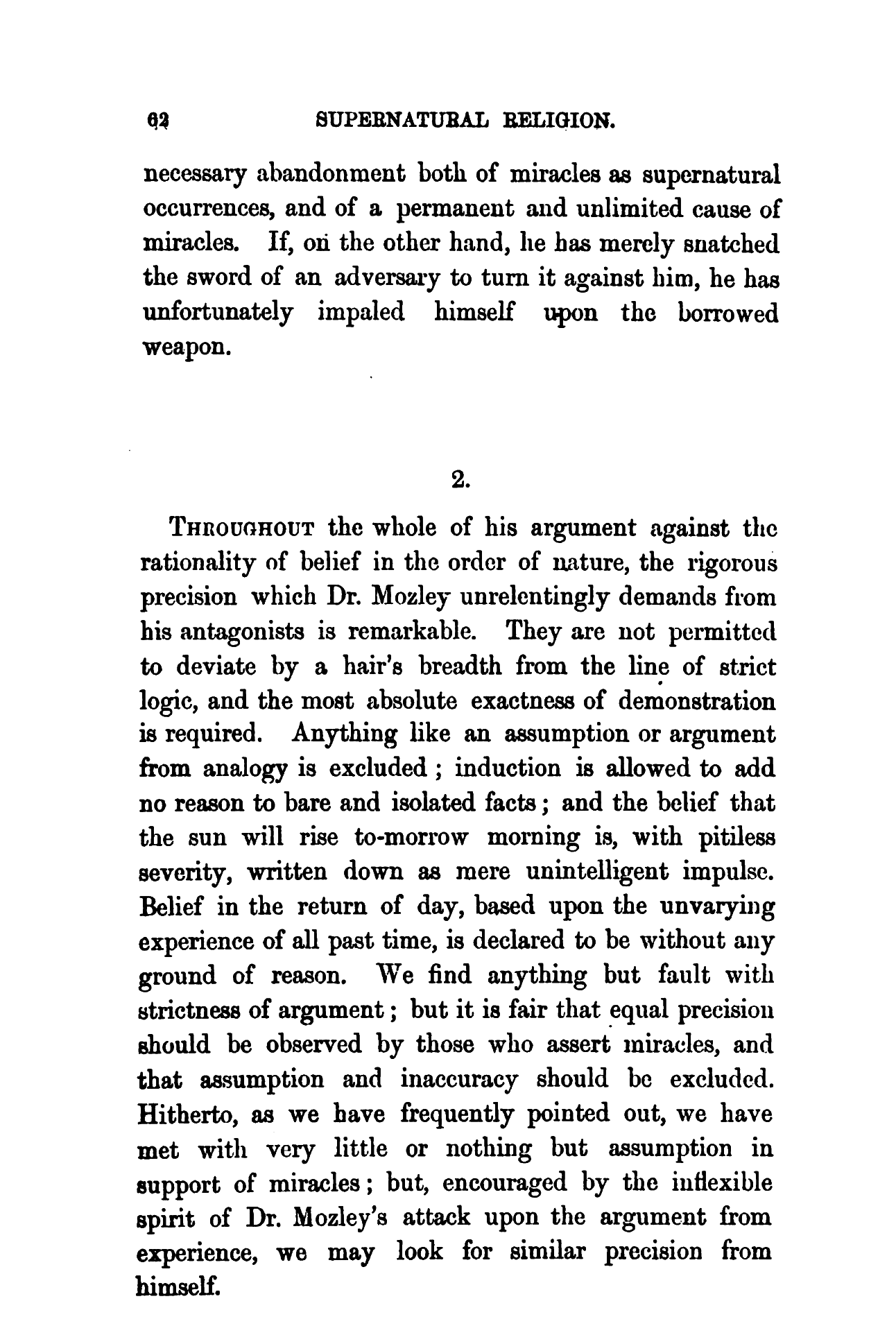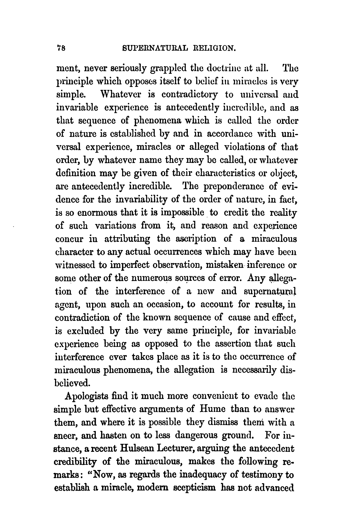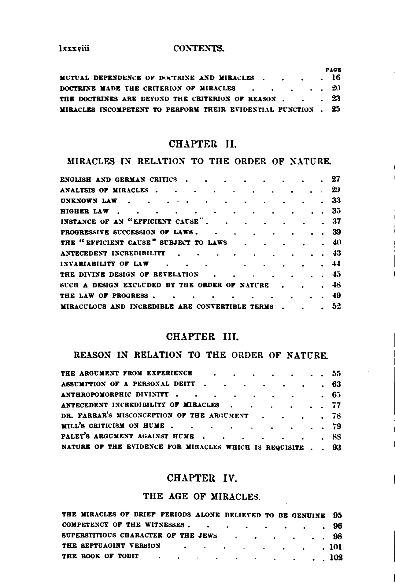 There are two serious misapprehensions of the purpose and line of argument of this work which I desire to correct. Some critics have objected that, if I had succeeded in establishing the proposition advanced in the first part, the second and third parts need not have been written: in fact, that the historical argument against miracles is only necessary in consequence of the failure of the philosophical. Now I contend that the historical is the necessary complement of the