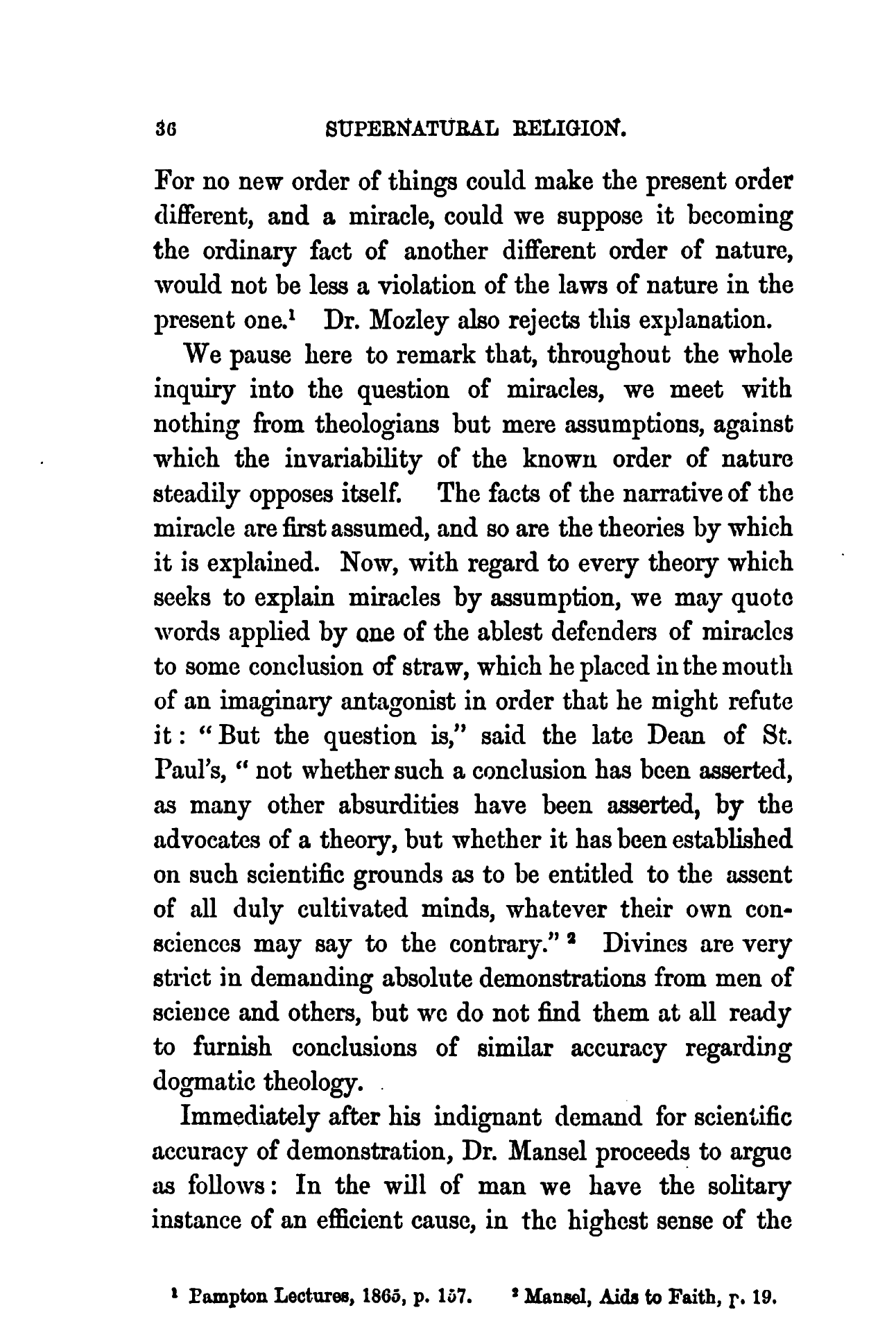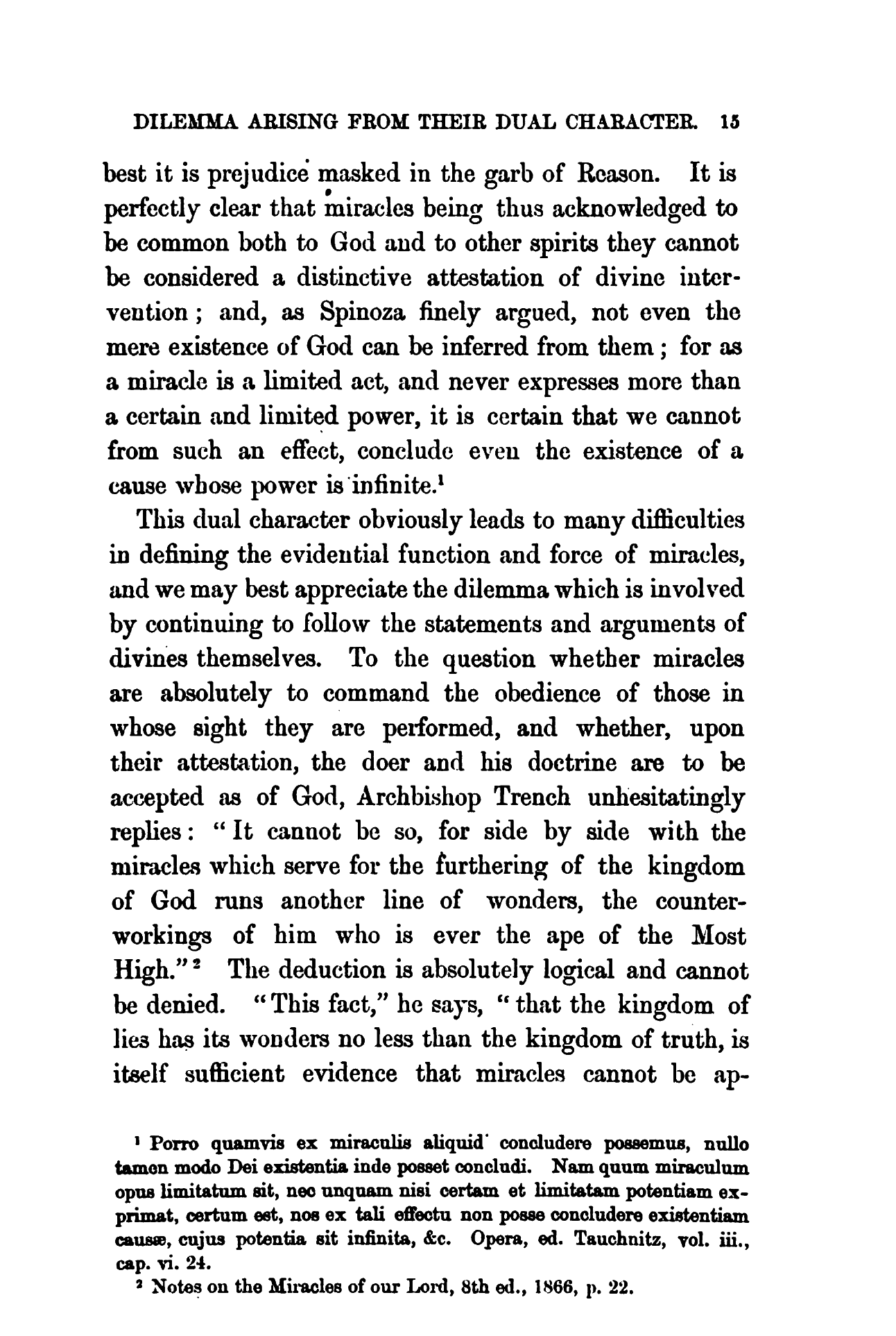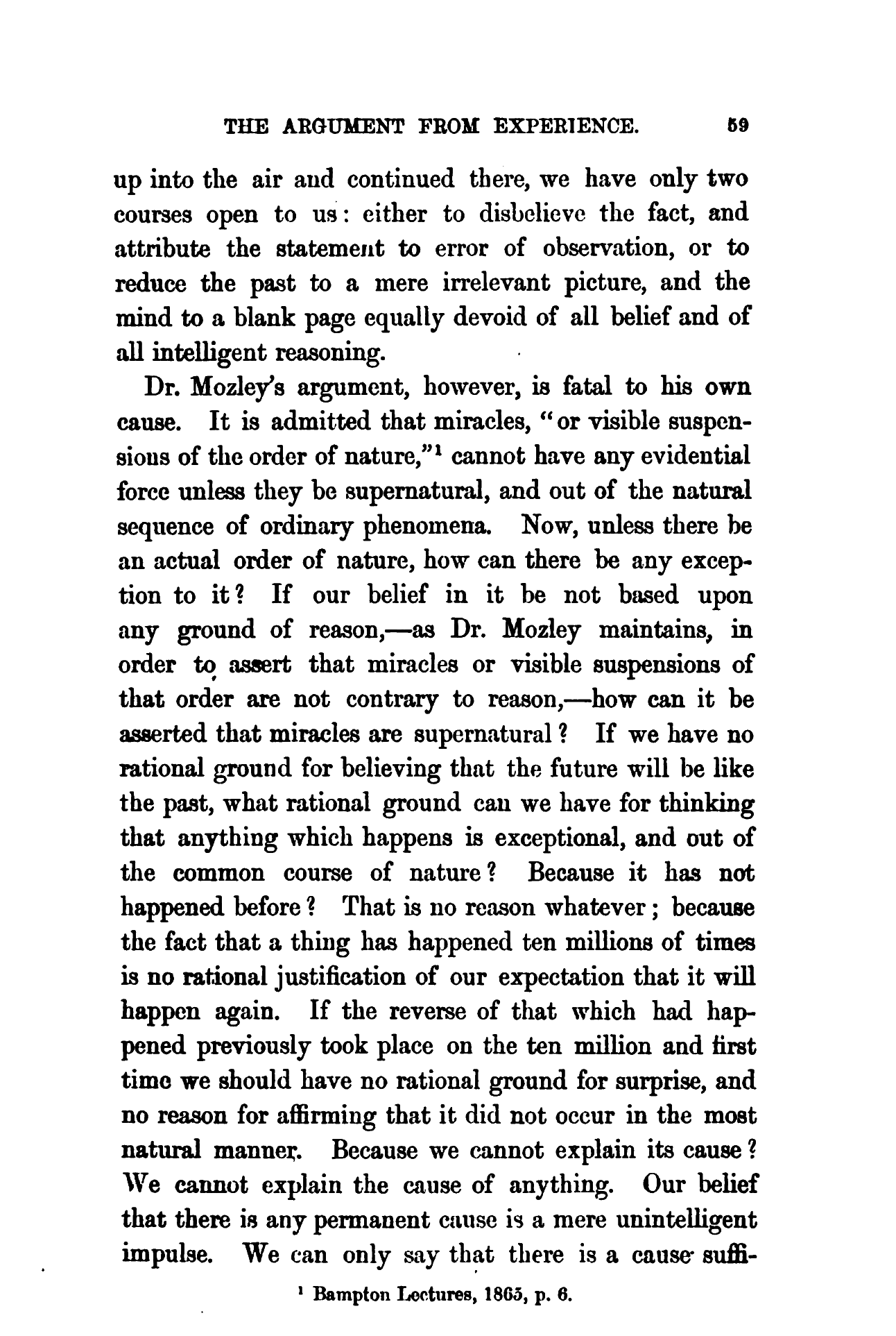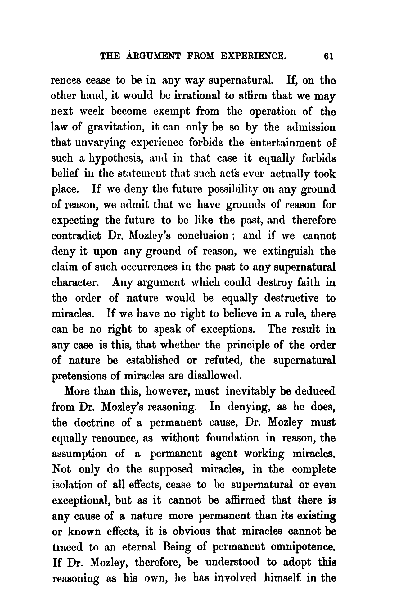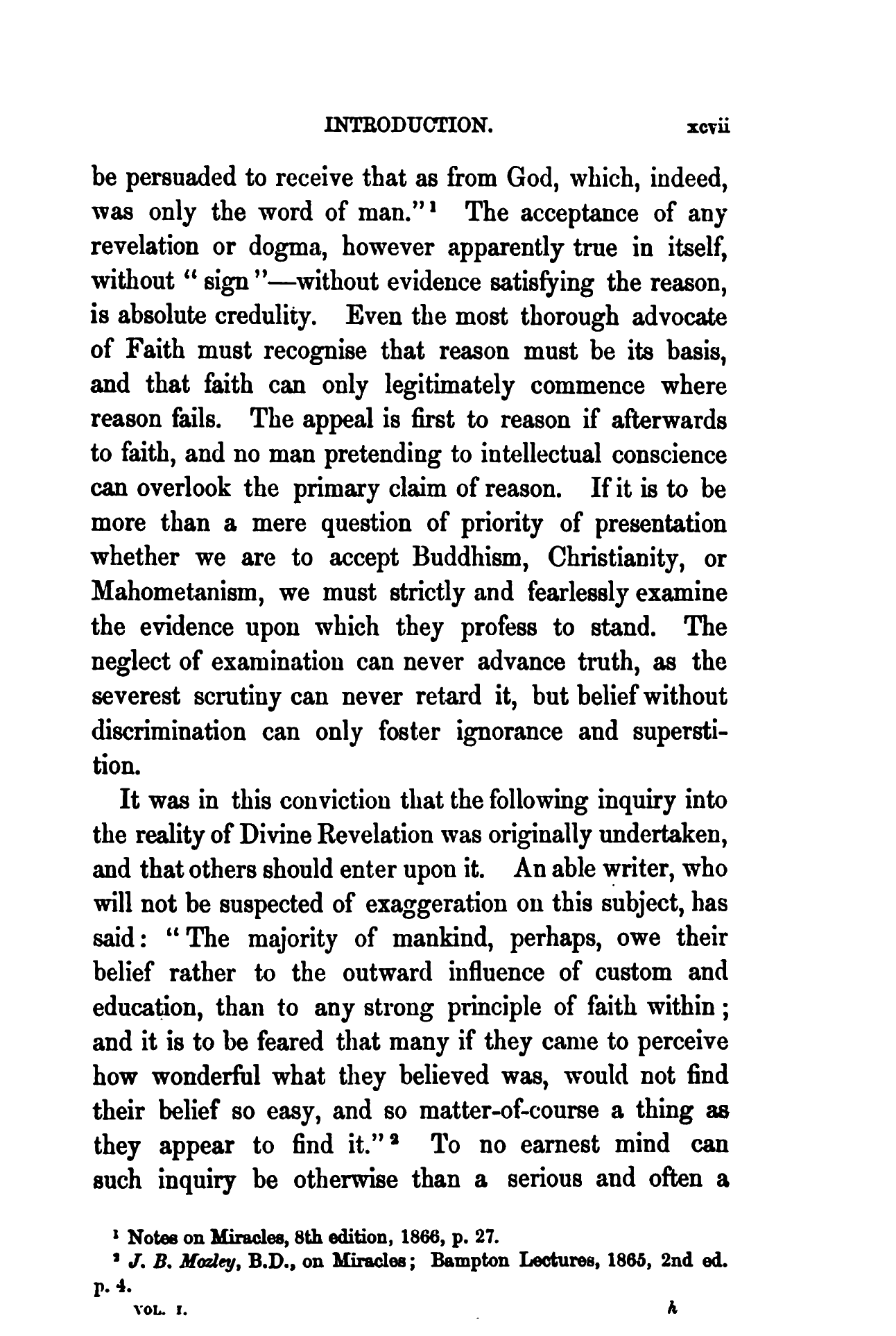 There are two serious misapprehensions of the purpose and line of argument of this work which I desire to correct. Some critics have objected that, if I had succeeded in establishing the proposition advanced in the first part, the second and third parts need not have been written: in fact, that the historical argument against miracles is only necessary in consequence of the failure of the philosophical. Now I contend that the historical is the necessary complement of the
