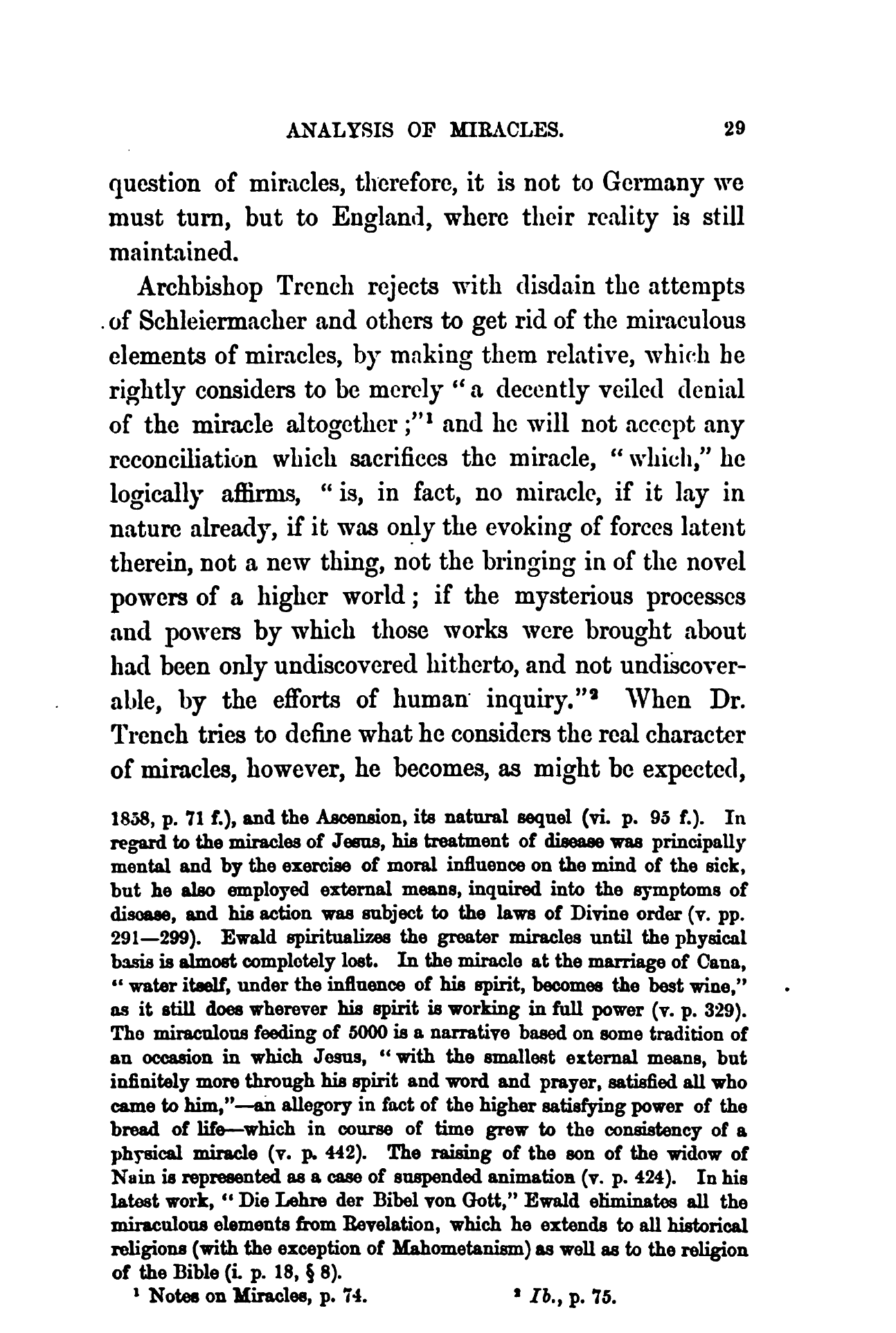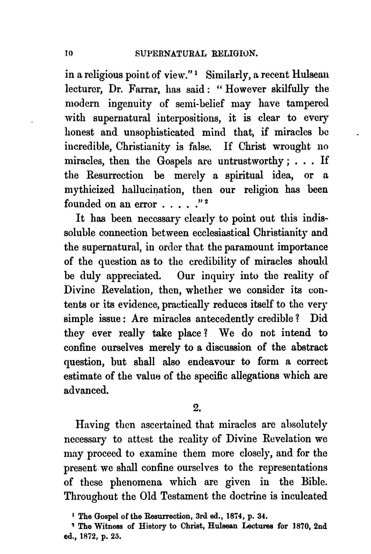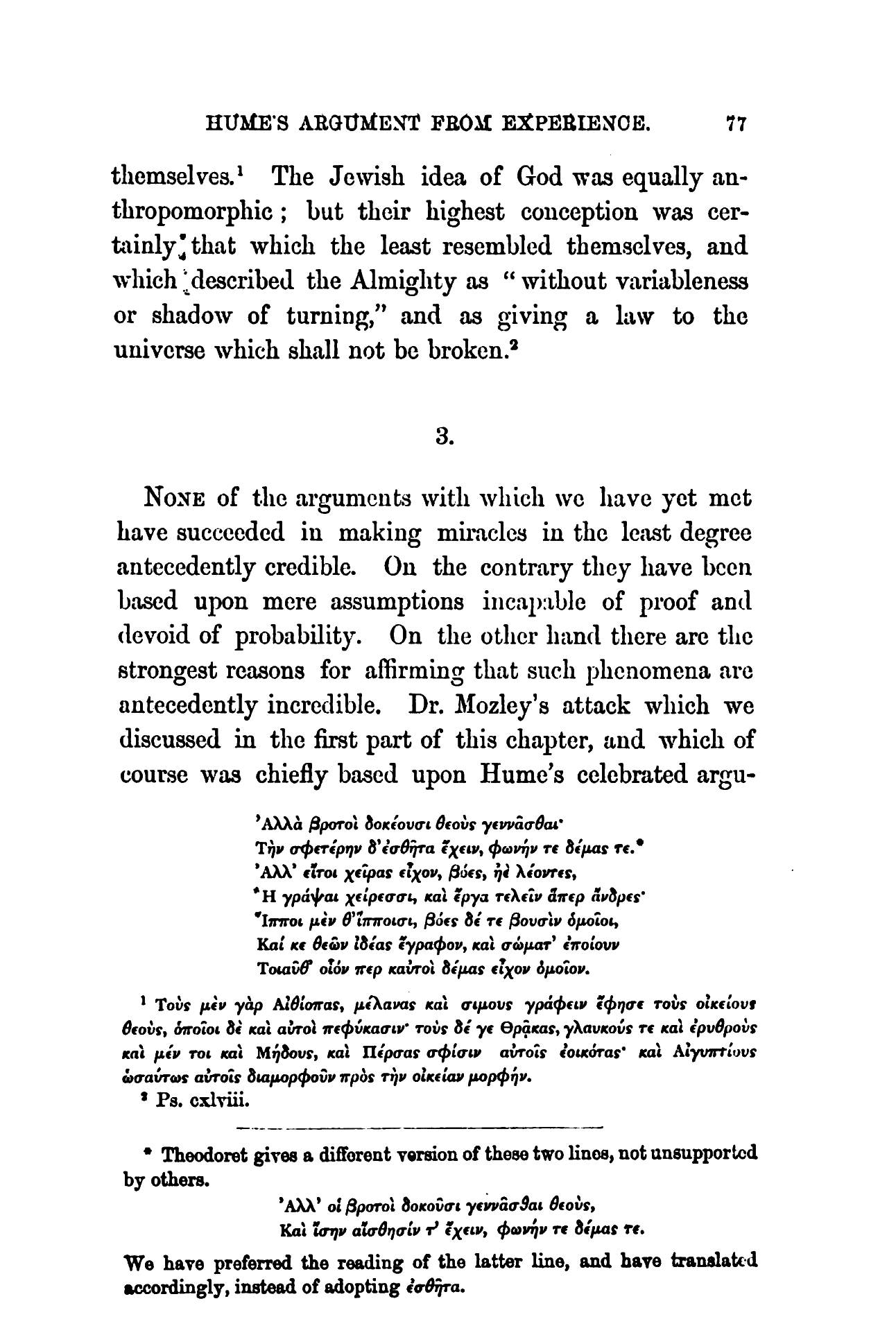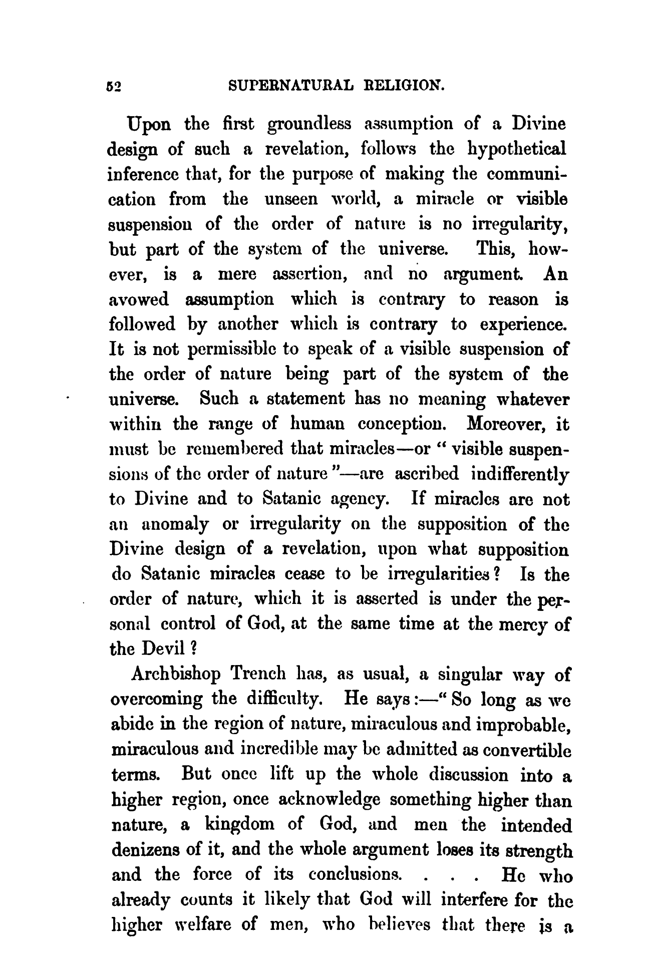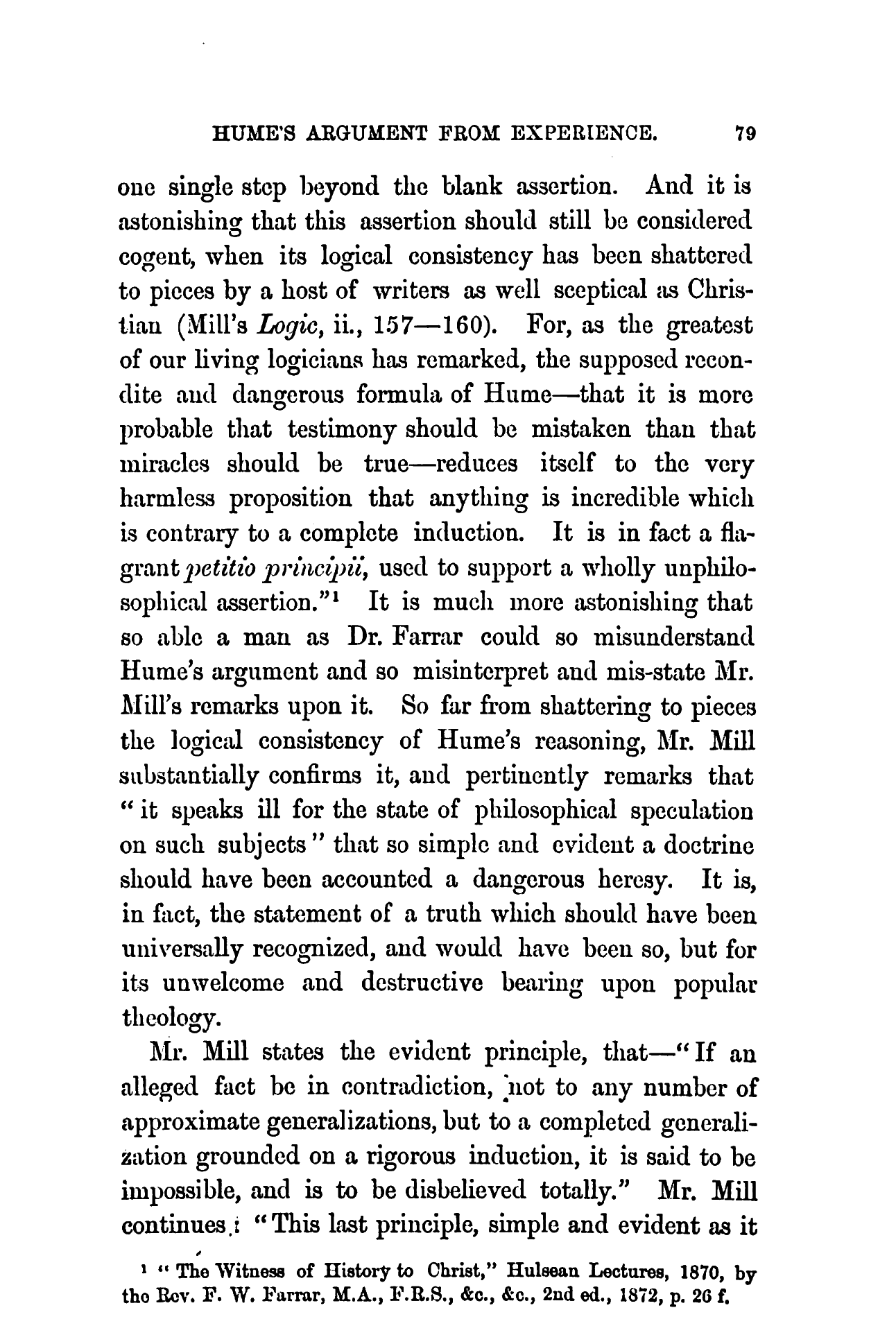 There are two serious misapprehensions of the purpose and line of argument of this work which I desire to correct. Some critics have objected that, if I had succeeded in establishing the proposition advanced in the first part, the second and third parts need not have been written: in fact, that the historical argument against miracles is only necessary in consequence of the failure of the philosophical. Now I contend that the historical is the necessary complement of the