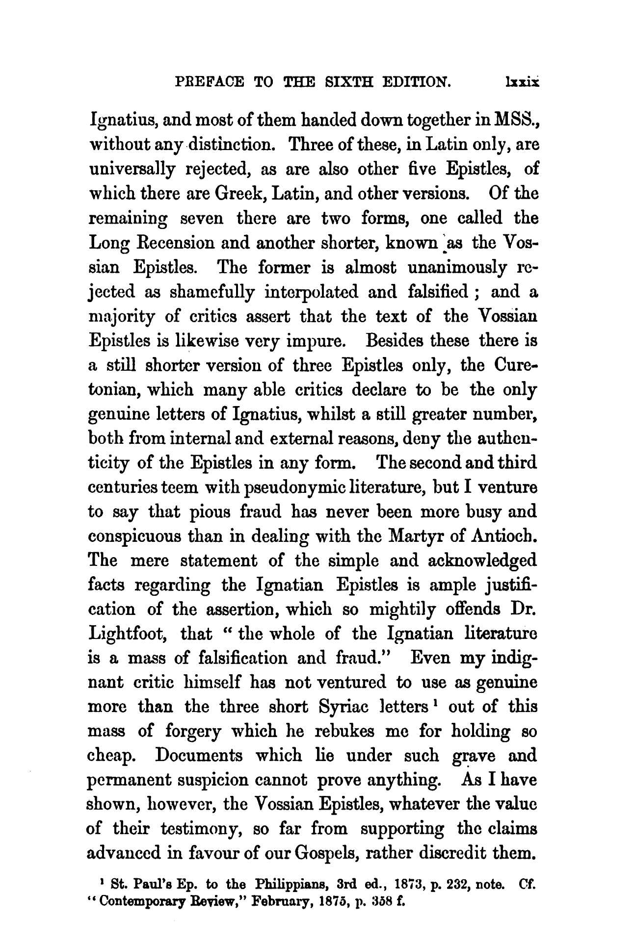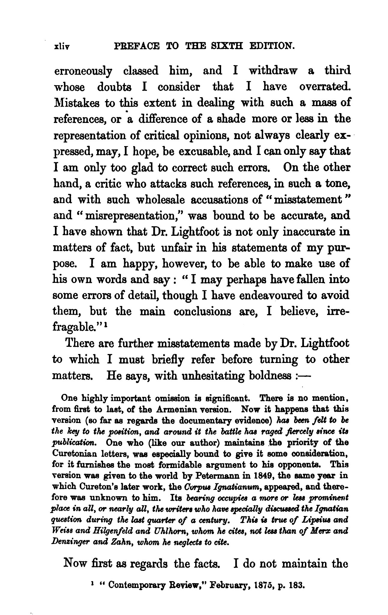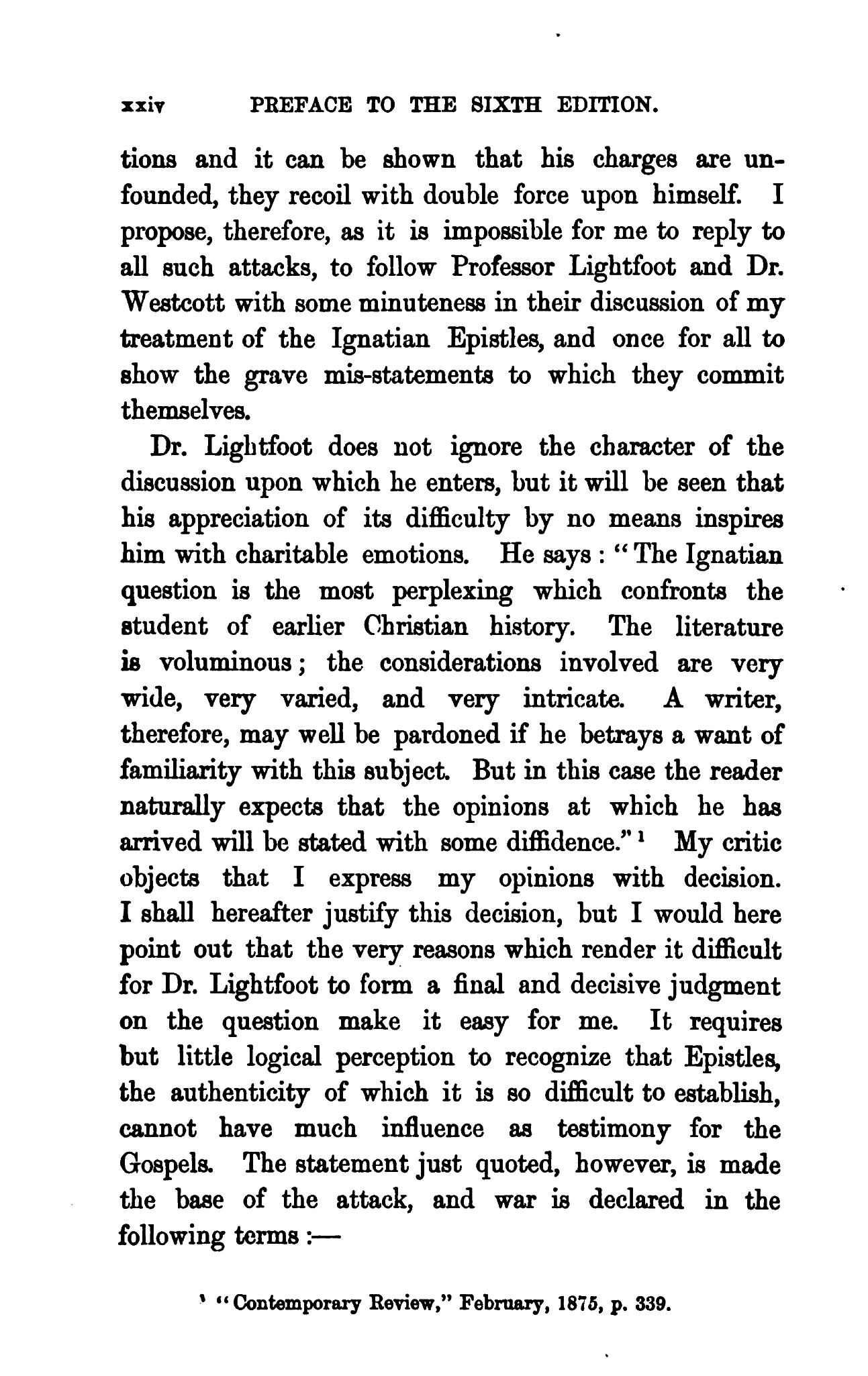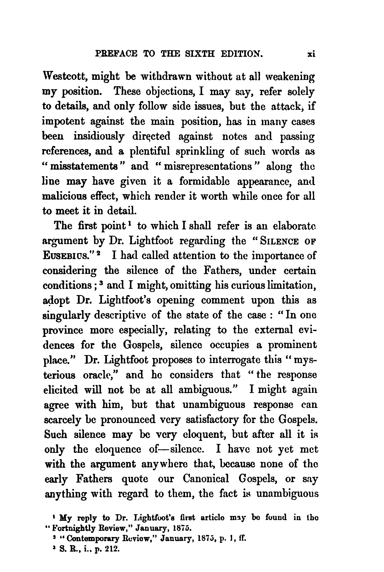 and Dr. Westcott for the minute attention they have bestowed upon my book. I had myself directly attacked the views of Dr. Westcott, and of course could only expect him to do his best or his worst against me in reply; and I am not surprised at the vigour with which Dr. Lightfoot has assailed a work so opposed to principles which he himself holds sacred, although I may be permitted to express my regret that he has not done so in a spirit more worthy of the cause which he defends. In spite of hostile criticism of very unusual minuteness and ability, no flaw or error has been pointed out which in the slightest degree affects my main argument, and I consider that every point yet objected to by Dr. Lightfoot, or indicated by Dr.