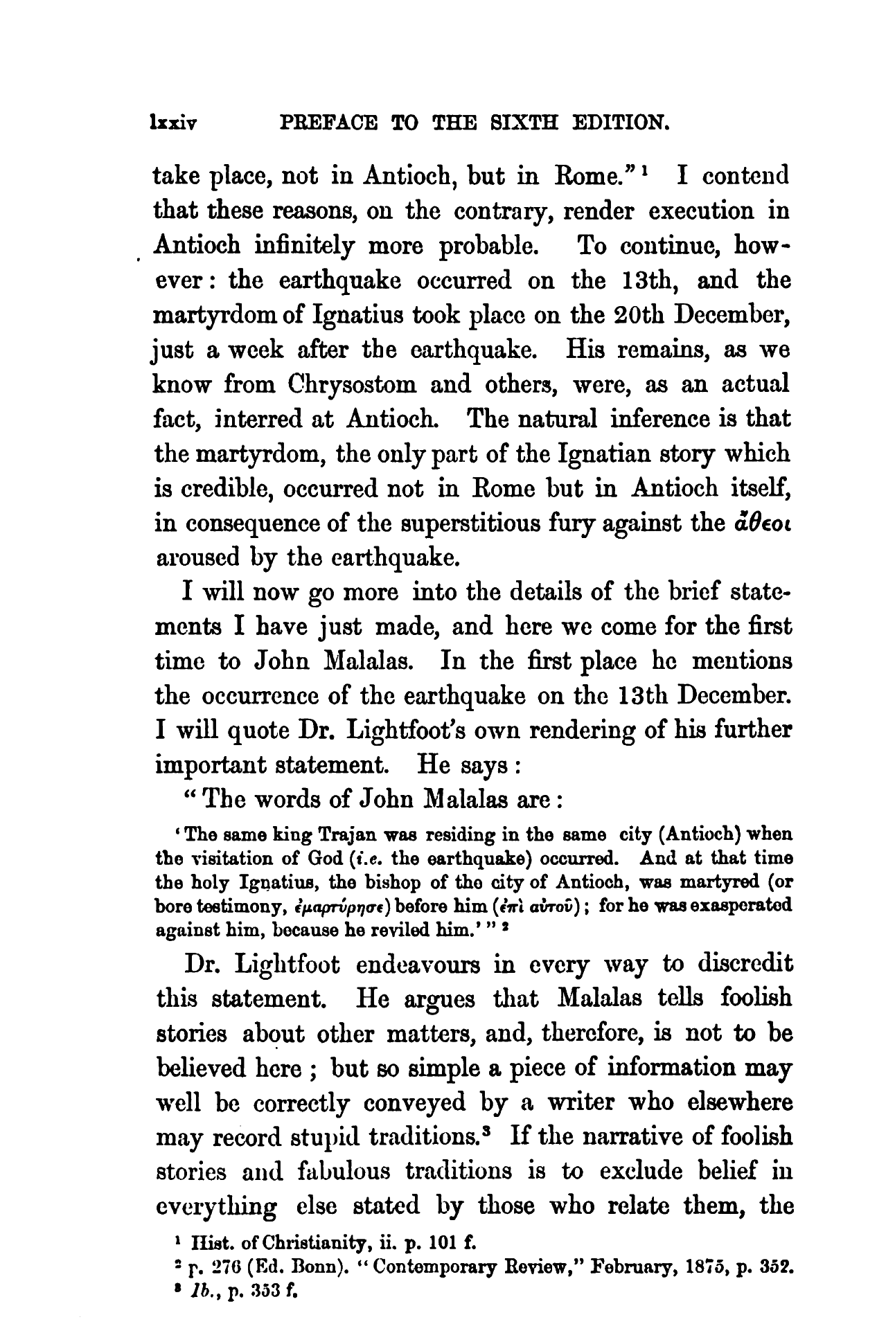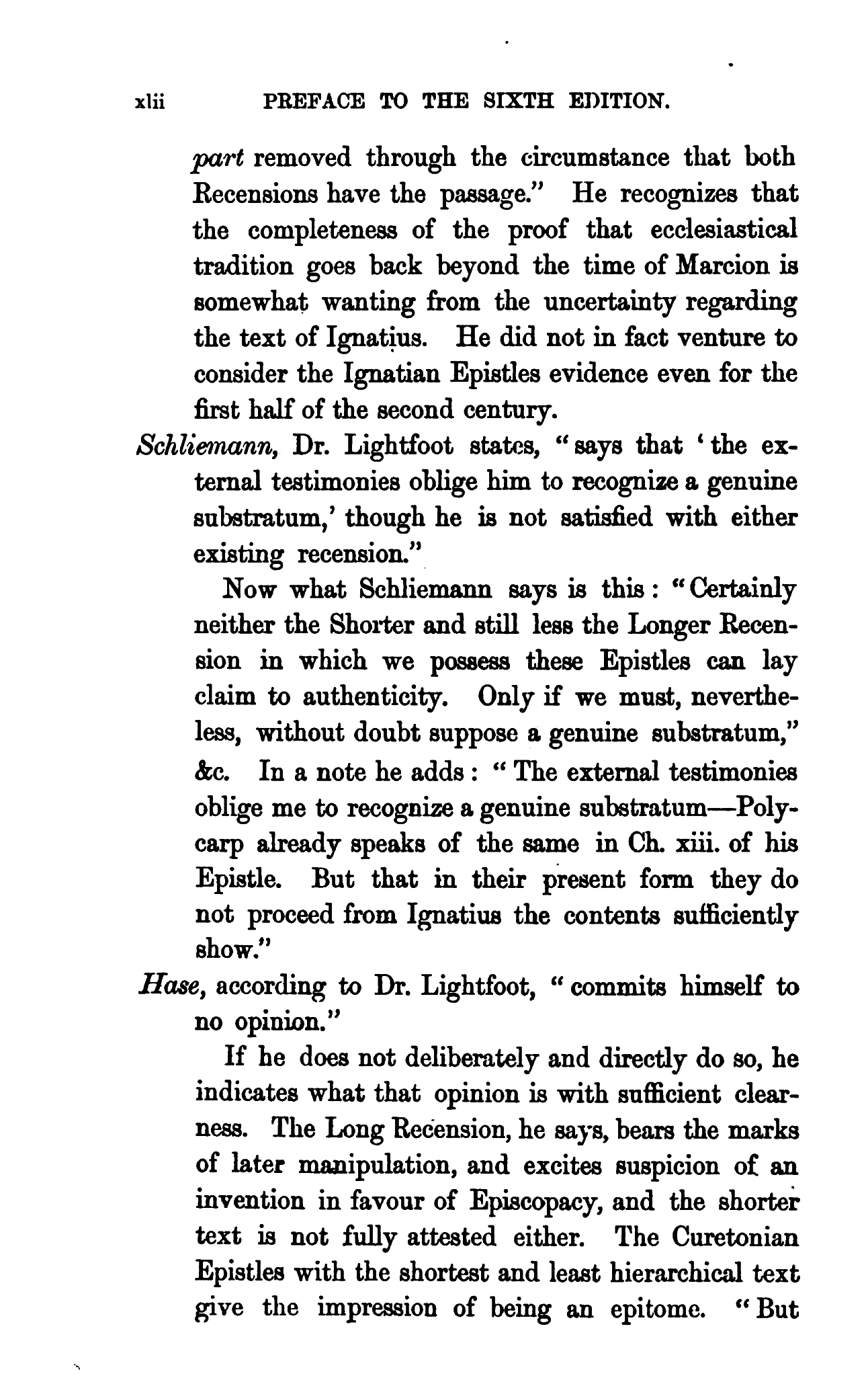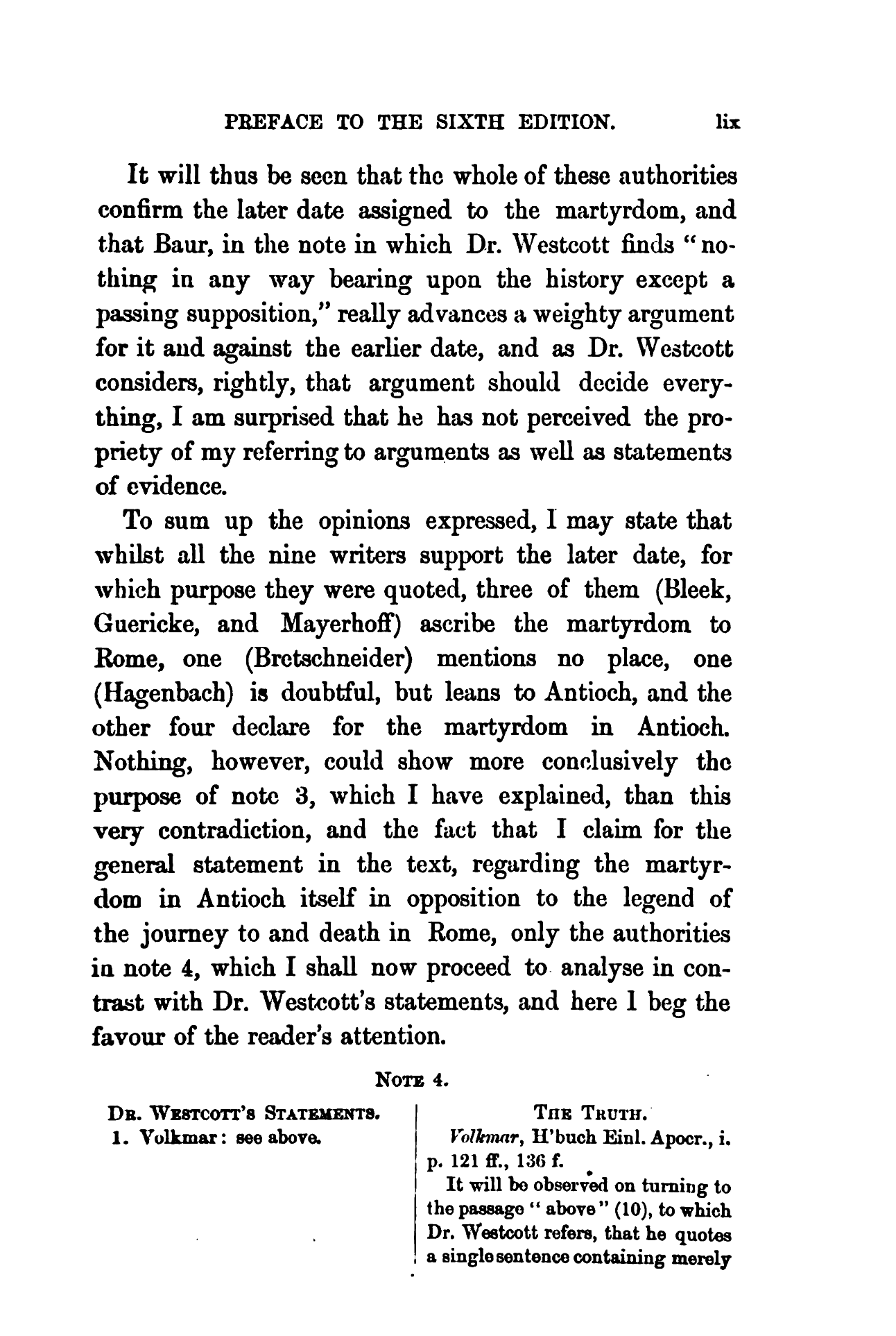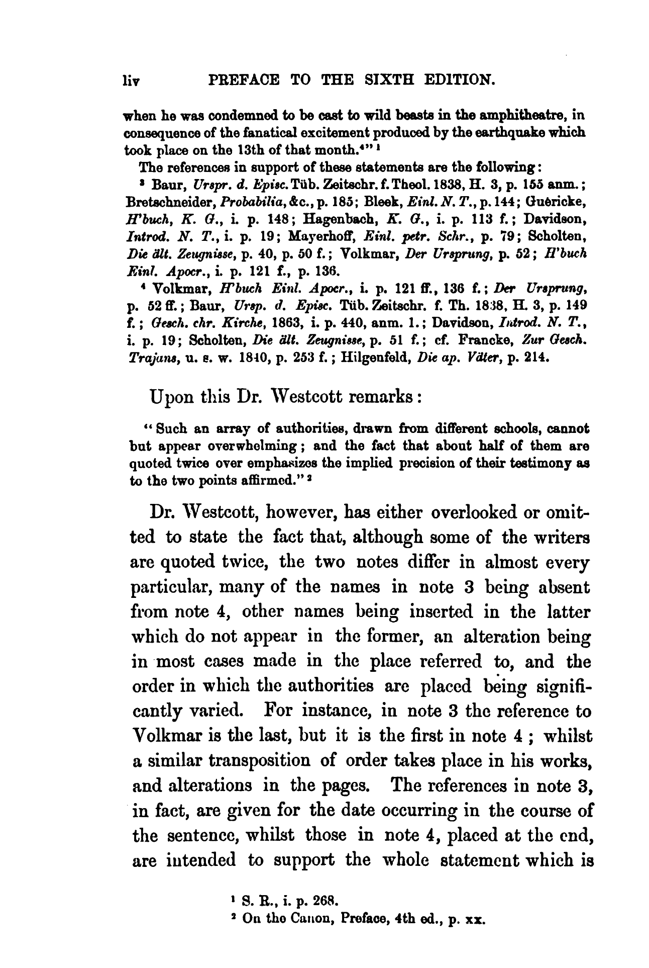 and Dr. Westcott for the minute attention they have bestowed upon my book. I had myself directly attacked the views of Dr. Westcott, and of course could only expect him to do his best or his worst against me in reply; and I am not surprised at the vigour with which Dr. Lightfoot has assailed a work so opposed to principles which he himself holds sacred, although I may be permitted to express my regret that he has not done so in a spirit more worthy of the cause which he defends. In spite of hostile criticism of very unusual minuteness and ability, no flaw or error has been pointed out which in the slightest degree affects my main argument, and I consider that every point yet objected to by Dr. Lightfoot, or indicated by Dr.