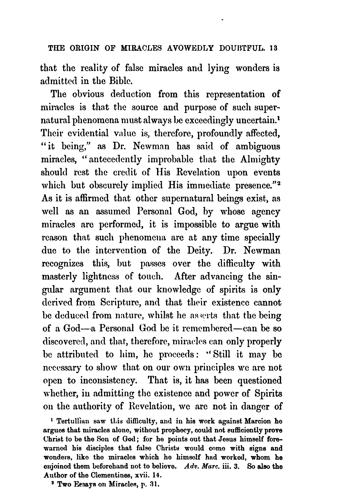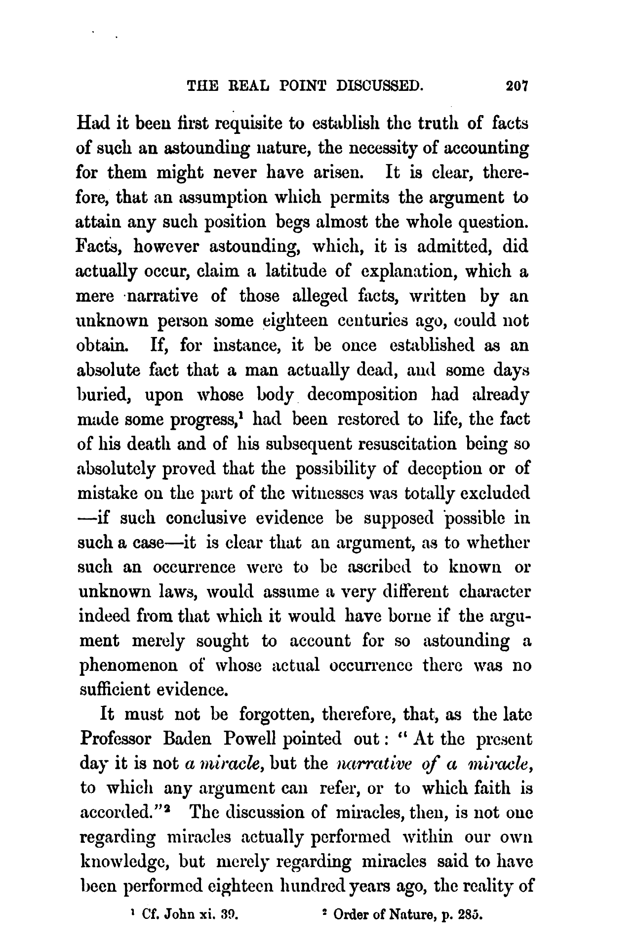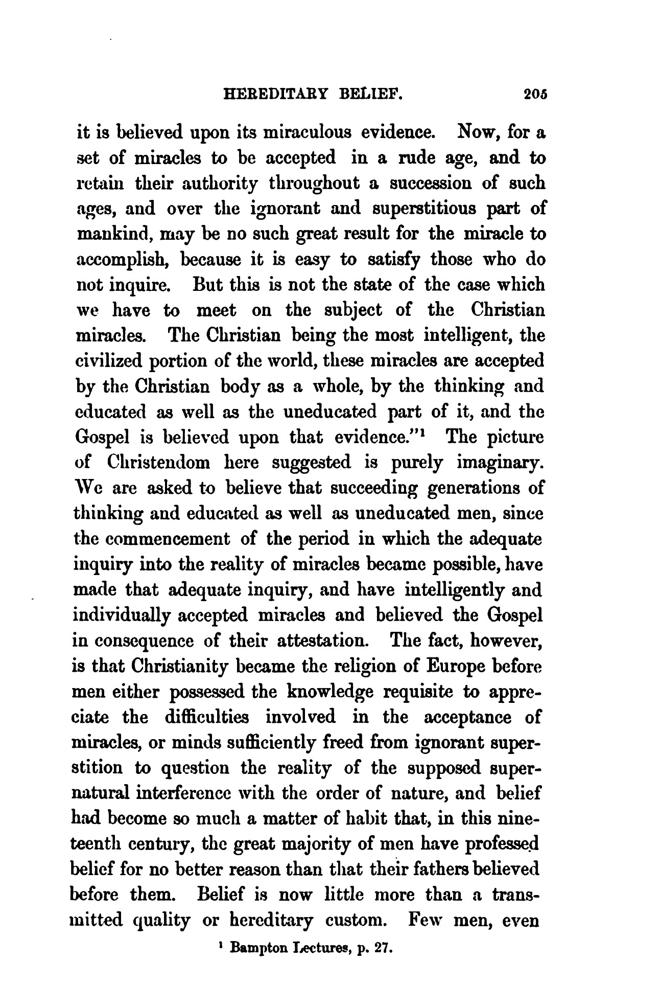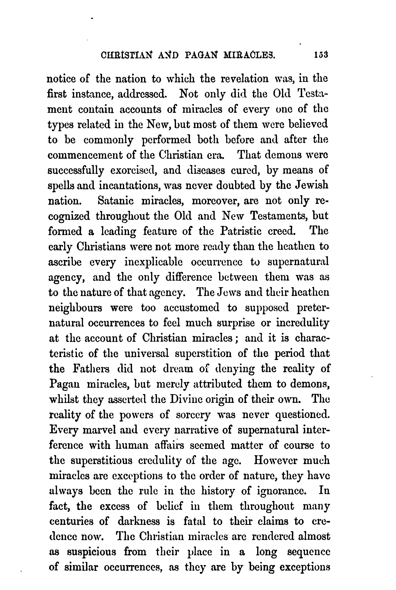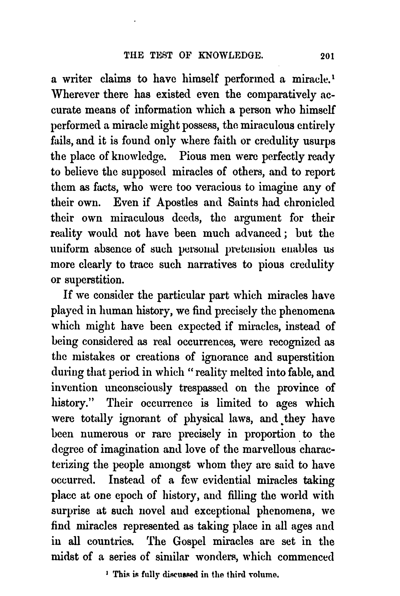 persons, equally ignorant and superstitious, have believed them. I venture to say that no one who advances the argument to which I am referring can have realized the nature of the question at issue, and the relation of miracles to the order of nature.