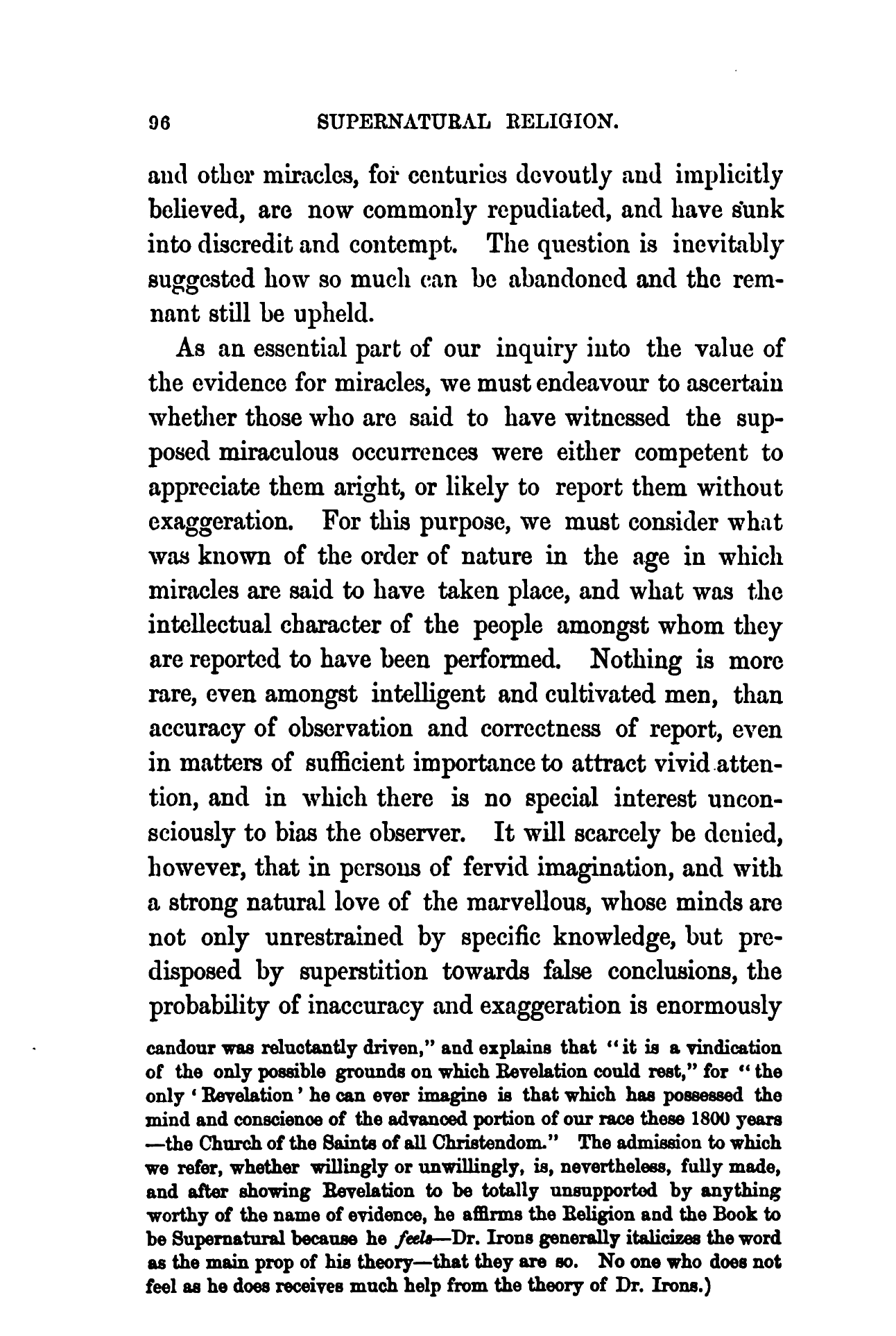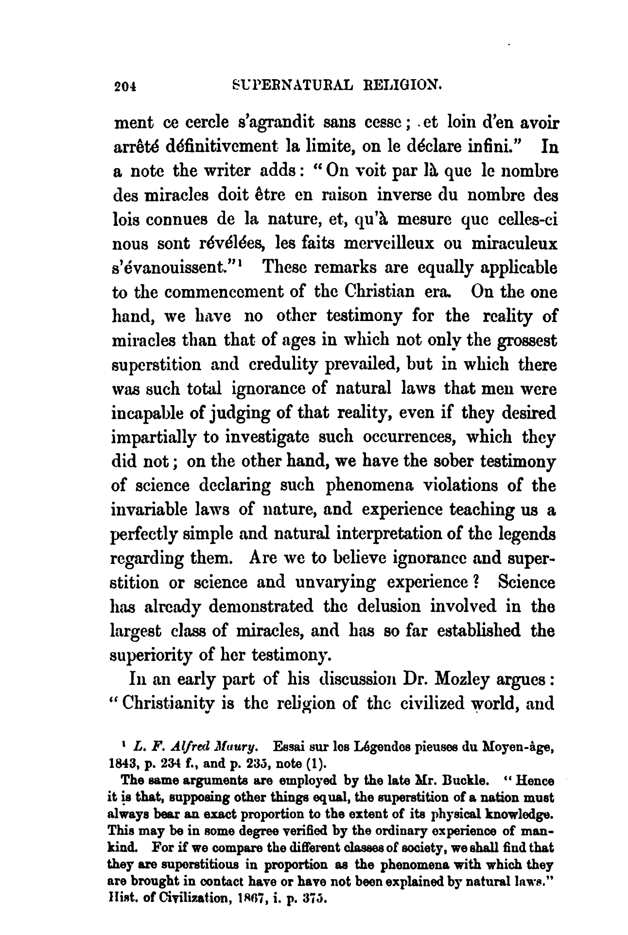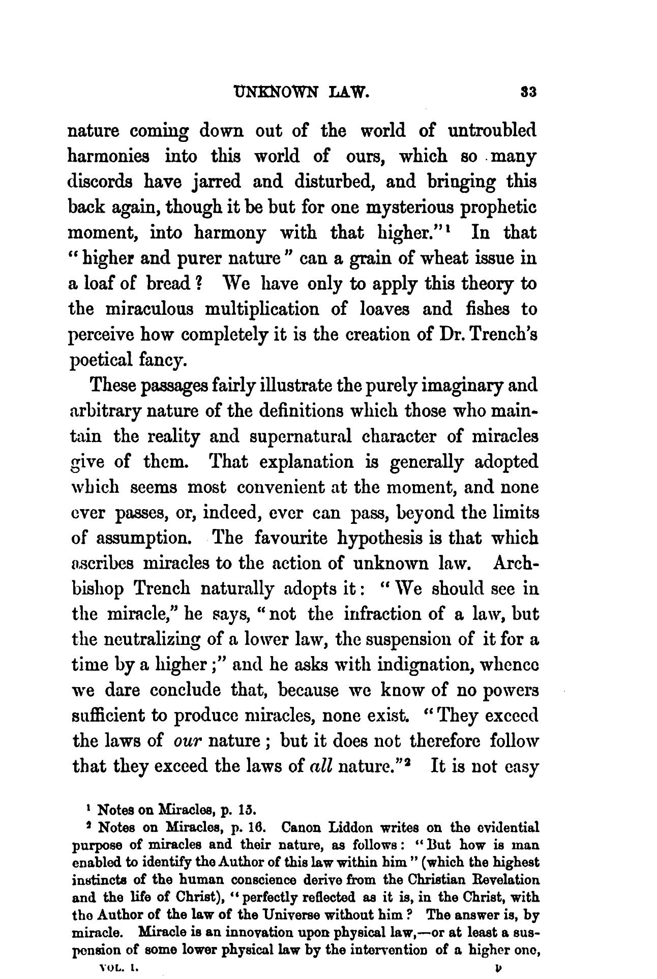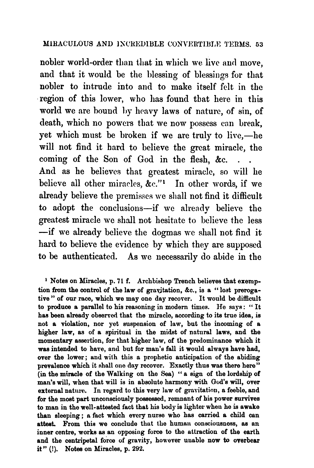 persons, equally ignorant and superstitious, have believed them. I venture to say that no one who advances the argument to which I am referring can have realized the nature of the question at issue, and the relation of miracles to the order of nature.