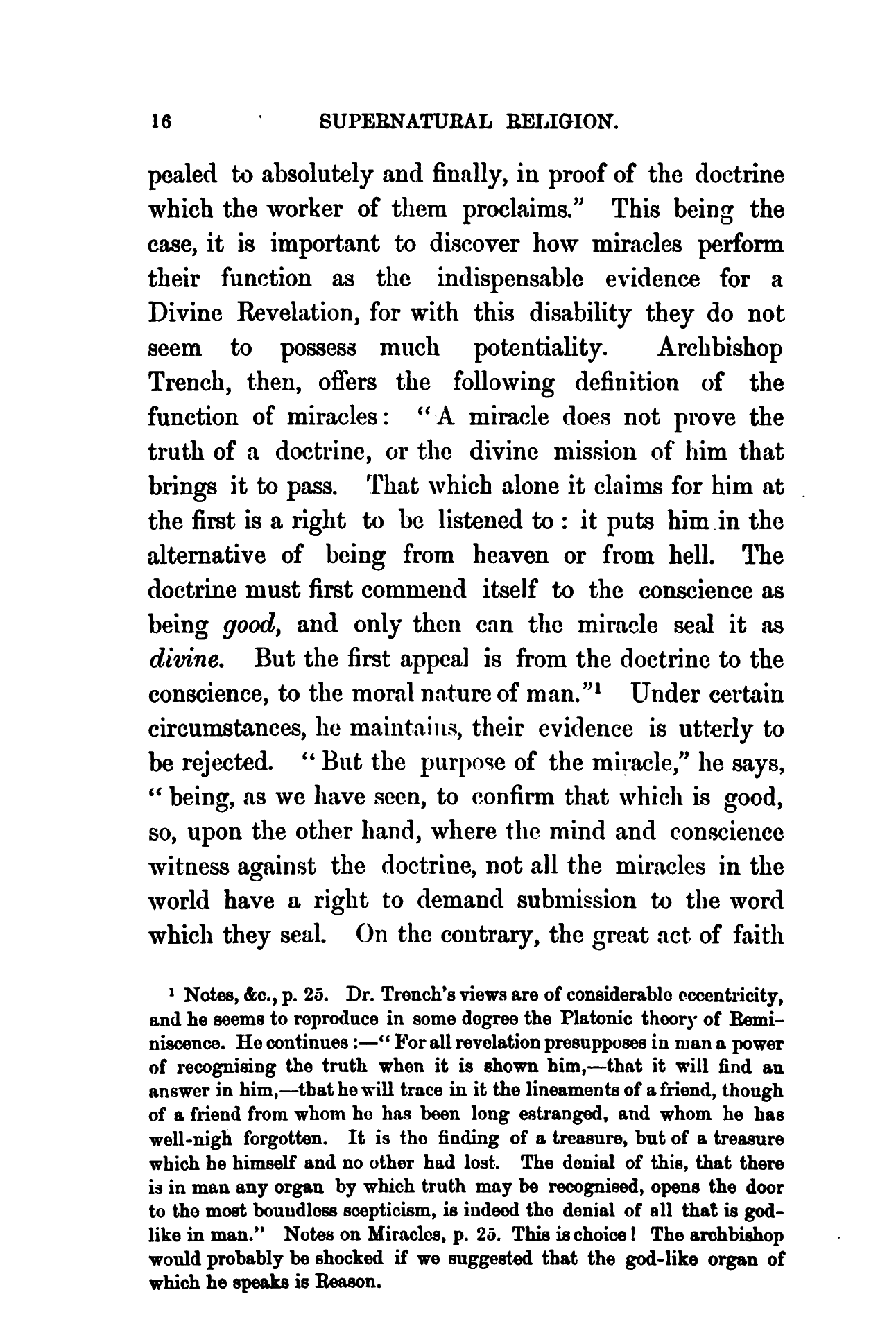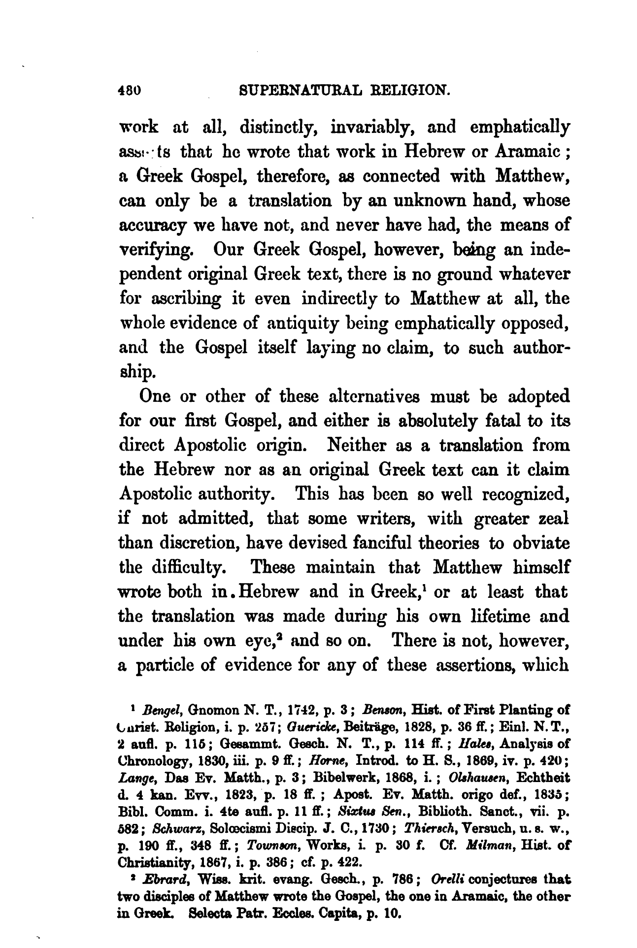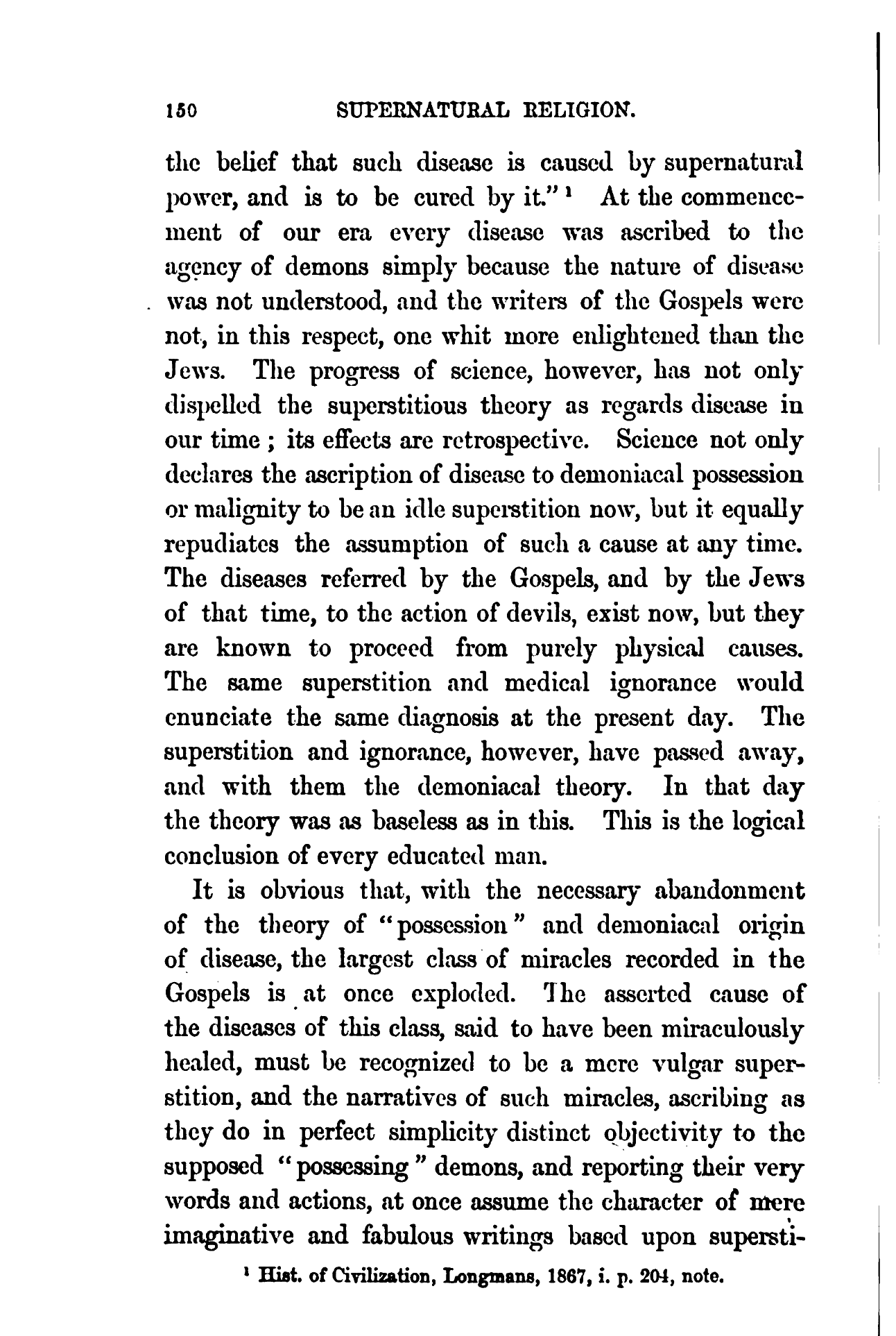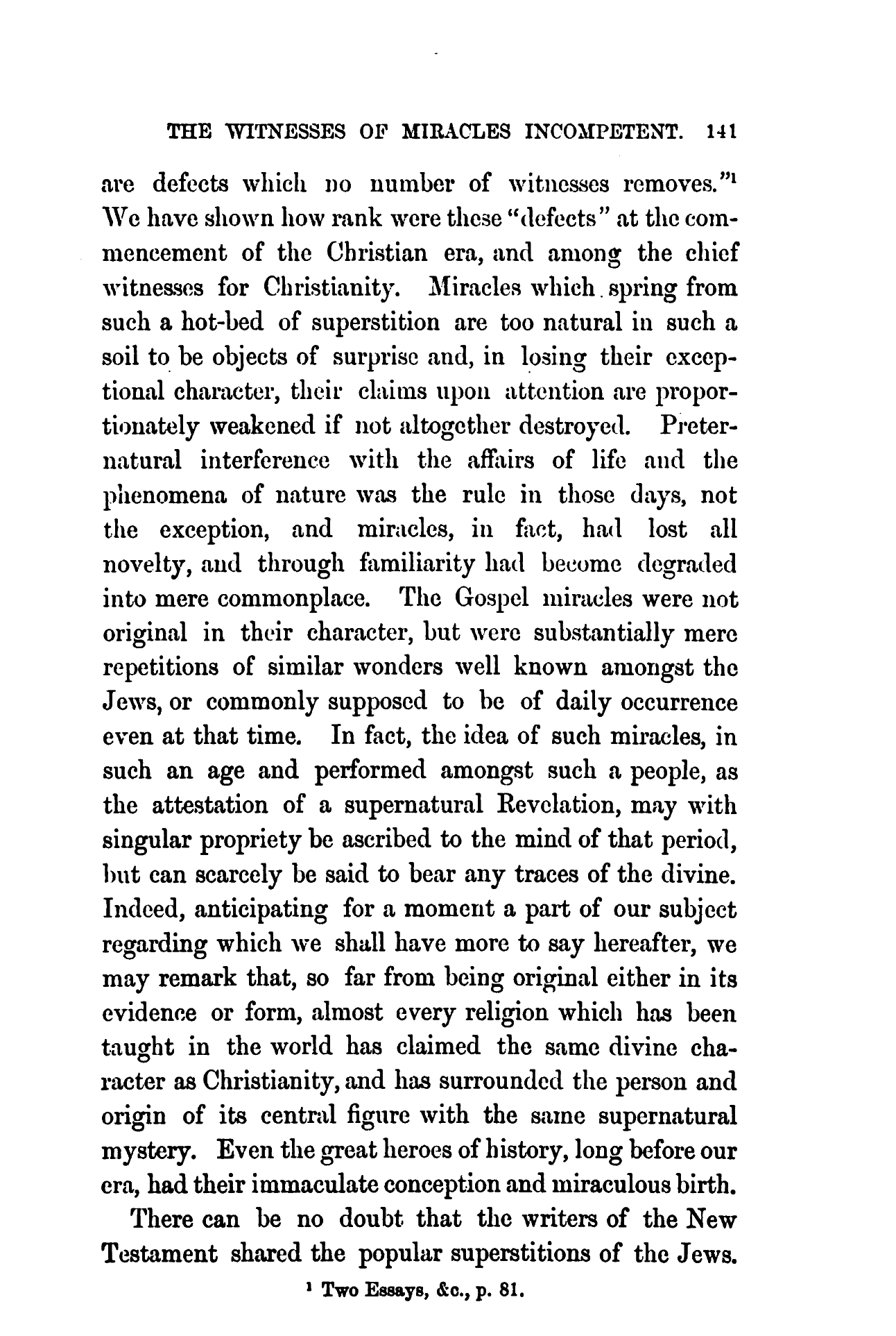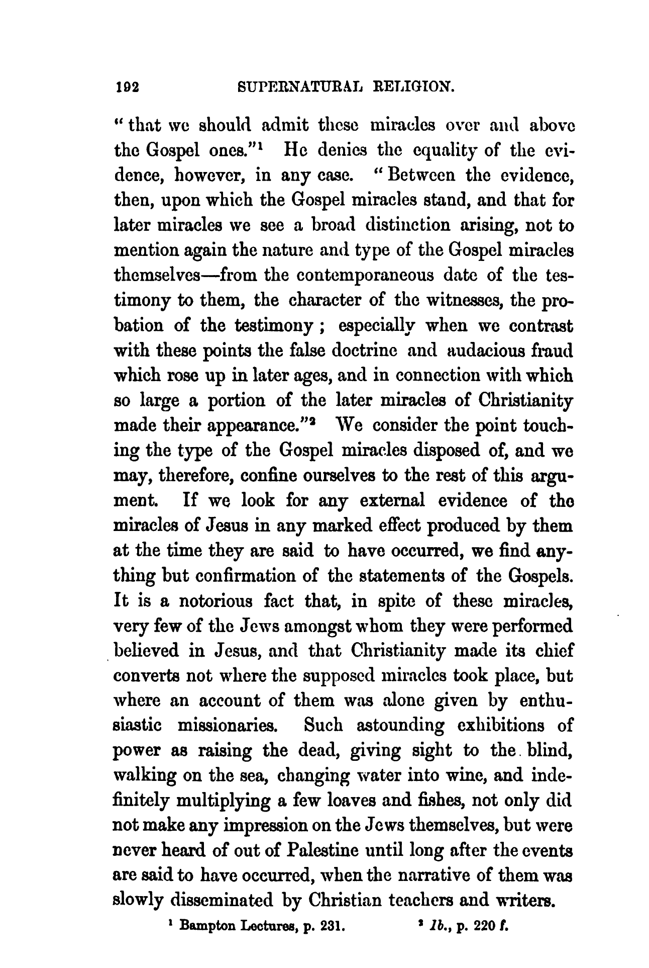 sufficient testimony to warrant belief in the actual occurrence of miracles declared to be antecedently incredible, there is not a certain trace even of the existence of the Gospels for a century and a half after those miracles are alleged to have occurred, and nothing whatever to attest their authenticity and truth. This is a very different thing from an endeavour to establish some special theory of my own, and it is because this line of argument has not been understood, that some critics have expressed surprise at the decisive rejection of mere conjectures and possibilities as evidence. In a case of such importance, no testimony which is not clear and indubitable could be of any value, but the evidence producible for the canonical Gospels falls very far short even of ordinary requirements, and in relation to miracles it is scarcely deserving of serious consideration.