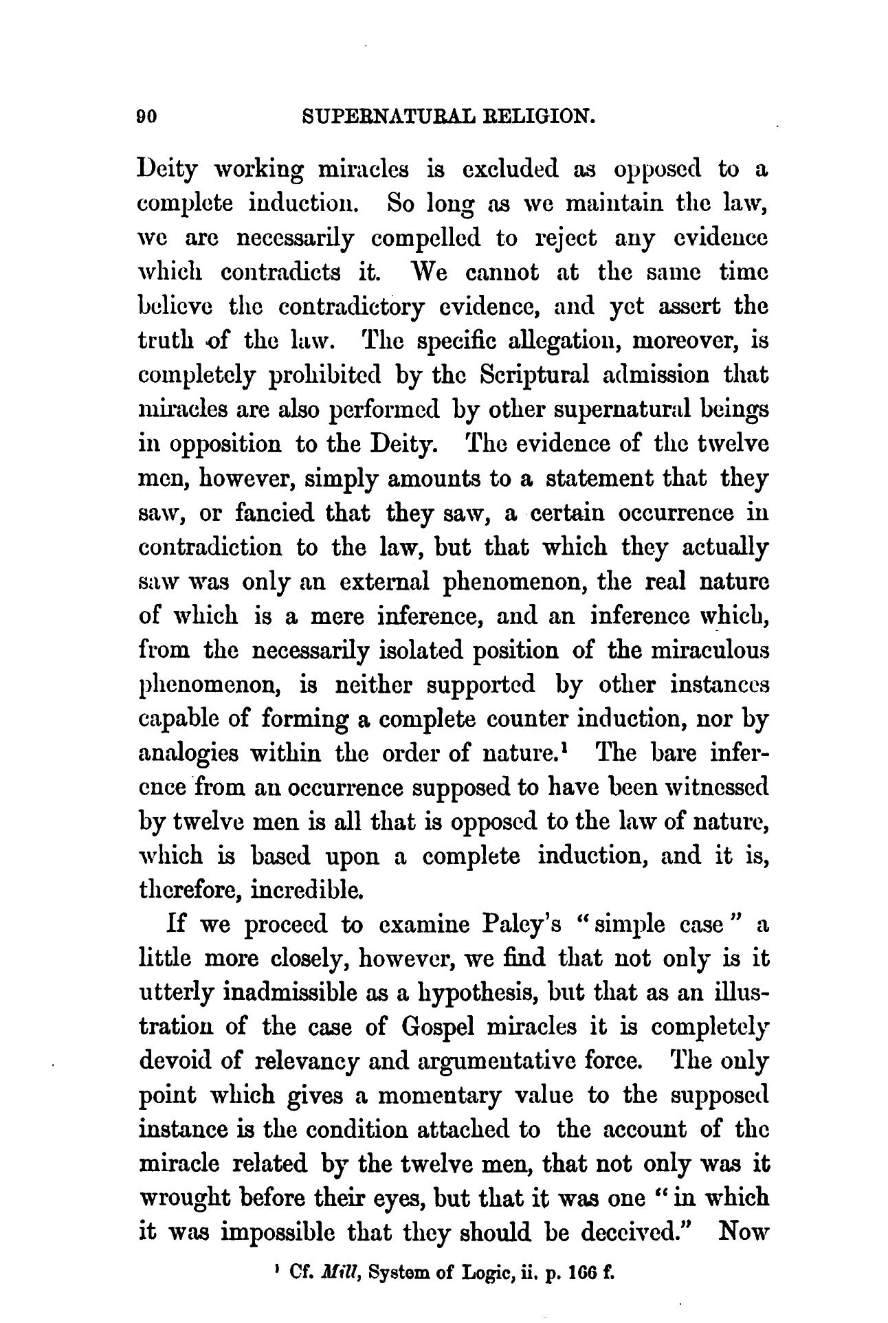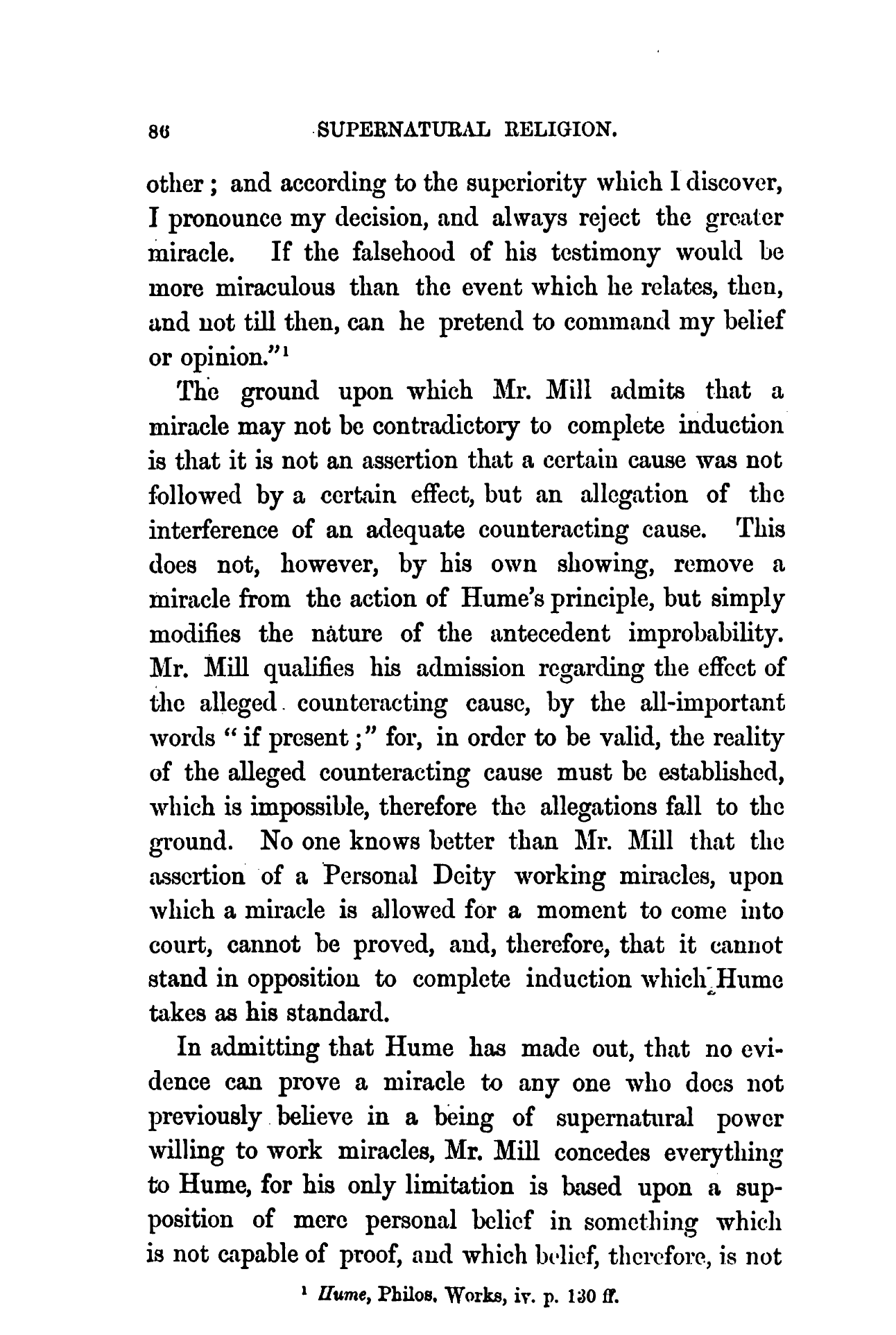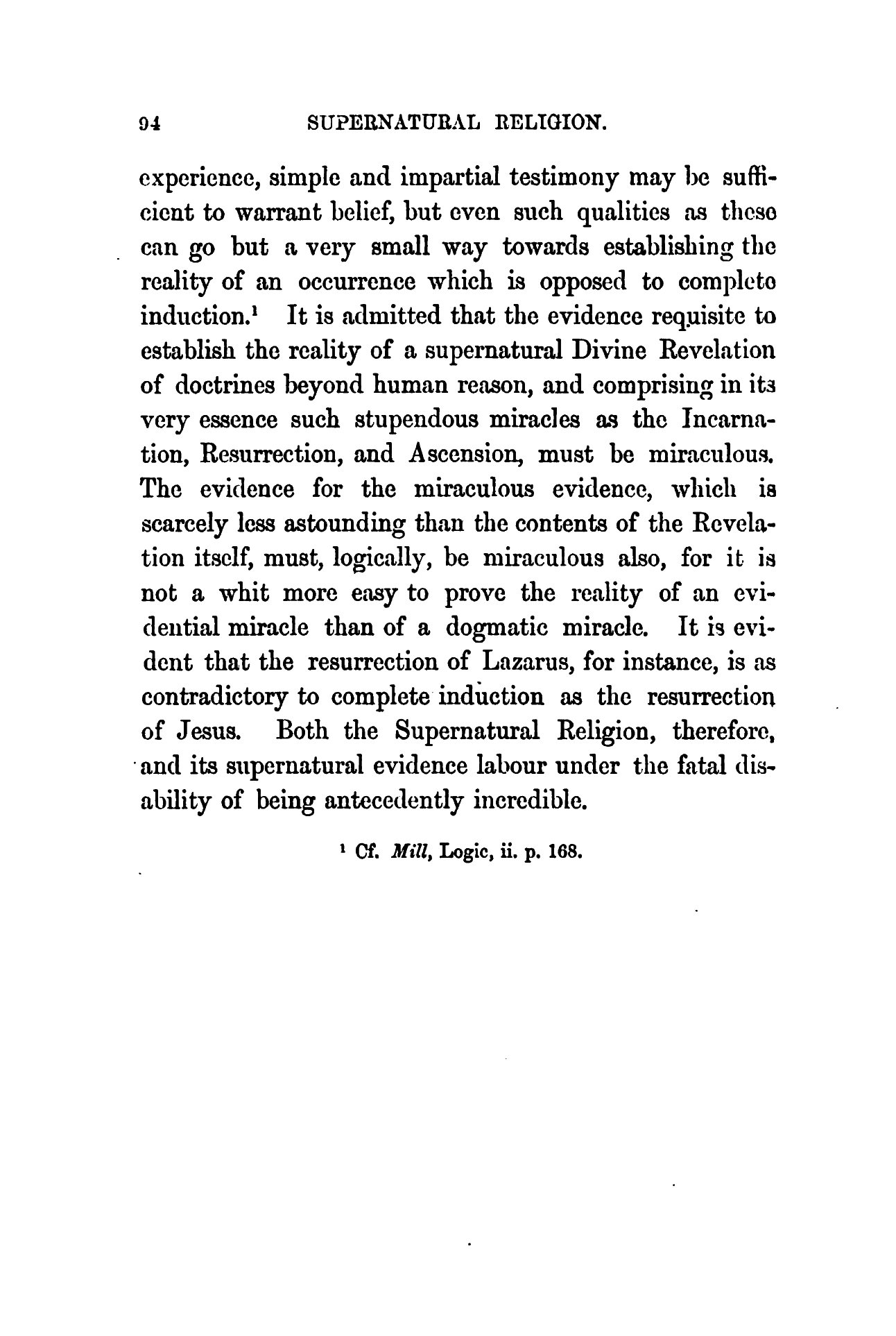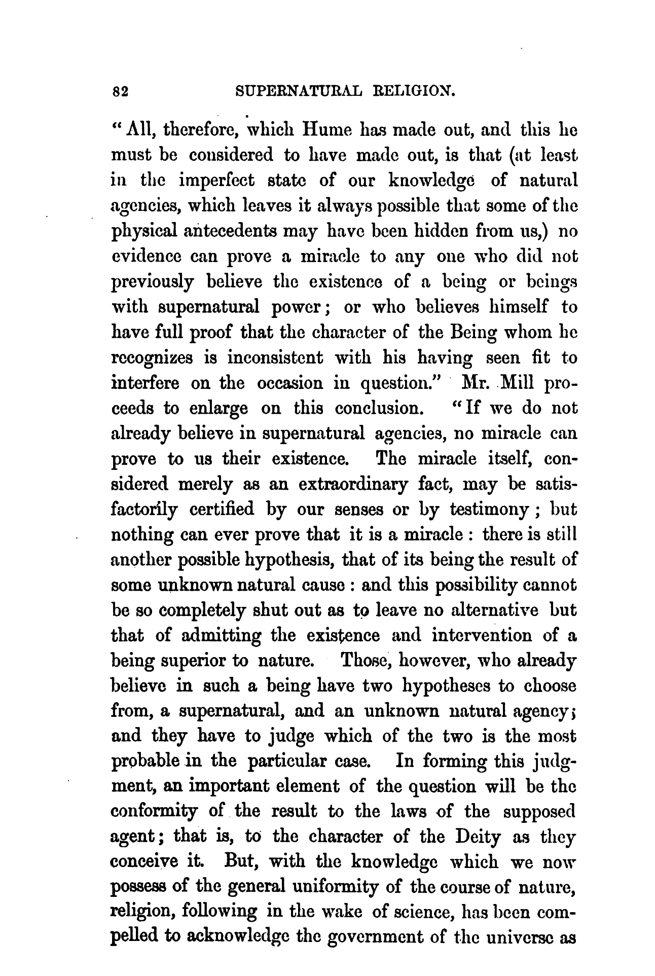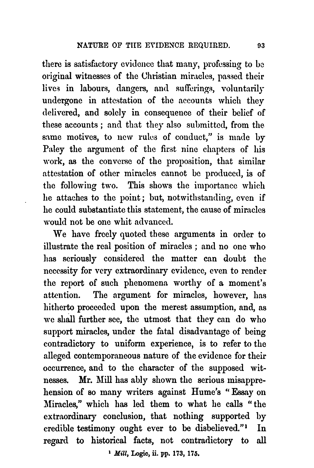 He maintains that it is possible to prove the reality of a supernatural fact if it actually occurred; and after showing the great preponderance of evidence against miracles, or their antecedent incredibility, he proceeds: "Against this weight of negative evidence we have to set such positive evidence as is produced in attestation of exceptions; in other words, the positive evidences of miracles"(2) This is precisely what I have done. In order to show that Mr. Mill's estimate of the nature of this positive evidence for miracles does not essentially differ from the results of this work, the following lines may be quoted:—