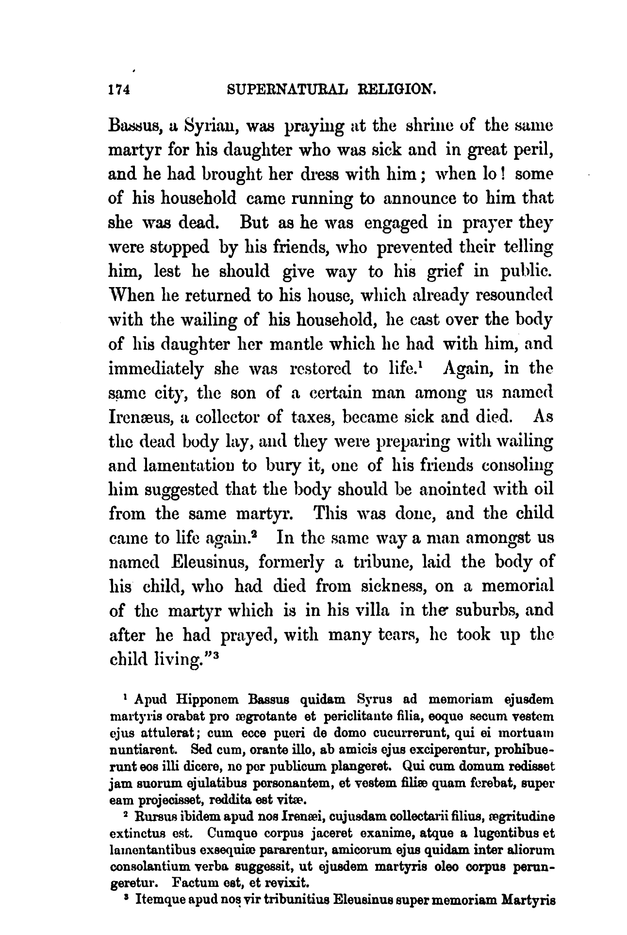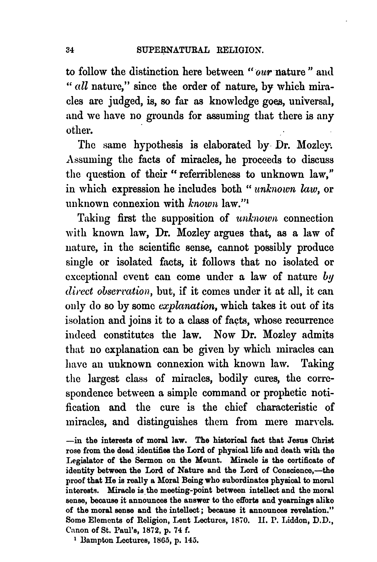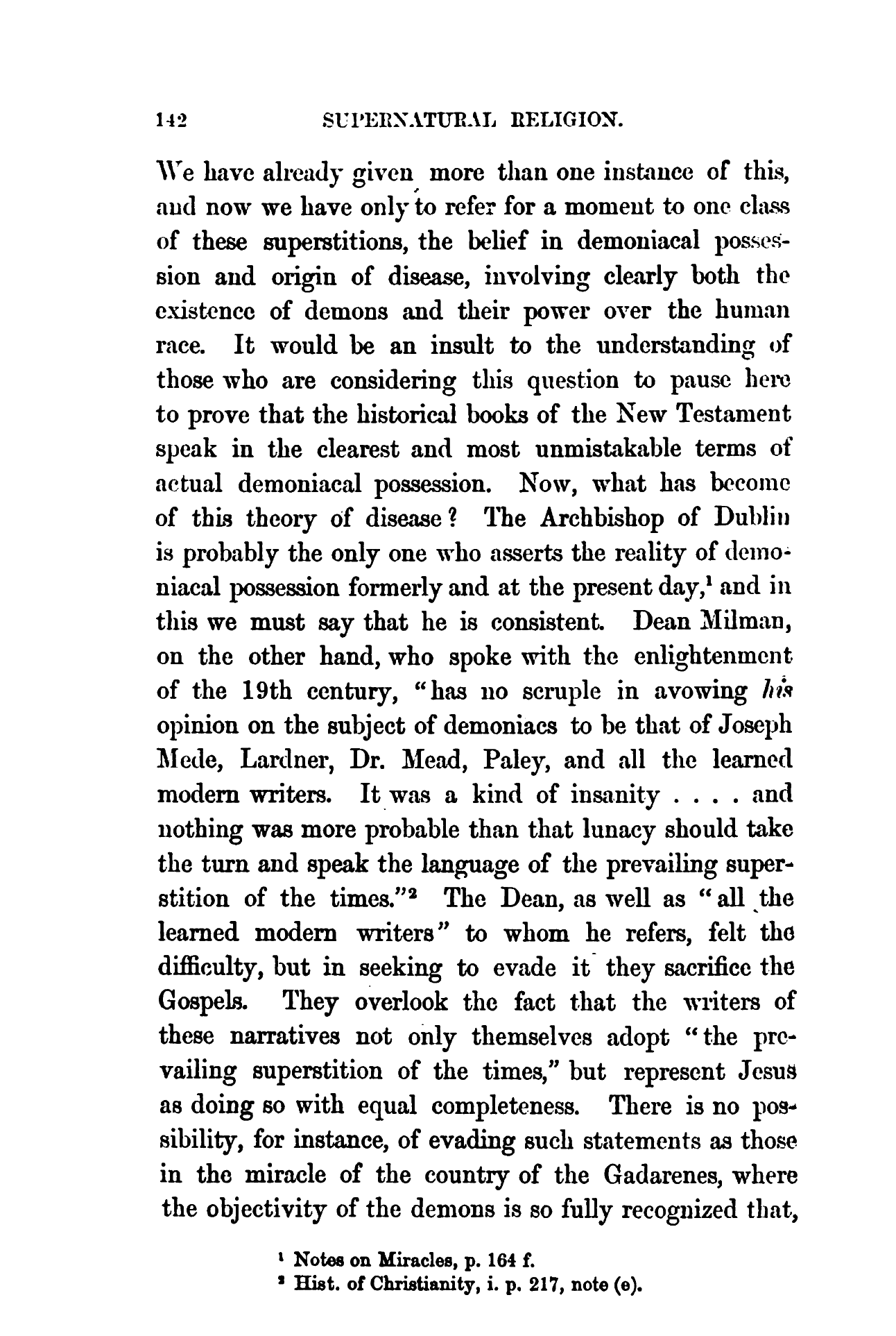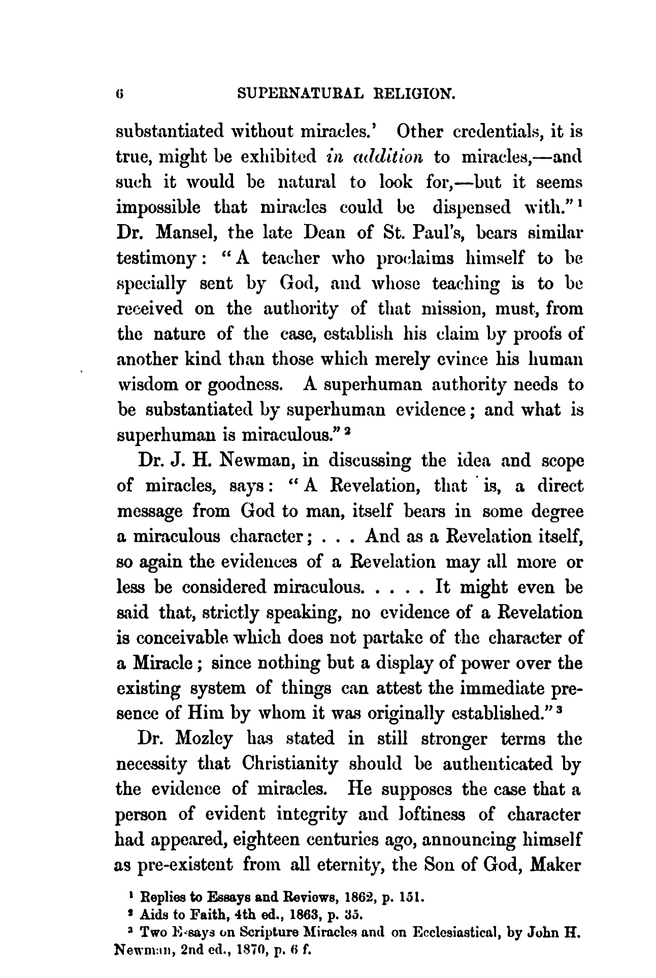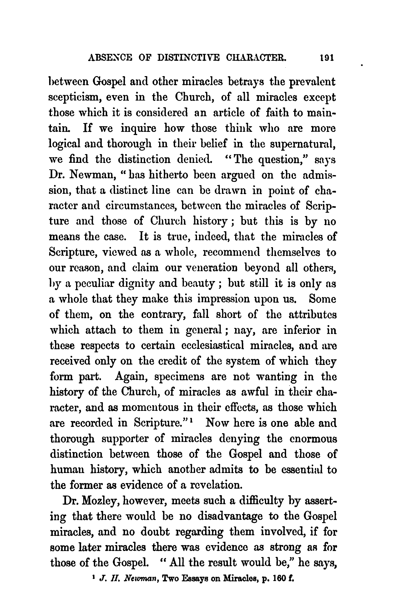 He maintains that it is possible to prove the reality of a supernatural fact if it actually occurred; and after showing the great preponderance of evidence against miracles, or their antecedent incredibility, he proceeds: "Against this weight of negative evidence we have to set such positive evidence as is produced in attestation of exceptions; in other words, the positive evidences of miracles"(2) This is precisely what I have done. In order to show that Mr. Mill's estimate of the nature of this positive evidence for miracles does not essentially differ from the results of this work, the following lines may be quoted:—