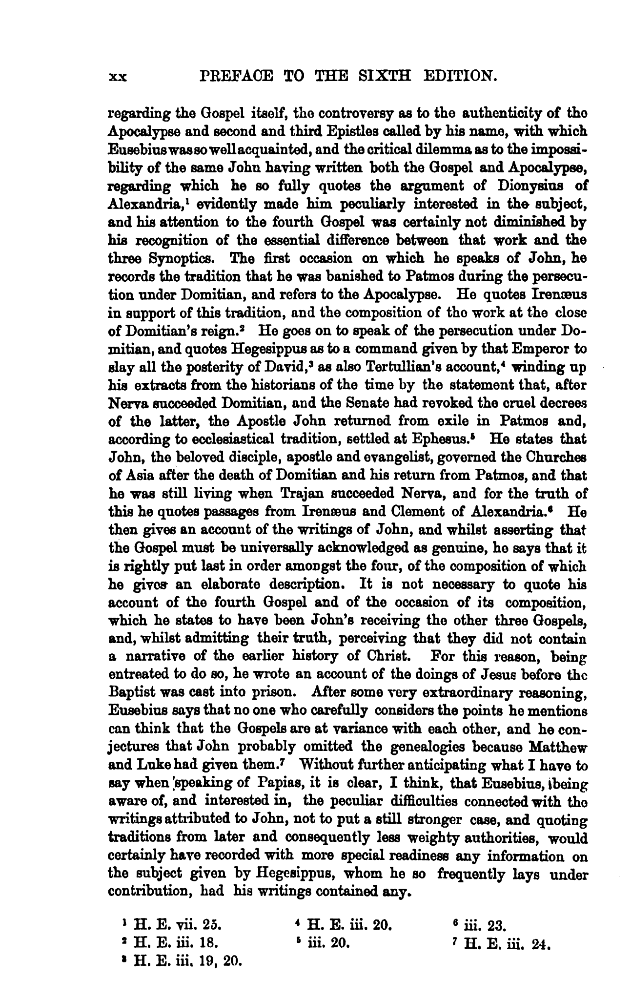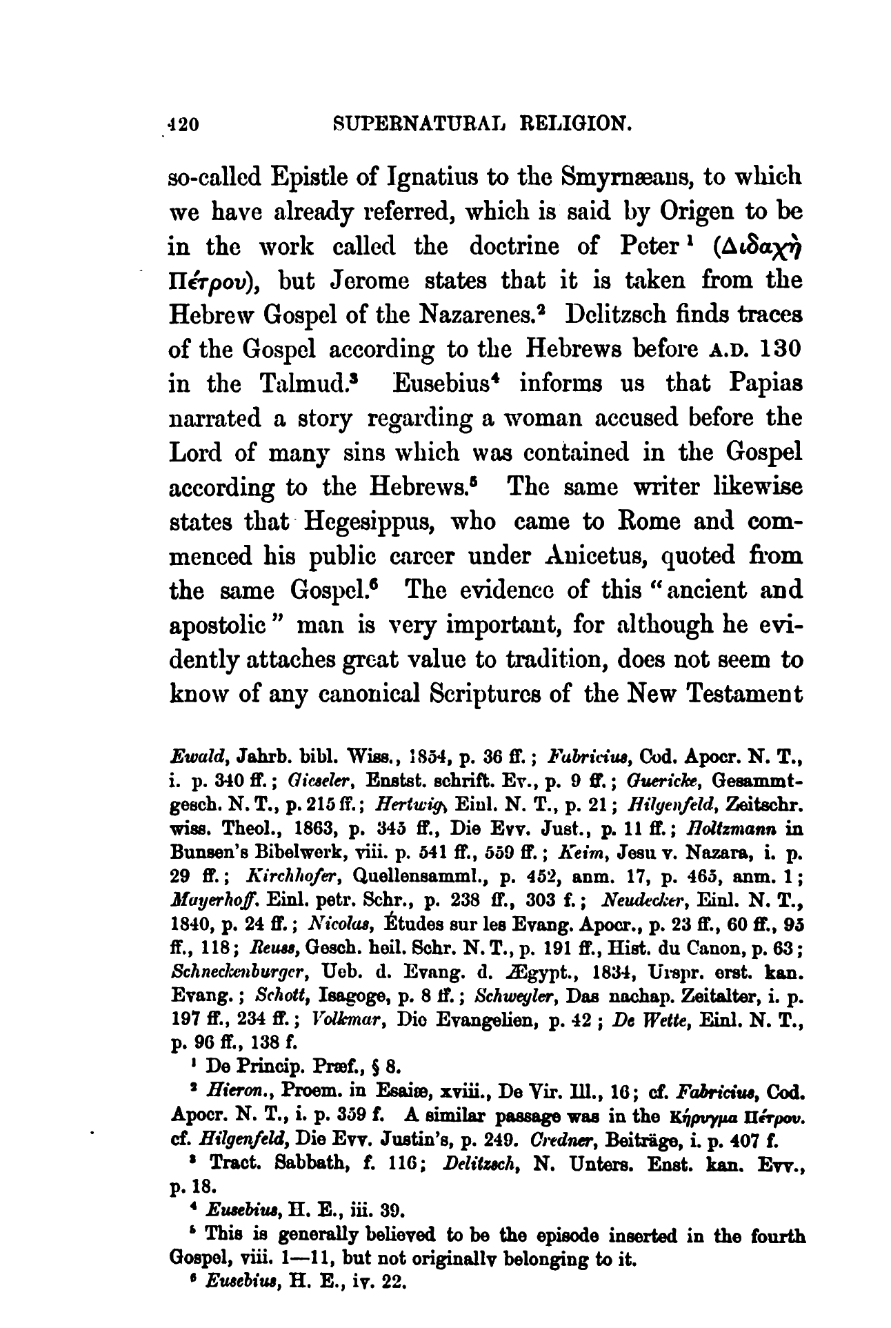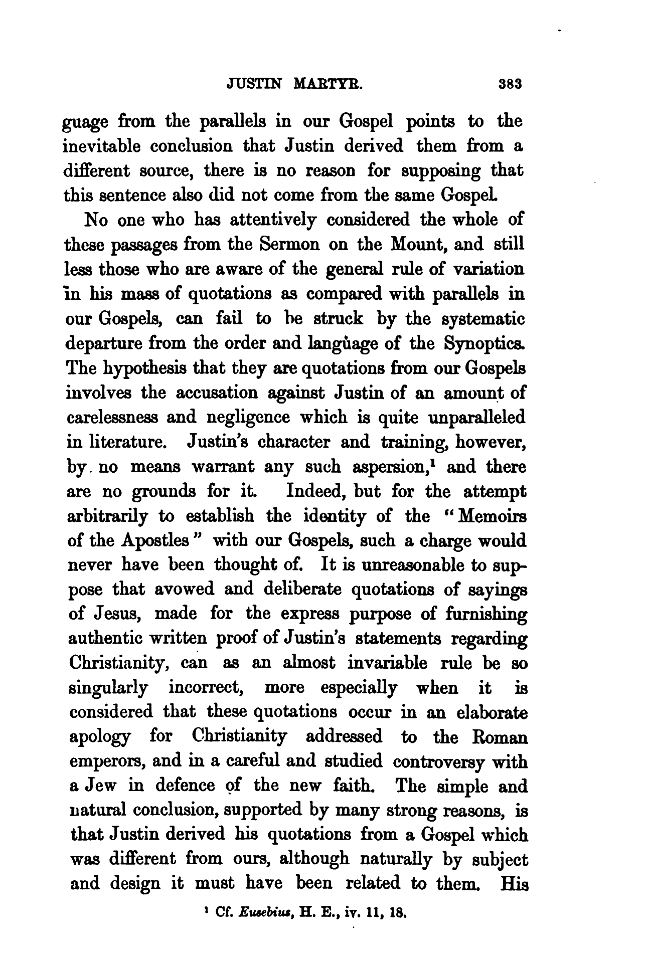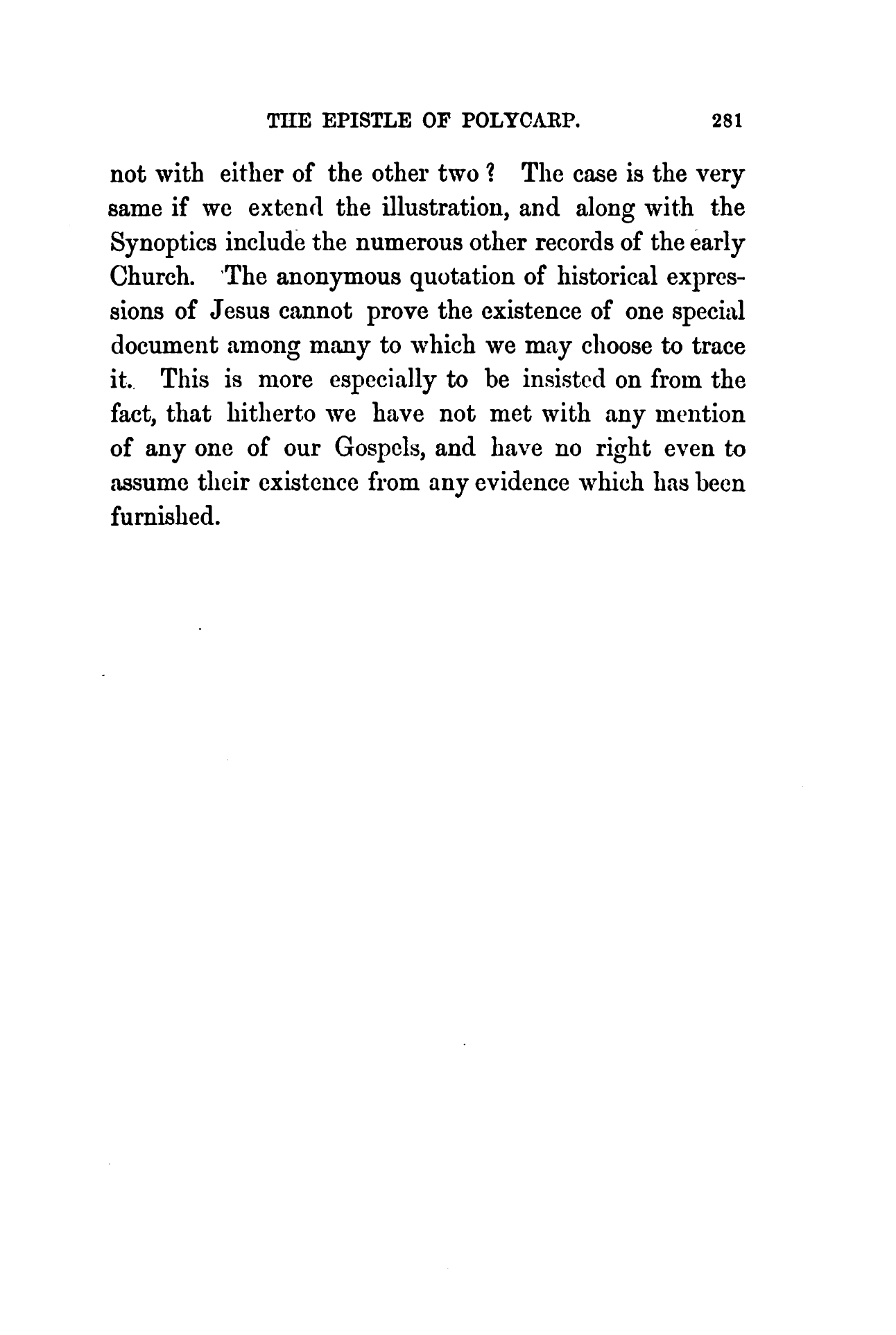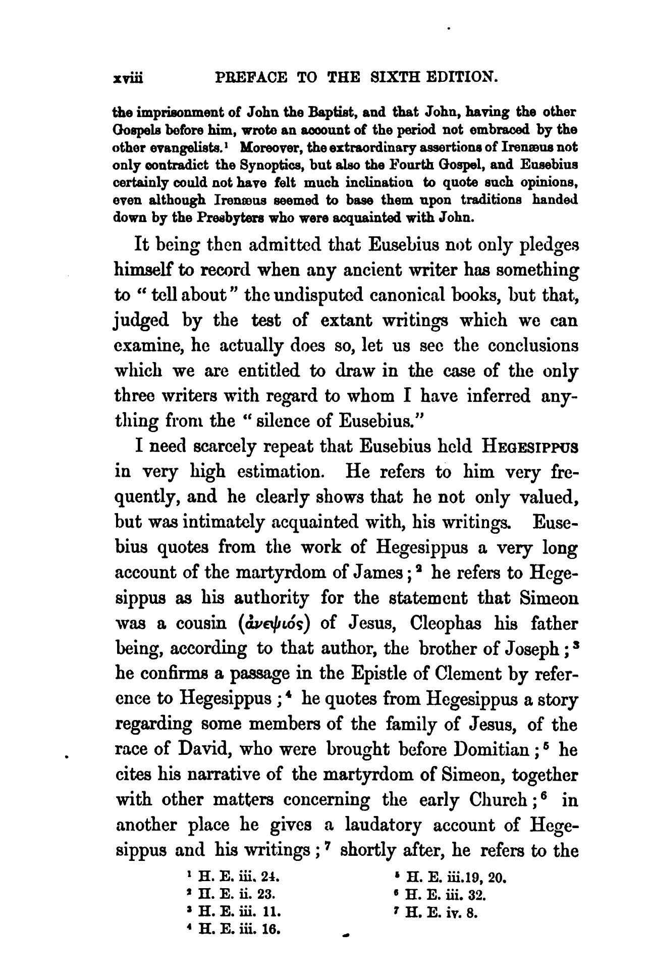 The first point (1) to which I shall refer is an elaborate argument by Dr. Lightfoot regarding the "Silence of Eusebius." (2) I had called attention to the importance of considering the silence of the Fathers, under certain conditions;(3) and I might, omitting his curious limitation, adopt Dr. Lightfoot's opening comment upon this as singularly descriptive of the state of the case: "In one province more especially, relating to the external evidences for the Gospels, silence occupies a prominent place." Dr. Lightfoot proposes to interrogate this "mysterious oracle," and he considers that "the response elicited will not be at all ambiguous." I might again agree with him, but that unambiguous response can scarcely be pronounced very satisfactory for the Gospels. Such silence may be very eloquent, but after all it is only the eloquence of—silence. I have not yet met with the argument anywhere that, because none of the early Fathers quote our Canonical Gospels, or say anything with regard to them, the fact is unambiguous