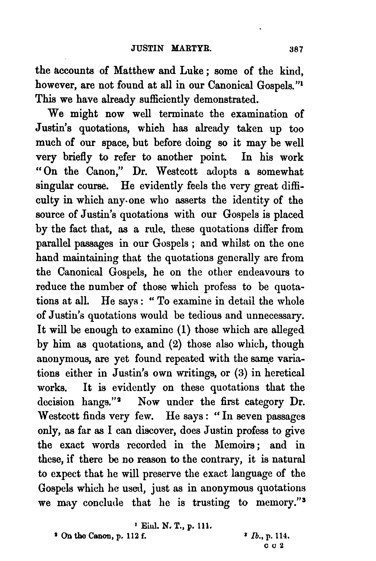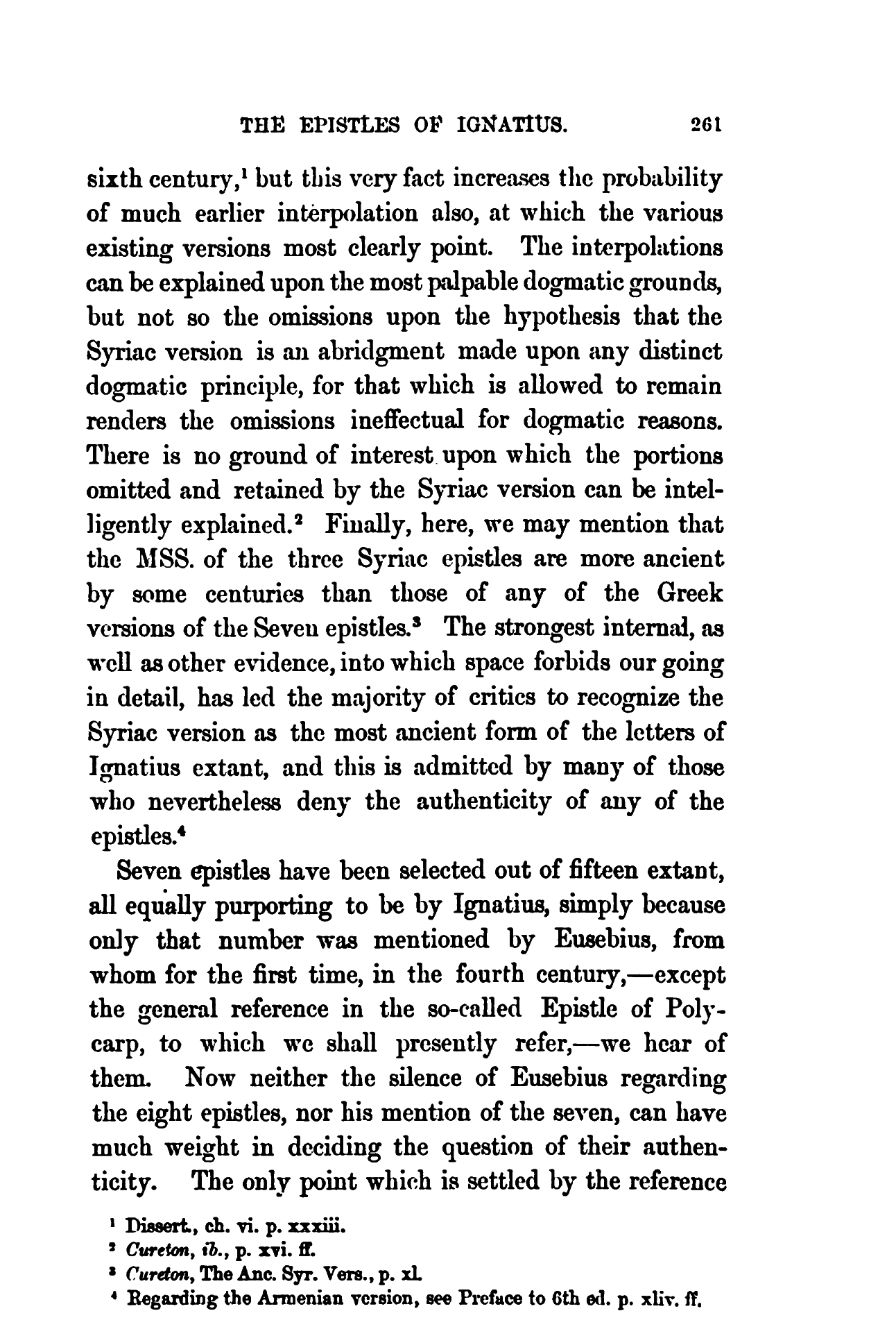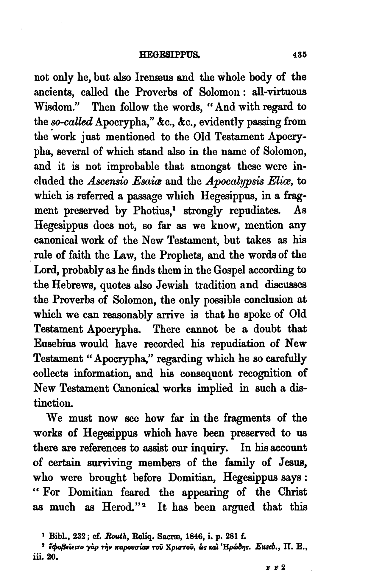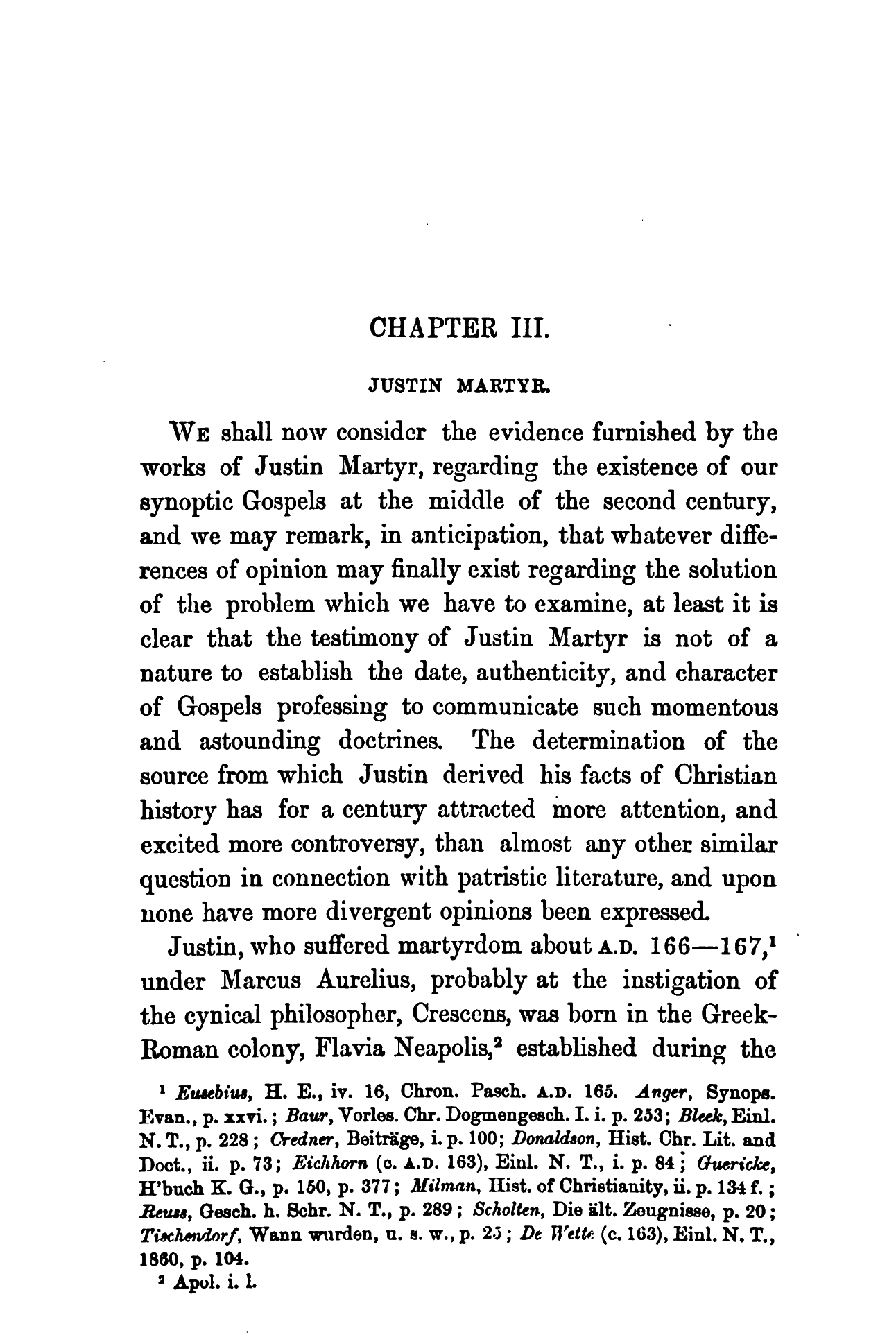 The first point (1) to which I shall refer is an elaborate argument by Dr. Lightfoot regarding the "Silence of Eusebius." (2) I had called attention to the importance of considering the silence of the Fathers, under certain conditions;(3) and I might, omitting his curious limitation, adopt Dr. Lightfoot's opening comment upon this as singularly descriptive of the state of the case: "In one province more especially, relating to the external evidences for the Gospels, silence occupies a prominent place." Dr. Lightfoot proposes to interrogate this "mysterious oracle," and he considers that "the response elicited will not be at all ambiguous." I might again agree with him, but that unambiguous response can scarcely be pronounced very satisfactory for the Gospels. Such silence may be very eloquent, but after all it is only the eloquence of—silence. I have not yet met with the argument anywhere that, because none of the early Fathers quote our Canonical Gospels, or say anything with regard to them, the fact is unambiguous