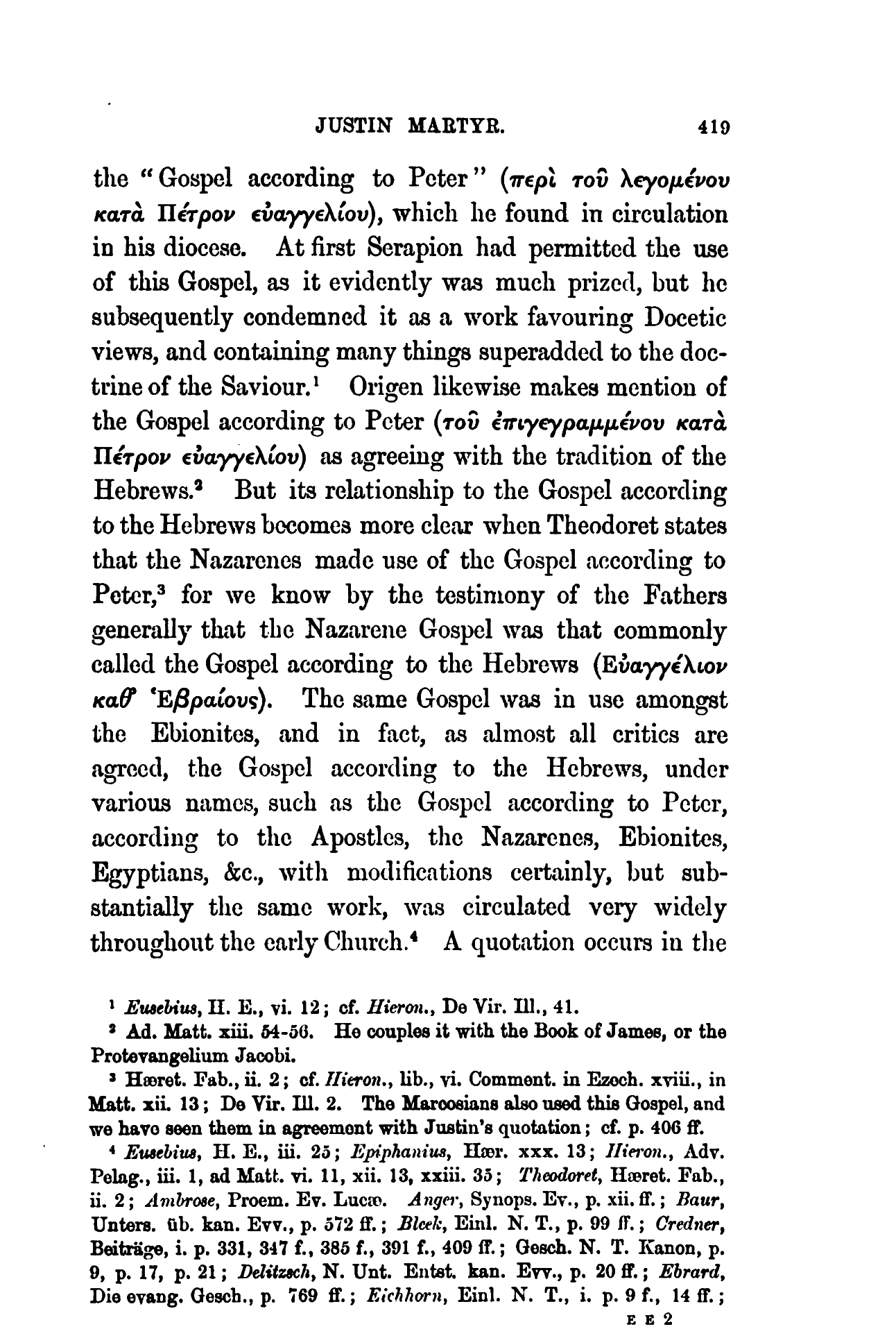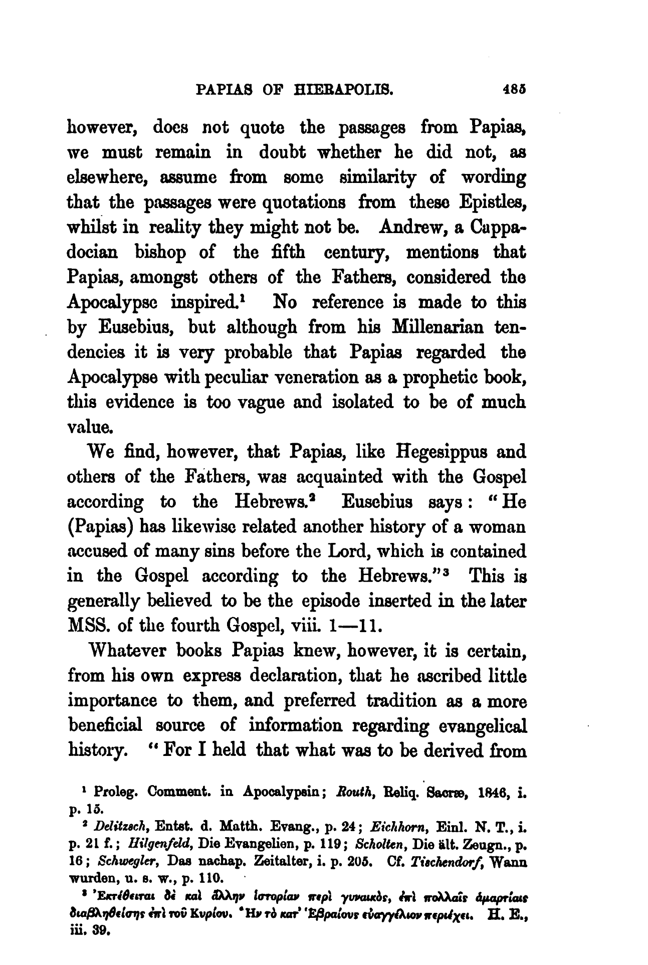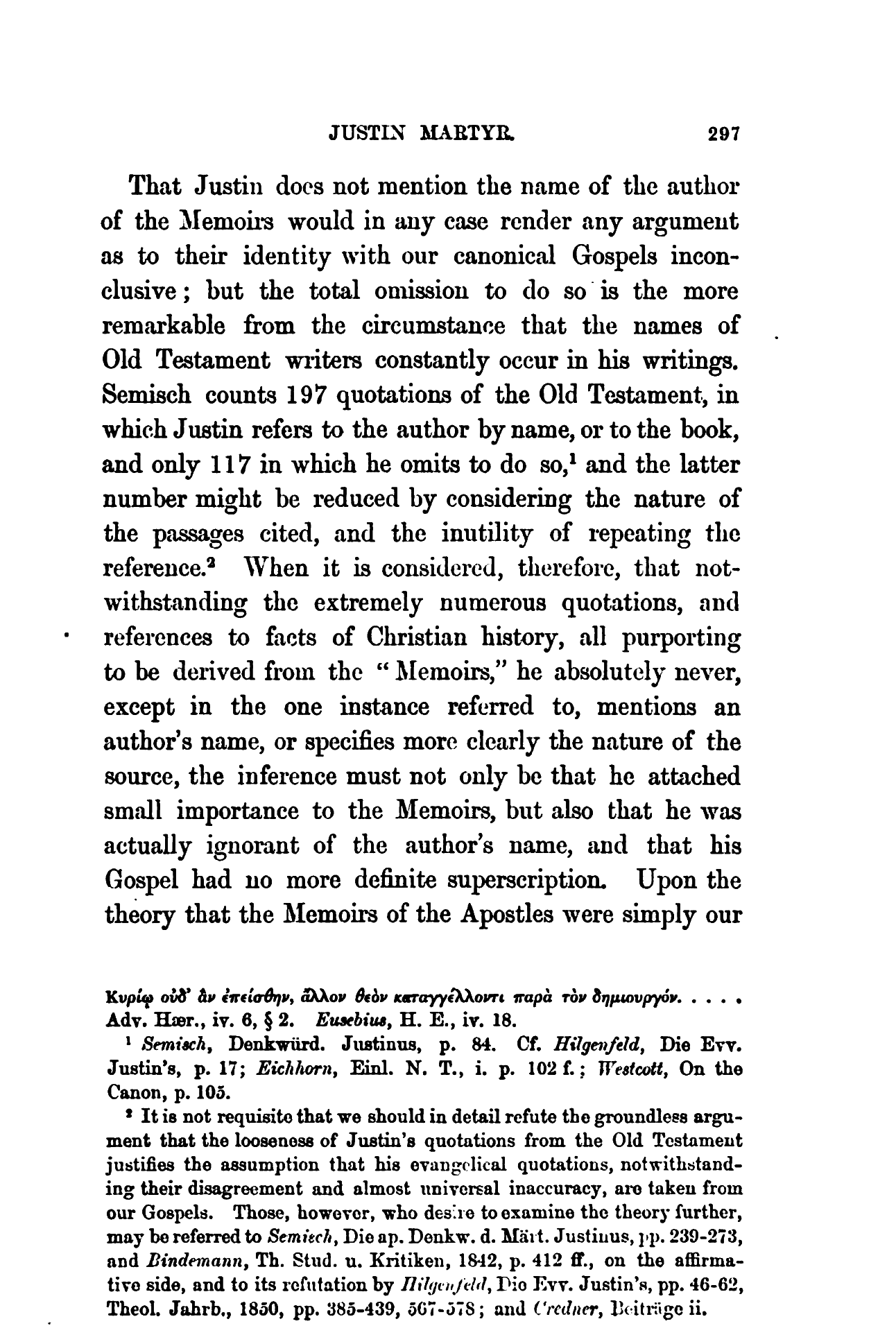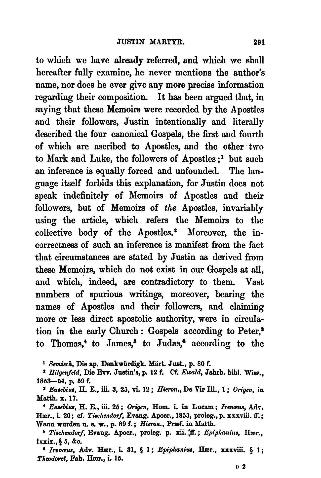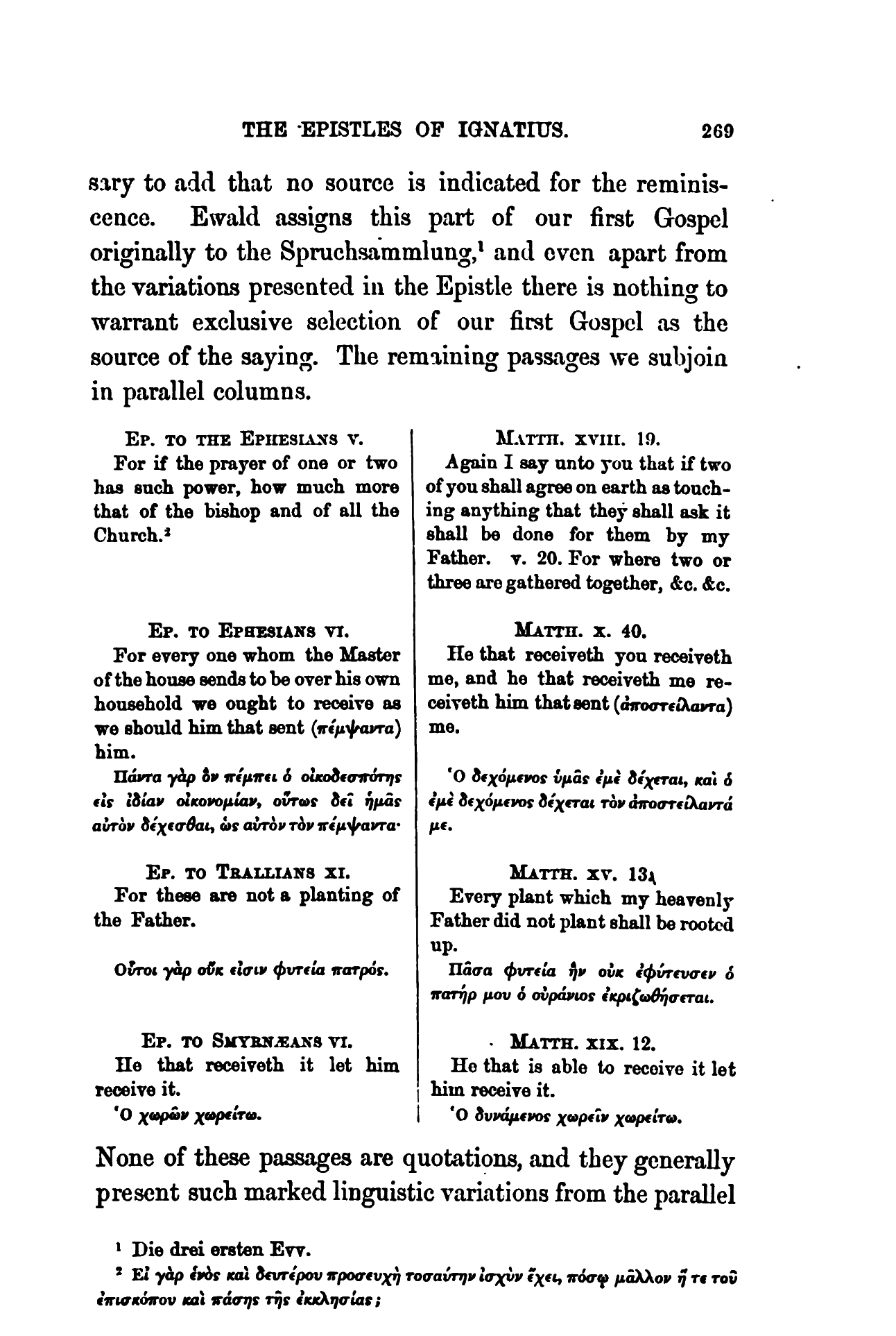 The first point (1) to which I shall refer is an elaborate argument by Dr. Lightfoot regarding the "Silence of Eusebius." (2) I had called attention to the importance of considering the silence of the Fathers, under certain conditions;(3) and I might, omitting his curious limitation, adopt Dr. Lightfoot's opening comment upon this as singularly descriptive of the state of the case: "In one province more especially, relating to the external evidences for the Gospels, silence occupies a prominent place." Dr. Lightfoot proposes to interrogate this "mysterious oracle," and he considers that "the response elicited will not be at all ambiguous." I might again agree with him, but that unambiguous response can scarcely be pronounced very satisfactory for the Gospels. Such silence may be very eloquent, but after all it is only the eloquence of—silence. I have not yet met with the argument anywhere that, because none of the early Fathers quote our Canonical Gospels, or say anything with regard to them, the fact is unambiguous