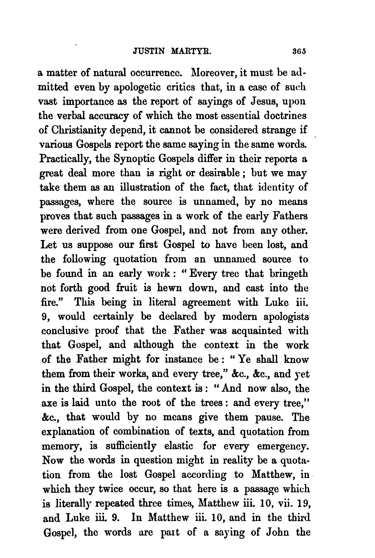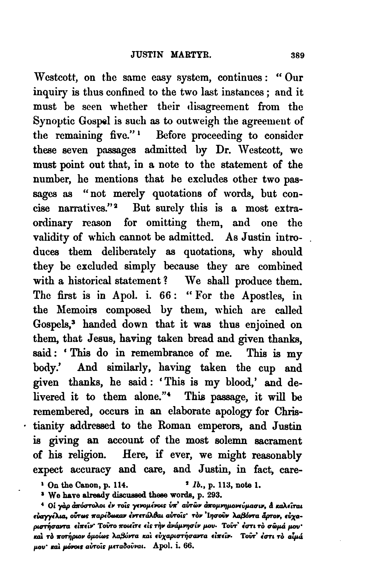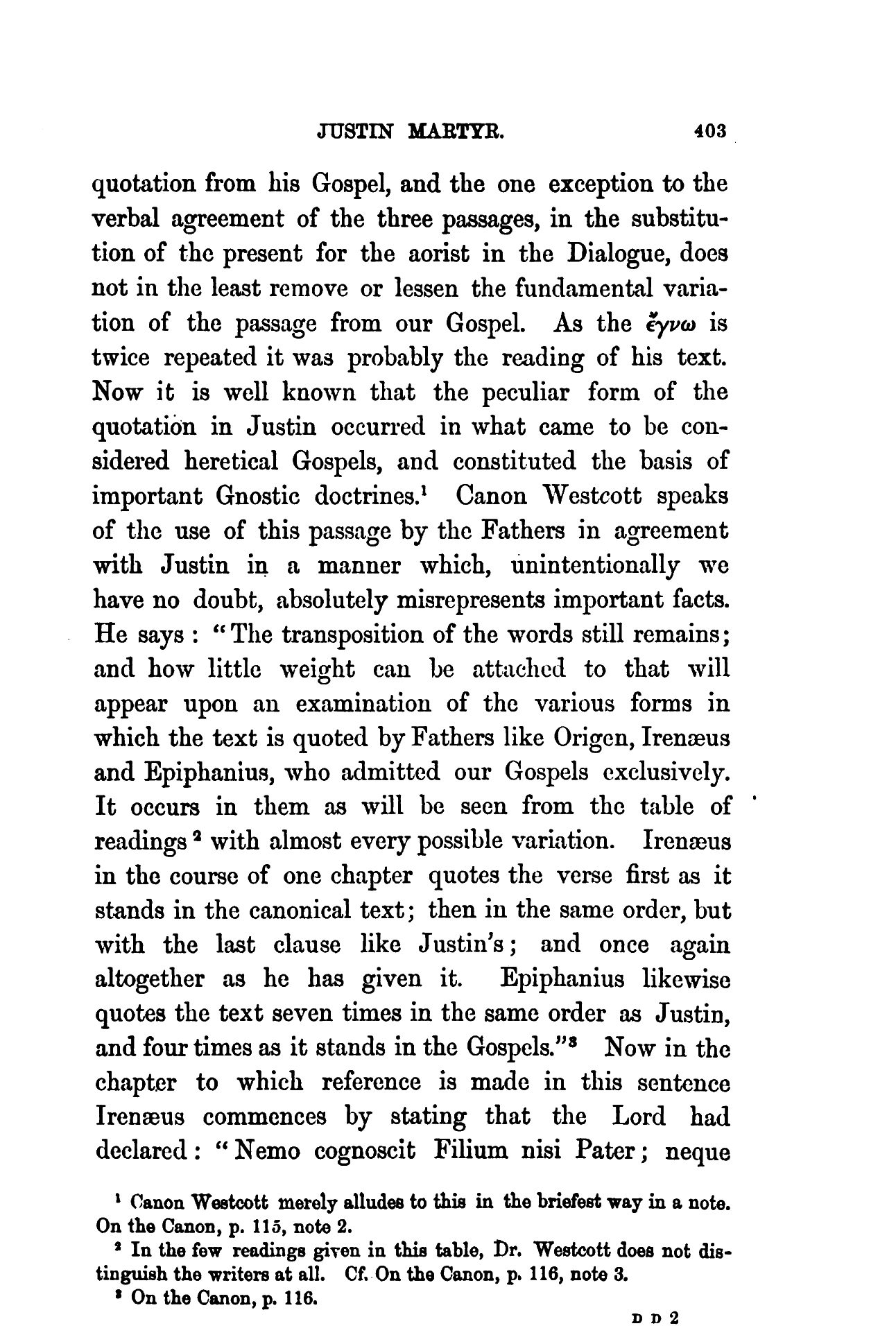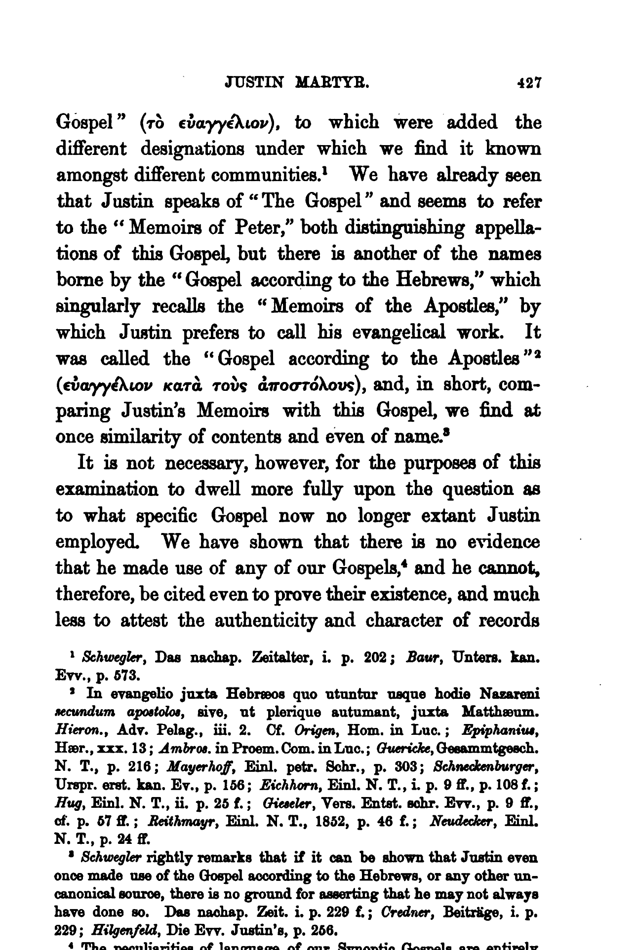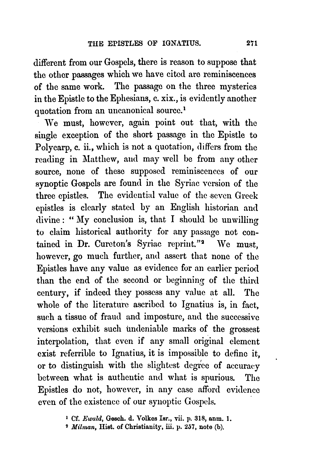 The first point (1) to which I shall refer is an elaborate argument by Dr. Lightfoot regarding the "Silence of Eusebius." (2) I had called attention to the importance of considering the silence of the Fathers, under certain conditions;(3) and I might, omitting his curious limitation, adopt Dr. Lightfoot's opening comment upon this as singularly descriptive of the state of the case: "In one province more especially, relating to the external evidences for the Gospels, silence occupies a prominent place." Dr. Lightfoot proposes to interrogate this "mysterious oracle," and he considers that "the response elicited will not be at all ambiguous." I might again agree with him, but that unambiguous response can scarcely be pronounced very satisfactory for the Gospels. Such silence may be very eloquent, but after all it is only the eloquence of—silence. I have not yet met with the argument anywhere that, because none of the early Fathers quote our Canonical Gospels, or say anything with regard to them, the fact is unambiguous