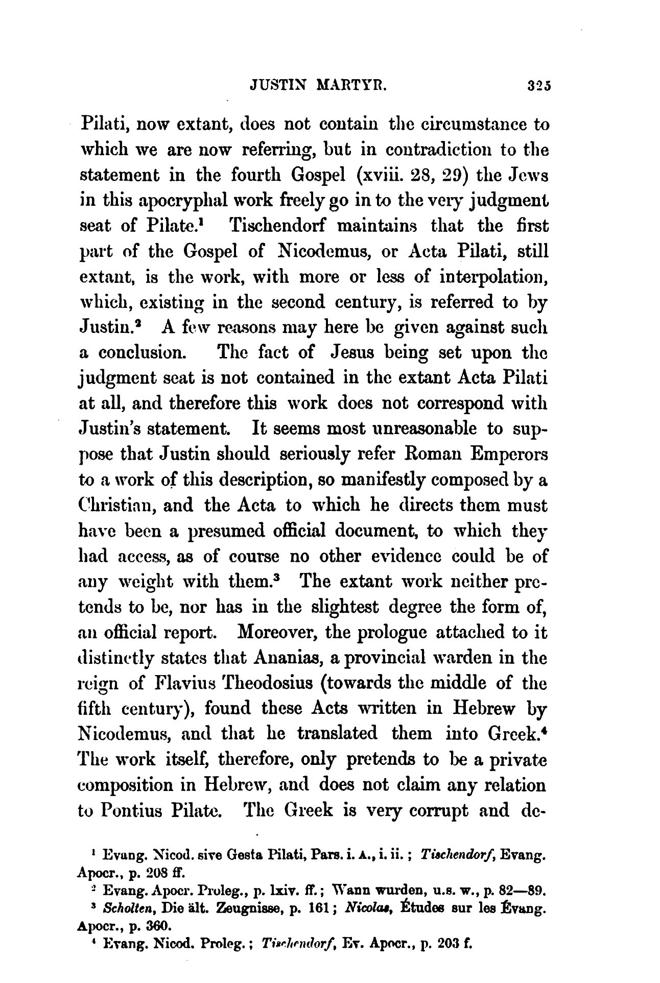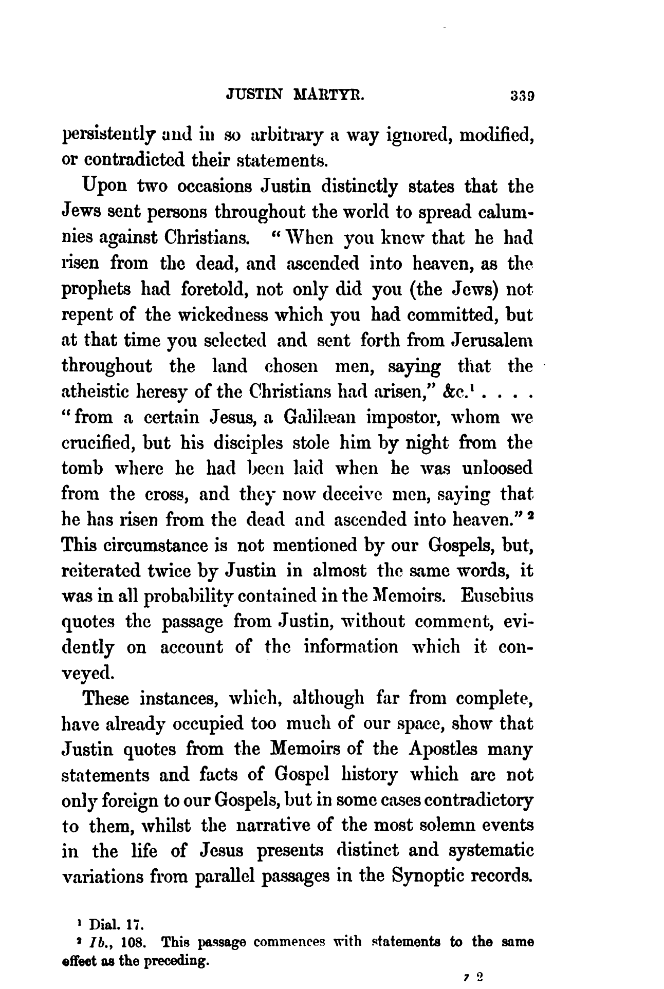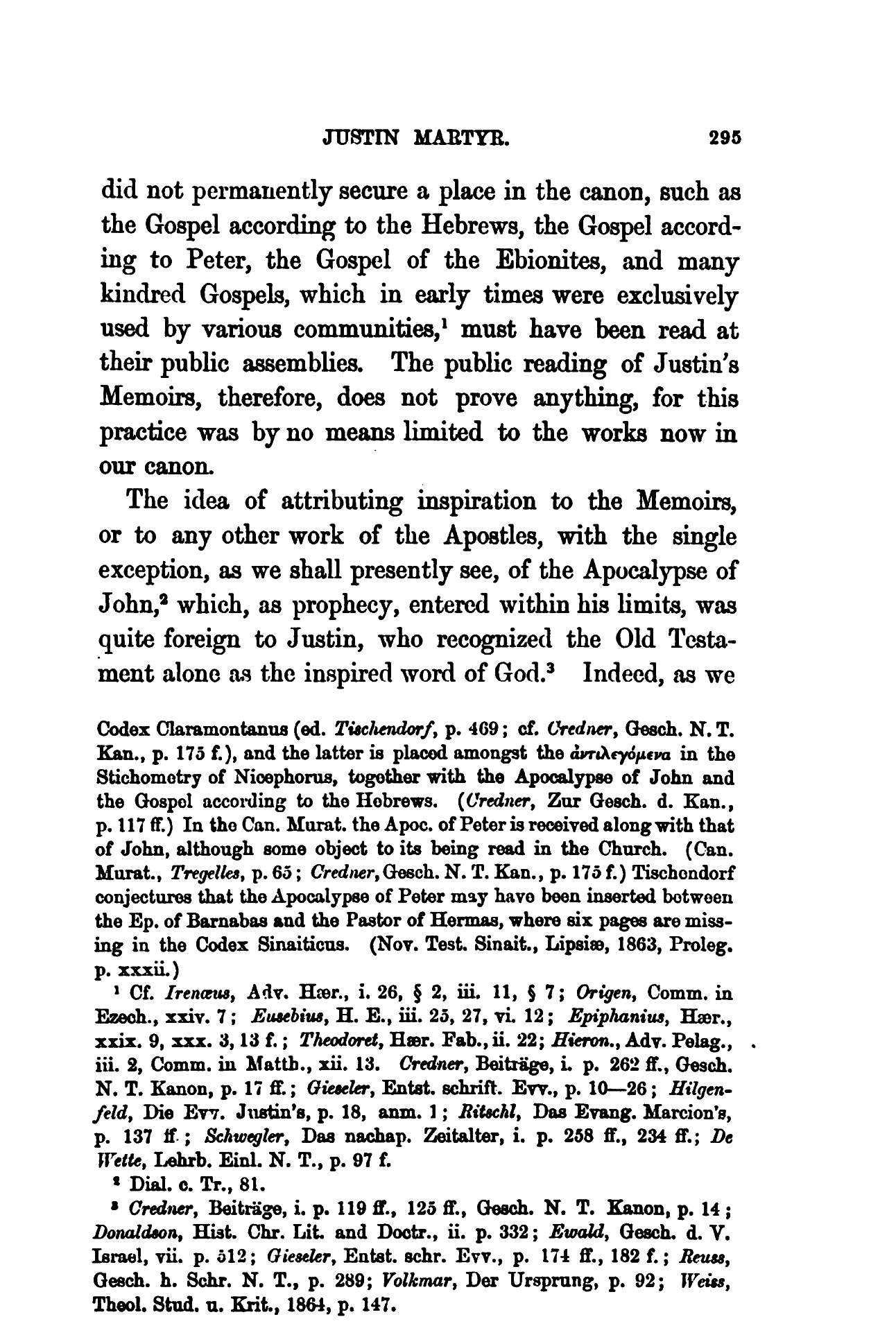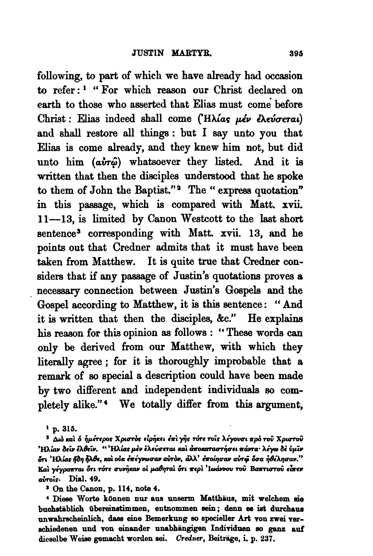 The first point (1) to which I shall refer is an elaborate argument by Dr. Lightfoot regarding the "Silence of Eusebius." (2) I had called attention to the importance of considering the silence of the Fathers, under certain conditions;(3) and I might, omitting his curious limitation, adopt Dr. Lightfoot's opening comment upon this as singularly descriptive of the state of the case: "In one province more especially, relating to the external evidences for the Gospels, silence occupies a prominent place." Dr. Lightfoot proposes to interrogate this "mysterious oracle," and he considers that "the response elicited will not be at all ambiguous." I might again agree with him, but that unambiguous response can scarcely be pronounced very satisfactory for the Gospels. Such silence may be very eloquent, but after all it is only the eloquence of—silence. I have not yet met with the argument anywhere that, because none of the early Fathers quote our Canonical Gospels, or say anything with regard to them, the fact is unambiguous