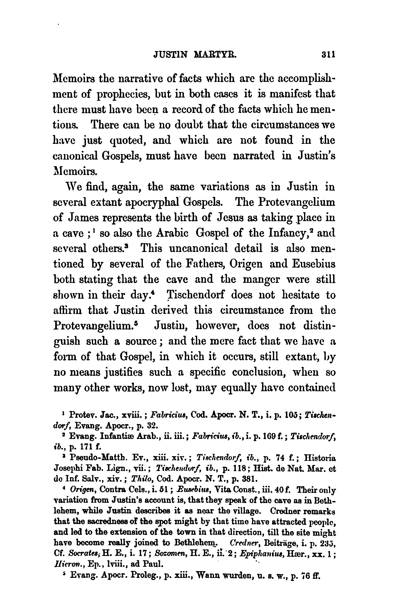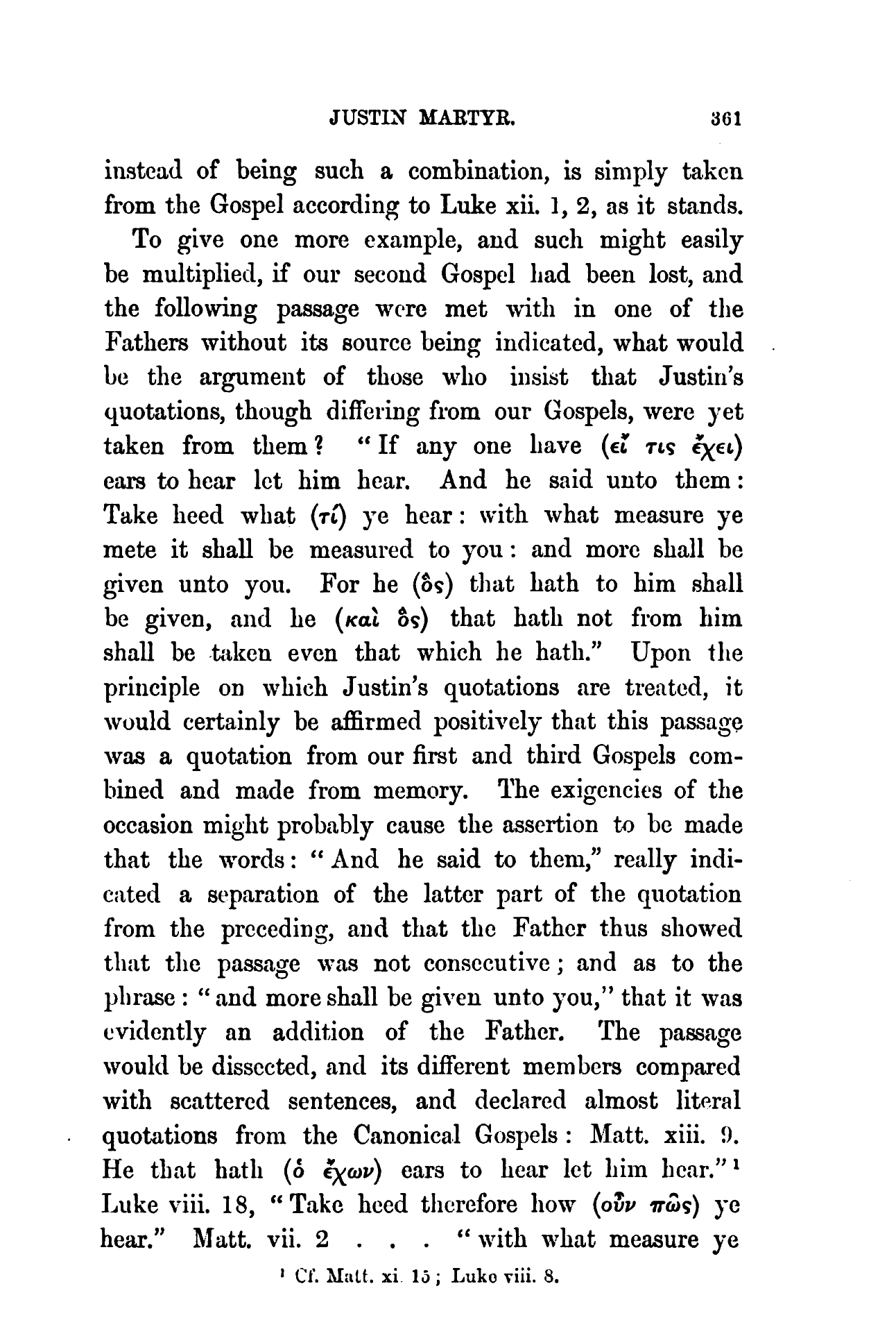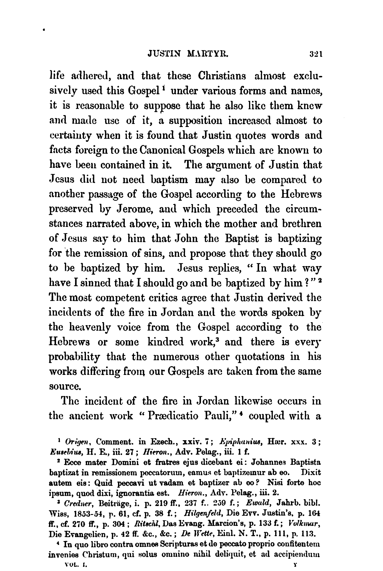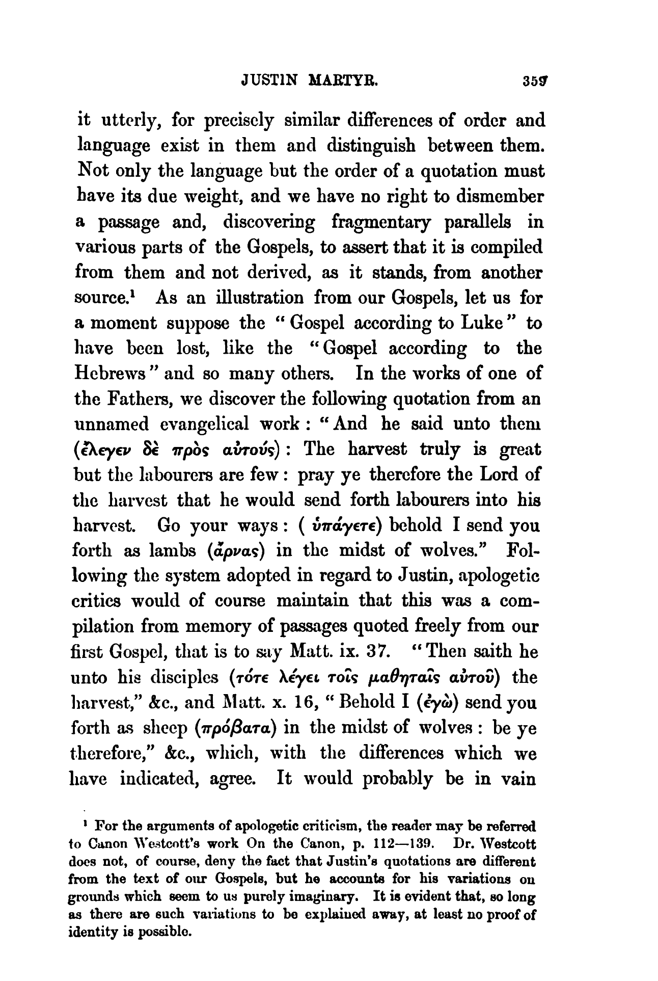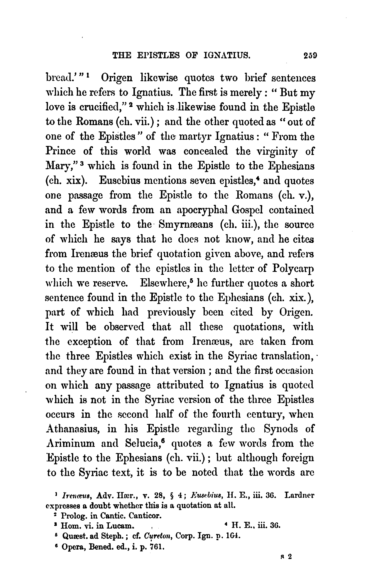 The first point (1) to which I shall refer is an elaborate argument by Dr. Lightfoot regarding the "Silence of Eusebius." (2) I had called attention to the importance of considering the silence of the Fathers, under certain conditions;(3) and I might, omitting his curious limitation, adopt Dr. Lightfoot's opening comment upon this as singularly descriptive of the state of the case: "In one province more especially, relating to the external evidences for the Gospels, silence occupies a prominent place." Dr. Lightfoot proposes to interrogate this "mysterious oracle," and he considers that "the response elicited will not be at all ambiguous." I might again agree with him, but that unambiguous response can scarcely be pronounced very satisfactory for the Gospels. Such silence may be very eloquent, but after all it is only the eloquence of—silence. I have not yet met with the argument anywhere that, because none of the early Fathers quote our Canonical Gospels, or say anything with regard to them, the fact is unambiguous