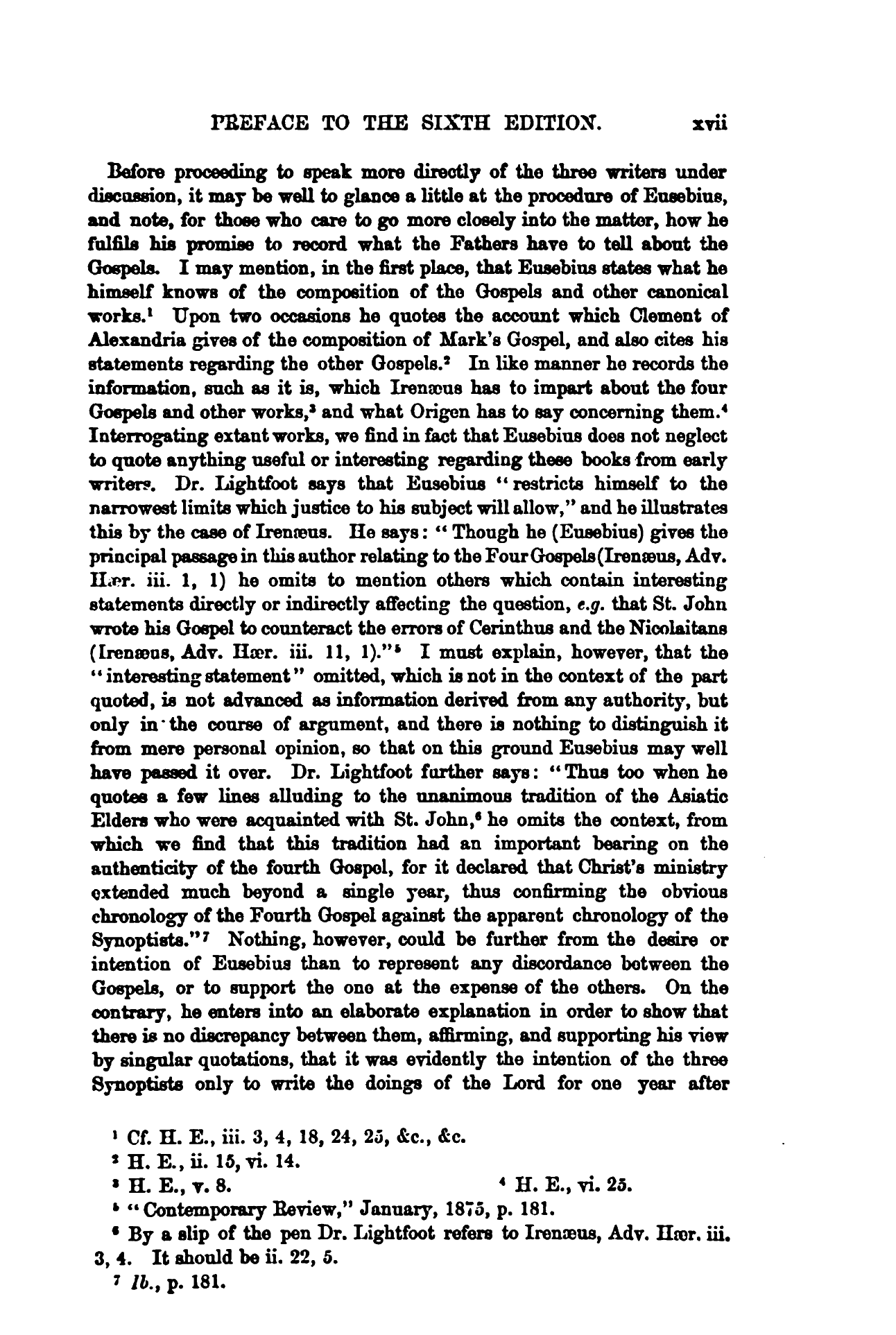 We may now proceed to consider Dr. Lightfoot's argument itself. He carefully and distinctly defines what he understands to be the declared intention of Eusebius in composing his history, as regards the mention or use of the disputed and undisputed canonical books in the writings of the Fathers, and in order to do him full justice I will quote his words, merely taking the liberty, for facility of reference, of dividing his statement into three paragraphs. He says: