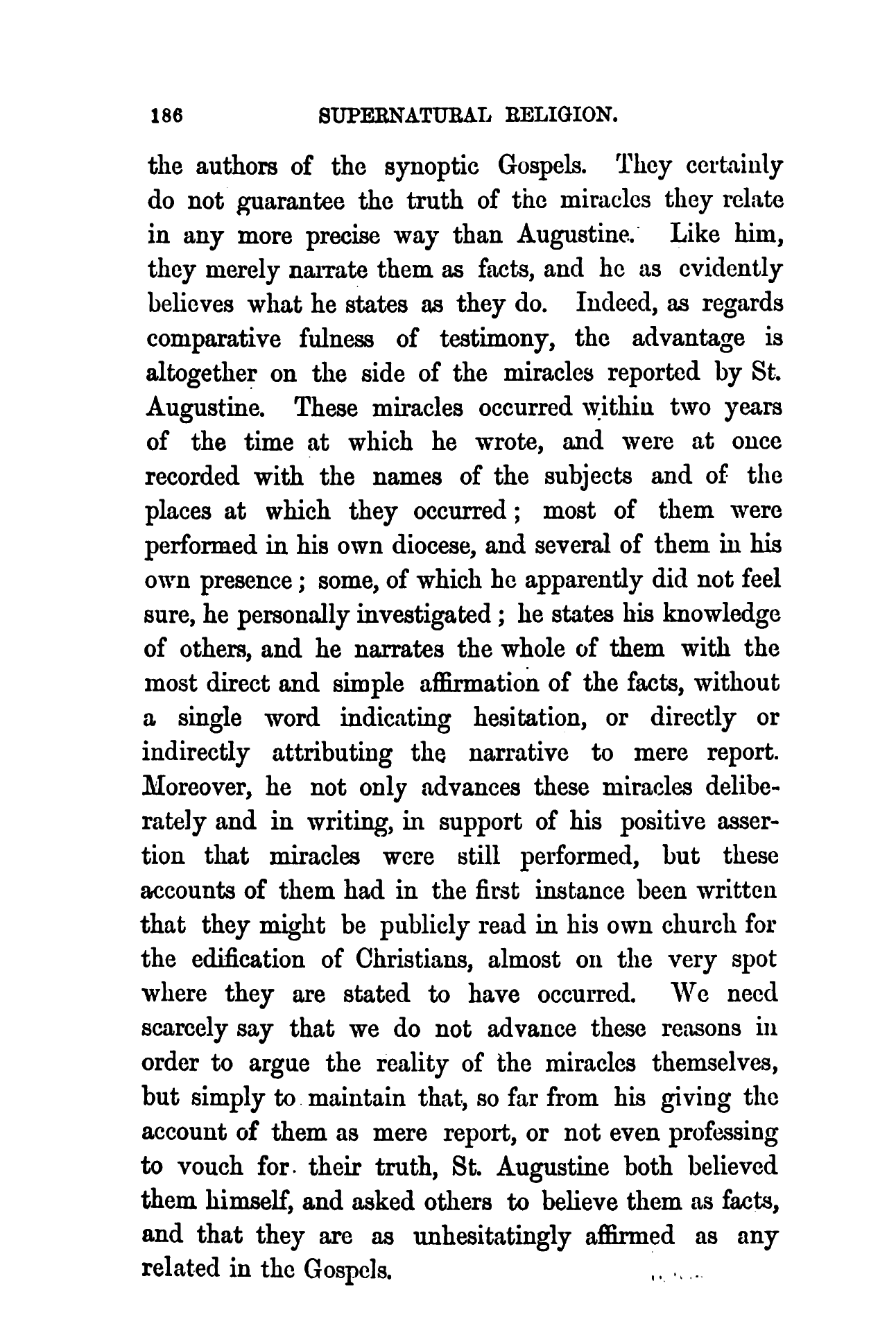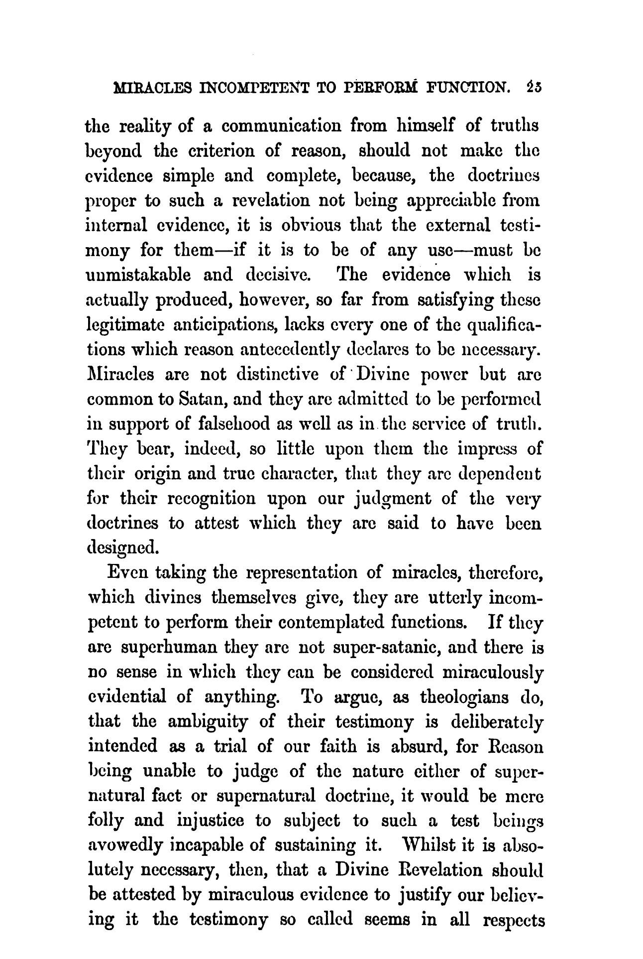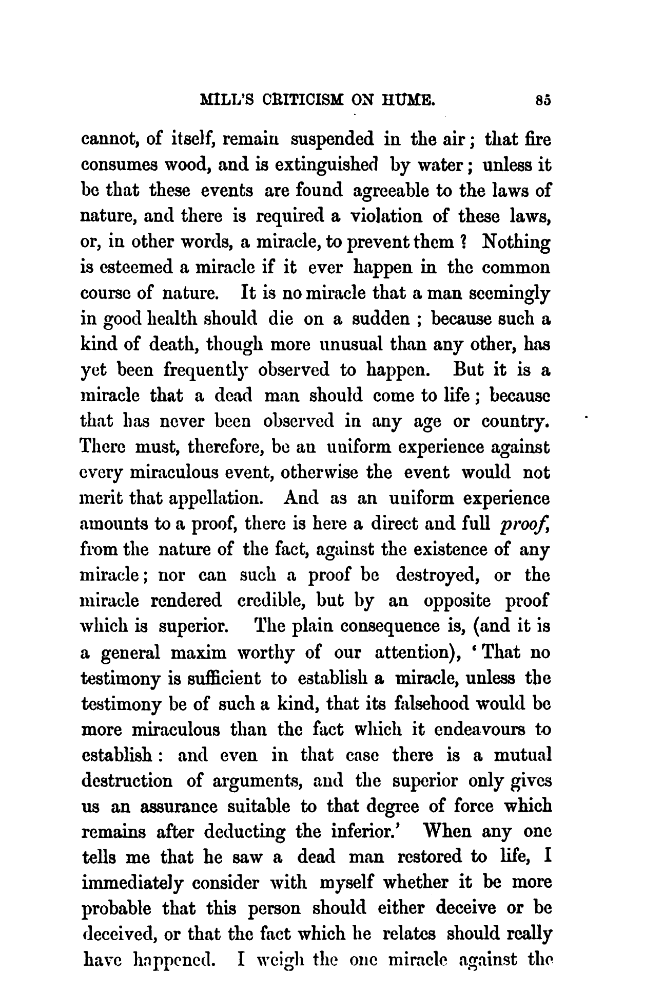 "But the evidence of miracles, at least to Protestant Christians, is not, in our day, of this cogent description. It is not the evidence of our senses, but of witnesses, and even this not at first hand, but resting on the attestation of books and traditions. And even in the case of the original eye-witnesses, the supernatural facts asserted on their alleged testimony, are not of the transcendent character supposed in our example, about the nature of which, or the impossibility of their having had a natural origin, there could be little room for doubt. On the contrary, the recorded miracles are, in the first place, generally such as it would have been extremely difficult to verify as matters of fact, and in the next place, are hardly ever beyond the possibility of having been brought about by human means or by the spontaneous agencies of nature."