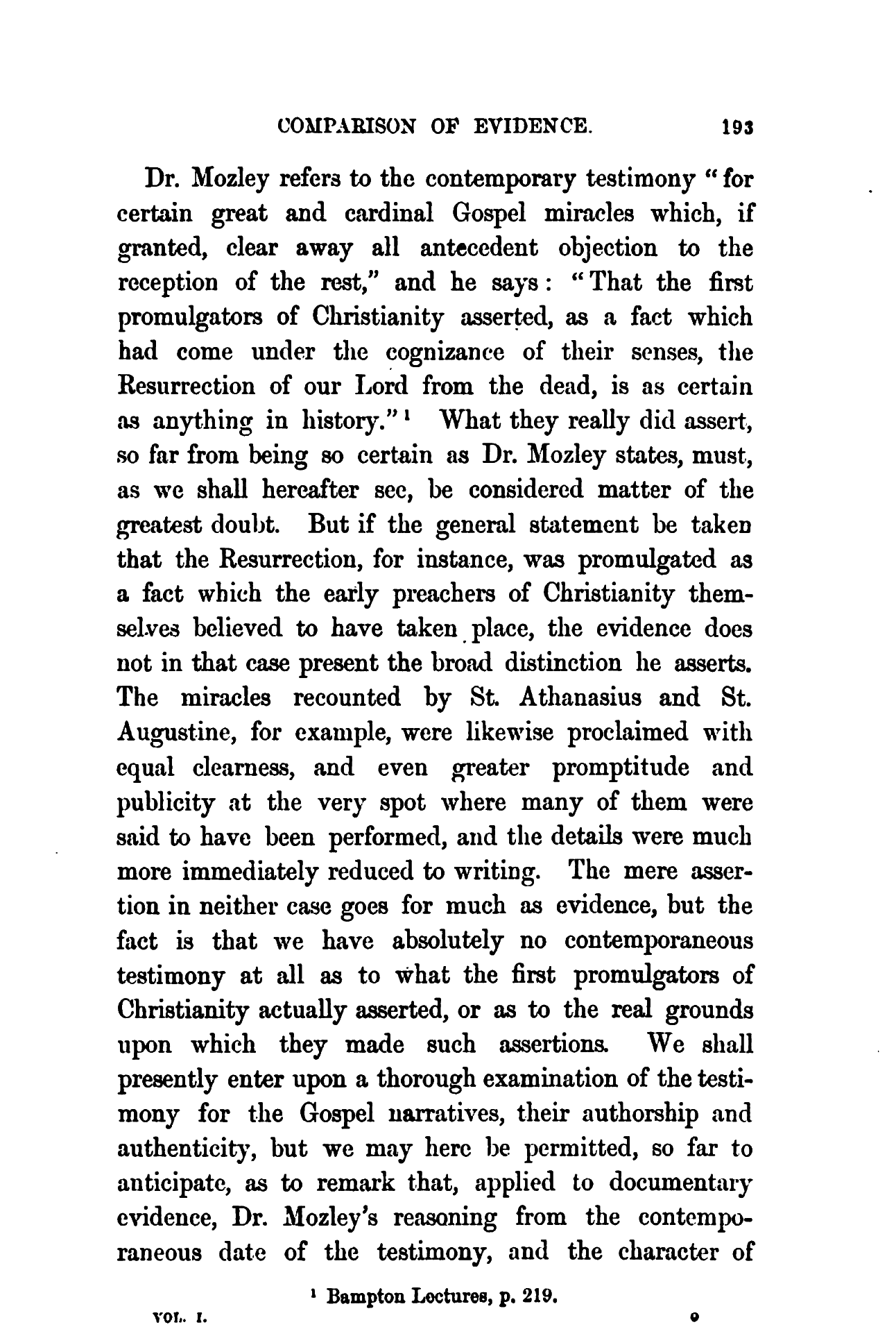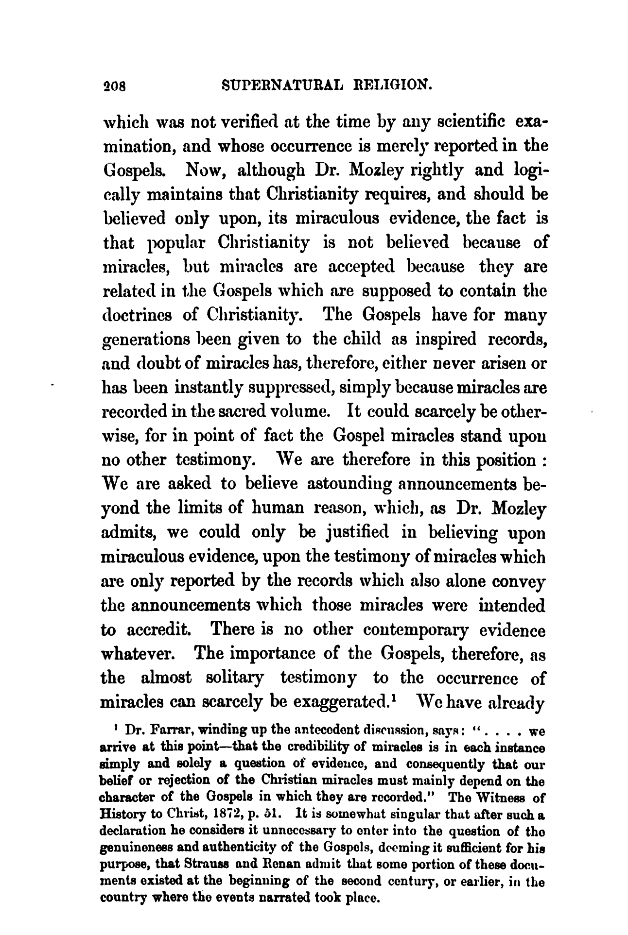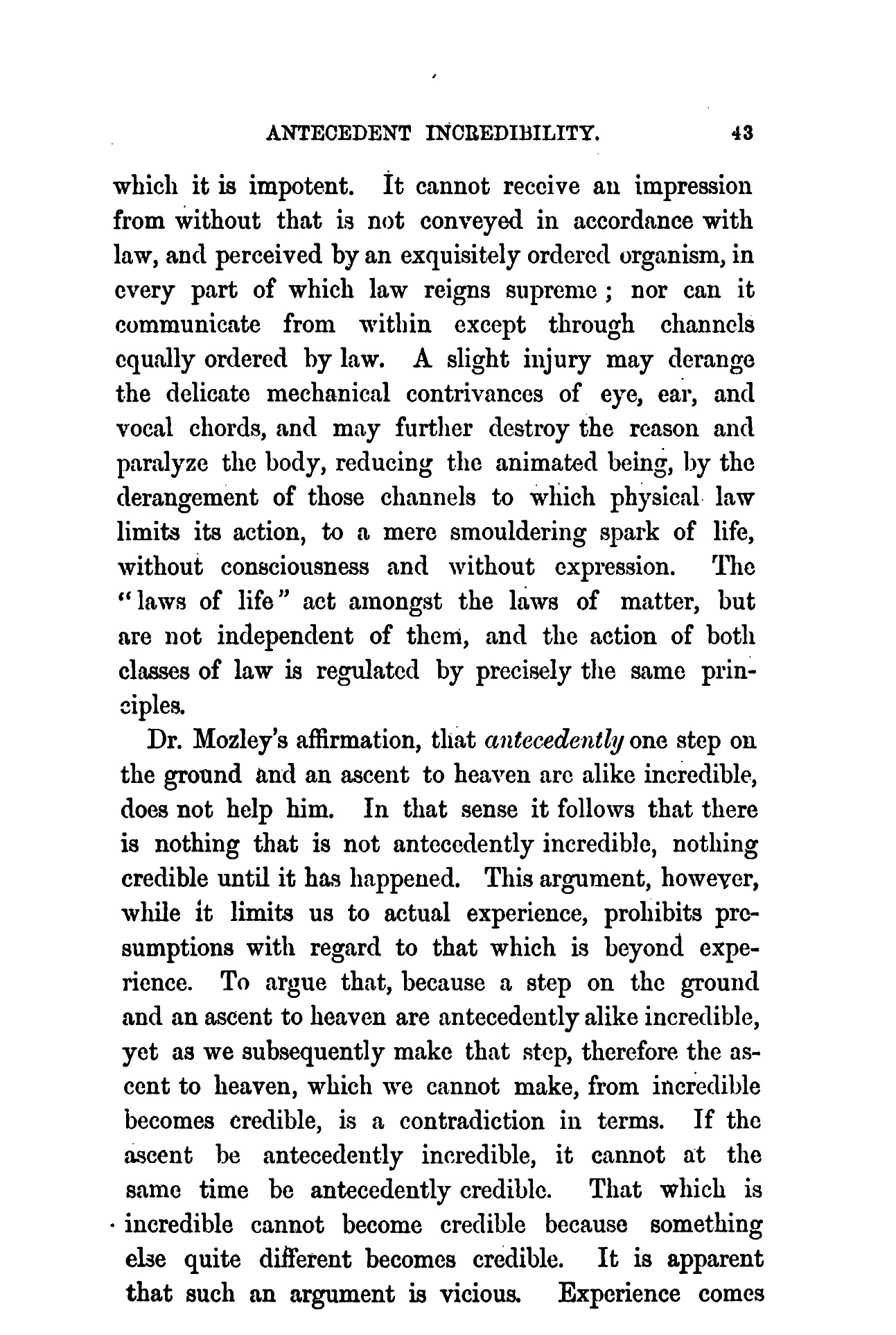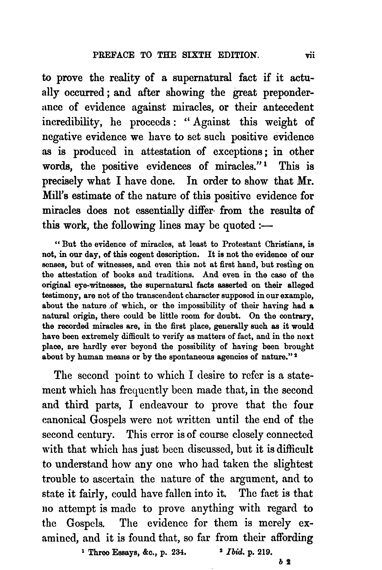 philosophical argument, and that both are equally requisite to completeness in dealing with the subject. The preliminary affirmation is not that miracles are impossible, but that they are antecedently incredible. The counter allegation is that, although miracles may be antecedently incredible, they nevertheless actually took place. It is, therefore, necessary, not only to establish the antecedent incredibility, but to examine the validity of the allegation that certain miracles occurred, and this involves the historical inquiry into the evidence for the Gospels which occupies the second and third parts. Indeed, many will not acknowledge the case to be complete until other witnesses are questioned in a succeeding volume.