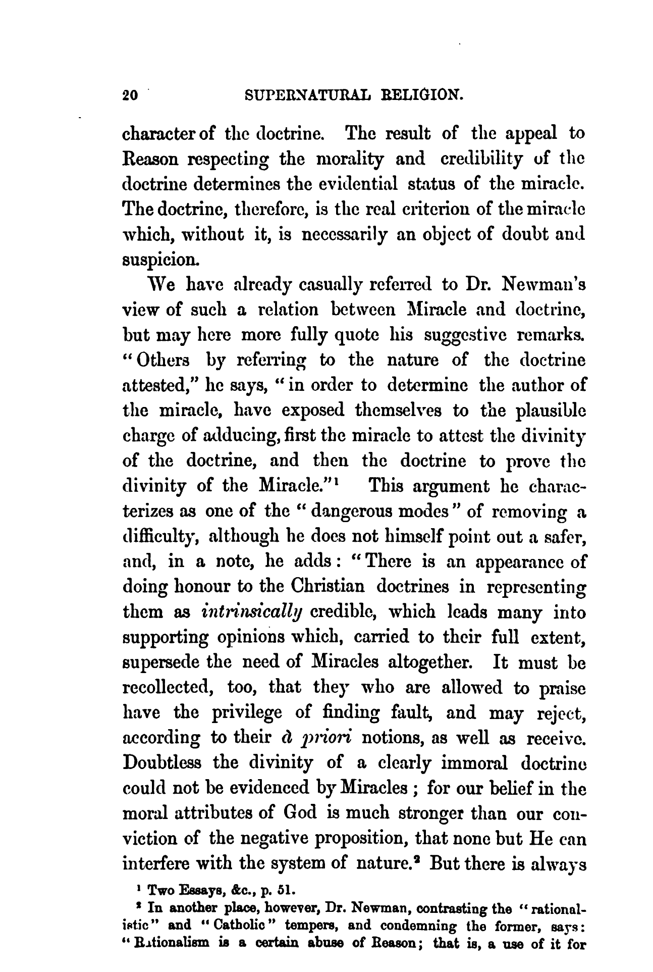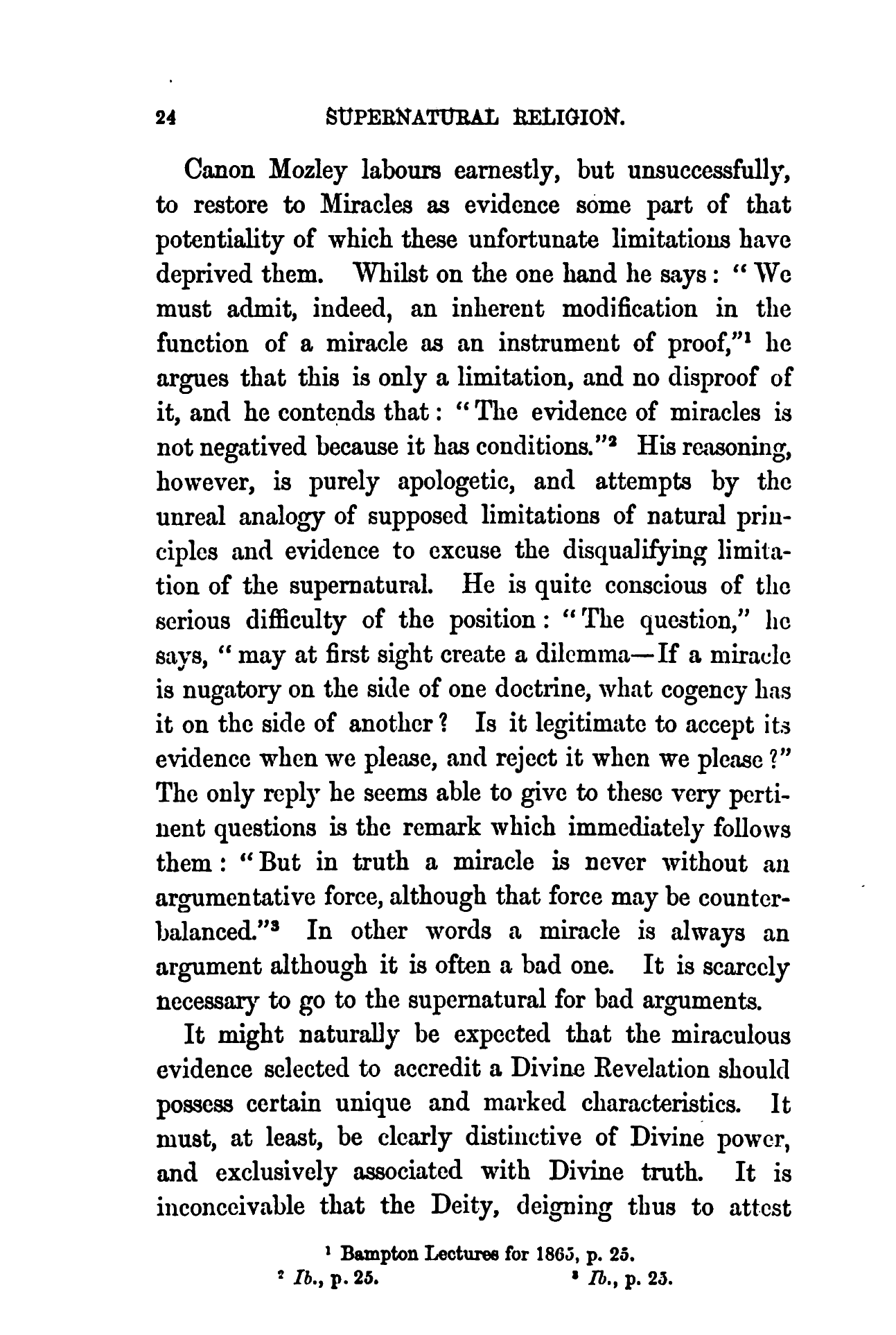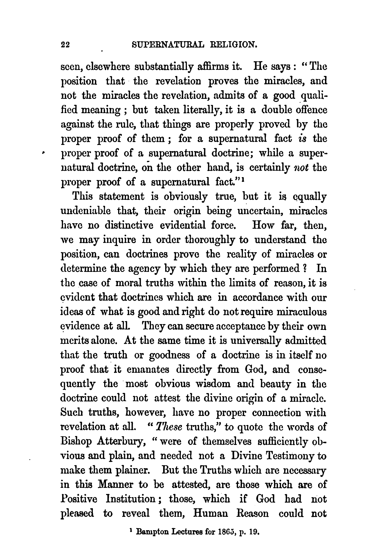 The view I have taken is clearly supported by Mr. Mill. In his recently published "Essays on Religion," he directly replies to the question whether any evidence can suffice to prove a Divine Revelation, and defines what the nature and amount of that evidence must be. He shows that internal evidences, that is to say, the indications which the Revelation itself is thought to furnish of its divine origin, can only be negative. The bad moral character of the doctrines of an alleged Revelation, he considers, may be good reason for rejecting it, "but the excellence of their morality can never entitle us to ascribe to them a supernatural origin: for we cannot have conclusive reason for believing that the human faculties were incompetent to find out moral doctrines of which the human faculties can perceive and recognise the excellence. A Revelation, therefore," he decides, "cannot be proved divine unless by external evidence; that is, by the exhibition of supernatural facts."(1)