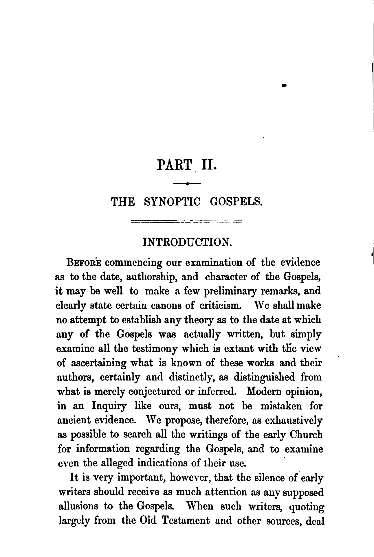 The second point to which I desire to refer is a statement which has frequently been made that, in the second and third parts, I endeavour to prove that the four canonical Gospels were not written until the end of the second century. This error is of course closely connected with that which has just been discussed, but it is difficult to understand how any one who had taken the slightest trouble to ascertain the nature of the argument, and to state it fairly, could have fallen into it. The fact is that no attempt is made to prove anything with regard to the Gospels. The evidence for them is merely examined, and it is found that, so far from their affording