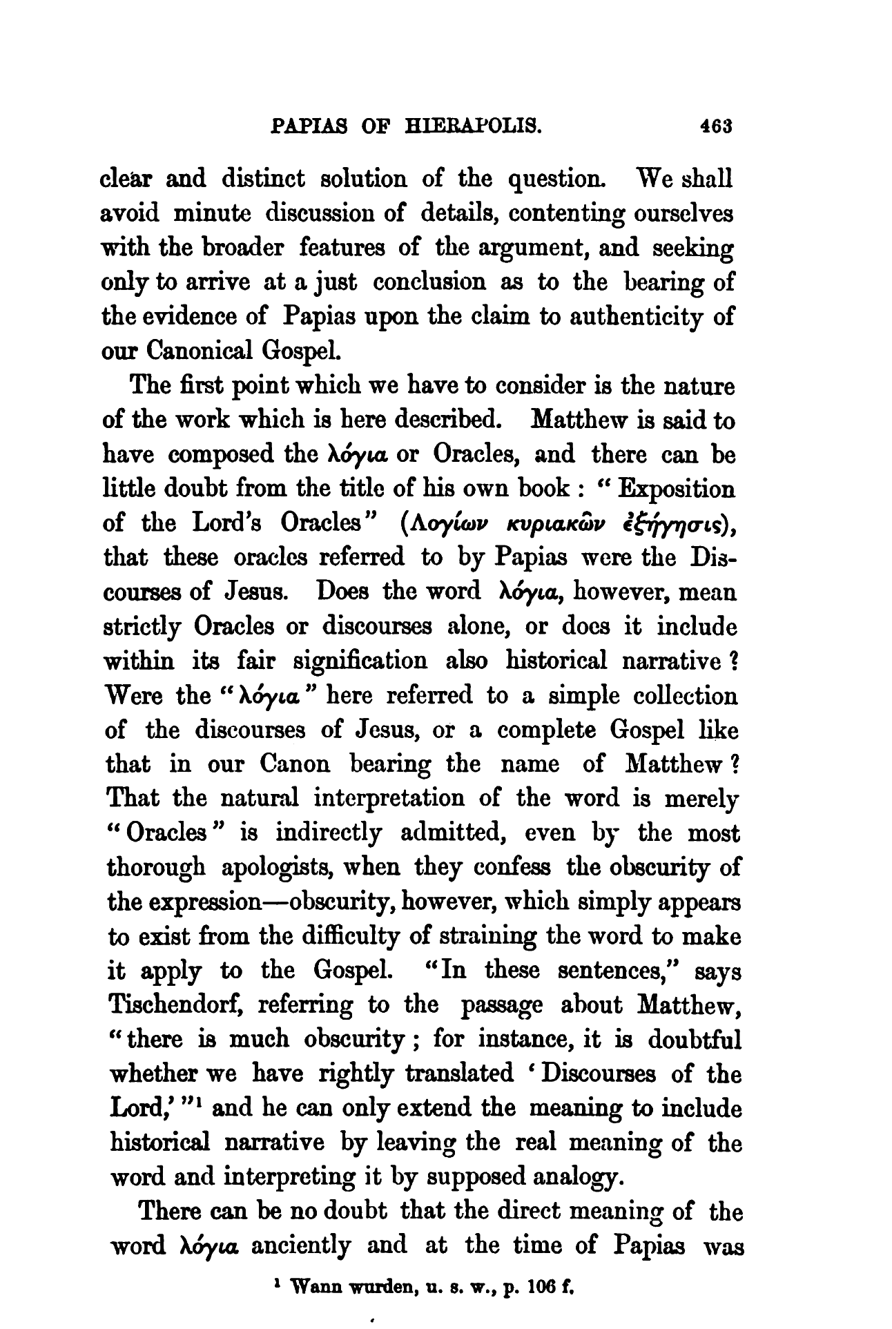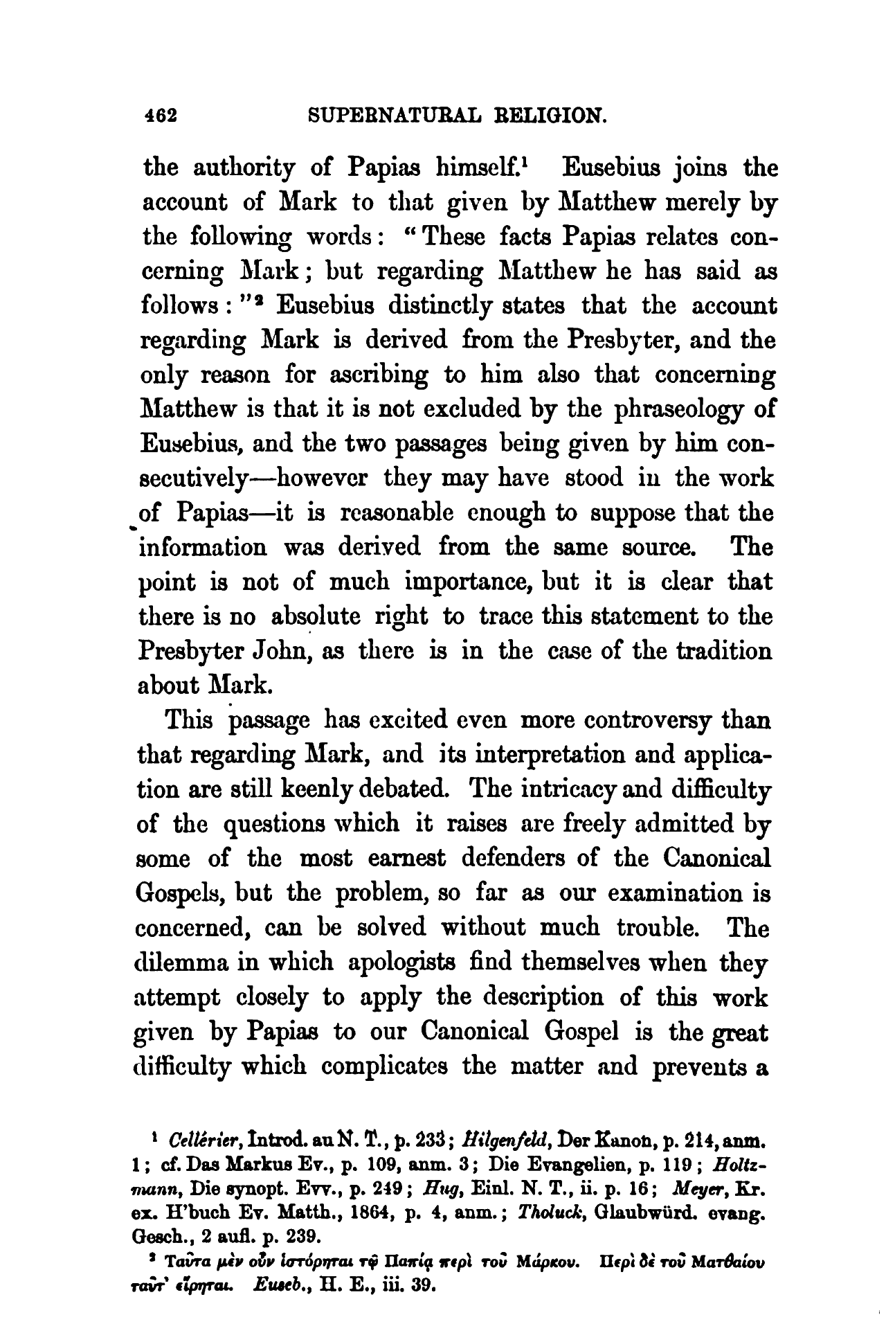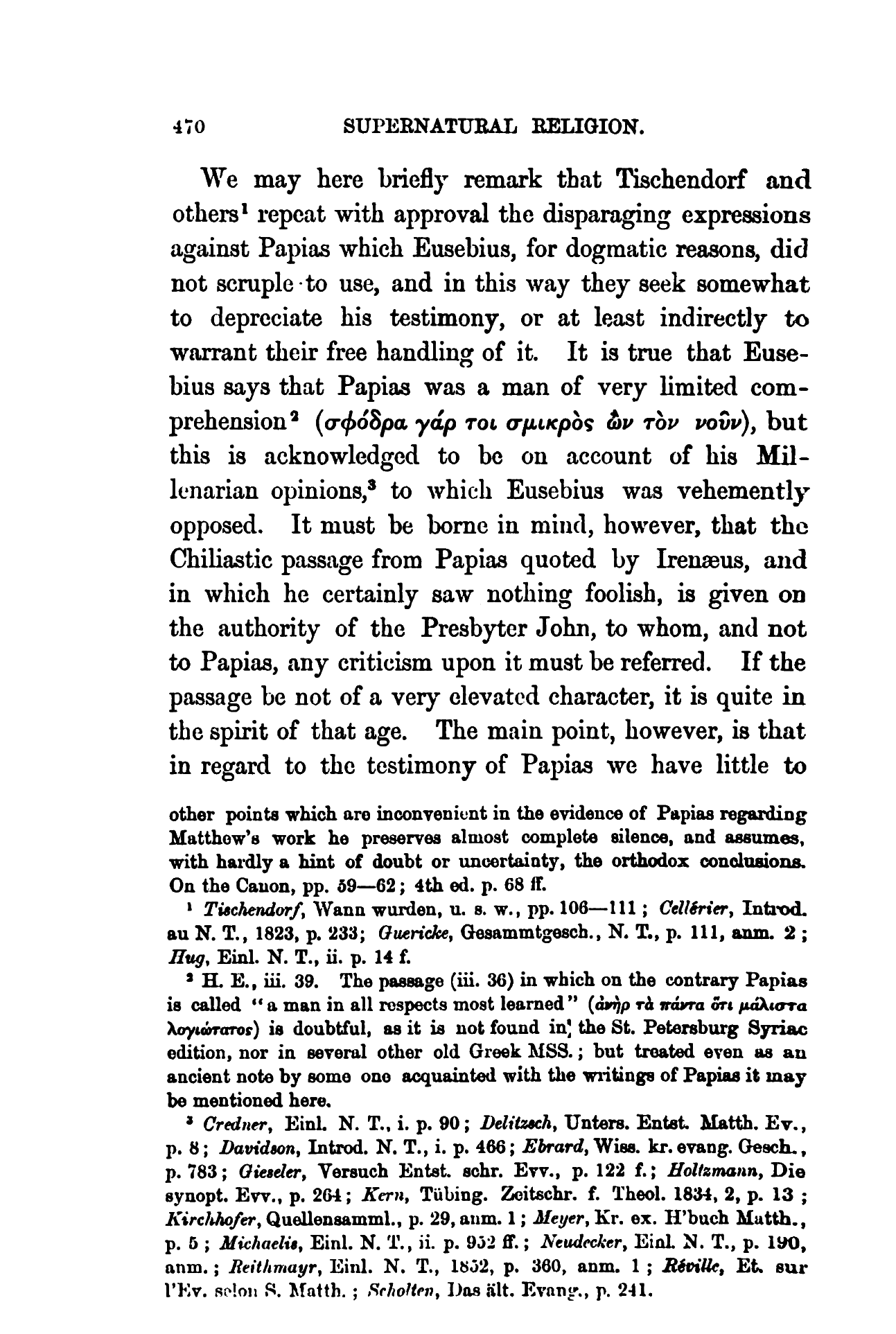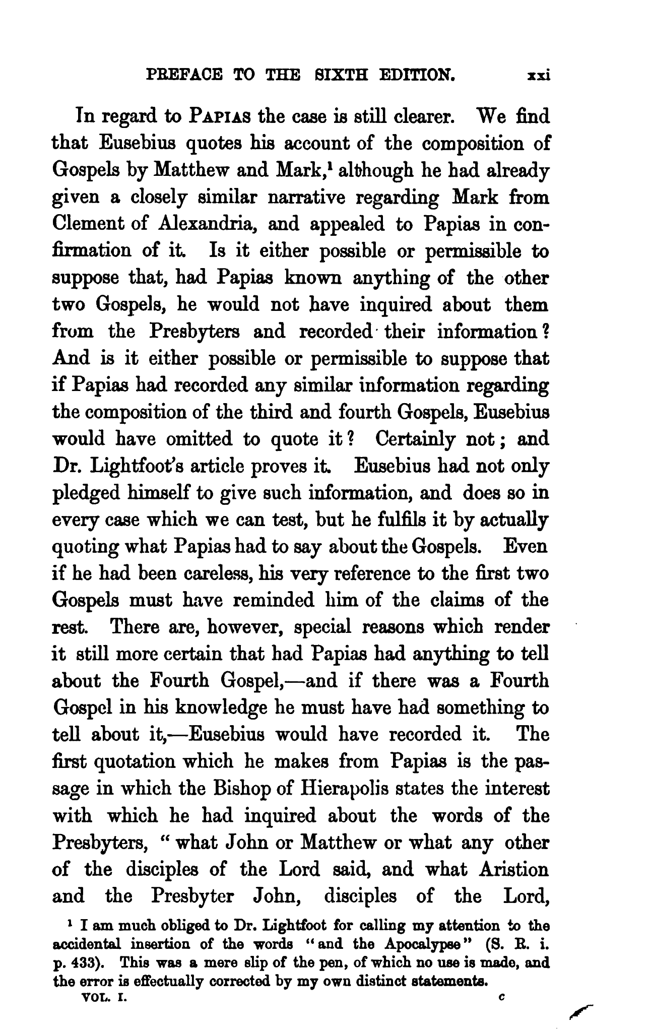 I do not doubt that Dr. Lightfoot sincerely believes this, but he must allow me to say that he is thoroughly mistaken in his estimate of the importance of the point, and that, as regards this work, the representations made in the above passages are a very strange exaggeration. I am unfortunately too familiar, in connection with criticism on this book, with instances of vast expenditure of time and strength in attacking points to which I attach no importance whatever, and which in themselves have scarcely any value. When writers, after an amount of demonstration which must have conveyed the impression that vital interests were at stake, have, at least in their own opinion, proved that I have omitted to dot an "i," cross a "t," or insert an inverted comma, they have really left the question precisely where it was. Now, in the present instance, the whole extent of the argument which is based upon the silence of Eusebius is an inference regarding some lost works of three writers only, which might altogether be withdrawn without affecting the case. The object of my investigation is to discover what evidence actually exists in the works of early writers regarding our Gospels. In the fragments which remain of the works of three writers, Hegesippus, Papias, and Dionysius of Corinth, I do not find any evidence of acquaintance with these Gospels,—the works mentioned by Papias being, I contend, different from the existing Gospels attributed to Matthew and Mark. Whether I am right or not in this does not affect the present discussion. It is an unquestioned fact that Eusebius does not mention that the lost works of these