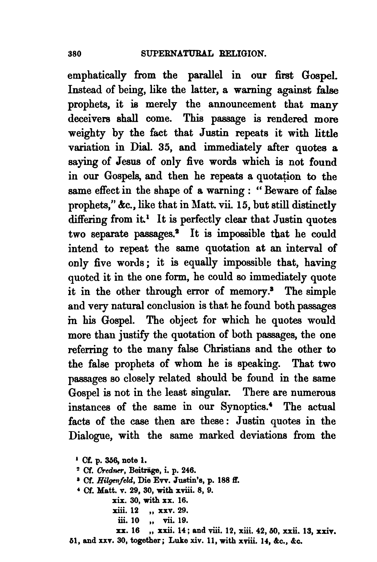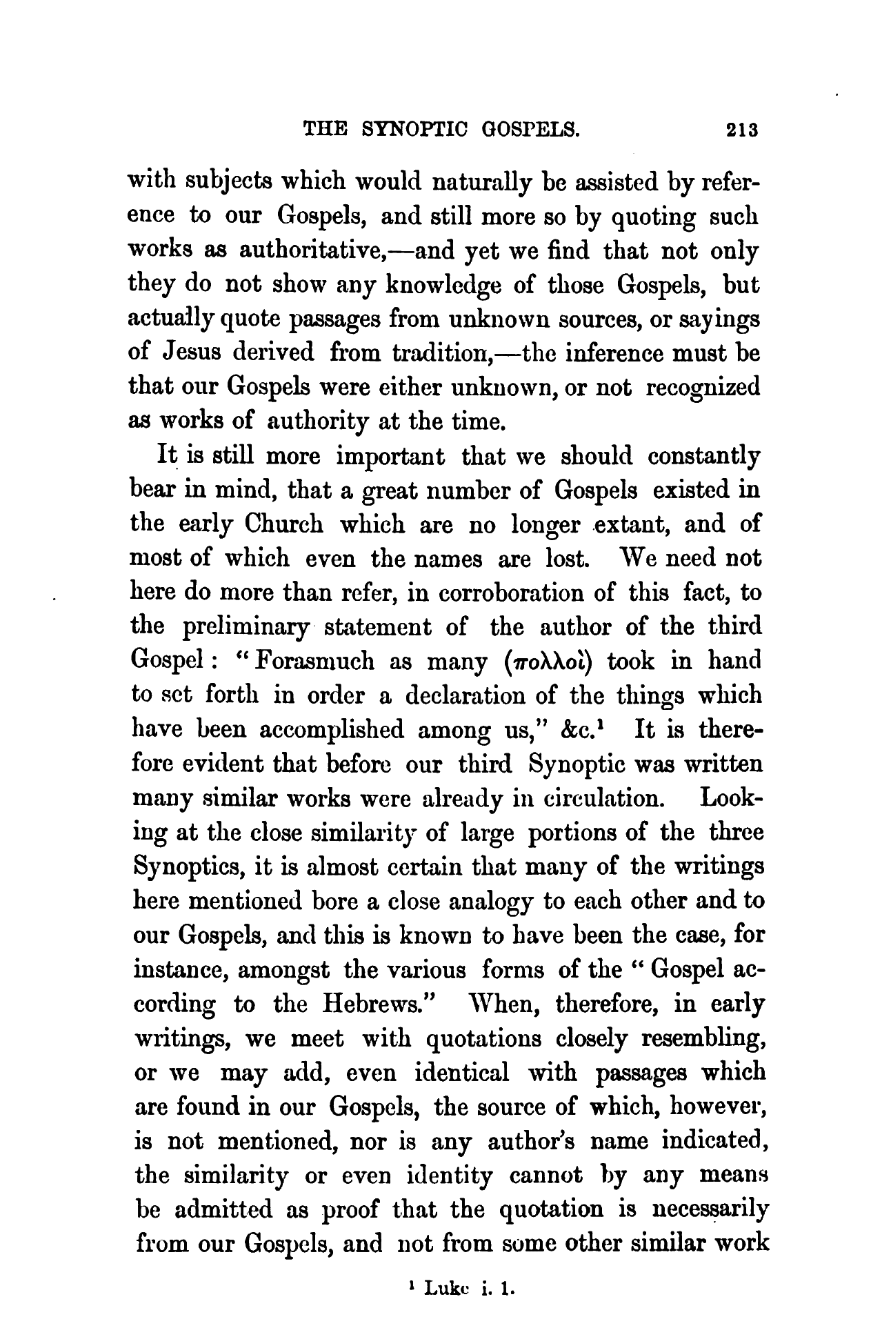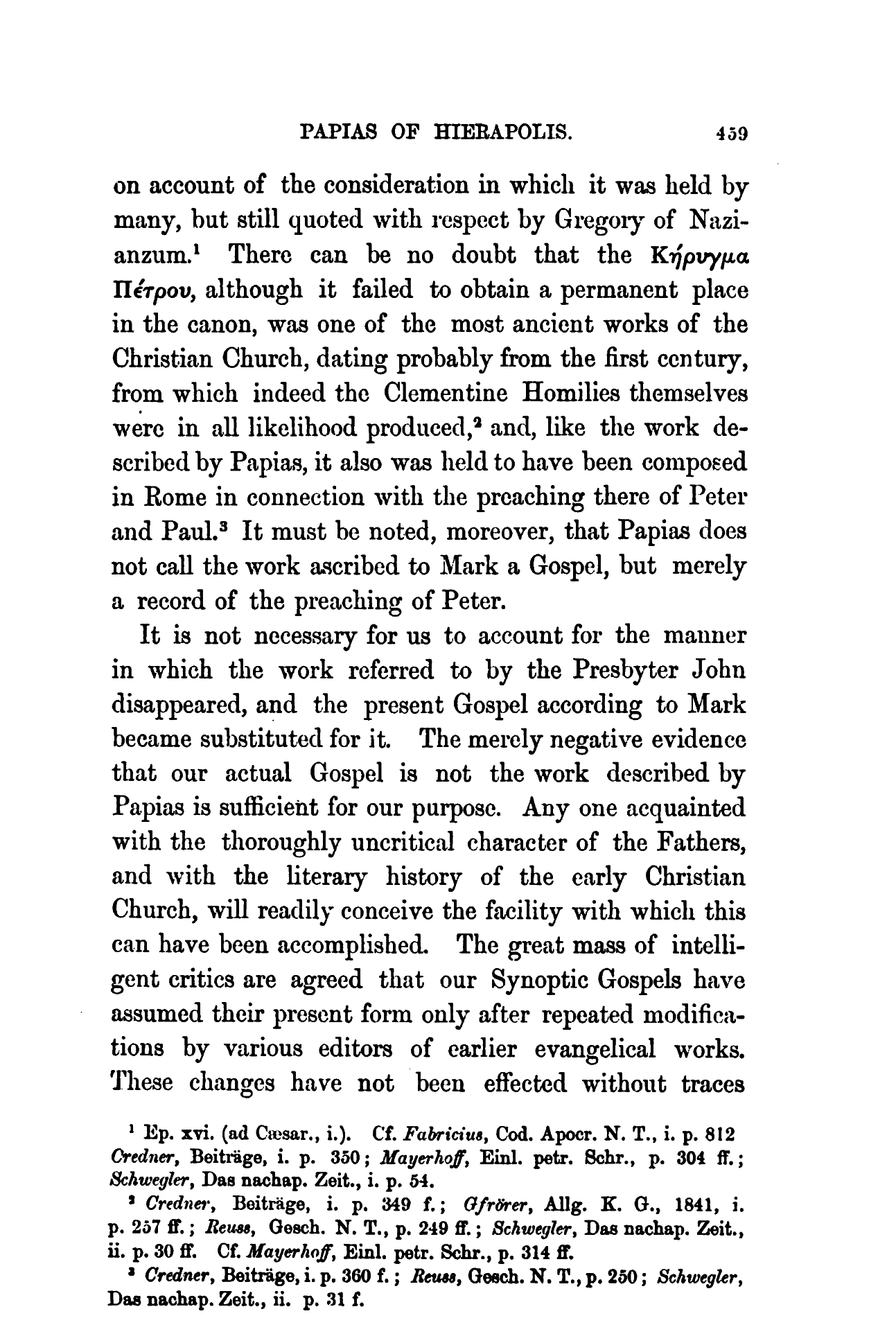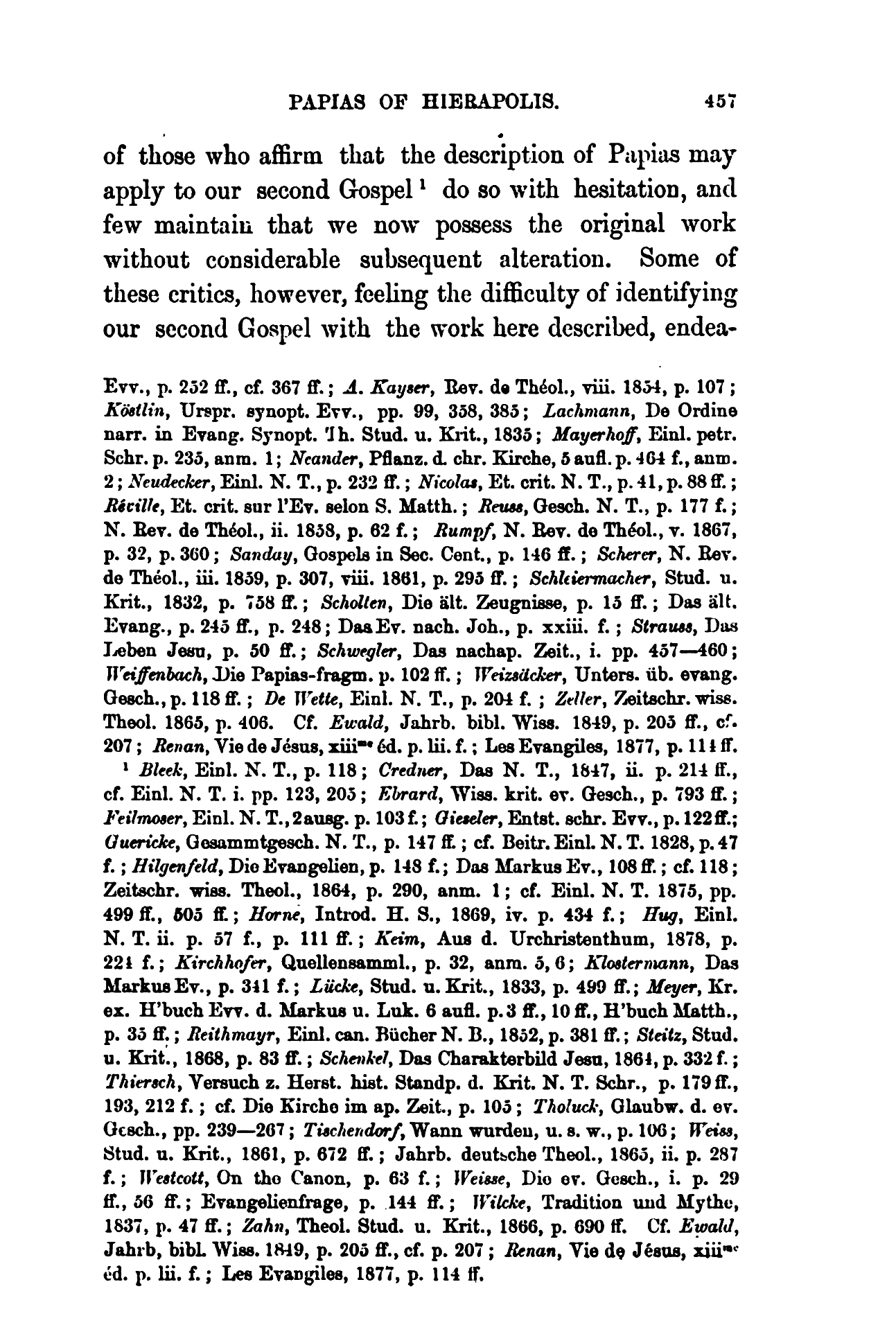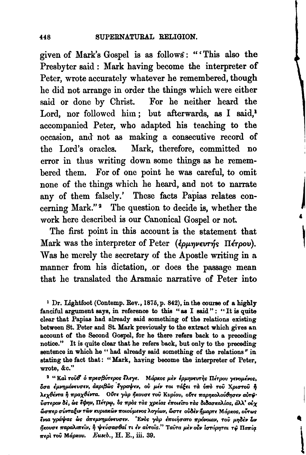 I do not doubt that Dr. Lightfoot sincerely believes this, but he must allow me to say that he is thoroughly mistaken in his estimate of the importance of the point, and that, as regards this work, the representations made in the above passages are a very strange exaggeration. I am unfortunately too familiar, in connection with criticism on this book, with instances of vast expenditure of time and strength in attacking points to which I attach no importance whatever, and which in themselves have scarcely any value. When writers, after an amount of demonstration which must have conveyed the impression that vital interests were at stake, have, at least in their own opinion, proved that I have omitted to dot an "i," cross a "t," or insert an inverted comma, they have really left the question precisely where it was. Now, in the present instance, the whole extent of the argument which is based upon the silence of Eusebius is an inference regarding some lost works of three writers only, which might altogether be withdrawn without affecting the case. The object of my investigation is to discover what evidence actually exists in the works of early writers regarding our Gospels. In the fragments which remain of the works of three writers, Hegesippus, Papias, and Dionysius of Corinth, I do not find any evidence of acquaintance with these Gospels,—the works mentioned by Papias being, I contend, different from the existing Gospels attributed to Matthew and Mark. Whether I am right or not in this does not affect the present discussion. It is an unquestioned fact that Eusebius does not mention that the lost works of these