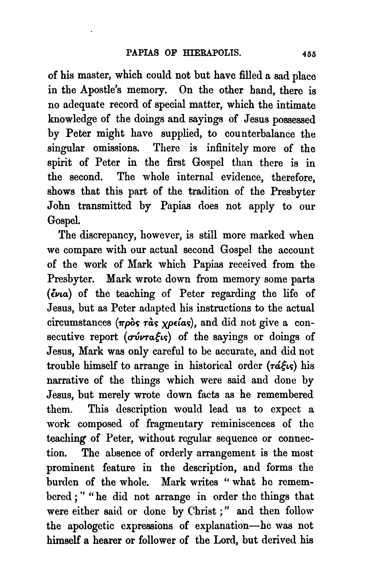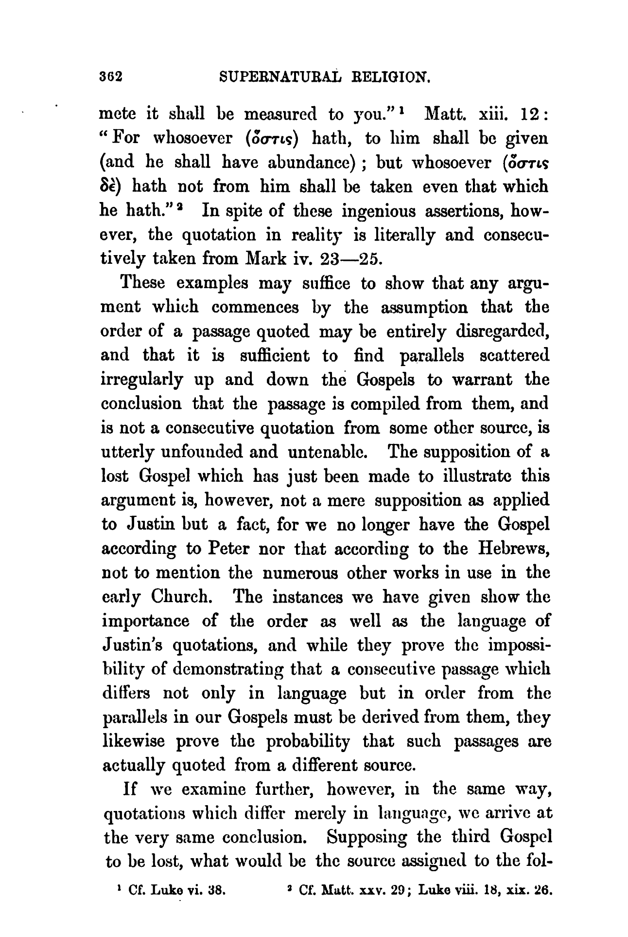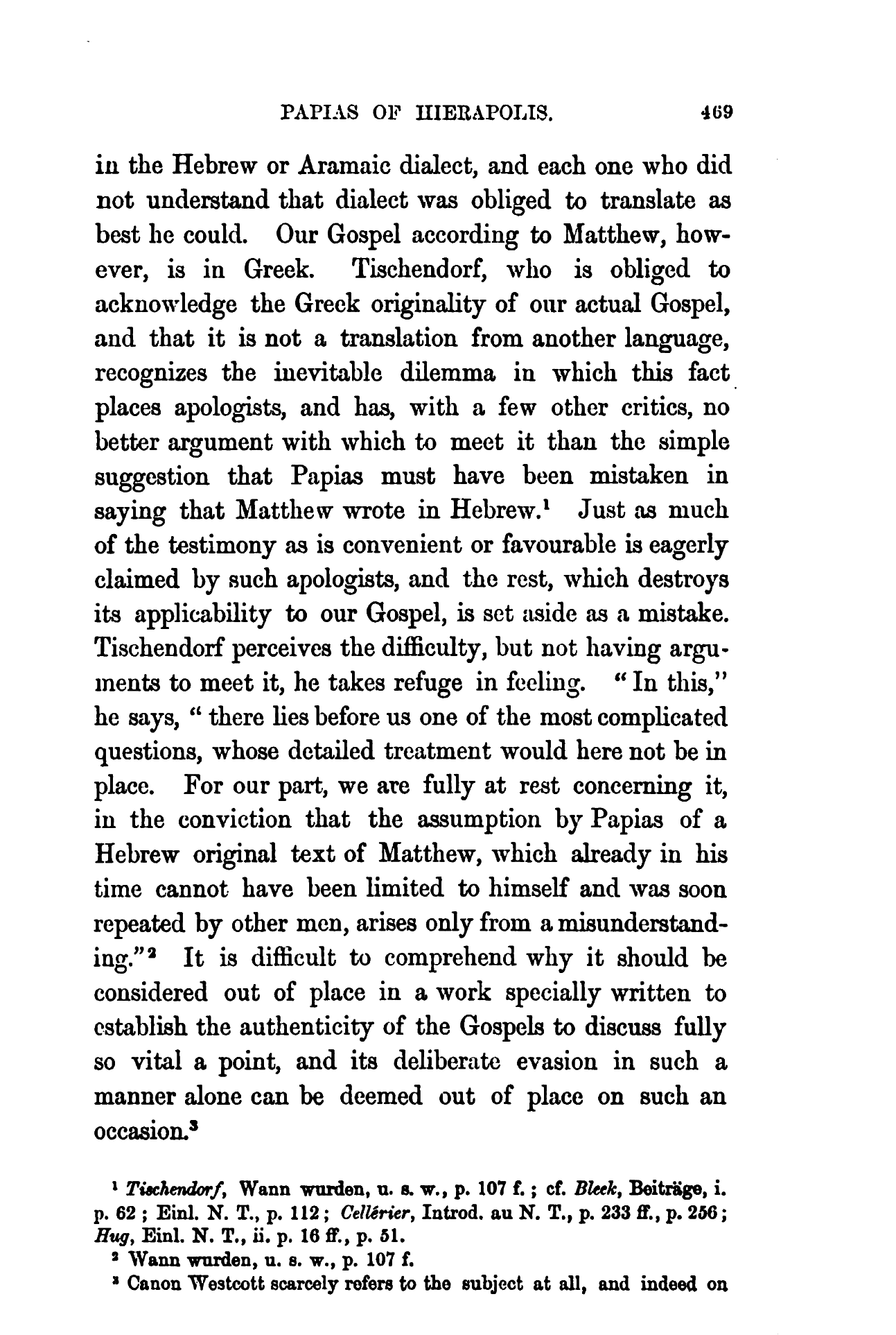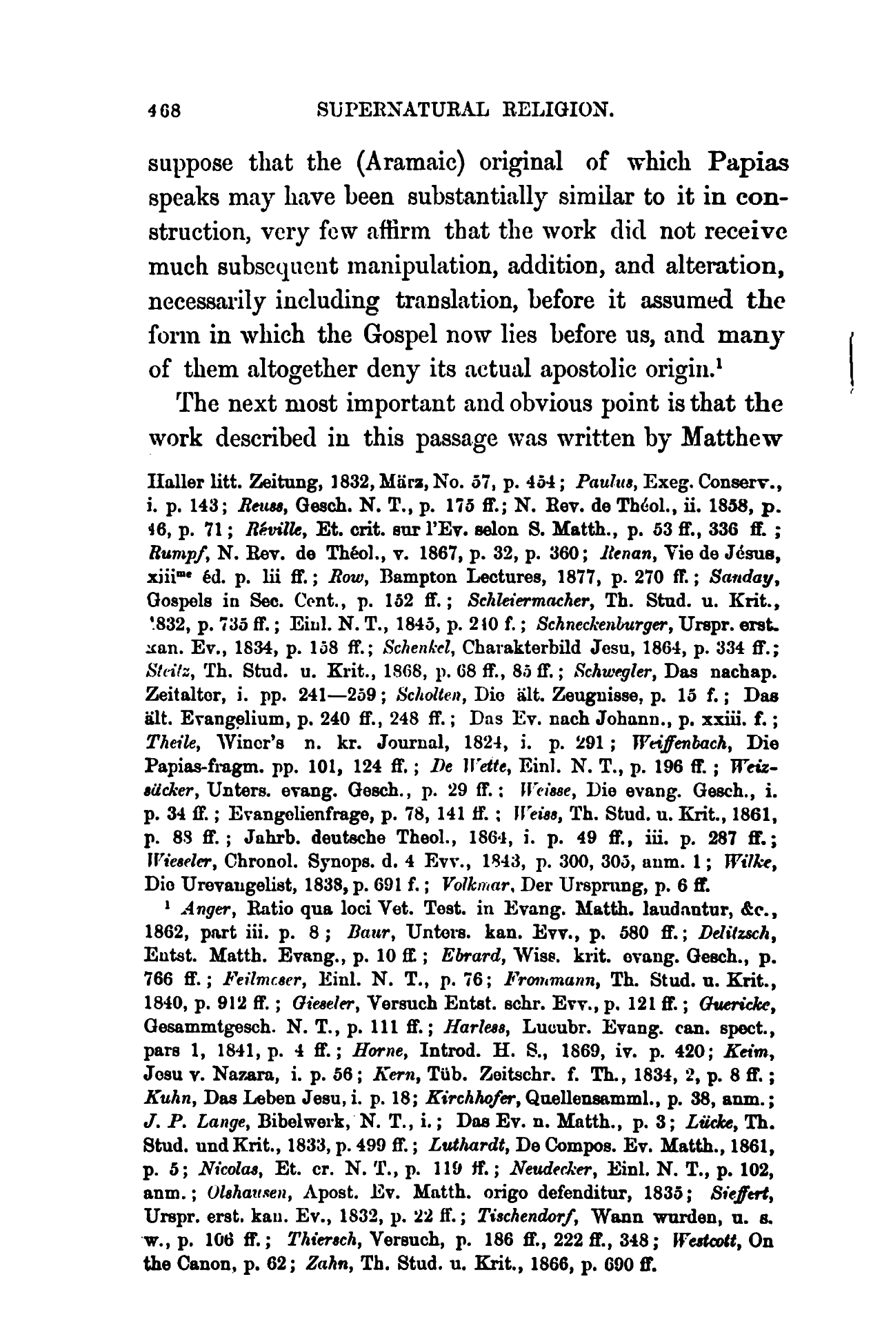 I do not doubt that Dr. Lightfoot sincerely believes this, but he must allow me to say that he is thoroughly mistaken in his estimate of the importance of the point, and that, as regards this work, the representations made in the above passages are a very strange exaggeration. I am unfortunately too familiar, in connection with criticism on this book, with instances of vast expenditure of time and strength in attacking points to which I attach no importance whatever, and which in themselves have scarcely any value. When writers, after an amount of demonstration which must have conveyed the impression that vital interests were at stake, have, at least in their own opinion, proved that I have omitted to dot an "i," cross a "t," or insert an inverted comma, they have really left the question precisely where it was. Now, in the present instance, the whole extent of the argument which is based upon the silence of Eusebius is an inference regarding some lost works of three writers only, which might altogether be withdrawn without affecting the case. The object of my investigation is to discover what evidence actually exists in the works of early writers regarding our Gospels. In the fragments which remain of the works of three writers, Hegesippus, Papias, and Dionysius of Corinth, I do not find any evidence of acquaintance with these Gospels,—the works mentioned by Papias being, I contend, different from the existing Gospels attributed to Matthew and Mark. Whether I am right or not in this does not affect the present discussion. It is an unquestioned fact that Eusebius does not mention that the lost works of these