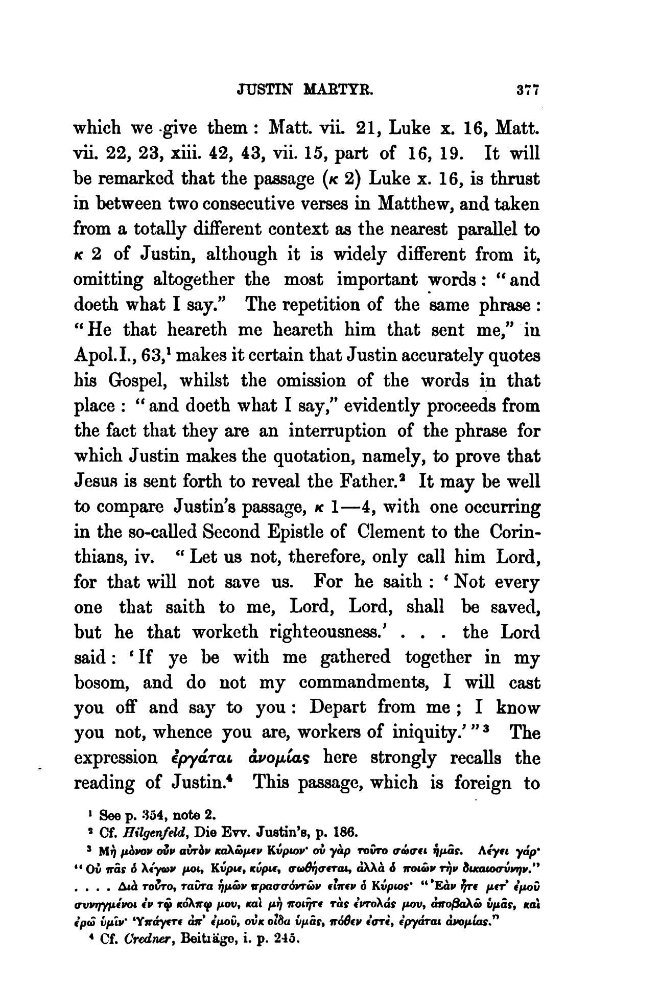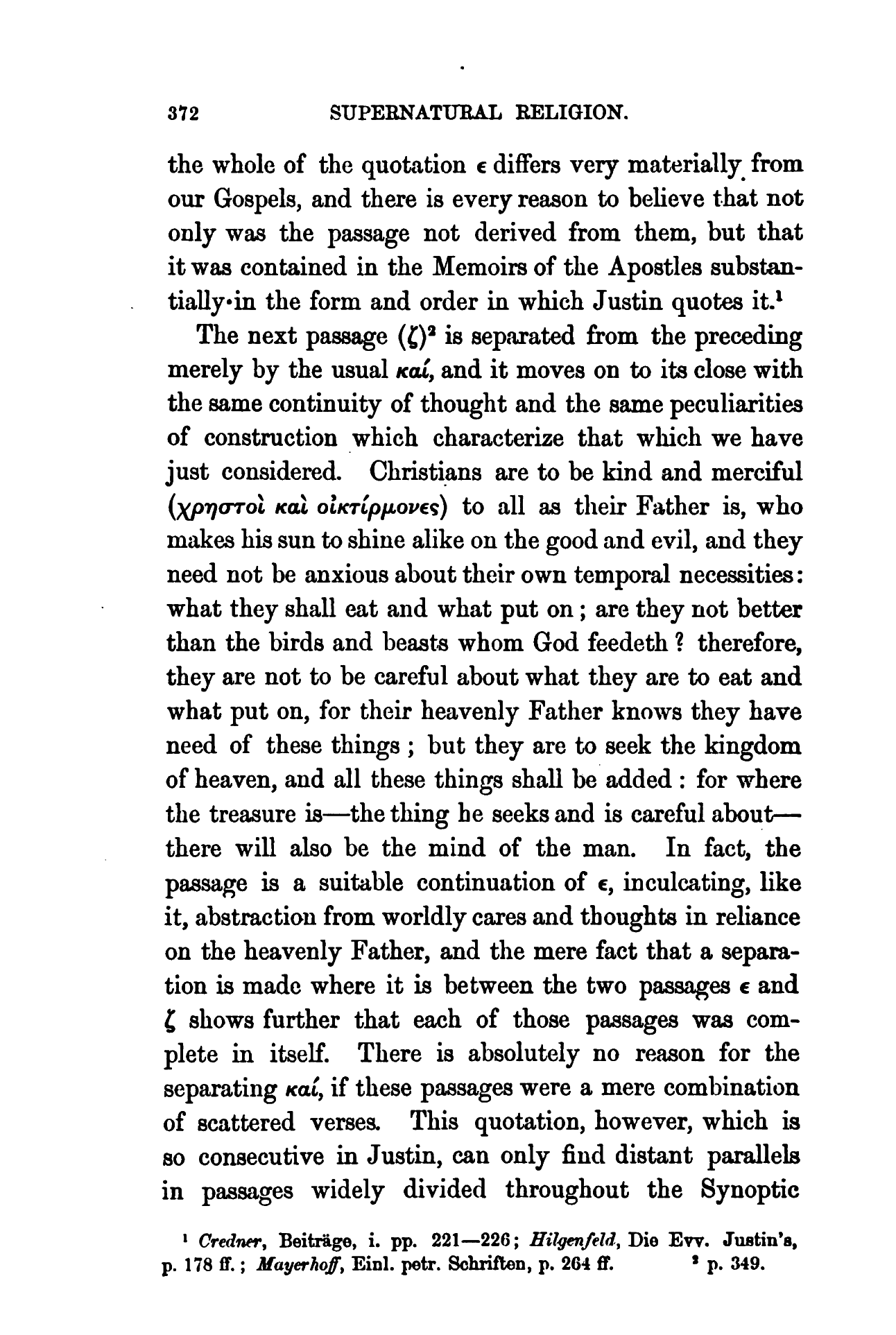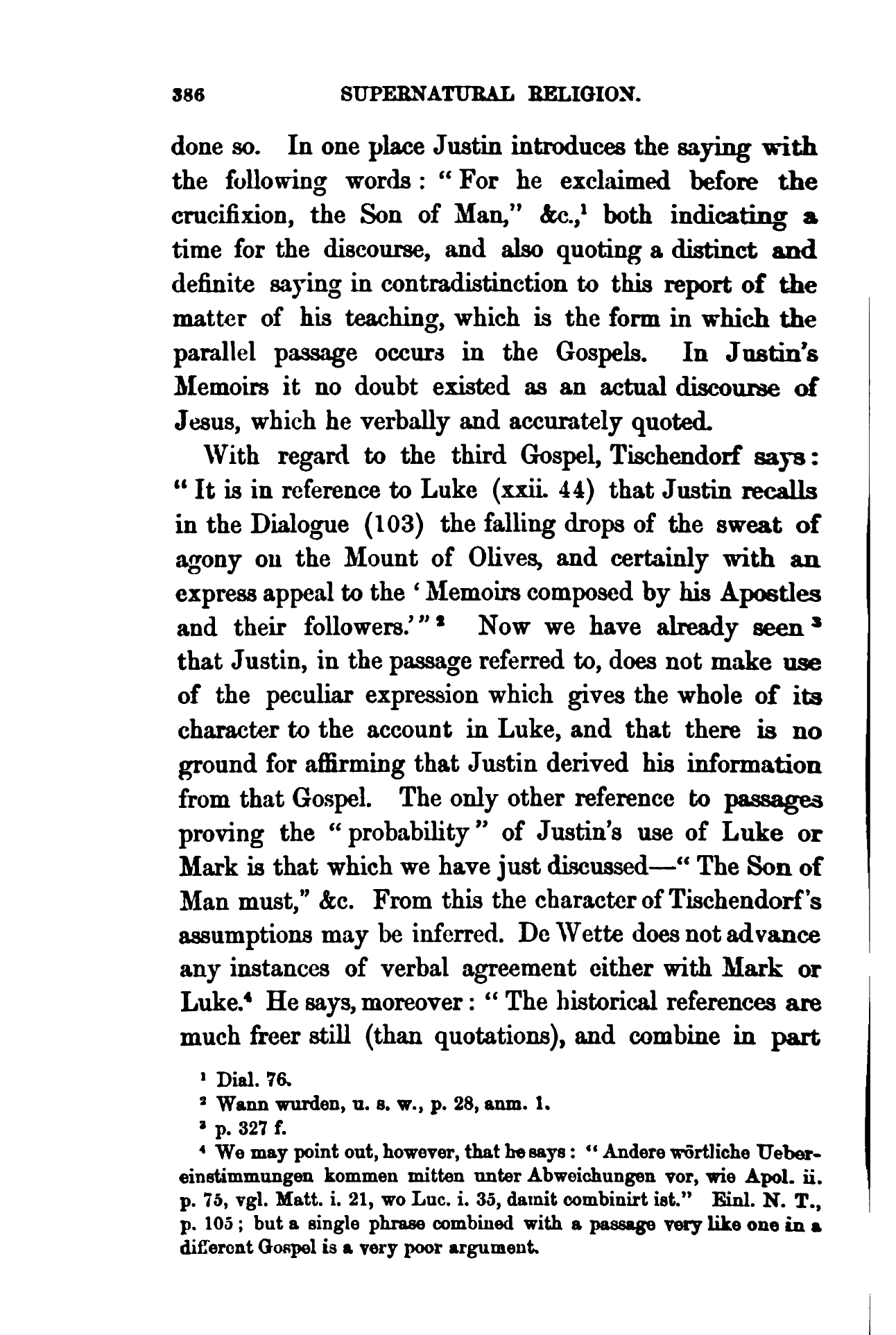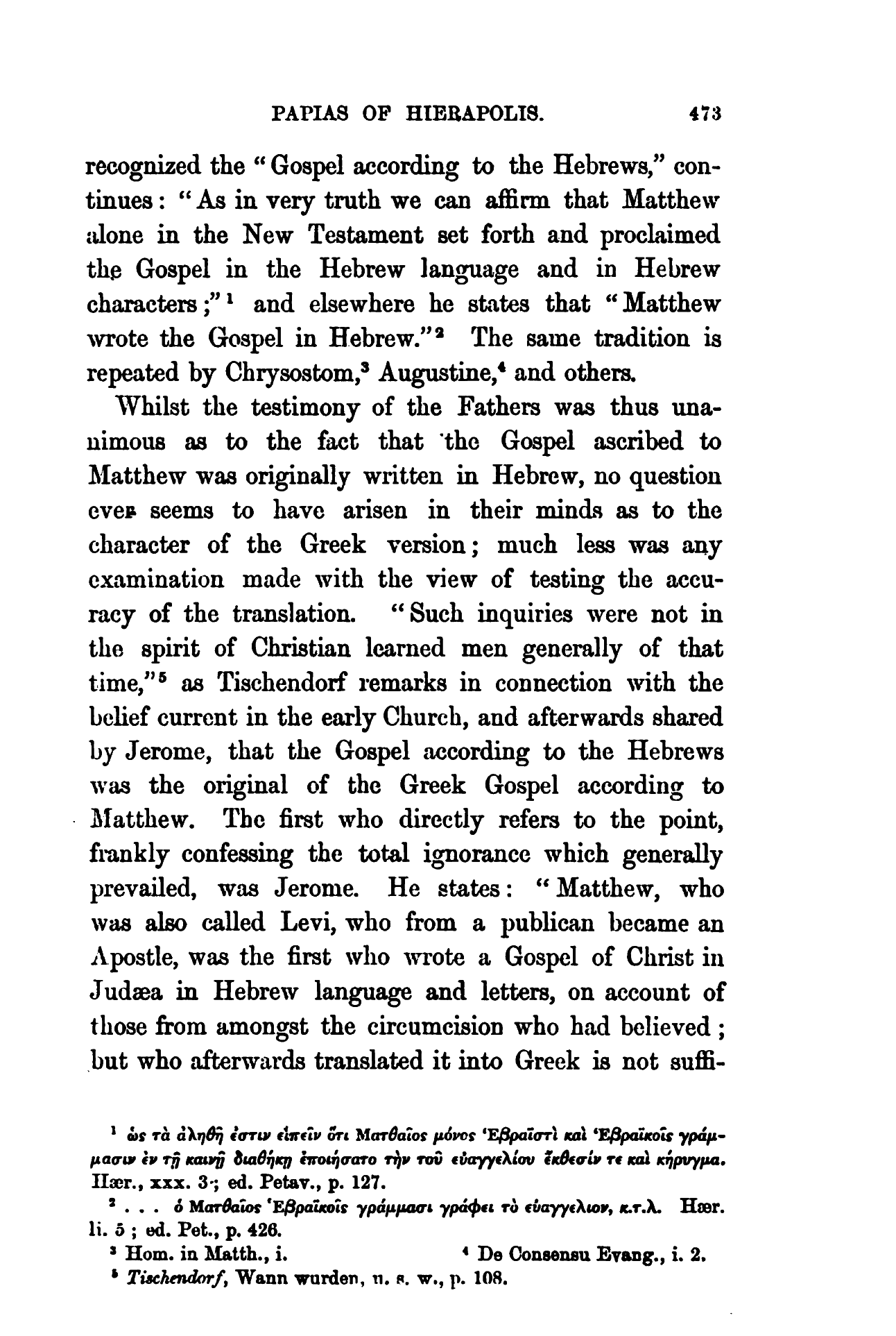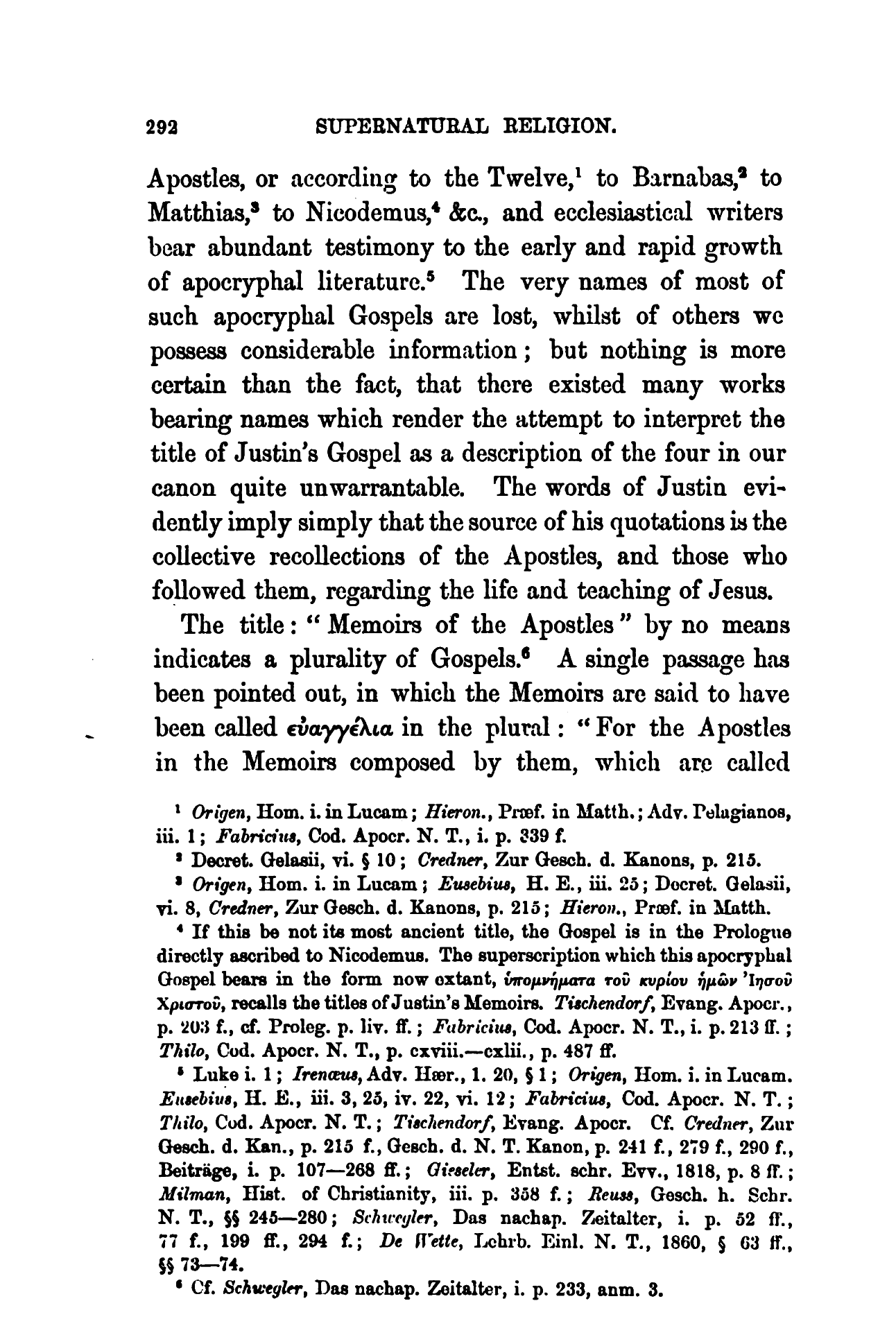 I do not doubt that Dr. Lightfoot sincerely believes this, but he must allow me to say that he is thoroughly mistaken in his estimate of the importance of the point, and that, as regards this work, the representations made in the above passages are a very strange exaggeration. I am unfortunately too familiar, in connection with criticism on this book, with instances of vast expenditure of time and strength in attacking points to which I attach no importance whatever, and which in themselves have scarcely any value. When writers, after an amount of demonstration which must have conveyed the impression that vital interests were at stake, have, at least in their own opinion, proved that I have omitted to dot an "i," cross a "t," or insert an inverted comma, they have really left the question precisely where it was. Now, in the present instance, the whole extent of the argument which is based upon the silence of Eusebius is an inference regarding some lost works of three writers only, which might altogether be withdrawn without affecting the case. The object of my investigation is to discover what evidence actually exists in the works of early writers regarding our Gospels. In the fragments which remain of the works of three writers, Hegesippus, Papias, and Dionysius of Corinth, I do not find any evidence of acquaintance with these Gospels,—the works mentioned by Papias being, I contend, different from the existing Gospels attributed to Matthew and Mark. Whether I am right or not in this does not affect the present discussion. It is an unquestioned fact that Eusebius does not mention that the lost works of these