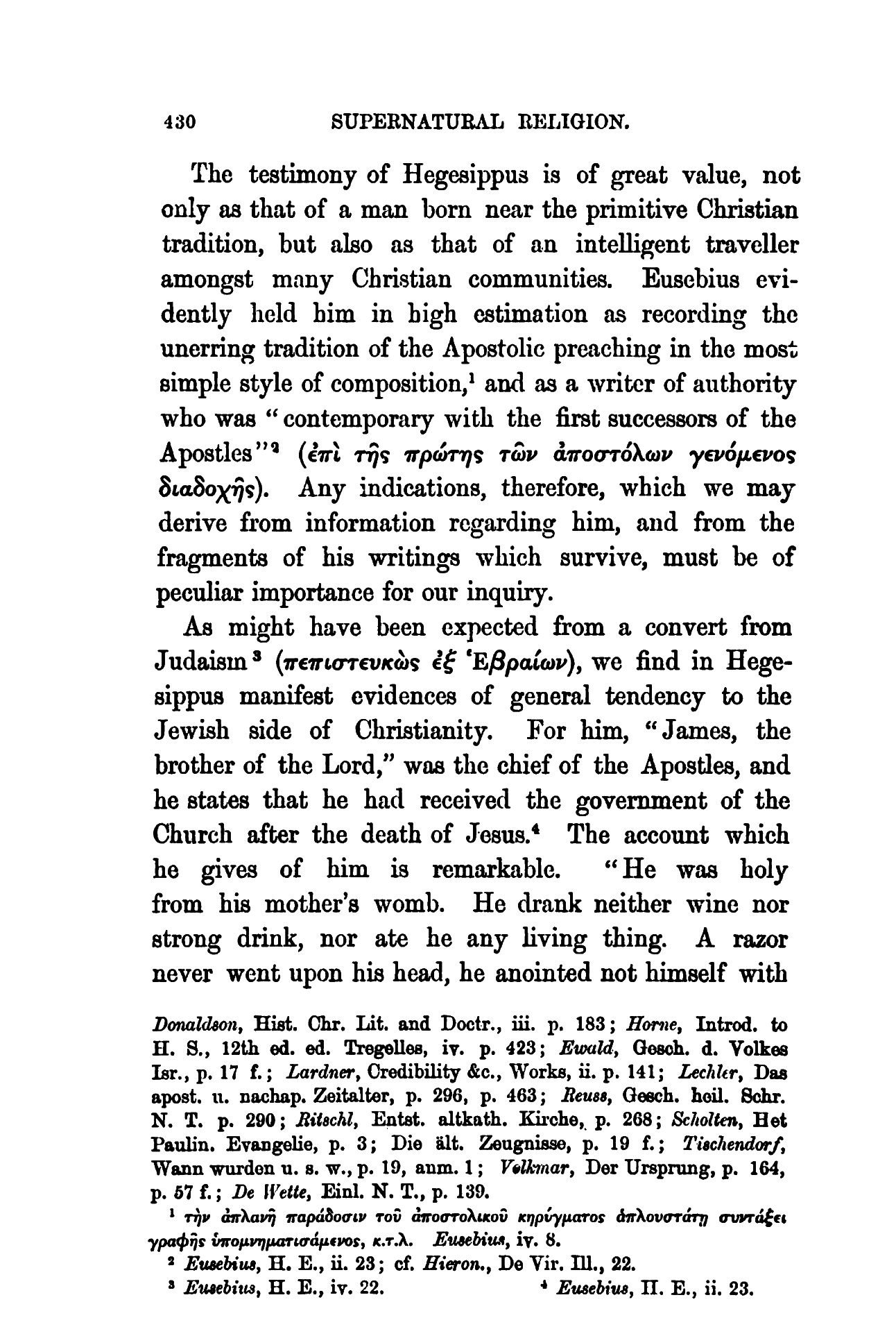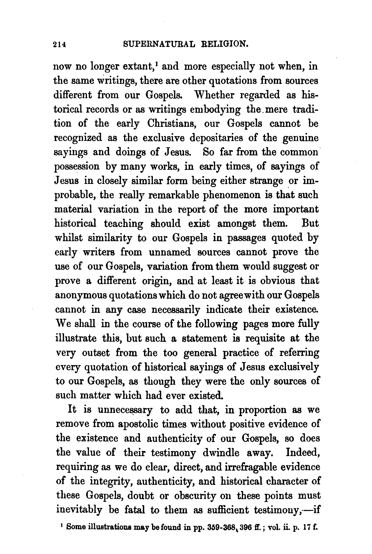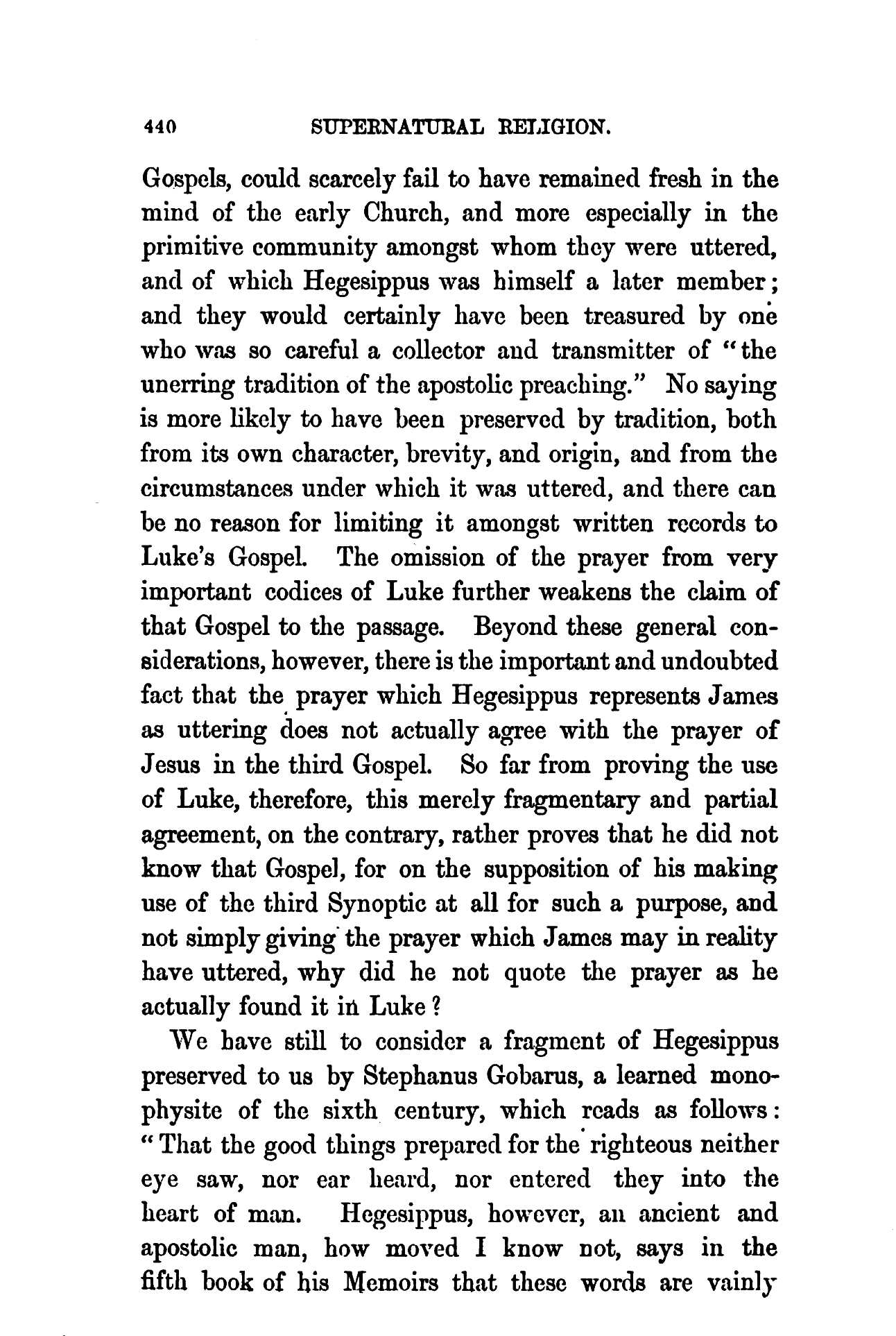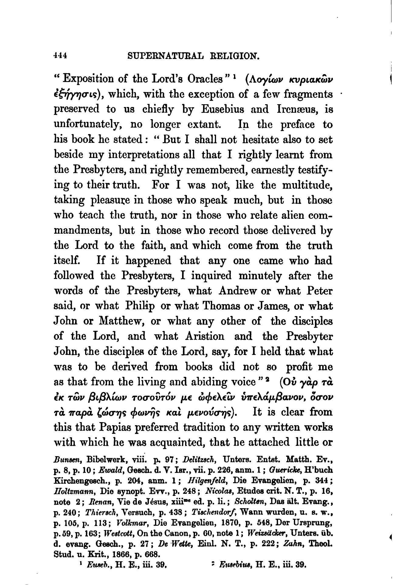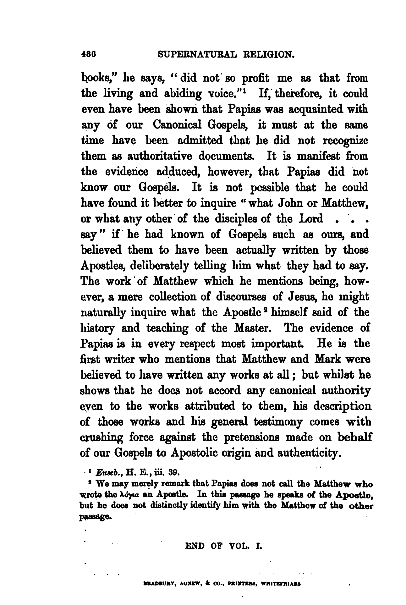 writers contained any reference to, or information about, the Gospels, nor have we any statement from any other author to that effect. The objection of Dr. Lightfoot is limited to a denial that the silence of Eusebius warrants the inference that, because he does not state that these writers made quotations from or references to undisputed canonical books, the lost works did not contain any; it does not, however, extend to interesting information regarding those books, which he admits it was the purpose of Eusebius to record. To give Dr. Lightfoot's statements, which I am examining, the fullest possible support, however, suppose that I abandon Eusebius altogether, and do not draw any inference of any kind from him beyond his positive statements, how would my case stand? Simply as complete as it well could be: Hegesippus, Papias, and Dionysius do not furnish any evidence in favour of the Gospels. The reader, therefore, will not fail to see how serious a misstatement Dr. Lightfoot has made, and how little the argument of "Supernatural Religion" would be affected even if he established much more than he has attempted to do.