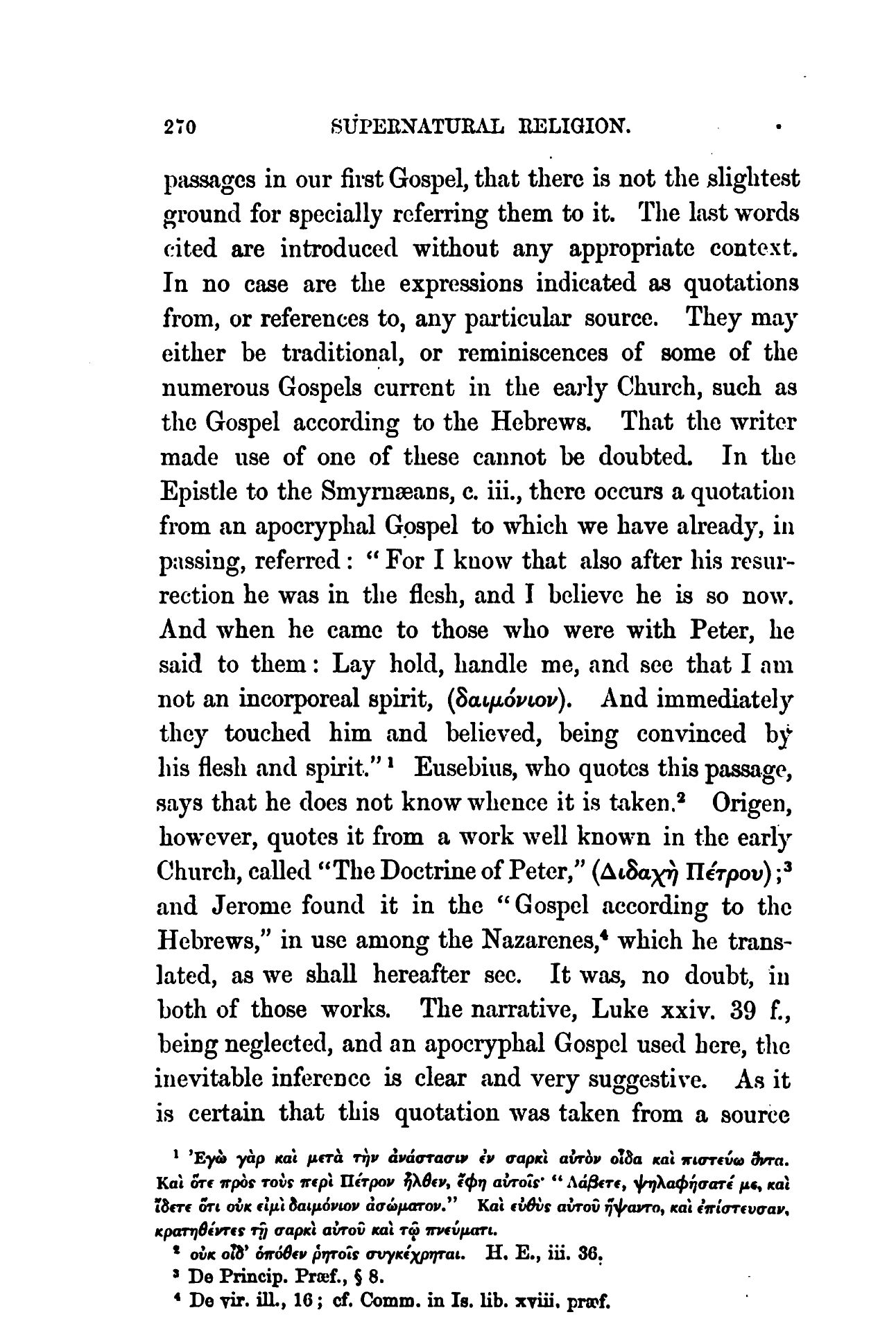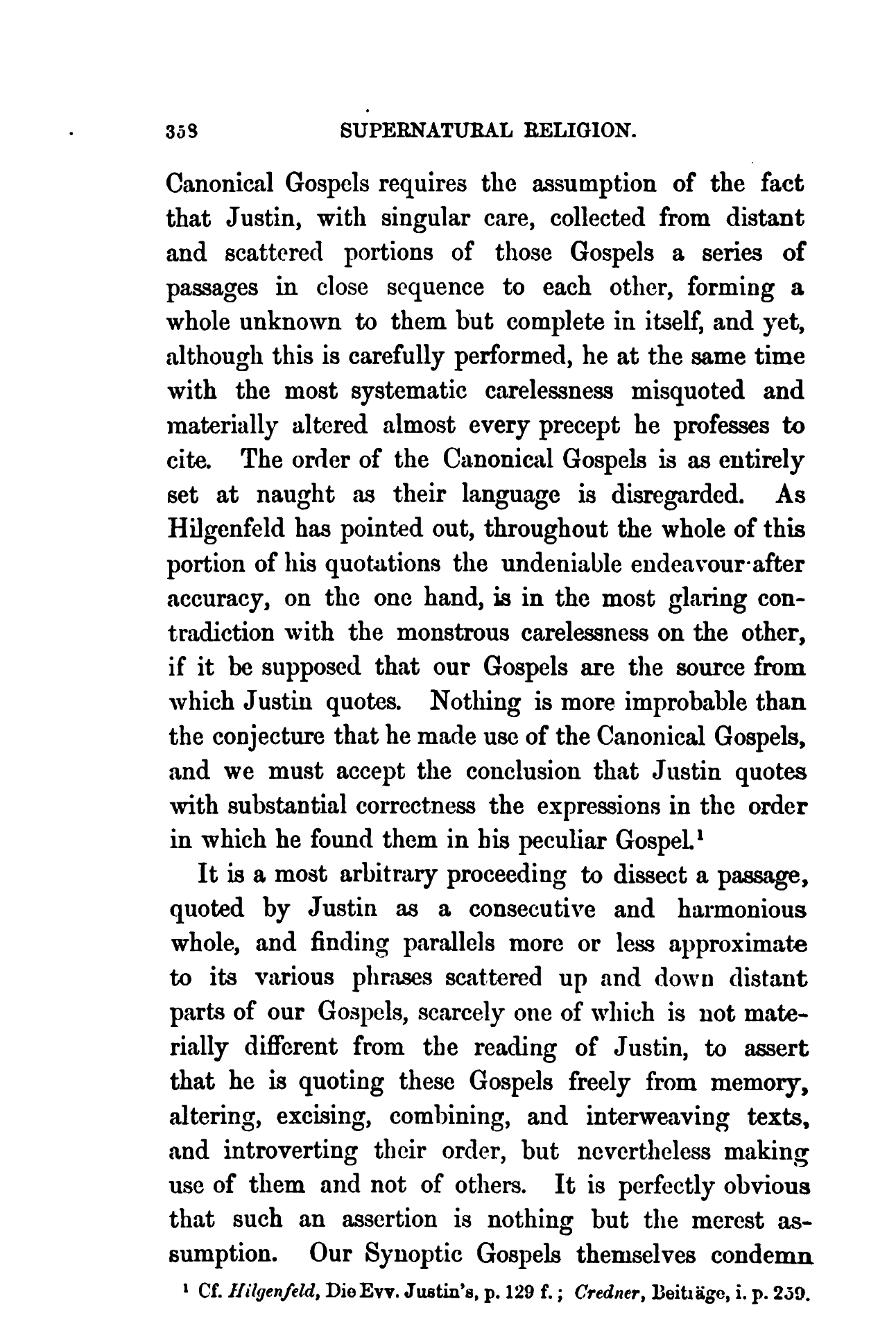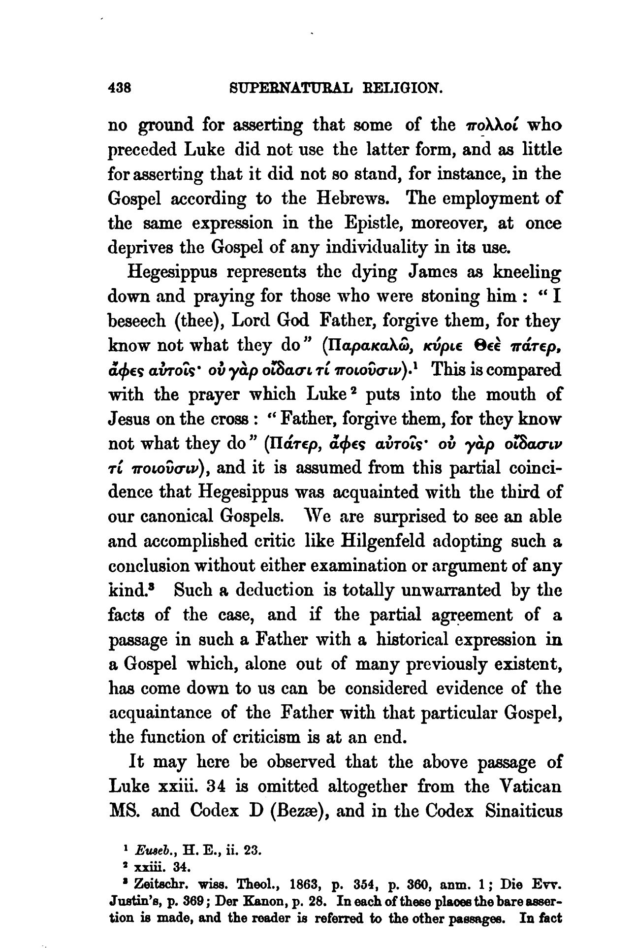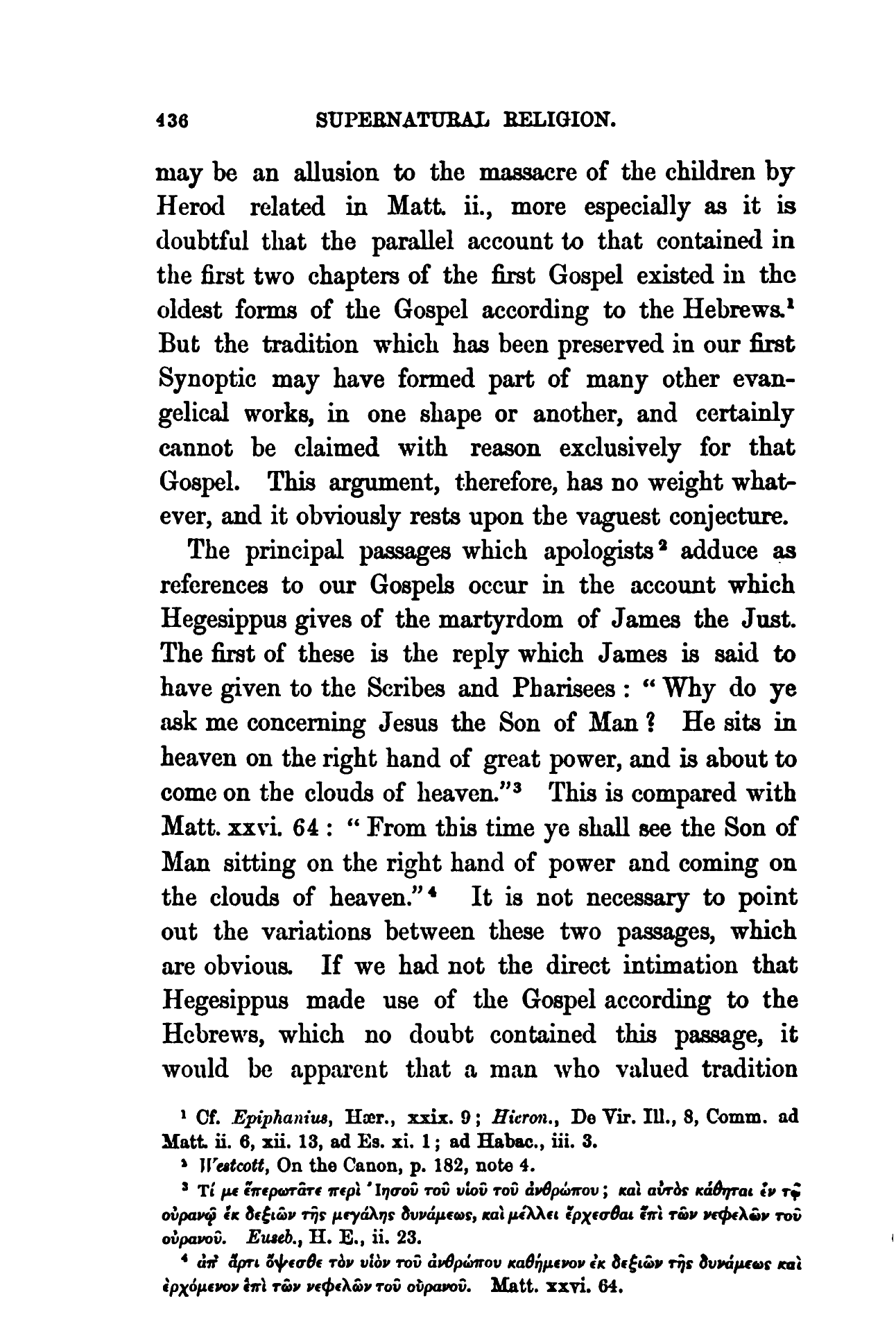writers contained any reference to, or information about, the Gospels, nor have we any statement from any other author to that effect. The objection of Dr. Lightfoot is limited to a denial that the silence of Eusebius warrants the inference that, because he does not state that these writers made quotations from or references to undisputed canonical books, the lost works did not contain any; it does not, however, extend to interesting information regarding those books, which he admits it was the purpose of Eusebius to record. To give Dr. Lightfoot's statements, which I am examining, the fullest possible support, however, suppose that I abandon Eusebius altogether, and do not draw any inference of any kind from him beyond his positive statements, how would my case stand? Simply as complete as it well could be: Hegesippus, Papias, and Dionysius do not furnish any evidence in favour of the Gospels. The reader, therefore, will not fail to see how serious a misstatement Dr. Lightfoot has made, and how little the argument of "Supernatural Religion" would be affected even if he established much more than he has attempted to do.