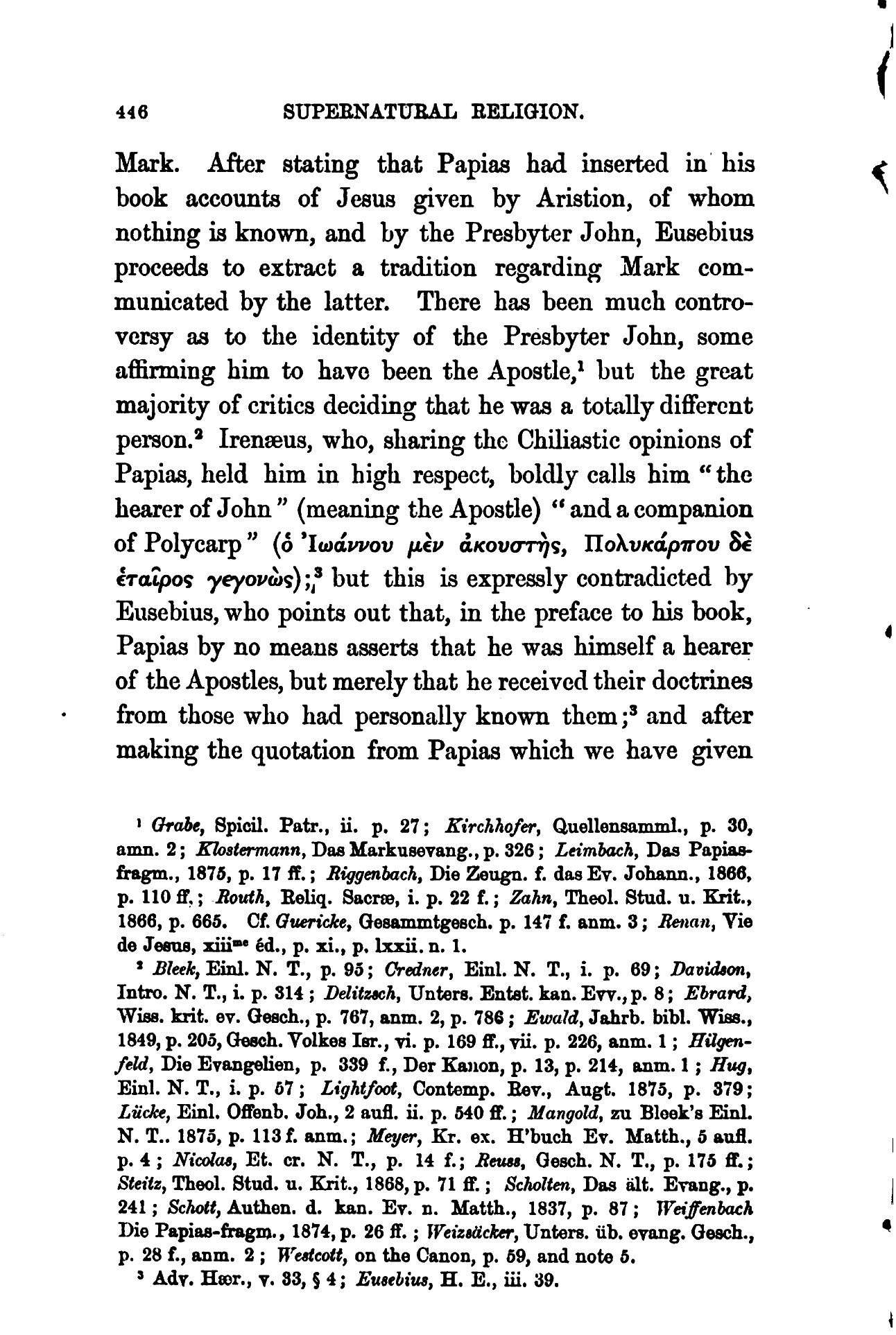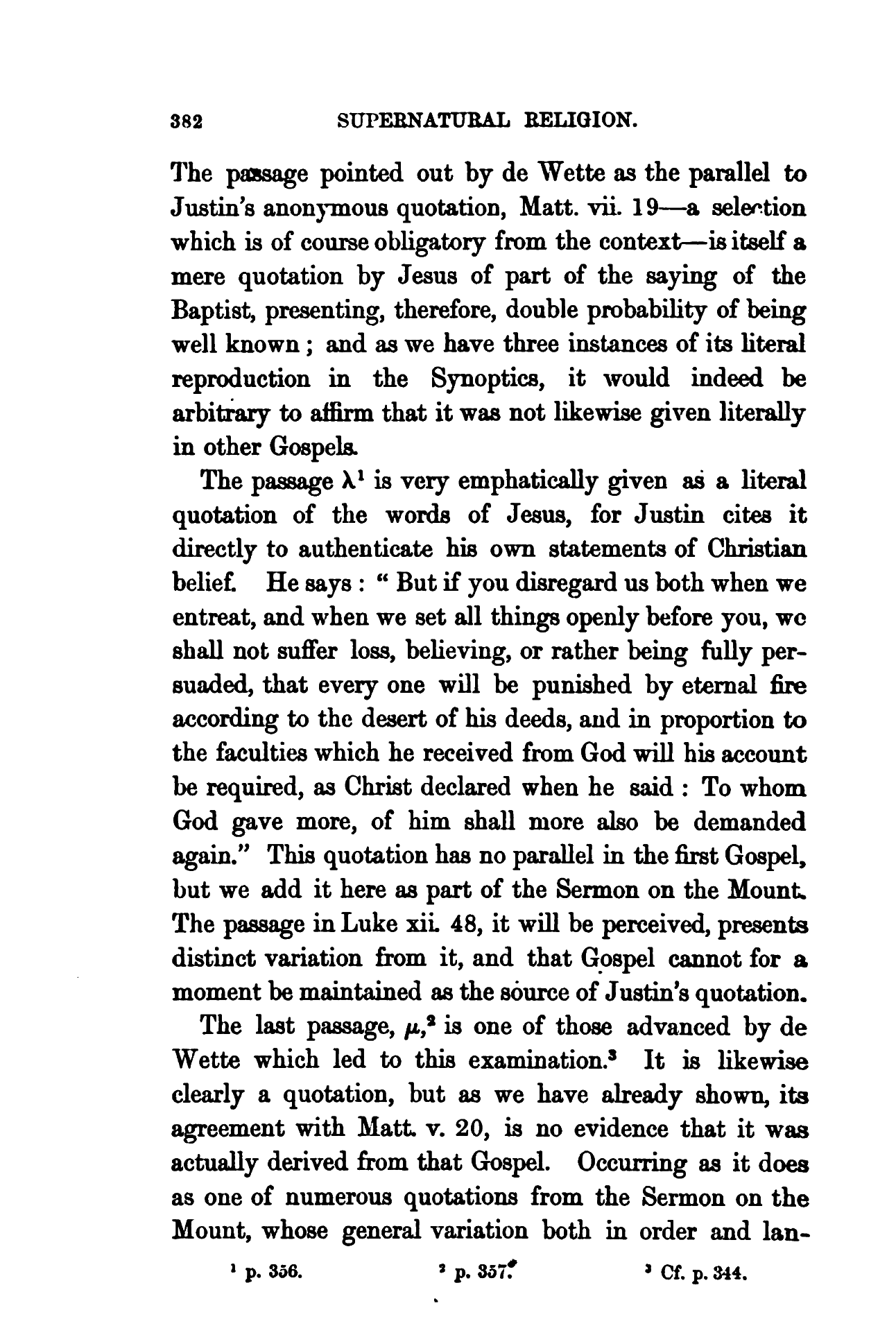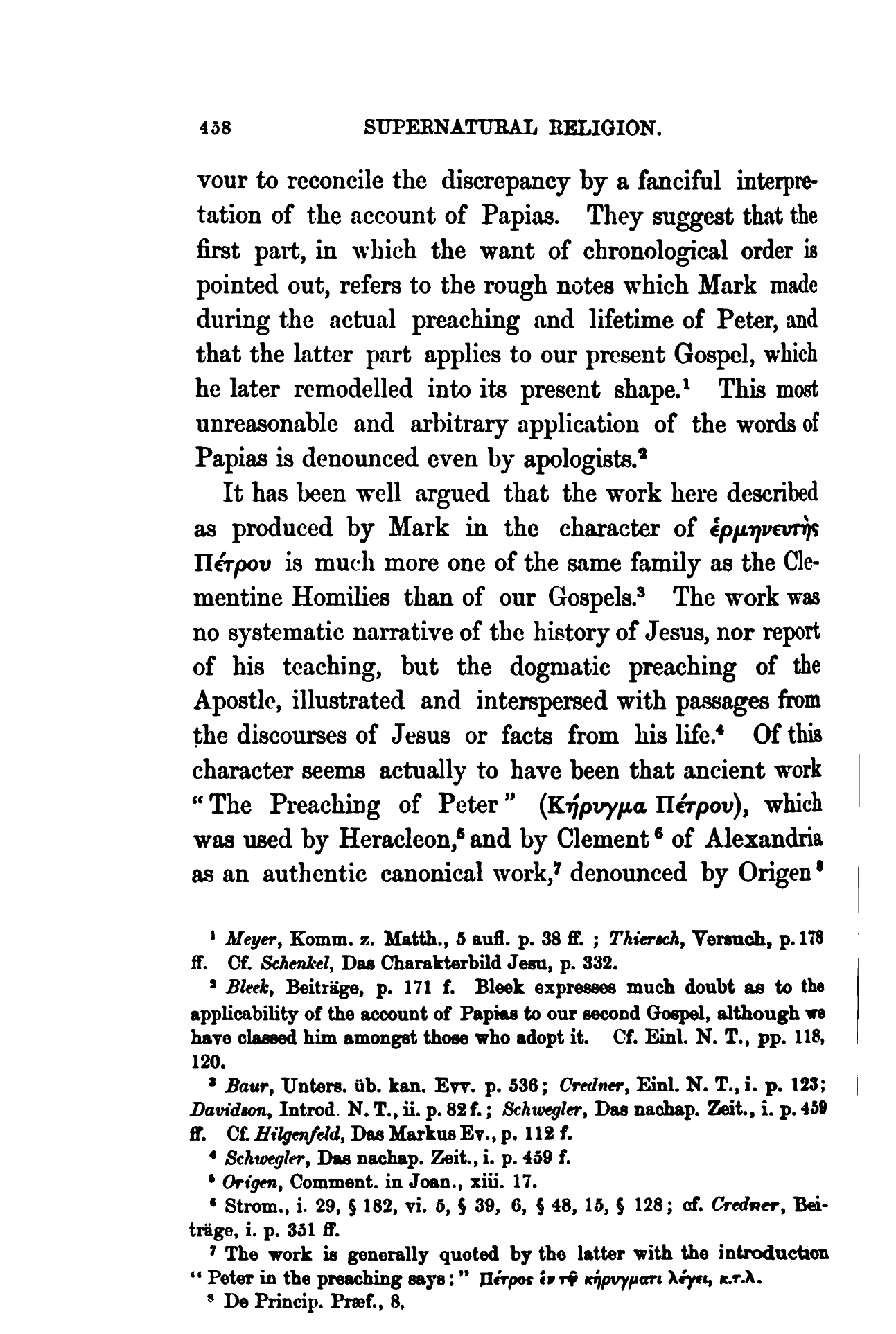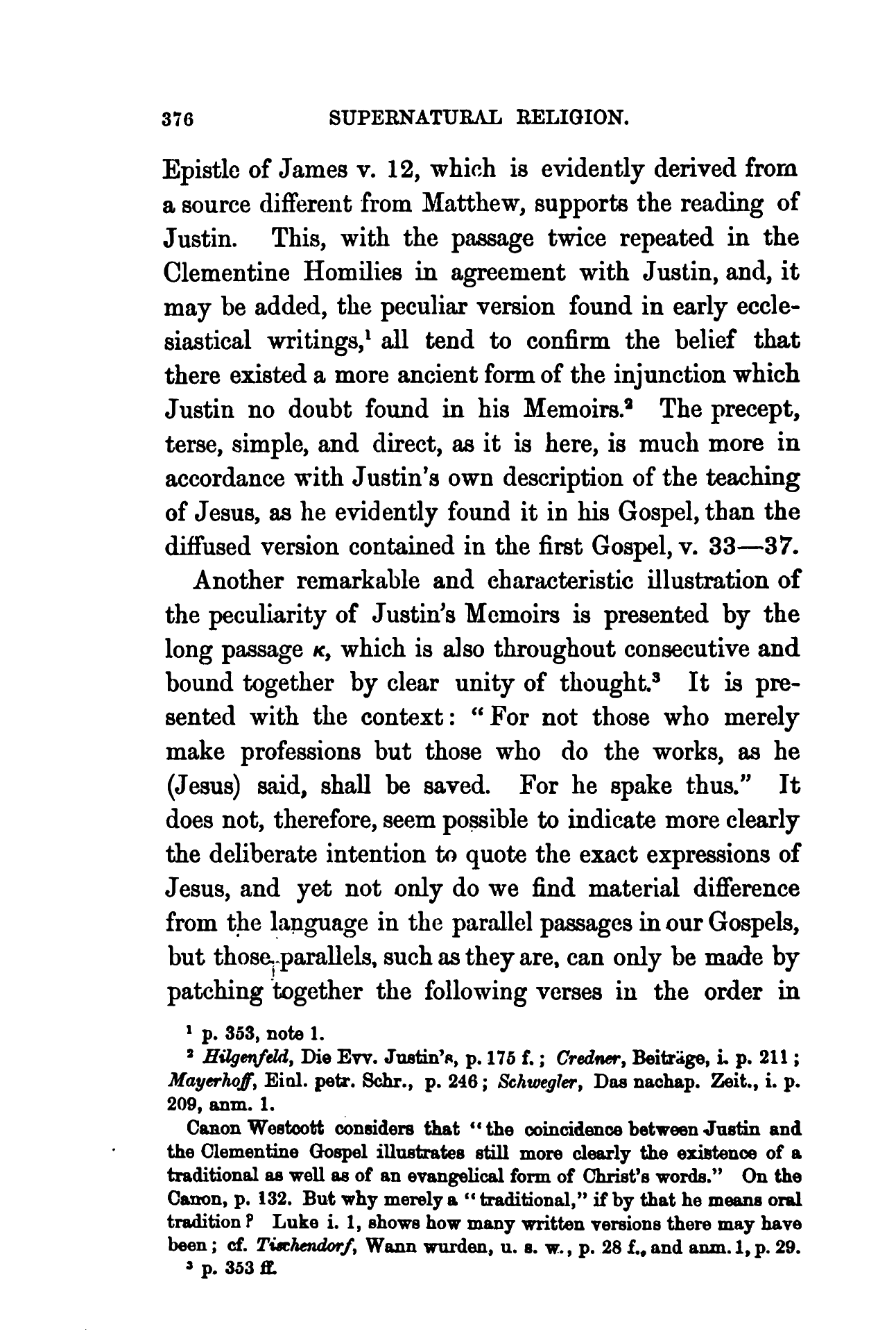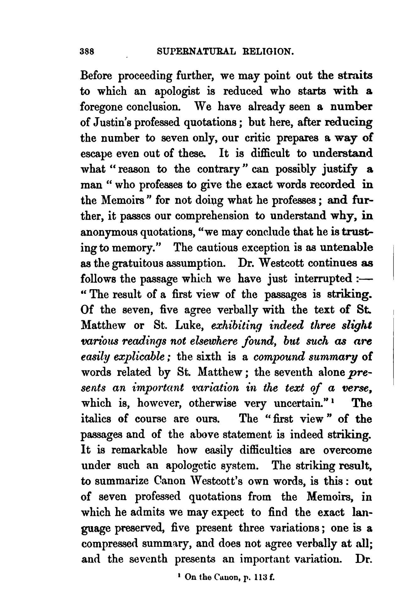 writers contained any reference to, or information about, the Gospels, nor have we any statement from any other author to that effect. The objection of Dr. Lightfoot is limited to a denial that the silence of Eusebius warrants the inference that, because he does not state that these writers made quotations from or references to undisputed canonical books, the lost works did not contain any; it does not, however, extend to interesting information regarding those books, which he admits it was the purpose of Eusebius to record. To give Dr. Lightfoot's statements, which I am examining, the fullest possible support, however, suppose that I abandon Eusebius altogether, and do not draw any inference of any kind from him beyond his positive statements, how would my case stand? Simply as complete as it well could be: Hegesippus, Papias, and Dionysius do not furnish any evidence in favour of the Gospels. The reader, therefore, will not fail to see how serious a misstatement Dr. Lightfoot has made, and how little the argument of "Supernatural Religion" would be affected even if he established much more than he has attempted to do.