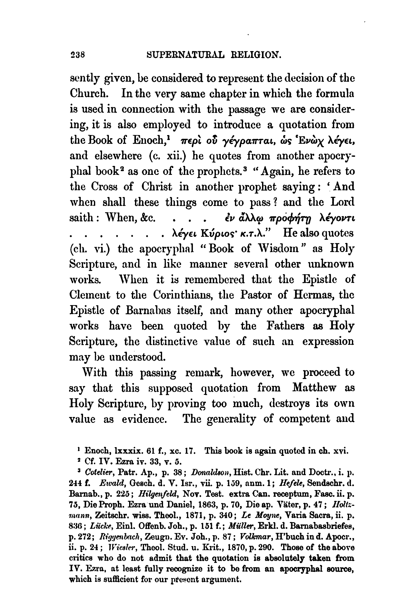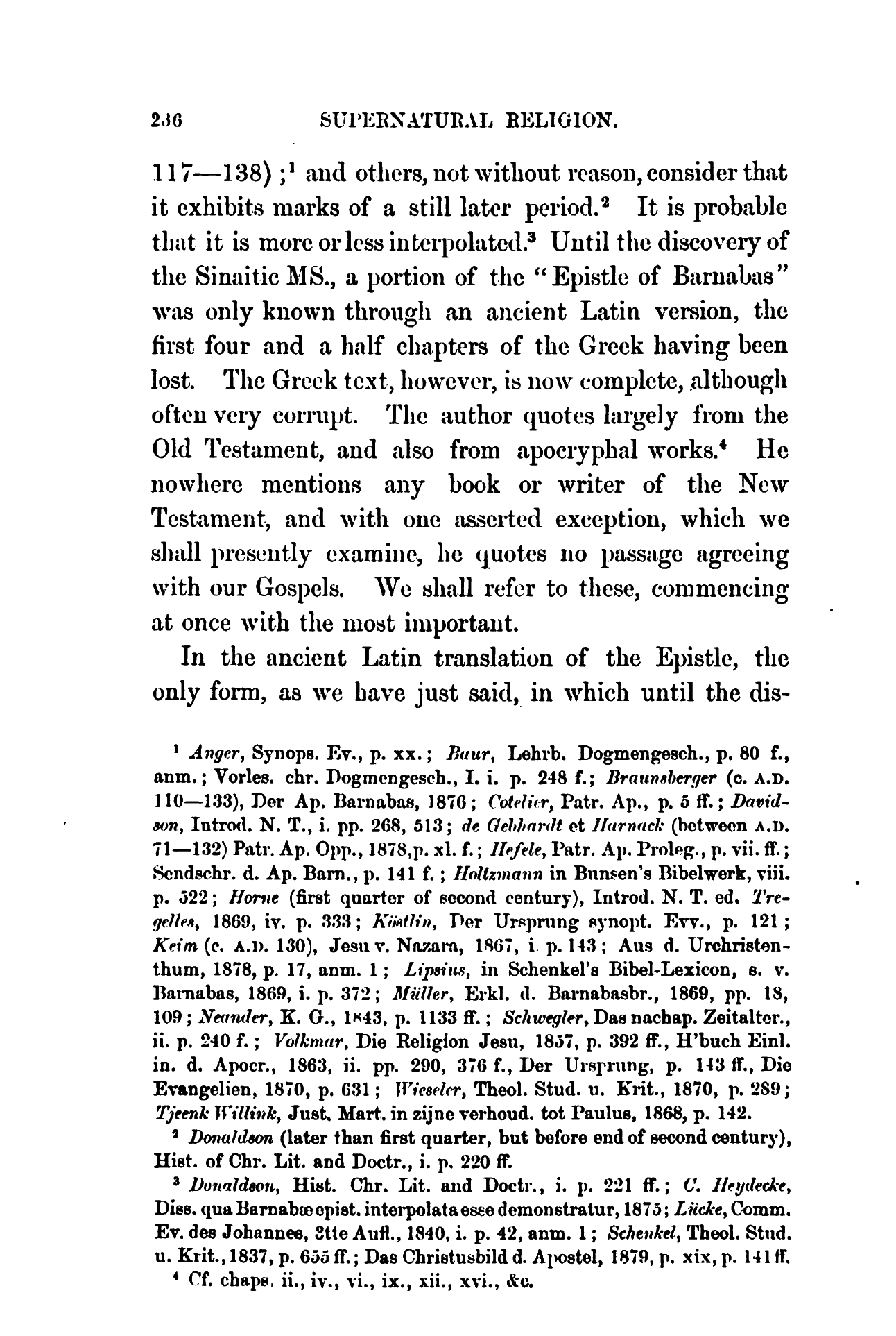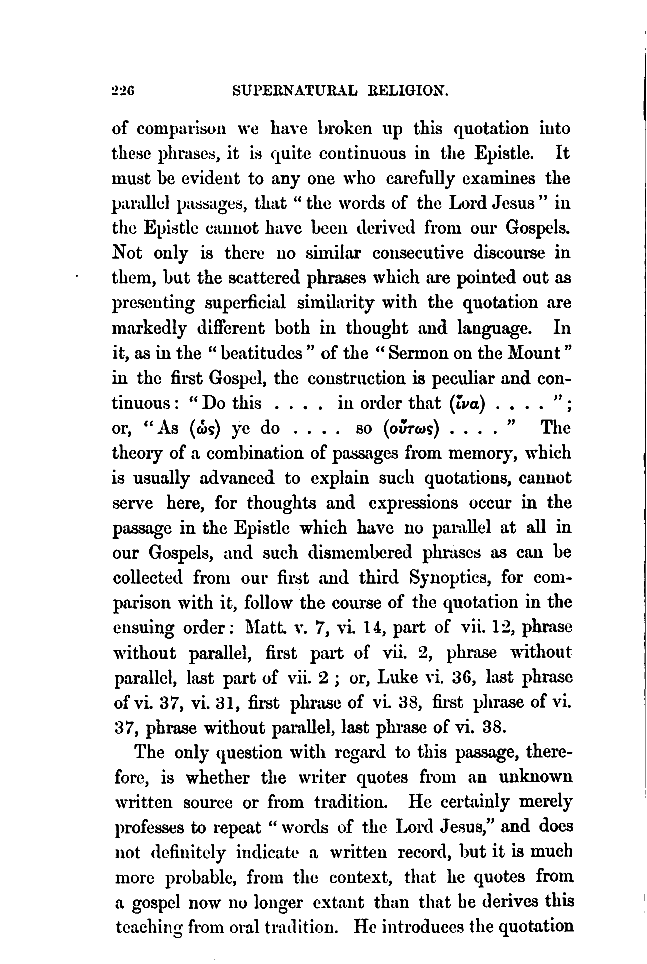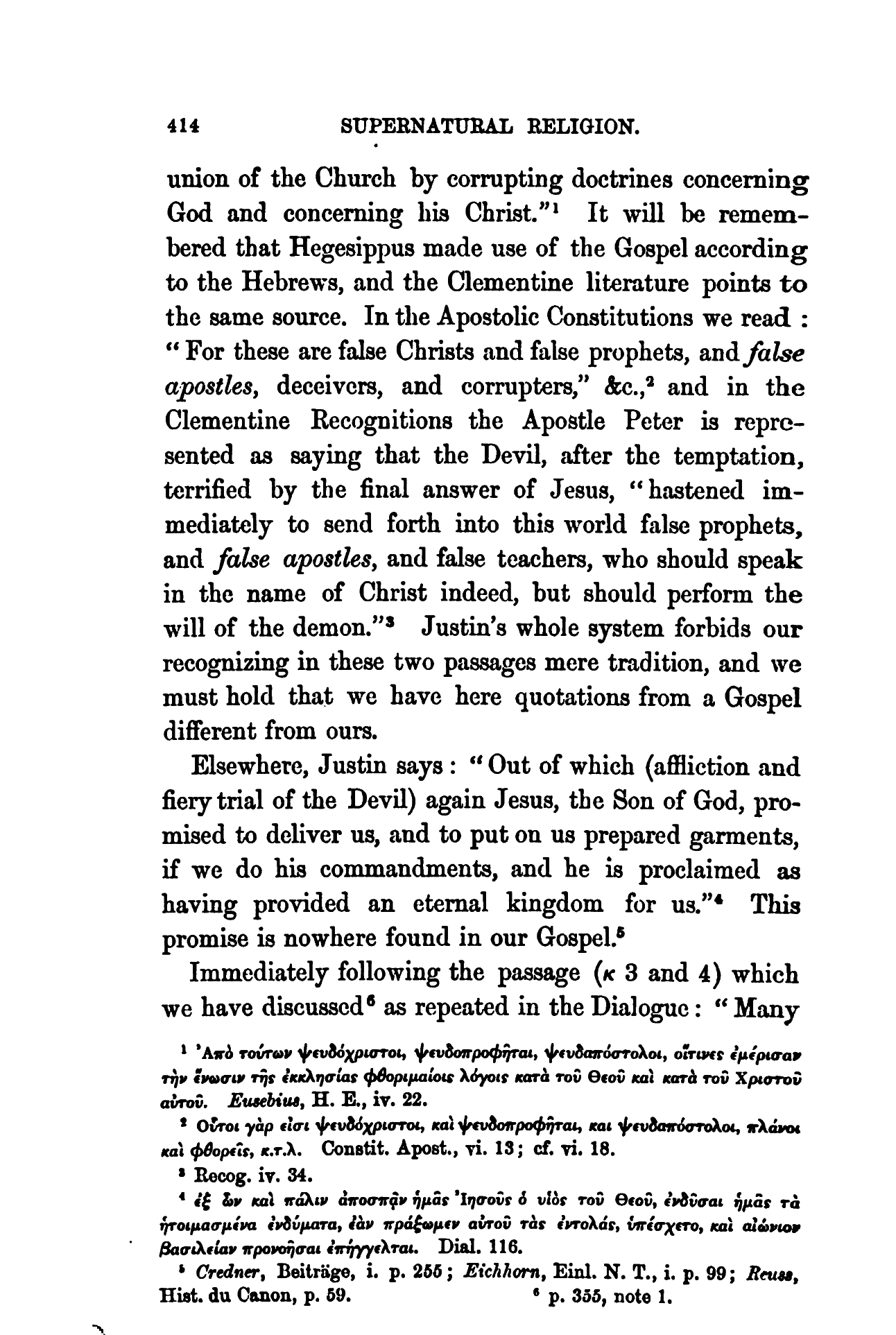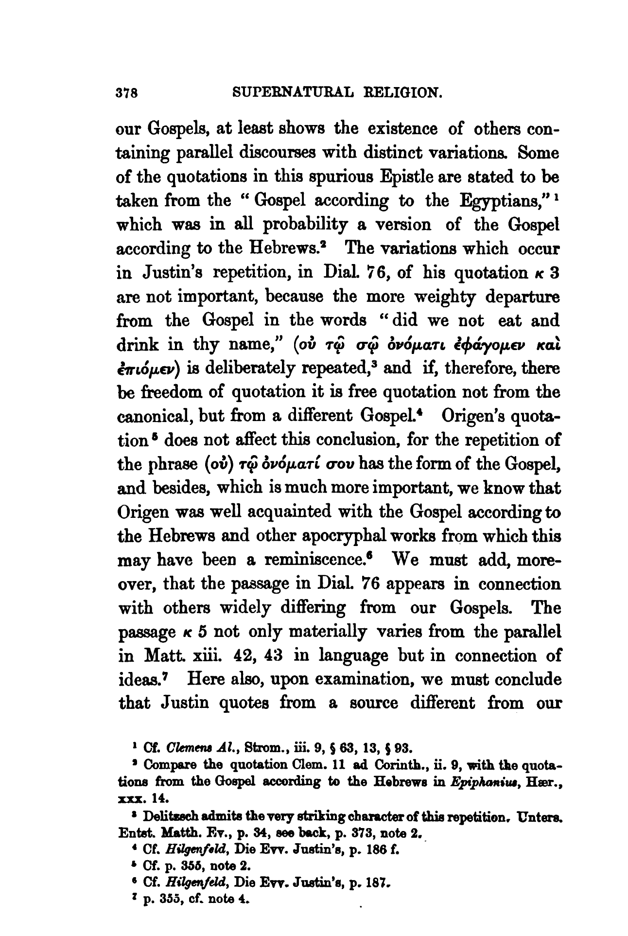 writers contained any reference to, or information about, the Gospels, nor have we any statement from any other author to that effect. The objection of Dr. Lightfoot is limited to a denial that the silence of Eusebius warrants the inference that, because he does not state that these writers made quotations from or references to undisputed canonical books, the lost works did not contain any; it does not, however, extend to interesting information regarding those books, which he admits it was the purpose of Eusebius to record. To give Dr. Lightfoot's statements, which I am examining, the fullest possible support, however, suppose that I abandon Eusebius altogether, and do not draw any inference of any kind from him beyond his positive statements, how would my case stand? Simply as complete as it well could be: Hegesippus, Papias, and Dionysius do not furnish any evidence in favour of the Gospels. The reader, therefore, will not fail to see how serious a misstatement Dr. Lightfoot has made, and how little the argument of "Supernatural Religion" would be affected even if he established much more than he has attempted to do.