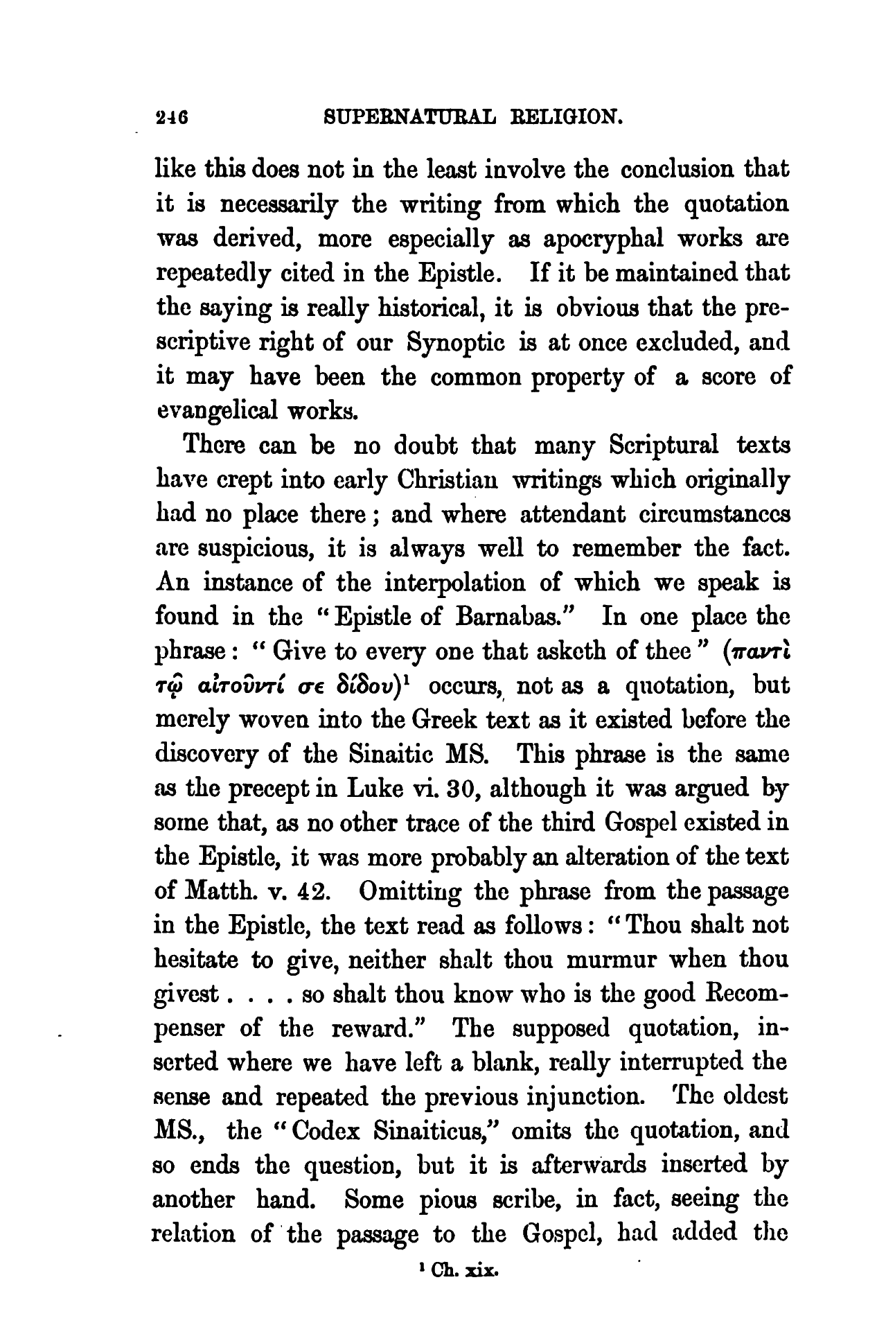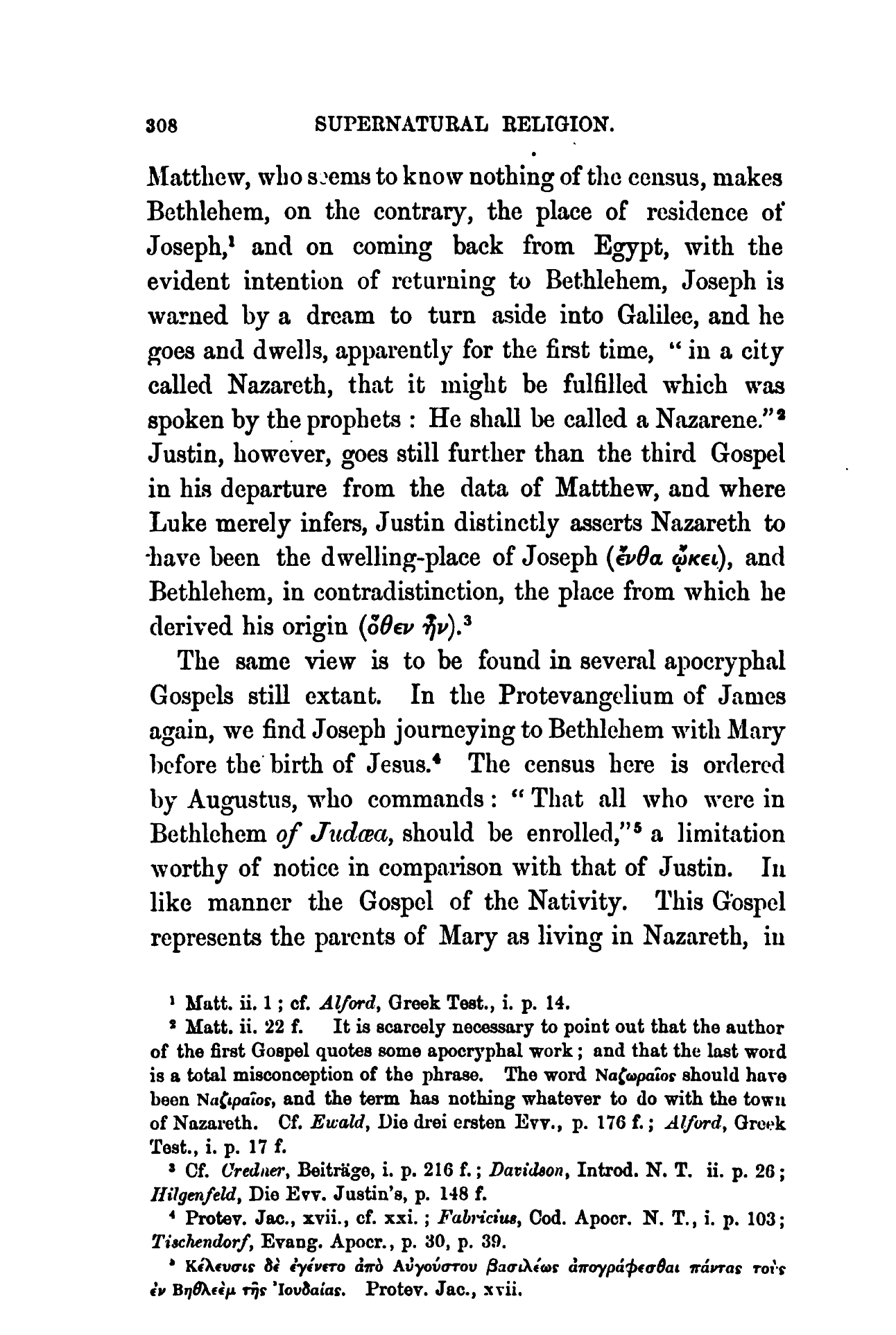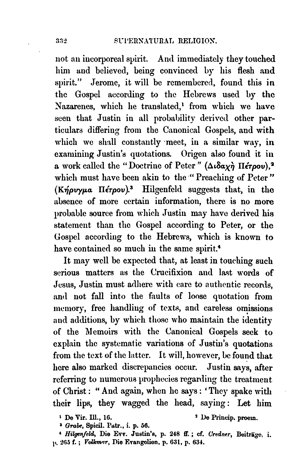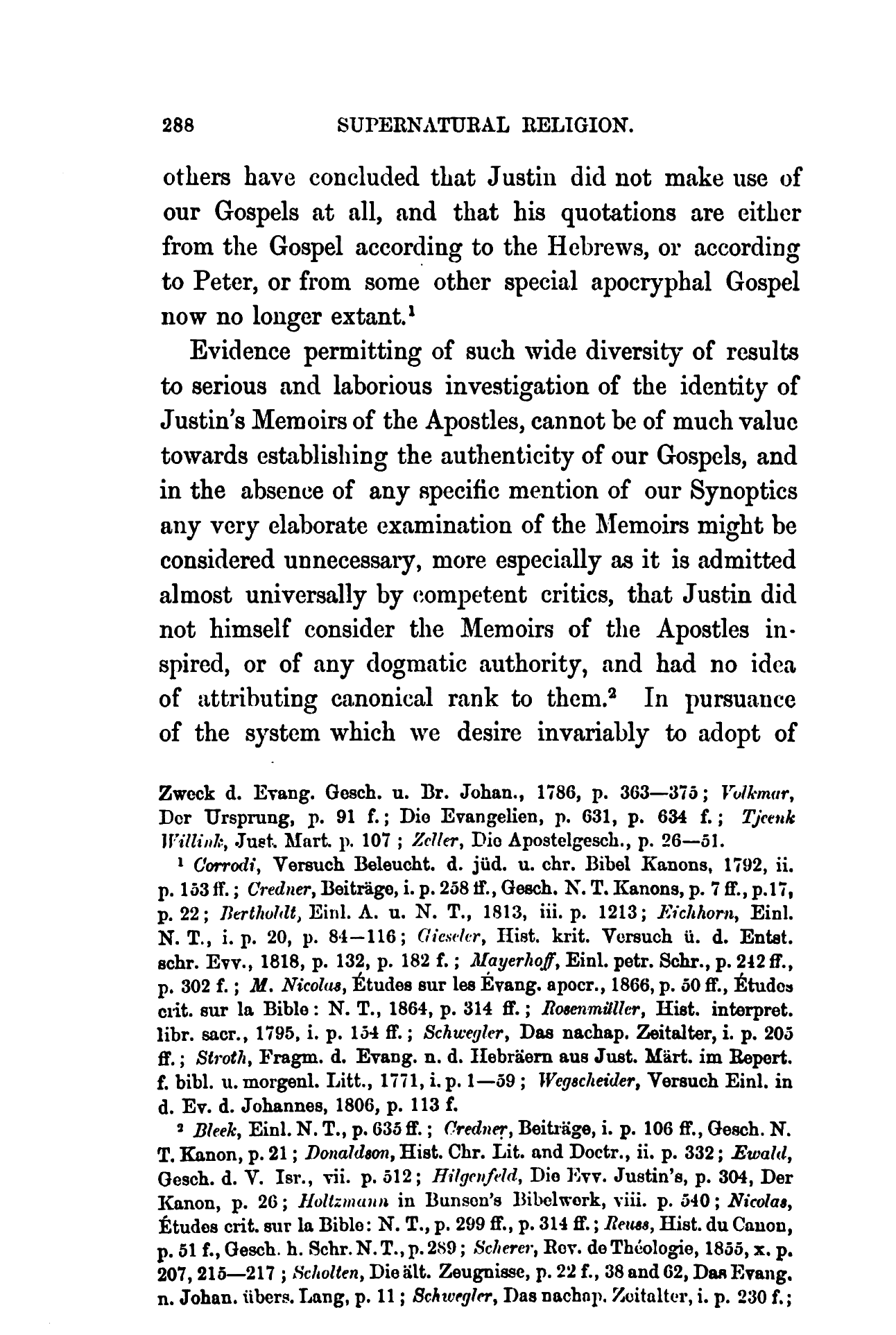 writers contained any reference to, or information about, the Gospels, nor have we any statement from any other author to that effect. The objection of Dr. Lightfoot is limited to a denial that the silence of Eusebius warrants the inference that, because he does not state that these writers made quotations from or references to undisputed canonical books, the lost works did not contain any; it does not, however, extend to interesting information regarding those books, which he admits it was the purpose of Eusebius to record. To give Dr. Lightfoot's statements, which I am examining, the fullest possible support, however, suppose that I abandon Eusebius altogether, and do not draw any inference of any kind from him beyond his positive statements, how would my case stand? Simply as complete as it well could be: Hegesippus, Papias, and Dionysius do not furnish any evidence in favour of the Gospels. The reader, therefore, will not fail to see how serious a misstatement Dr. Lightfoot has made, and how little the argument of "Supernatural Religion" would be affected even if he established much more than he has attempted to do.