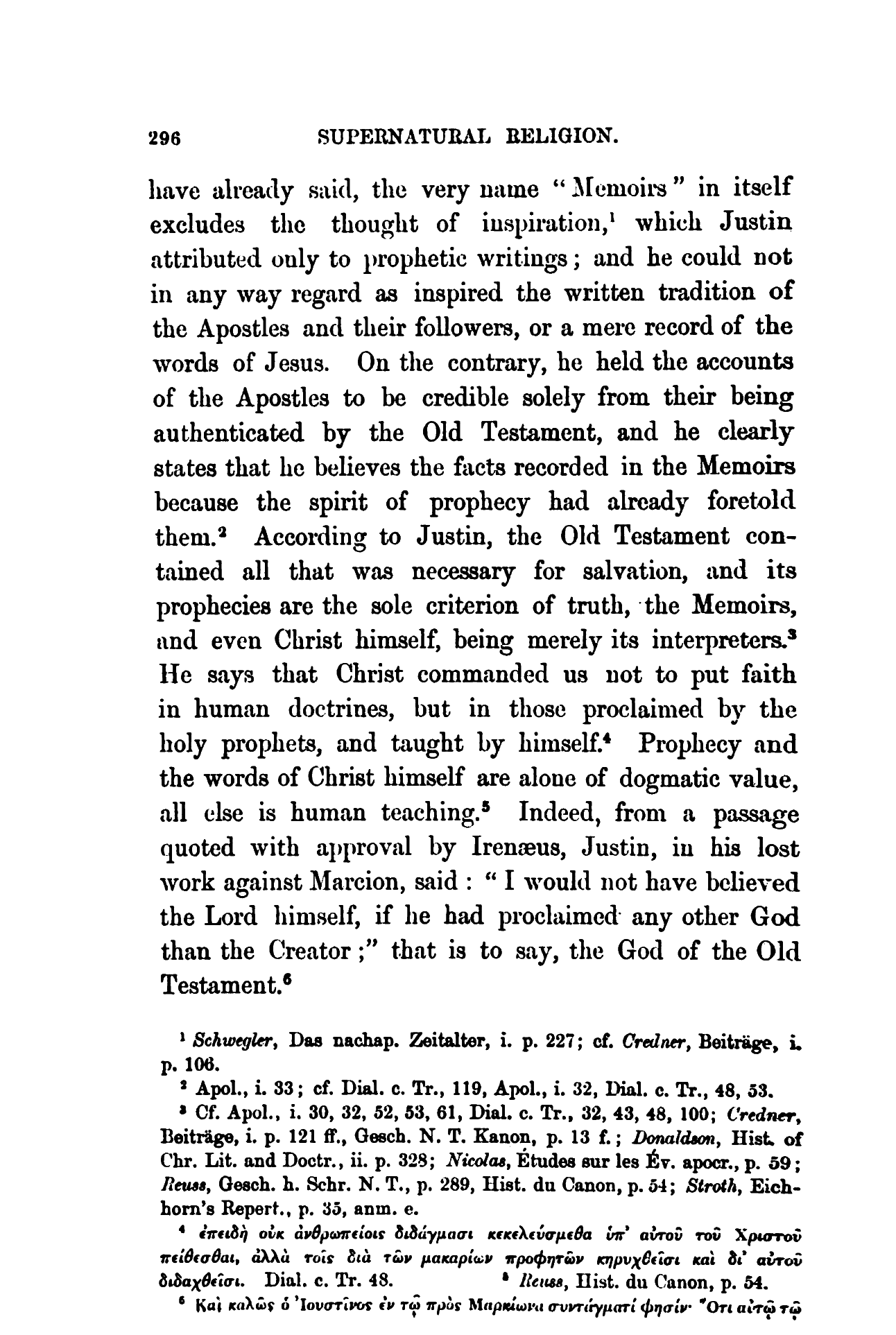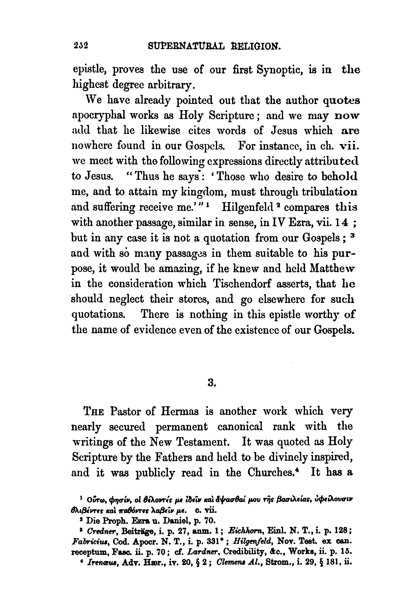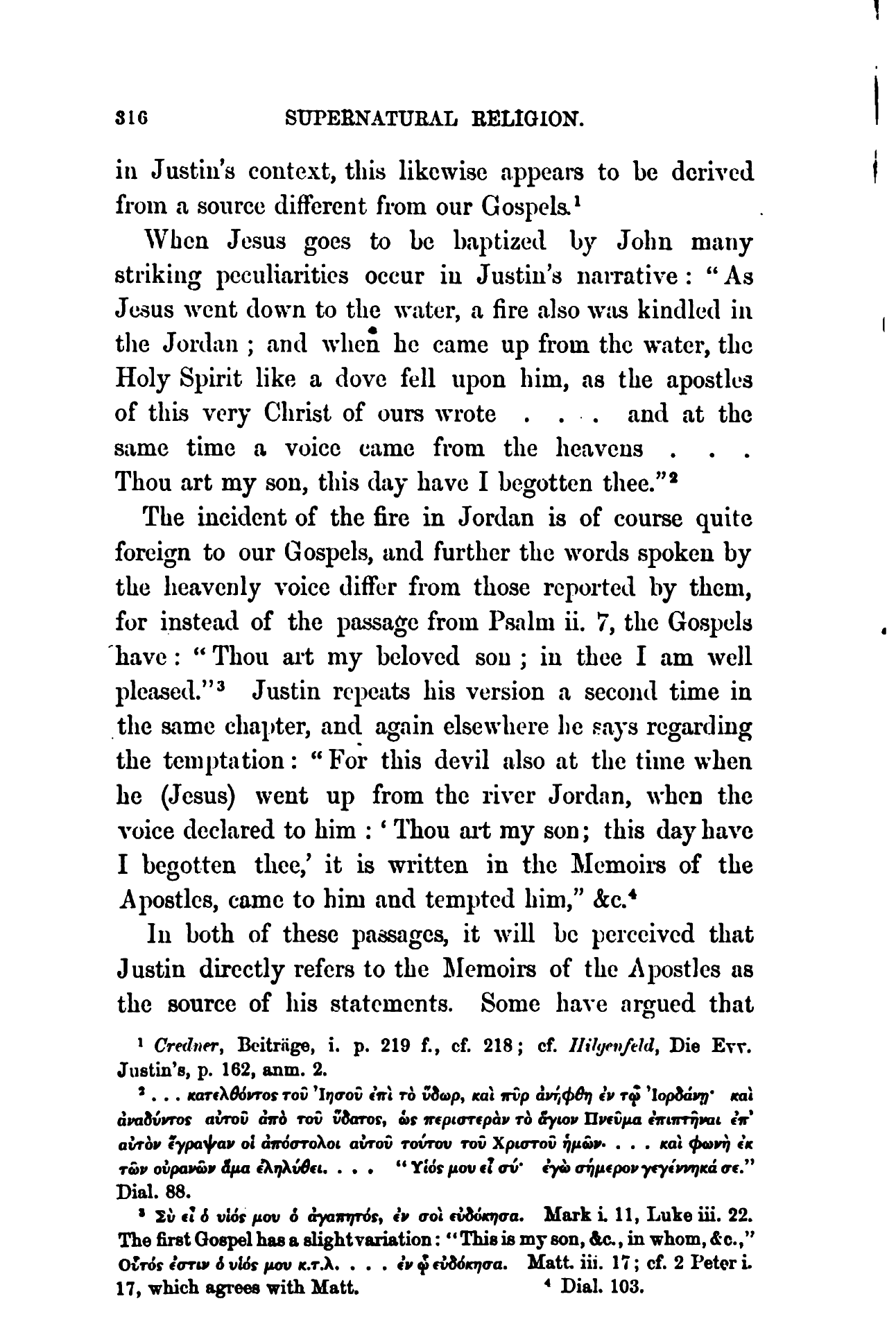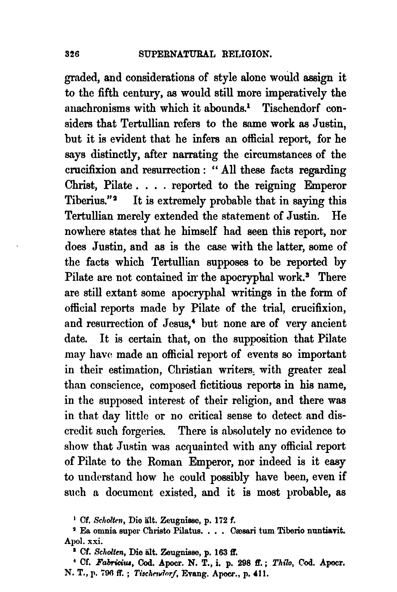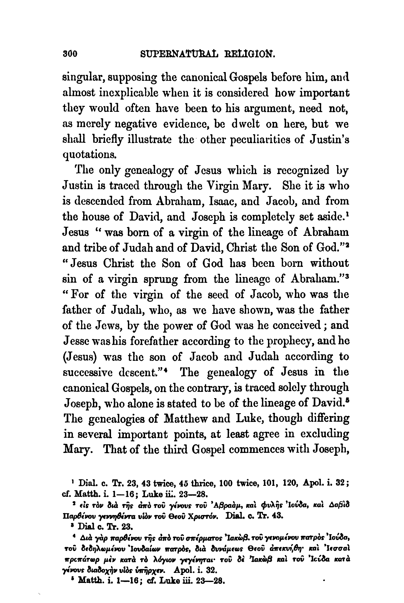 writers contained any reference to, or information about, the Gospels, nor have we any statement from any other author to that effect. The objection of Dr. Lightfoot is limited to a denial that the silence of Eusebius warrants the inference that, because he does not state that these writers made quotations from or references to undisputed canonical books, the lost works did not contain any; it does not, however, extend to interesting information regarding those books, which he admits it was the purpose of Eusebius to record. To give Dr. Lightfoot's statements, which I am examining, the fullest possible support, however, suppose that I abandon Eusebius altogether, and do not draw any inference of any kind from him beyond his positive statements, how would my case stand? Simply as complete as it well could be: Hegesippus, Papias, and Dionysius do not furnish any evidence in favour of the Gospels. The reader, therefore, will not fail to see how serious a misstatement Dr. Lightfoot has made, and how little the argument of "Supernatural Religion" would be affected even if he established much more than he has attempted to do.