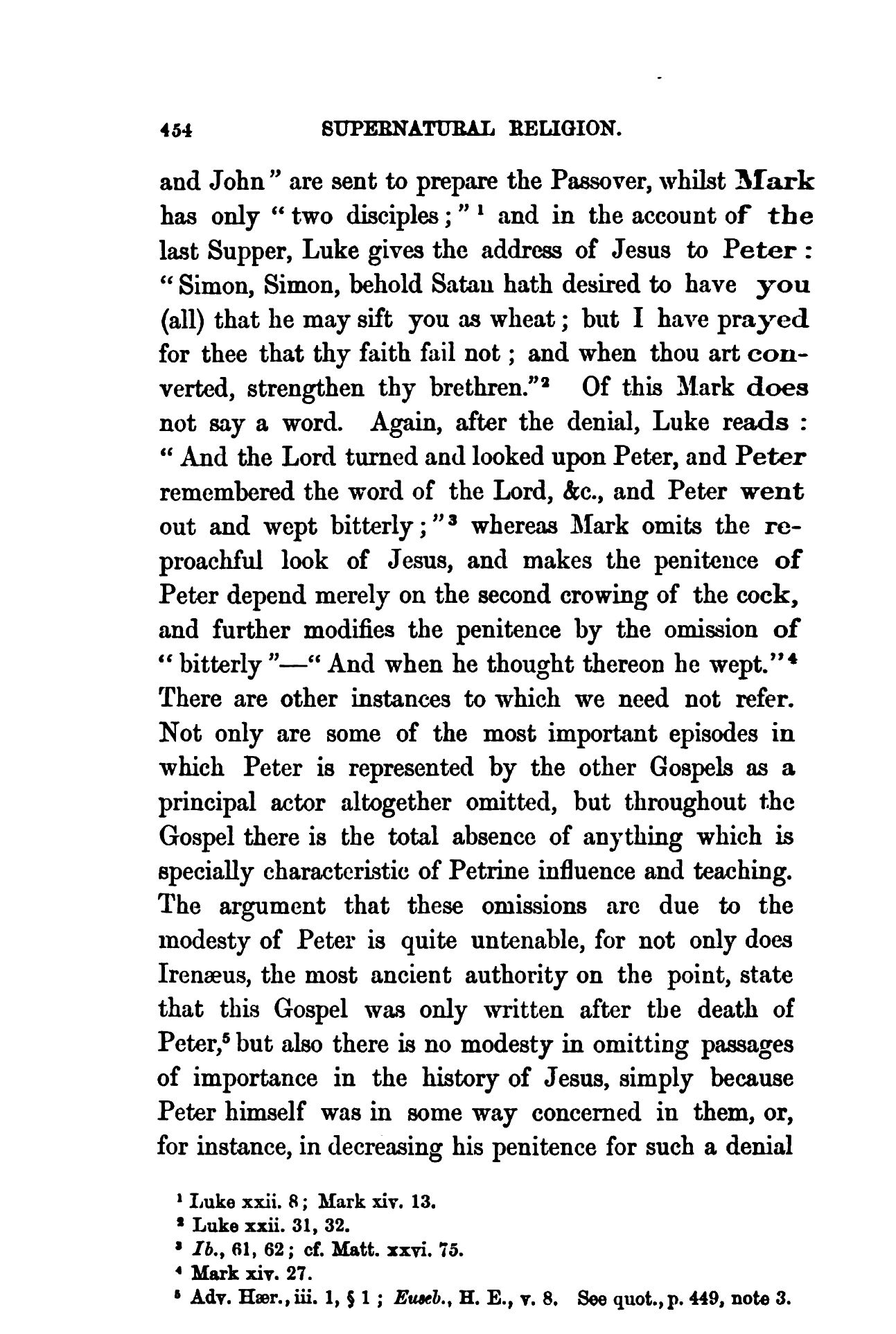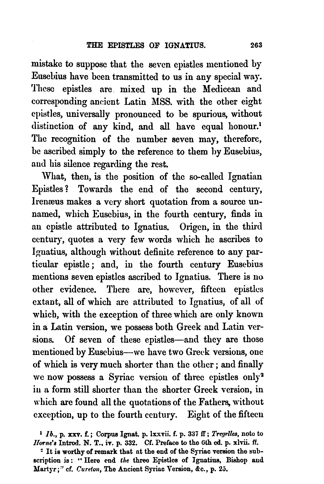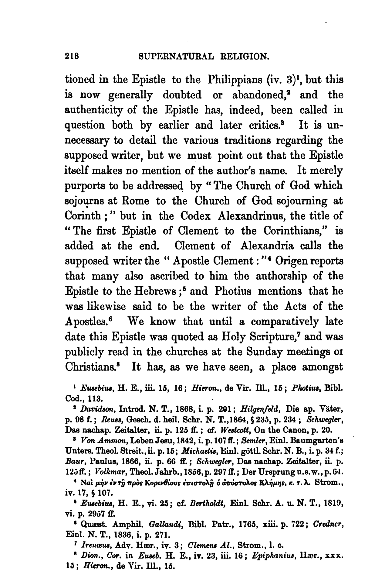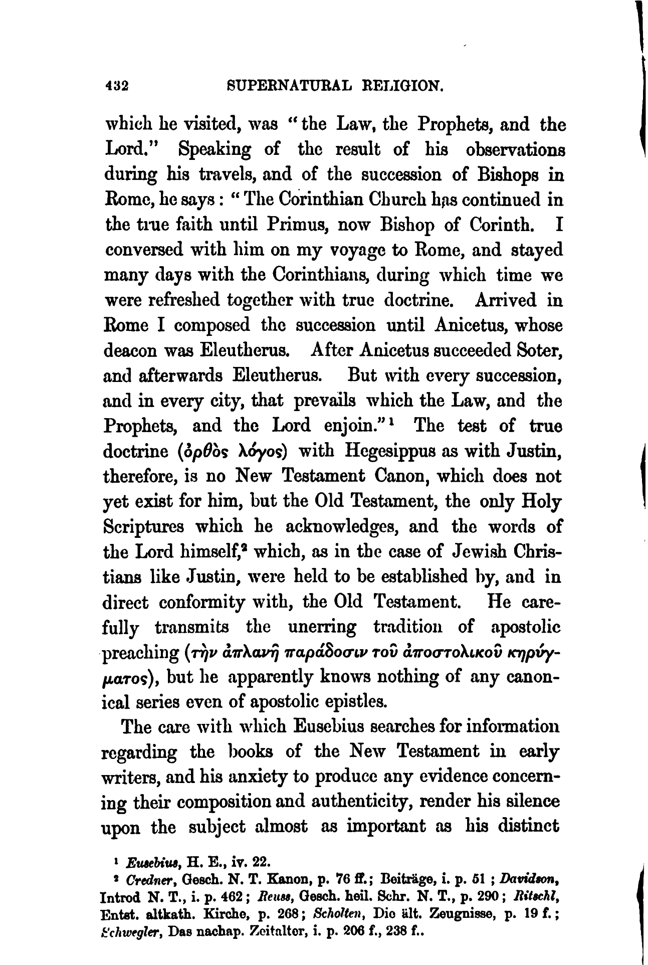 In order to dispose of the only one of these points upon which we can differ, I will first refer to the third. Did Eusebius intend to point out mere quotations of the books which he considered undisputed"? As a matter of fact, he actually did point such out in the case of the 1st Epistle of Peter and 1st Epistle of John, which he repeatedly and in the most emphatic manner declared to be undisputed.(2) This is admitted by Dr. Lightfoot. That he omitted to mention a reference to the Epistle to the Corinthians in the Epistle of Clement of Rome, or the reference by Theophilus to the Gospel of John, and other supposed quotations, might be set down as much to oversight as intention. On the other hand, that he did mention disputed books is evidence only that he not only pledged himself to do so, but actually fulfilled his promise. Although much might be said upon this point, therefore, I consider it of so little importance that I do not intend to waste time in minutely discussing it. If my assertions with regard to the silence of Eusebius likewise include the supposition that he proposed to mention mere quotations of the "undisputed" books, they are so far from limited to this very subsidiary testimony that I