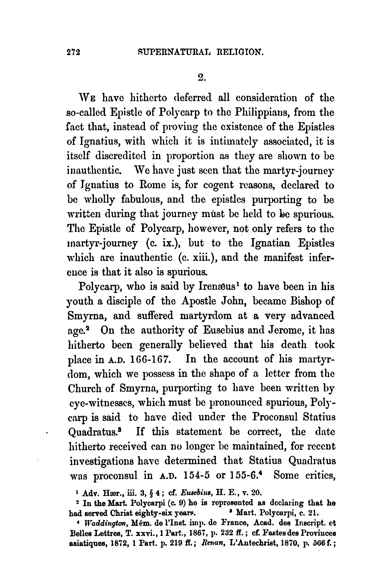 The last of these general objections to which I need now refer is the statement, that the difficulty with regard to the Gospels commences precisely where my examination ends, and that I am bound to explain how, if no trace of their existence is previously discoverable, the four Gospels are suddenly found in general circulation at the end of the second century, and quoted as authoritative documents by such writers as Irenæus. My reply is that it is totally unnecessary for me to account for this. No one acquainted with the history of pseudonymic literature in the second century, and with the rapid circulation and ready acceptance of spurious works tending to edification, could for a moment regard the canonical position of any Gospel at the end of that century either as evidence of its authenticity or early origin. That which concerns us chiefly is not evidence regarding the end of the second but the beginning of the first century. Even if we took the statements of Irenæus, and later Fathers like the Alexandrian Clement, Tertullian,