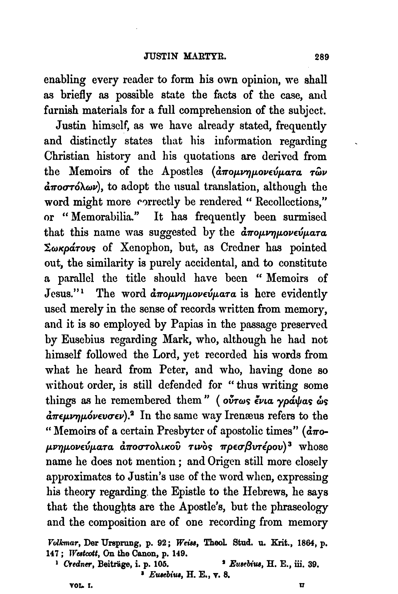 Before proceeding to speak more directly of the three writers under discussion, it may be well to glance a little at the procedure of Eusebius, and note, for those who care to go more closely into the matter, how he fulfils his promise to record what the Fathers have to tell about the Gospels. I may mention, in the first place, that Eusebius states what he himself knows of the composition of the Gospels and other canonical works.(1) Upon two occasions he quotes the account which Clement of Alexandria gives of the composition of Mark's Gospel, and also cites his statements regarding the other Gospels.(2) In like manner he records the information, such as it is, which Irenæus has to impart about the four Gospels and other works,(3) and what Origen has to say concerning them.(4) Interrogating extant works, we find in fact that Eusebius does not neglect to quote anything useful or interesting regarding these books from early writers. Dr. Lightfoot says that Eusebius "restricts himself to the narrowest limits which justice to his subject will allow," and he illustrates this by the case of Irenæus. He says: "Though he (Eusebius) gives the principal passage in this author relating to the Four Gospels (Irenæus, Ady. ILer. iii. 1, 1) he omits to mention others which contain interesting statements directly or indirectly affecting the question, e.g. that St. John wrote his Gospel to counteract the errors of Cerinthus and the Nicolaitans (Irenæus, Adv. Hær. iii. 11, 1)." I must explain, however, that the "interesting statement" omitted, which is not in the context of the part quoted, is not advanced as information derived from any authority, but only in the course of argument, and there is nothing to distinguish it from mere personal opinion, so that on this ground Eusebius may well have passed it over. Dr. Lightfoot farther says: "Thus too when he quotes a few lines alluding to the unanimous tradition of the Asiatic Elders who were acquainted with St. John,(6) he omits the context, from which we find that this tradition had an important bearing on the authenticity of the fourth Gospel, for it declared that Christ's ministry extended much beyond a single year, thus confirming the obvious chronology of the Fourth Gospel against the apparent chronology of the Synoptists."(7) Nothing, however, could be further from the desire or intention of Eusebius than to represent any discordance between the Gospels, or to support the one at the expense of the others. On the contrary, he enters into an elaborate explanation in order to show that there is no discrepancy between them, affirming, and supporting his view by singular quotations, that it was evidently the intention of the three Synoptists only to write the doings of the Lord for one year after