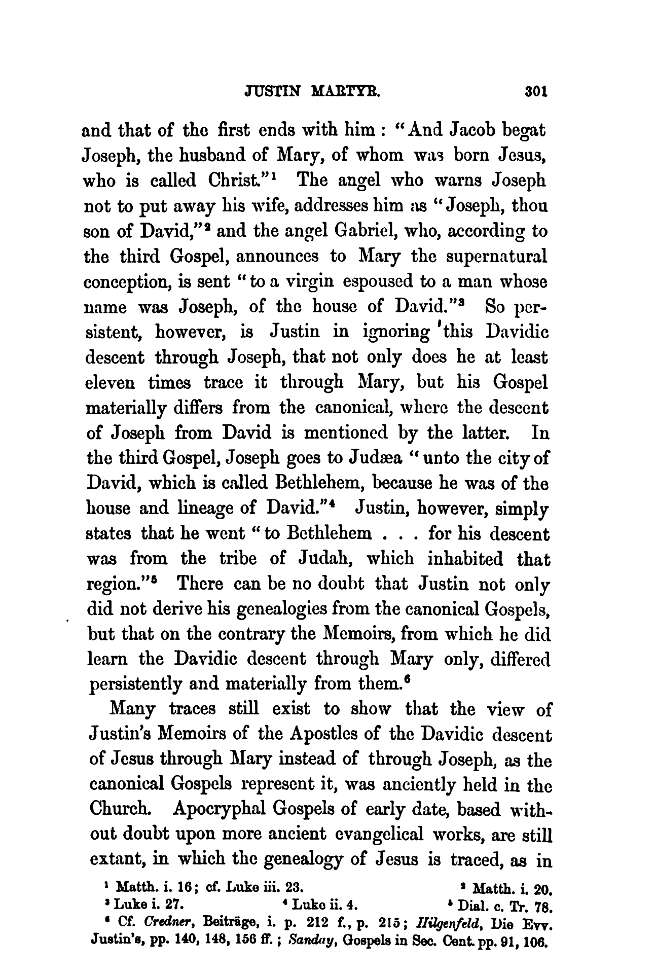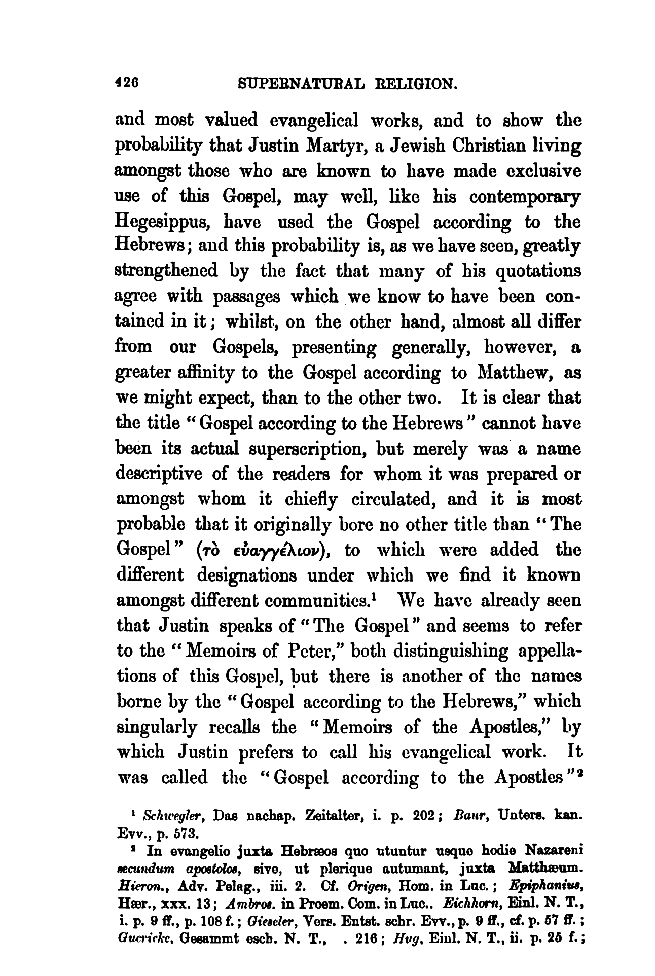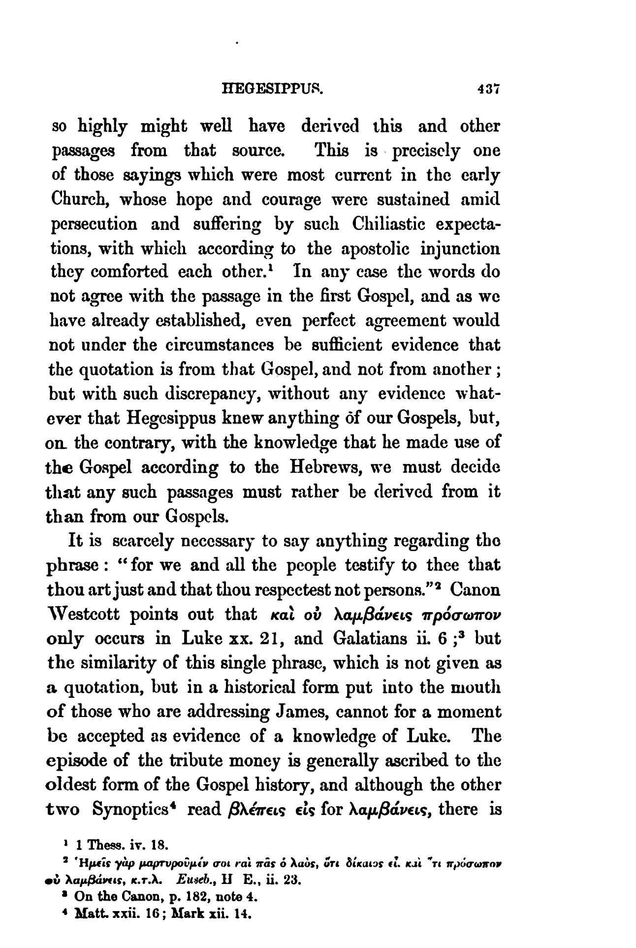 The point on which the argument turns is this: After examining the whole of the extant writings of the early Fathers, and finding them a complete blank as regards the canonical Gospels, if, by their use of apocryphal works and other indications they are not evidence against them, I supplement this, in the case of Hegesippus,