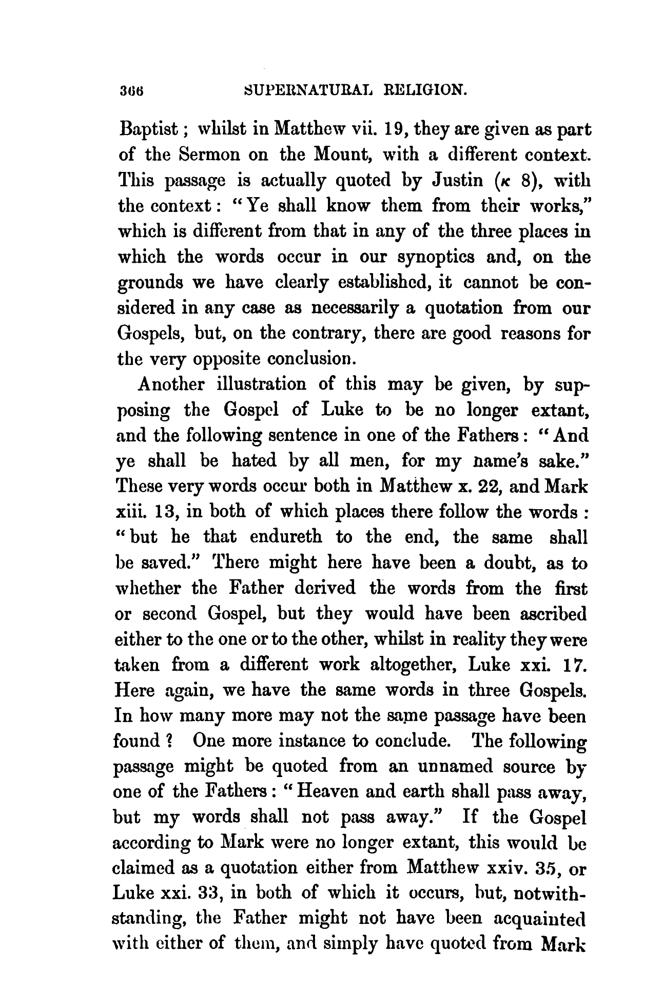 should have no reluctance in waiving it altogether. Even if the most distinct quotations of this kind had occurred in the lost works of the three writers in question, they could have proved nothing beyond the mere existence of the book quoted, at the time that work was written, but would have done nothing to establish its authenticity and trustworthiness. In the evidential destitution of the Gospels, apologists would thankfully have received even such vague indications, indeed there is scarcely any other evidence, but something much more definite is required to establish the reality of miracles and Divine Revelation. If this point be, for the sake of argument, set aside, what is the position? We are not entitled to infer that there were no quotations from the Gospels in the works of Hegesippus, Papias, and Dionysius of Corinth, because Eusebius does not record them; but, on the other hand, we are still less entitled to infer that there were any.