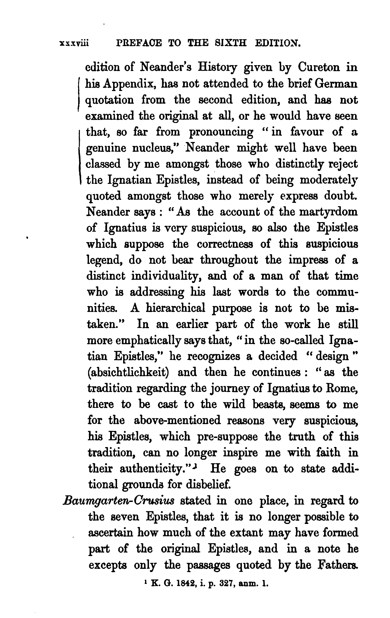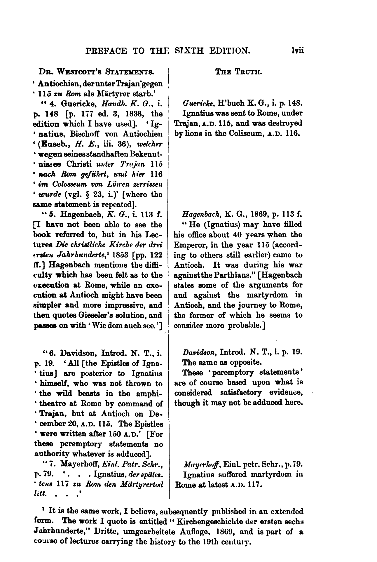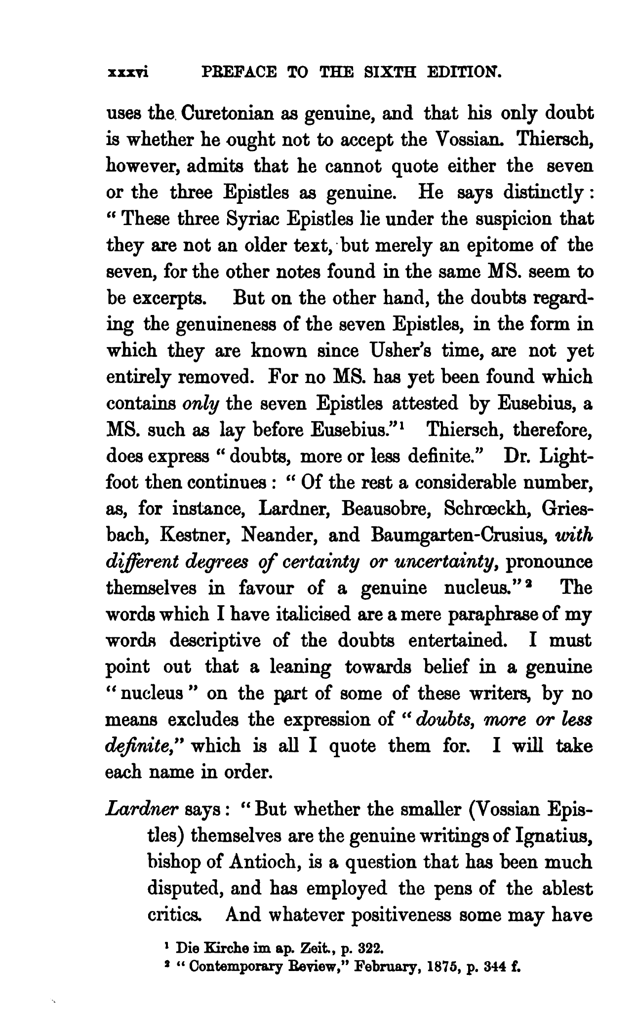 Professor Lightfoot next makes a vehement attack upon me in connection with "The Ignatian Epistles,"(1) which is equally abortive and limited to details. I do not intend to complain of the spirit in which the article is written, nor of its unfairness. On the whole I think that readers may safely be left to judge of the tone in which a controversy is carried on. Unfortunately, however, the perpetual accusation of mis-statement brought against me in this article, and based upon minute criticism into which few care to follow, is apt to leave the impression that it is well-founded, for there is the very natural feeling in most right minds that no one would recklessly scatter such insinuations. It is this which alone makes such an attack dangerous. Now in a work like this, dealing with so many details, it must be obvious that it is not possible altogether to escape errors. A critic or opponent is of course entitled to point these out, although, if he be high-minded or even alive to his own interests, I scarcely think that he will do so in a spirit of unfair detraction. But in doing this a writer is bound to be accurate, for if he be liberal of such accusations