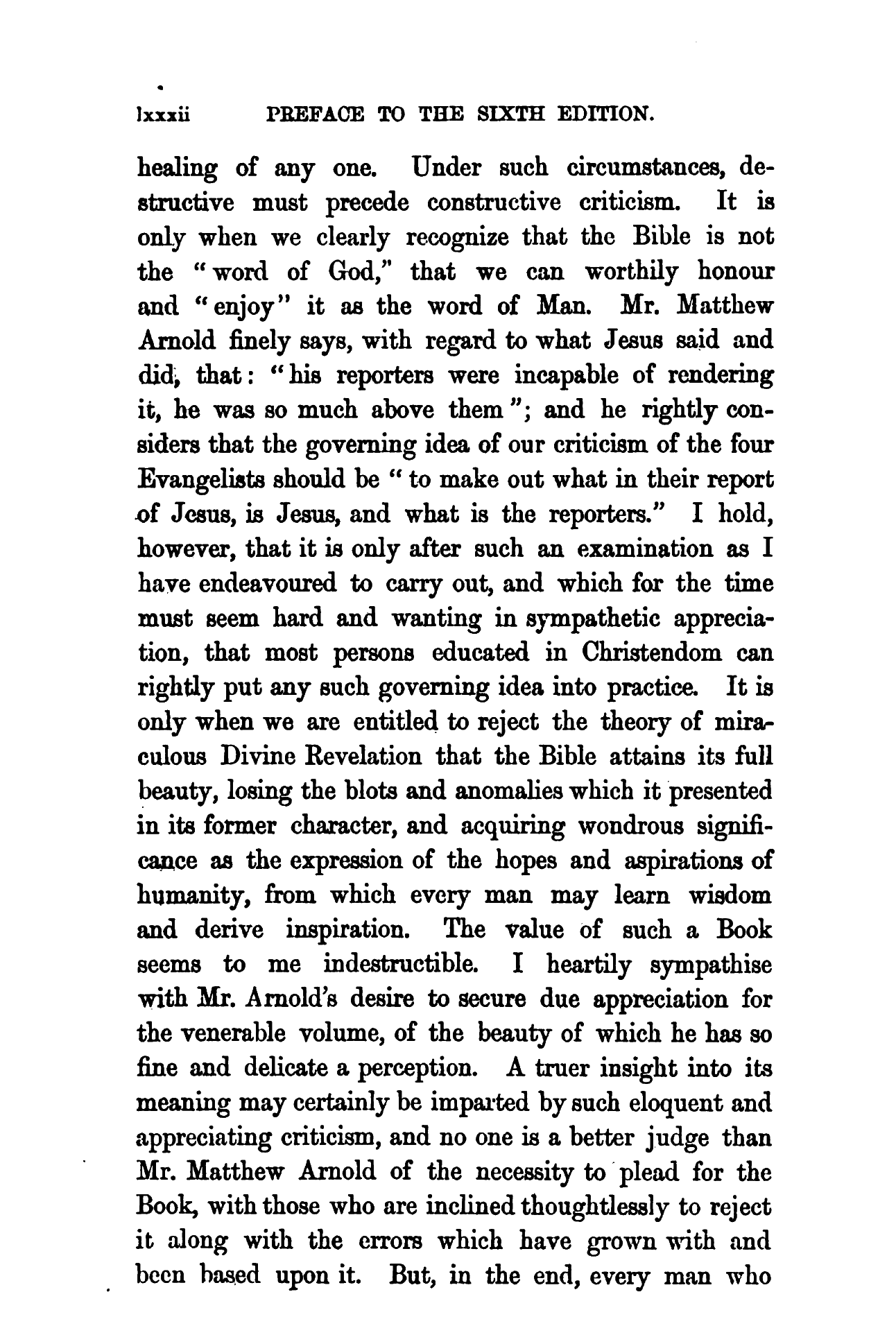 In one instance only has any alteration been requisite which demands special mention here. Since the sixth edition was published, I have been convinced that Marcion's Gospel was based upon our third Synoptic, and I have accordingly so far modified my results. It may not be unnecessary, however, plainly to repeat that, with this exception, which is not of material consequence, my convictions not only remain fundamentally unchanged, but have been confirmed and strengthened both by thorough reconsideration of my own argument, and by careful attention to the replies made by able official apologists. As regards the philosophical and other objections