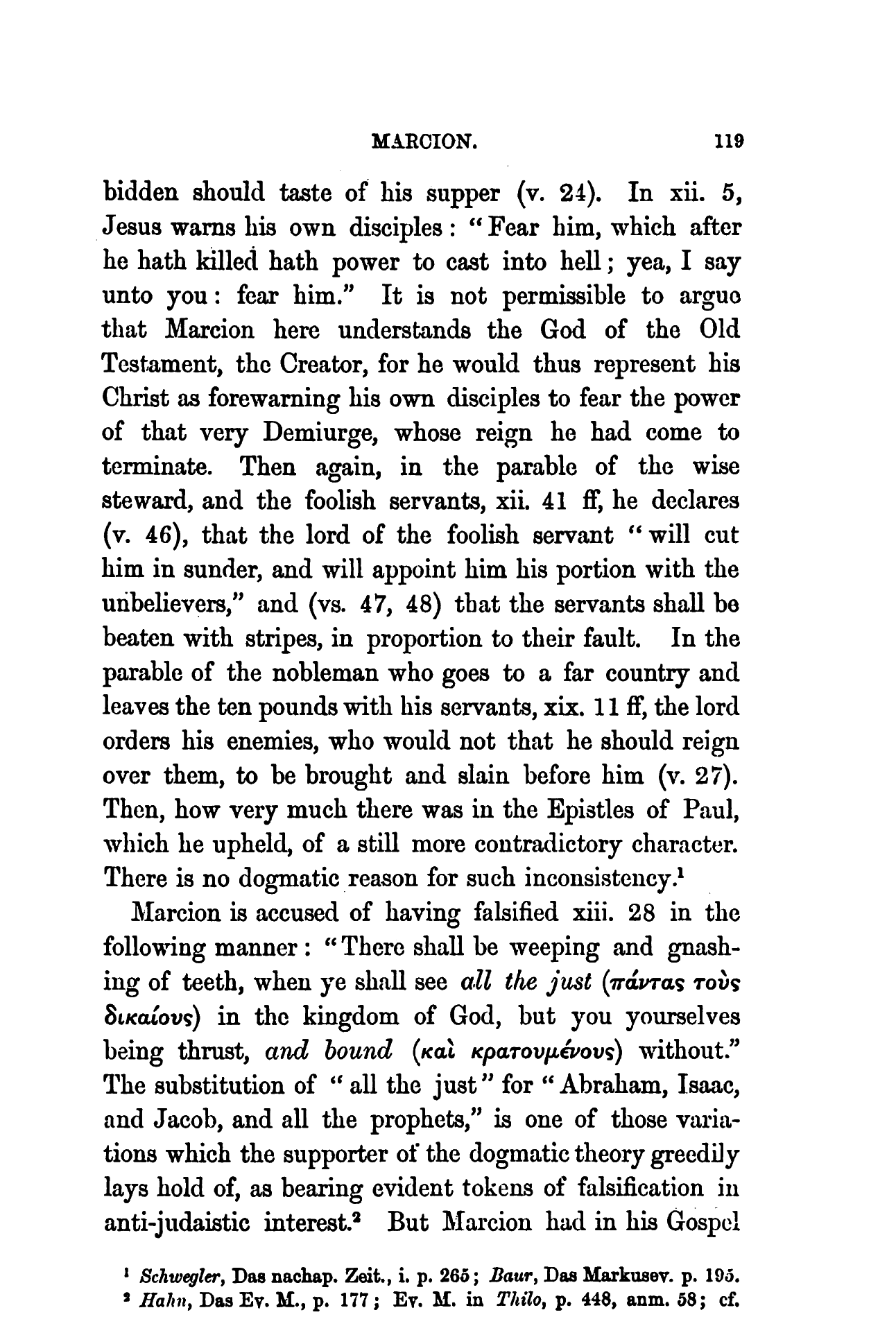 merely point out: "Begone into the darkness without, which the Father hath prepared for the devil and his angels."(1) The quotation in Justin (Dial. 76) agrees exactly with this, with the exception that Justin has [———] instead of [———], which is not important, whilst the agreement in the marked variation from the parallel in the first Gospel establishes the probability of a common source different from ours.(2)