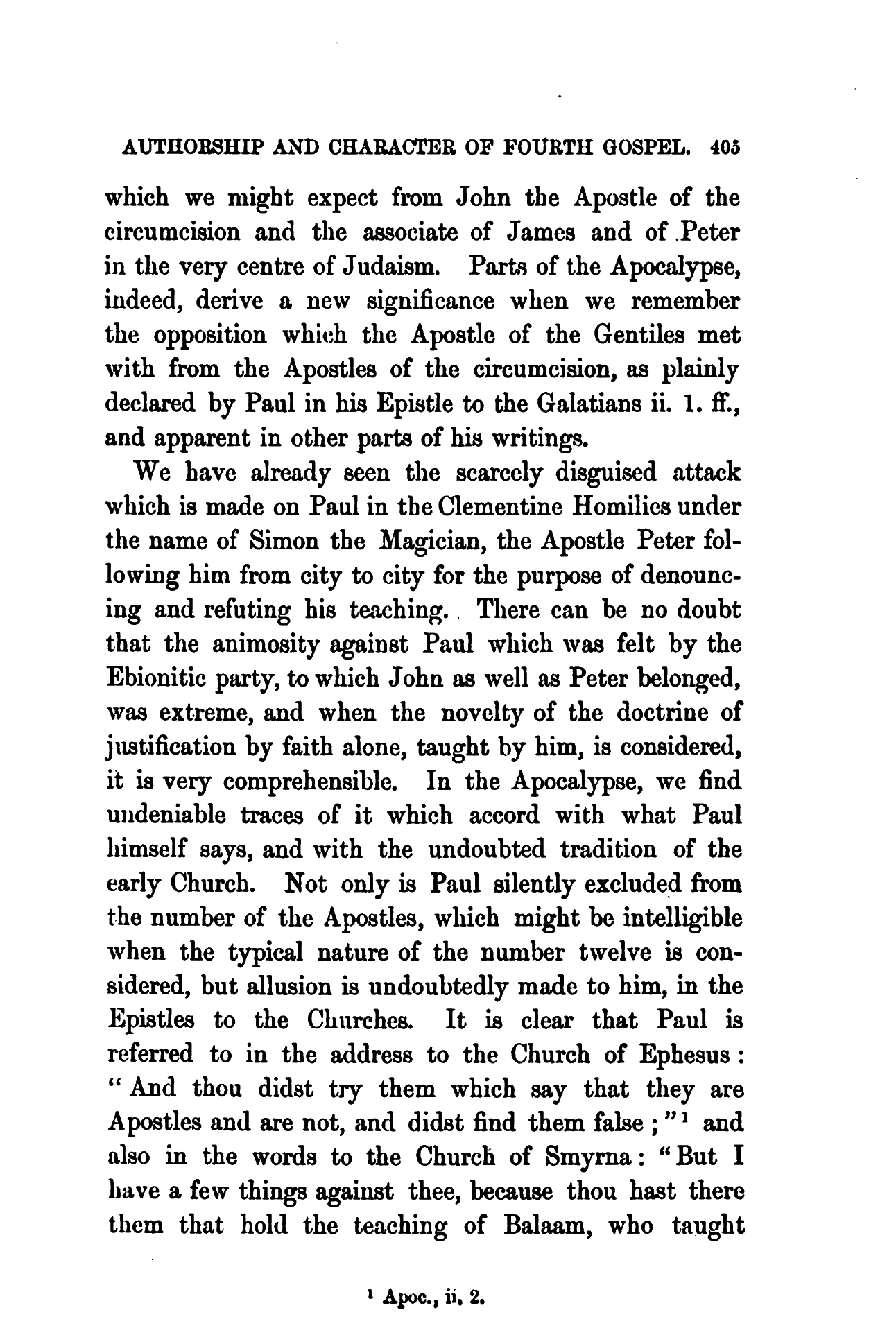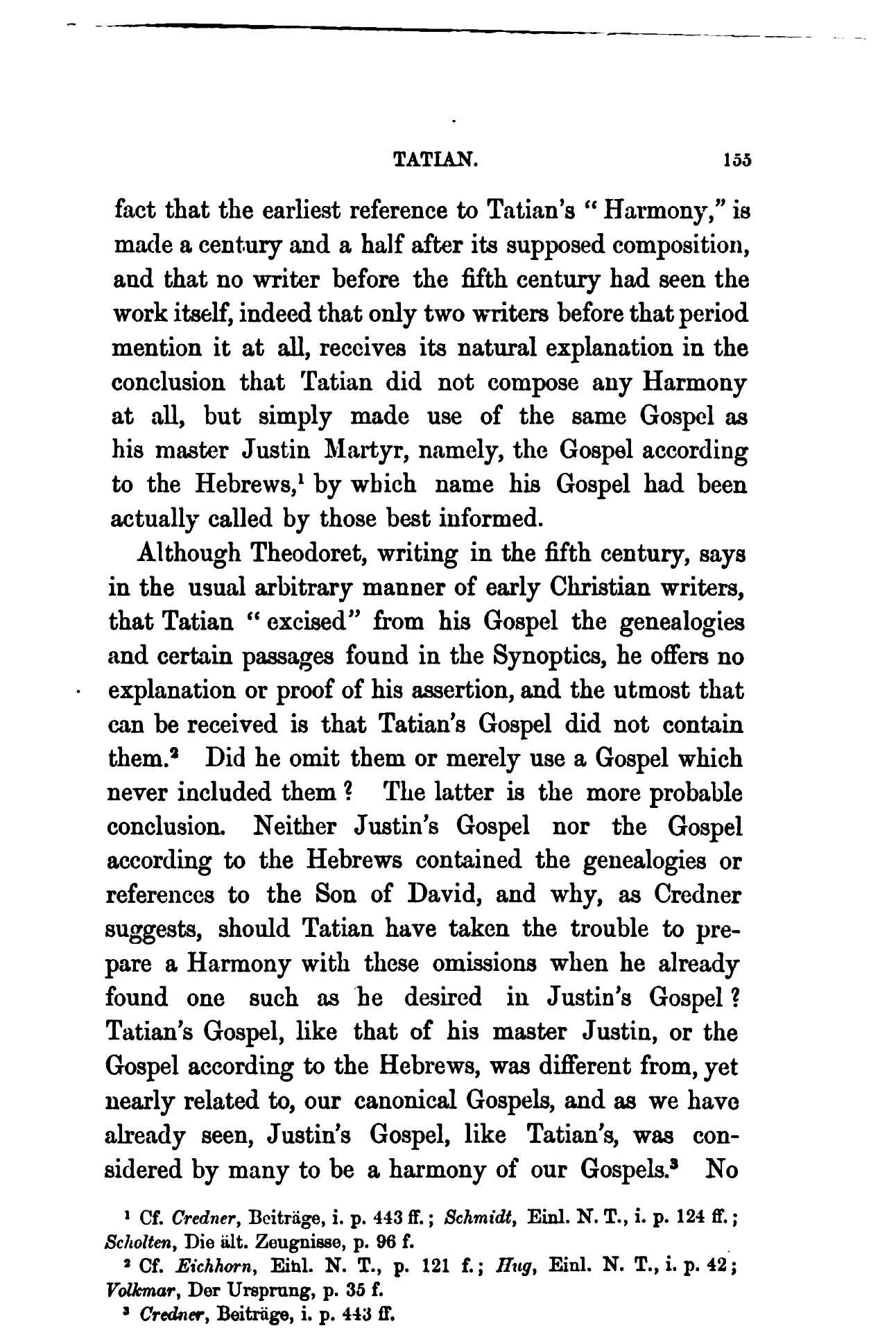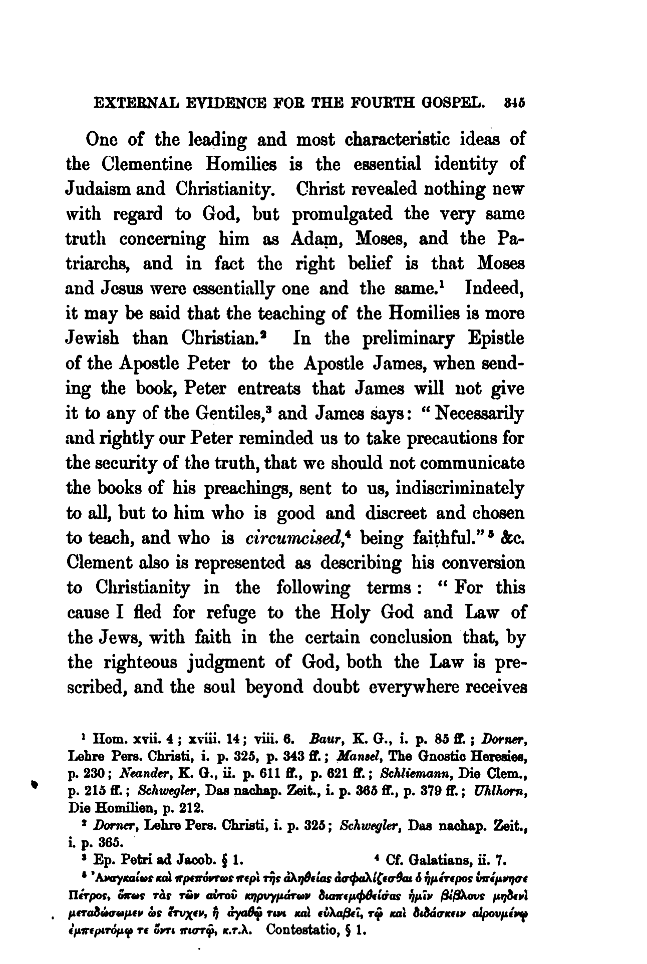 been written by the person whose name it bears. There is in fact nothing but internal evidence by which to fix the date, and that internal evidence is of a character which admits of very wide extension down the course of time, although a sharp limit is set beyond which it cannot mount upwards. Of external evidence there is almost none, and what little exists does not warrant an early date. Origen, it is true, mentions [———],(1) which, it is conjectured, may either be the same work as the [———], or Recognitions, translated by Rufinus, or related to it, and Epiphanius and others refer to [———];(2) but our Clementine Homilies are not mentioned by any writer before pseudo-Athanasius.(3) The work, therefore, can at the best afford no substantial testimony to the antiquity and apostolic origin of our Gospels. Hilgenfeld, following in the steps of Baur, arrives at the conclusion that the Homilies are directed against the Gnosticism of Marcion (and also, as we shall hereafter see, against the Apostle Paul), and he, therefore, necessarily assigns to them a date subsequent to a.d. 160. As Reuss, however, inquires: upon this ground, why should a still later date not be named, since even Tertullian wrote vehemently against the same Gnosis.(4) There can be little doubt that the author was a representative of Ebionitic Gnosticism, which had once been the purest form of primitive Christianity, but later, through its own development, though still more through the rapid growth around it of Paulinian doctrine, had