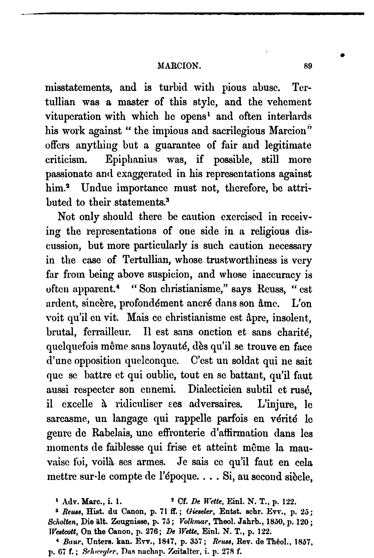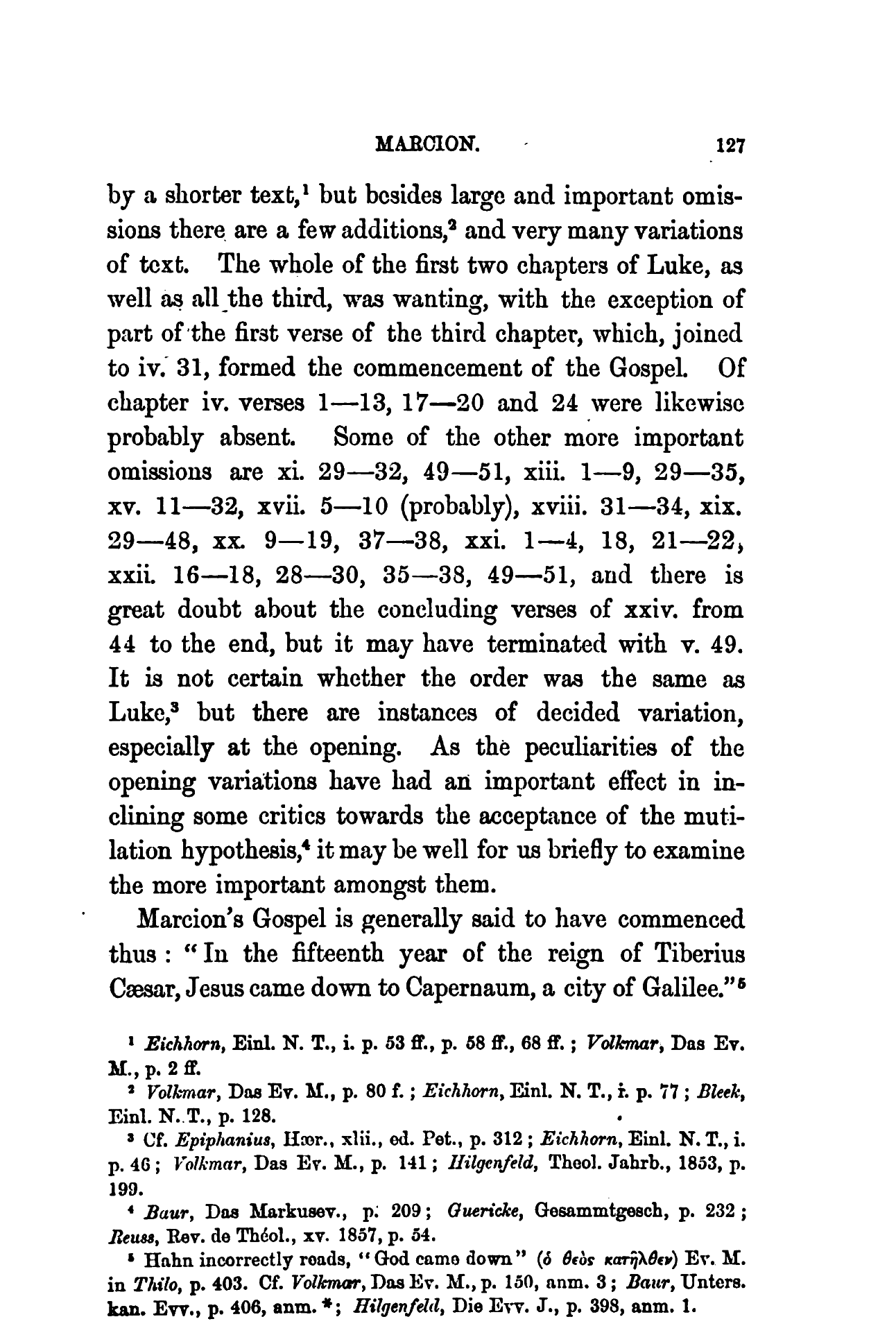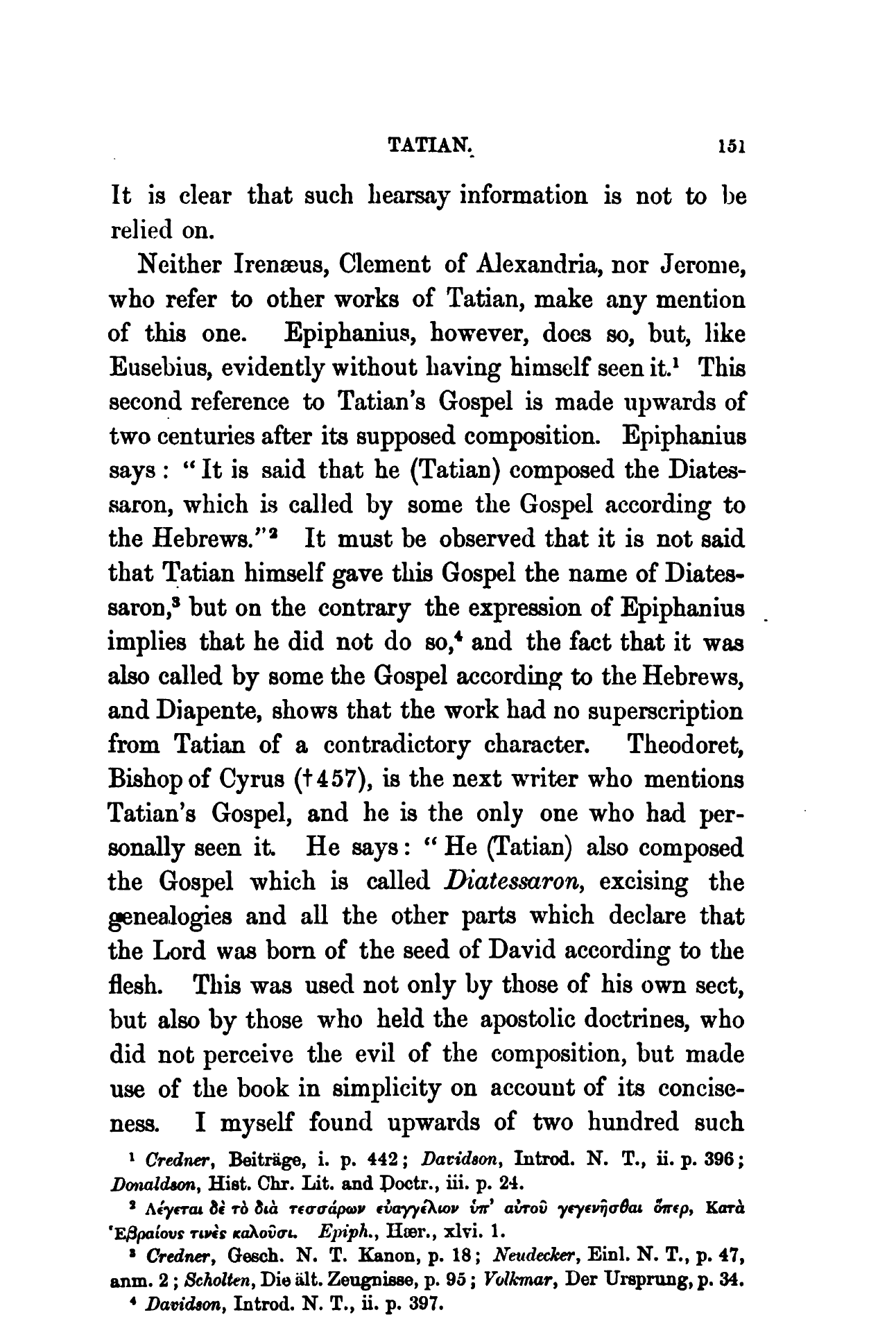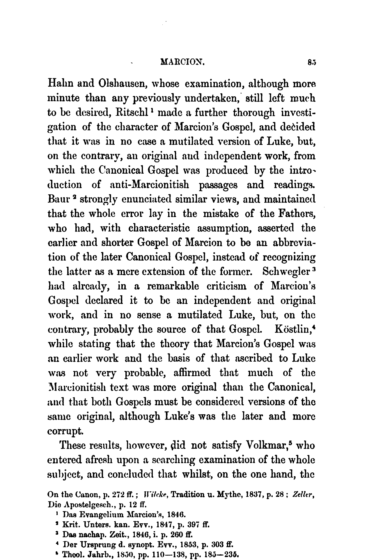 been written by the person whose name it bears. There is in fact nothing but internal evidence by which to fix the date, and that internal evidence is of a character which admits of very wide extension down the course of time, although a sharp limit is set beyond which it cannot mount upwards. Of external evidence there is almost none, and what little exists does not warrant an early date. Origen, it is true, mentions [———],(1) which, it is conjectured, may either be the same work as the [———], or Recognitions, translated by Rufinus, or related to it, and Epiphanius and others refer to [———];(2) but our Clementine Homilies are not mentioned by any writer before pseudo-Athanasius.(3) The work, therefore, can at the best afford no substantial testimony to the antiquity and apostolic origin of our Gospels. Hilgenfeld, following in the steps of Baur, arrives at the conclusion that the Homilies are directed against the Gnosticism of Marcion (and also, as we shall hereafter see, against the Apostle Paul), and he, therefore, necessarily assigns to them a date subsequent to a.d. 160. As Reuss, however, inquires: upon this ground, why should a still later date not be named, since even Tertullian wrote vehemently against the same Gnosis.(4) There can be little doubt that the author was a representative of Ebionitic Gnosticism, which had once been the purest form of primitive Christianity, but later, through its own development, though still more through the rapid growth around it of Paulinian doctrine, had
