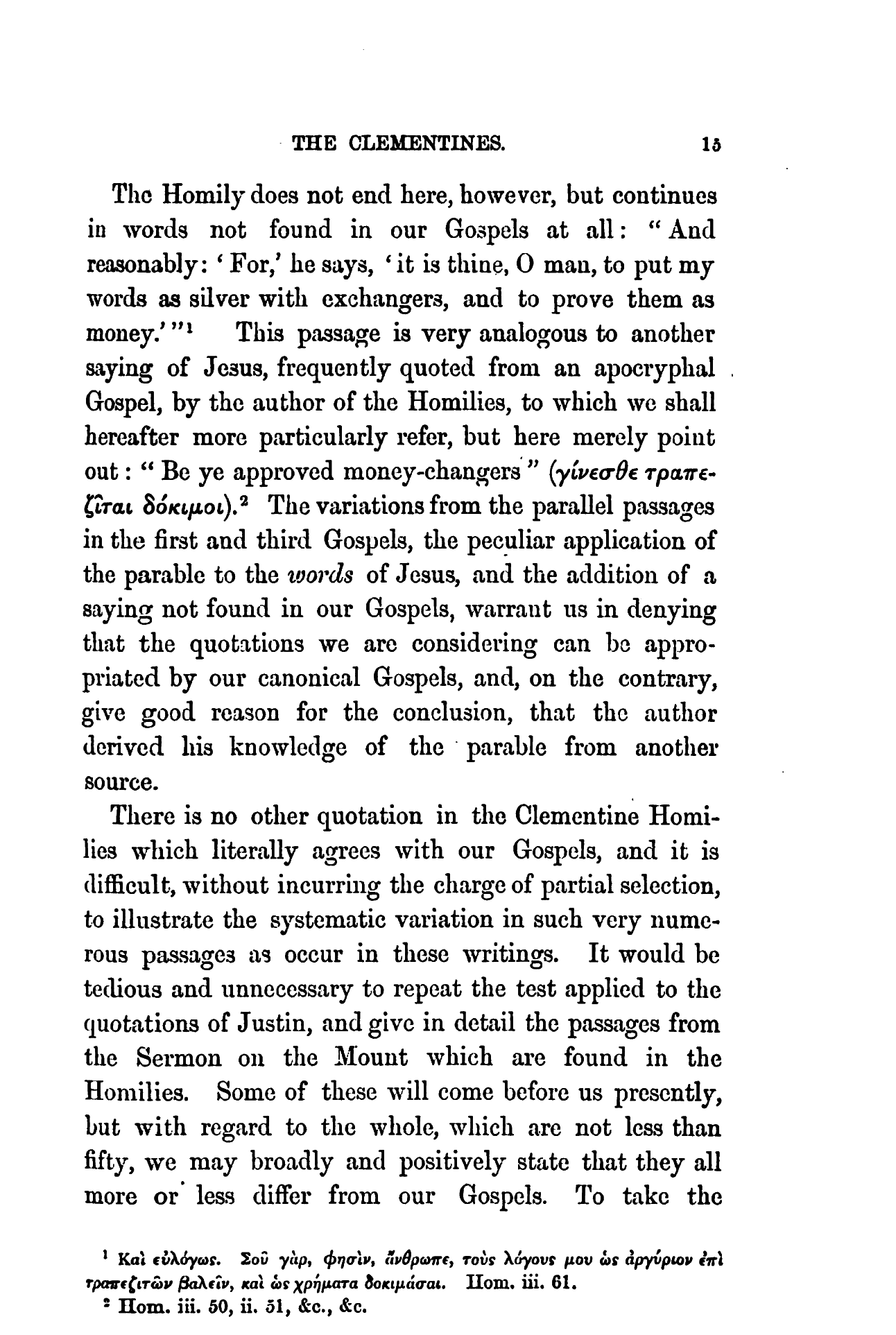 The Homily does not end here, however, but continues in words not found in our Gospels at all: "And reasonably: 'For,' he says, 'it is thine, O man, to put my words as silver with exchangers, and to prove them as money/"(1) This passage is very analogous to another saying of Jesus, frequently quoted from an apocryphal Gospel, by the author of the Homilies, to which we shall hereafter more particularly refer, but here merely point out: "Be ye approved money-changers" [———].(2) The variations from the parallel passages in the first and third Gospels, the peculiar application of the parable to the words of Jesus, and the addition of a saying not found in our Gospels, warrant us in denying that the quotations we are considering can be appropriated by our canonical Gospels, and, on the contrary, give good reason for the conclusion, that the author derived his knowledge of the parable from another source.