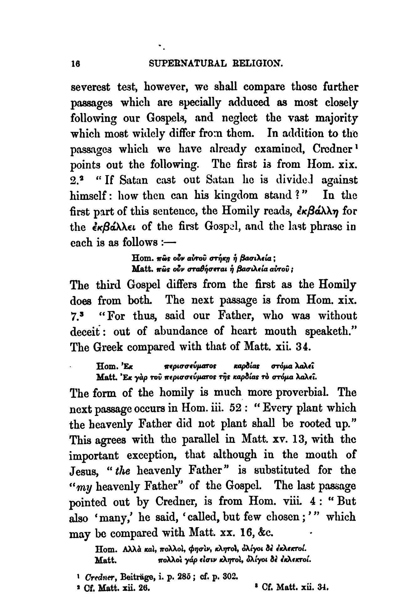 severest test, however, we shall compare those further passages which are specially adduced as most closely following our Gospels, and neglect the vast majority which most widely differ from them. In addition to the passages which we have already examined, Credner(1) points out the following. The first is from Hom. xix. 2.(2) "If Satan cast out Satan he is divided against himself: how then can his kingdom stand?" In the first part of this sentence, the Homily reads, [———] for the [———] of the first Gospel, and the last phrase in each is as follows:—