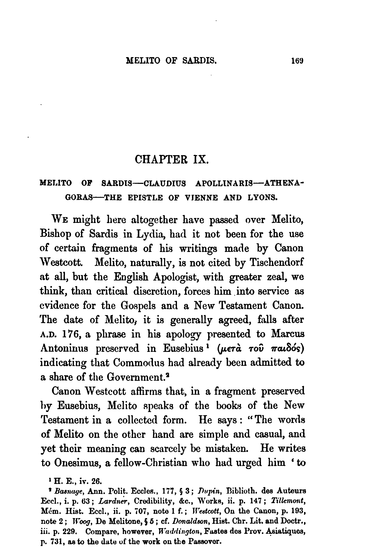 CHAPTER IX. MELITO OF SARDIS—CLAUDIUS APOLLINARIS—ATHENAGORAS—THE EPISTLE OF VIENNE AND LYONS.