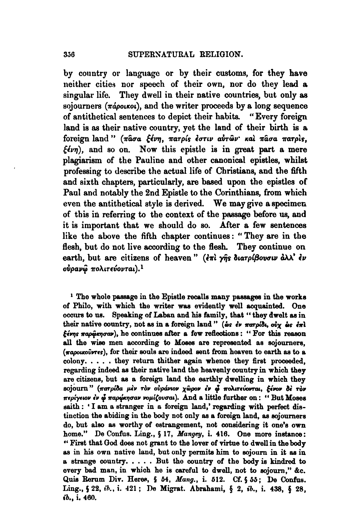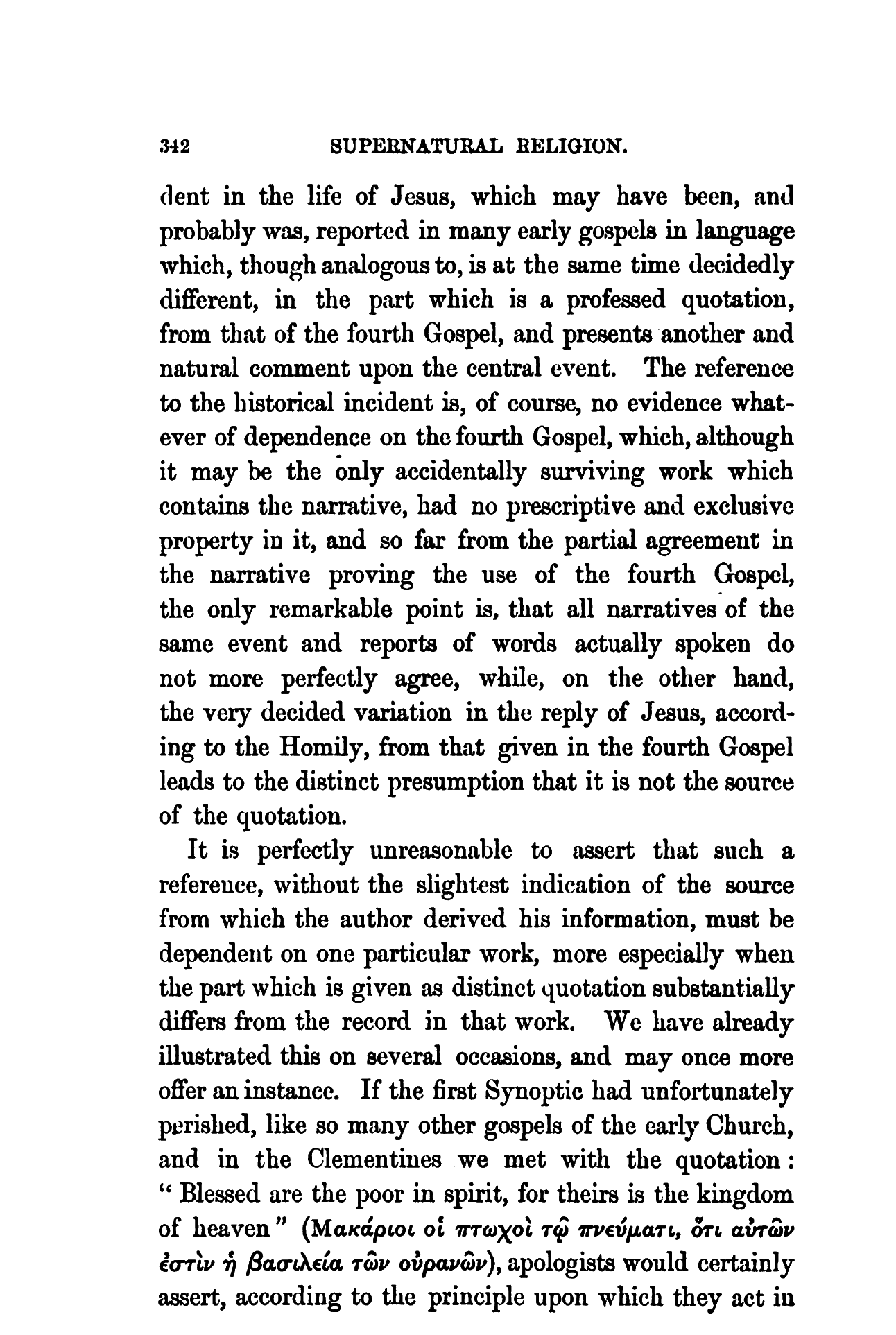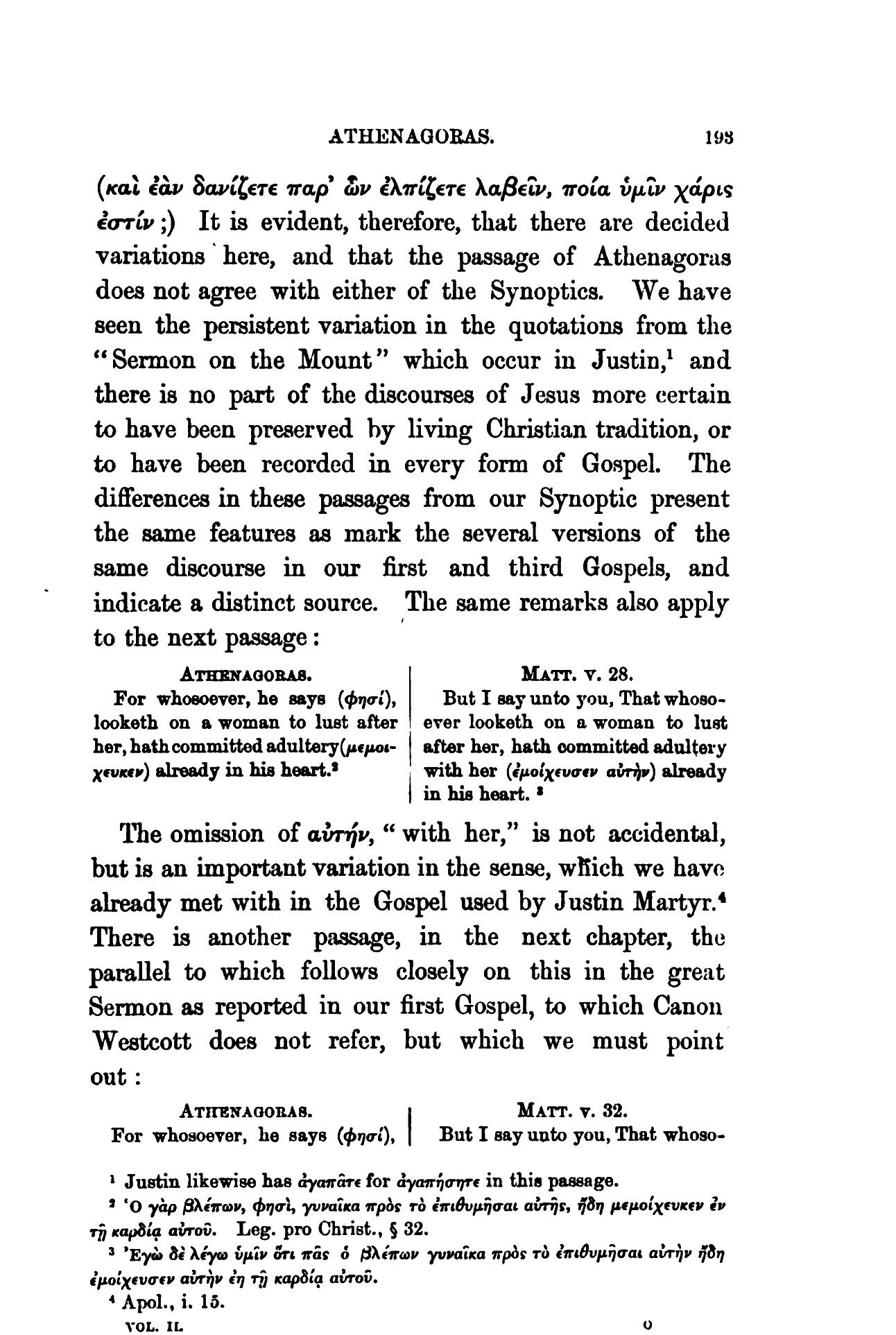 As we have already discussed this passage(1) we need not repeat our remarks here. That this passage comes from a source different from our Gospels is rendered still more probable by the quotation in Hom. xix. 2 being preceded by another which has no parallel at all in our Gospels. "And elsewhere he said, 'He who sowed the bad seed is the devil' [———](2): and again: 'Give no pretext to the evil one.'(2) [———]. But in exhorting he prescribes: 'Let your yea be yea.'" &c. The first of these phrases differs markedly from our Gospels; the second is not in them at all; the third, which we are considering, differs likewise in an important degree in common with Justin's quotation, and there is every reason for supposing that the whole were derived from the same unknown source.(3) In the same Homily, xix. 2, there occurs also the passage which exhibits variations likewise found in Justin, which we have already examined,(4) and now