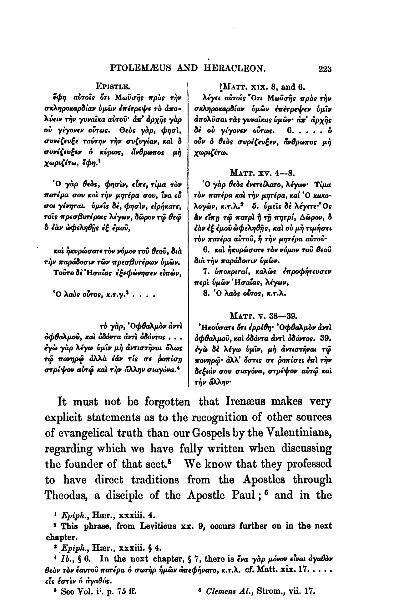 We have also already(3) referred to the passage in Hom. xvii. 4. "No one knew [———] the Father but the Son, even as no one knoweth the Son but the Father and those to whom the Son is minded to reveal him." This quotation differs from Matt. xi. 27 in form, in language, and in meaning, but agrees with Justin's reading of the same text, and as we have shown the use of the aorist here, and the transposition of the order, were characteristics of Gospels used by Gnostics and other parties in the early Church, and the passage with these variations was regarded by them as the basis of some of their leading doctrines.(4) That the variation is not accidental, but a deliberate quotation from a written source, is proved by this, and by the circumstance that the author of the Homilies repeatedly quotes it elsewhere in the same form.(5) It is unreasonable to suppose that the quotations in these Homilies are so systematically and consistently erroneous, and not only can they not, from their actual variations, be legitimately referred to the Synoptics exclusively, but, considering all the circumstances, the