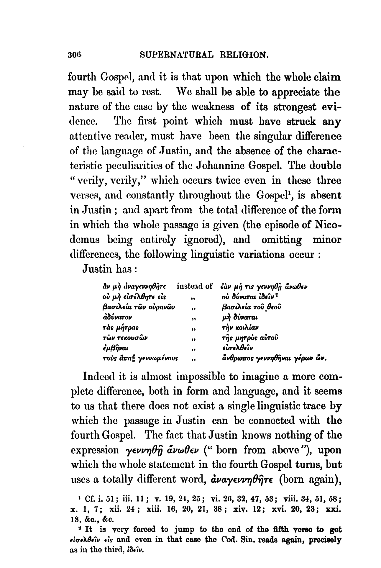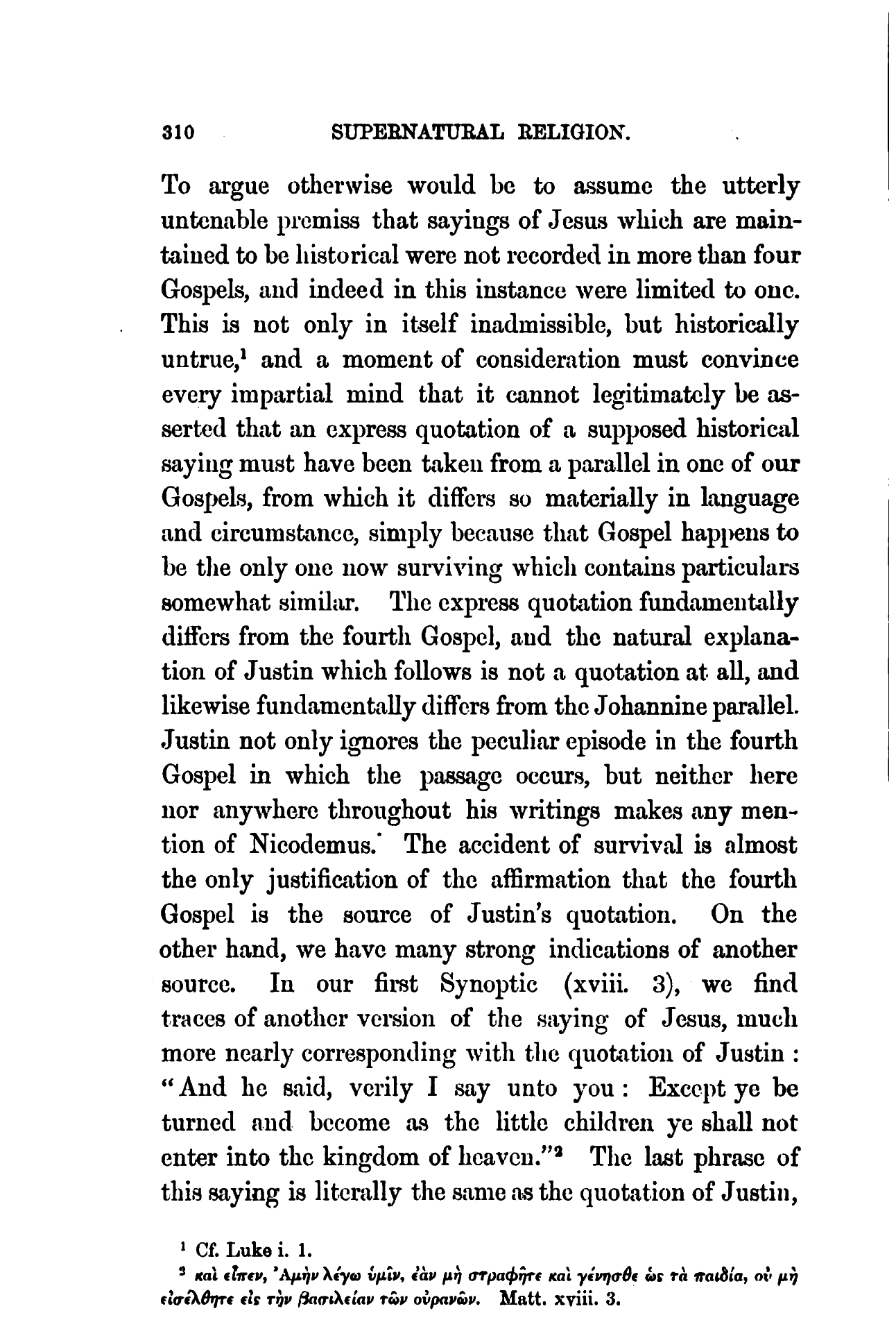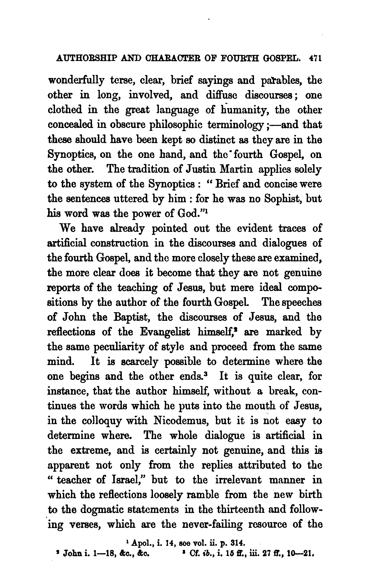 and in his own house" [———]t this passage would undoubtedly be claimed by apologists as a quotation from Mark vi. 4, and as proving the existence and use of that Gospel. The omission of the words "and among his own kin" [———] would at first be explained as mere abbreviation, or defect of memory, but on the discovery that part or all of these words are omitted from some MSS., that for instance the phrase is erased from the oldest manuscript known, the Cod. Sinaiticus, the derivation from the second Gospel would be considered as established. The author notwithstanding might never have seen that Gospel, for the quotation is taken from Matt. xiii. 57.(2)
