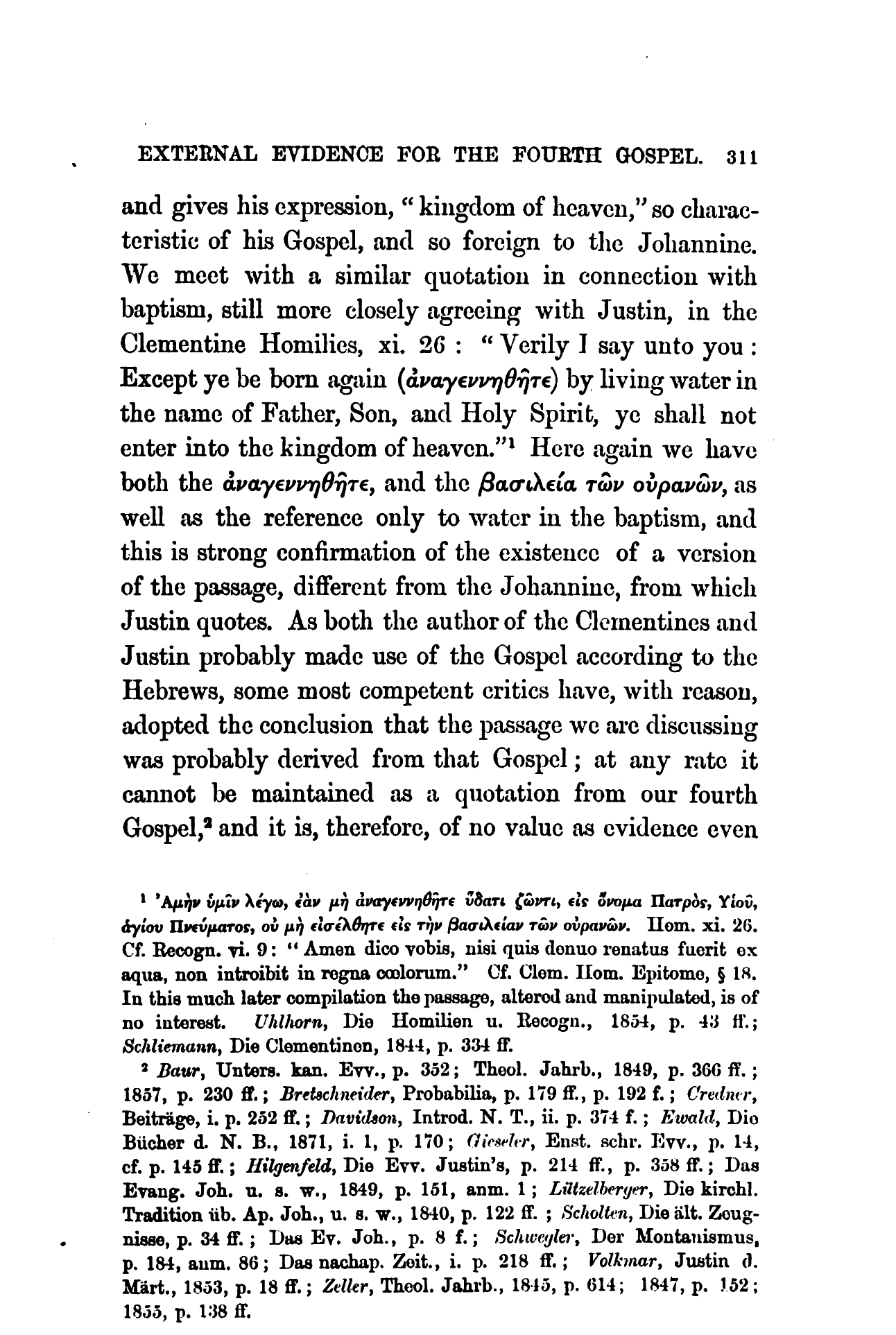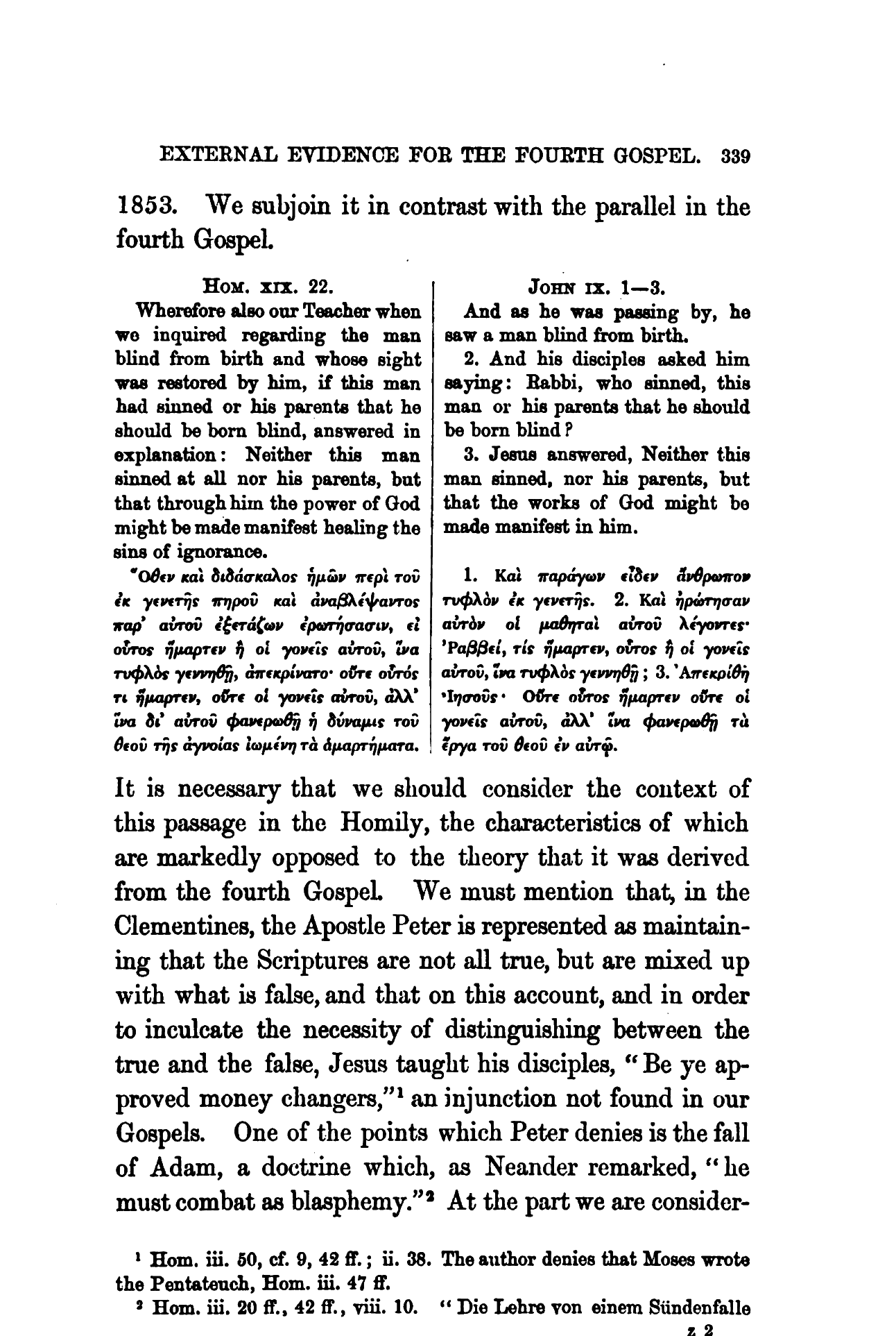 The very same quotation is made both in Hom. ii. 51 and xviii. 20, and in each case in which the passage is introduced it is in connection with the assertion that there are true and false Scriptures, and that as there are in the Scriptures some true sayings and some false, Jesus by this saying showed to those who erred by reason of the false the cause of their error. There can scarcely be a doubt that the author of the Homilies quotes this passage from a Gospel different from ours, and this is demonstrated both by the important variation from our text and also by its consistent repetition, and by the context in which it stands.(3)